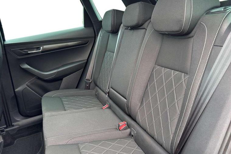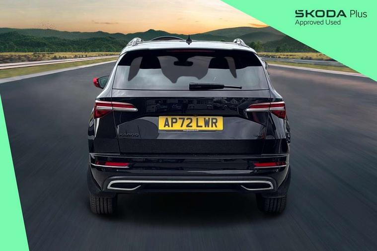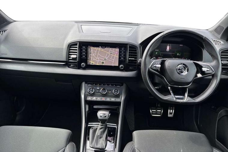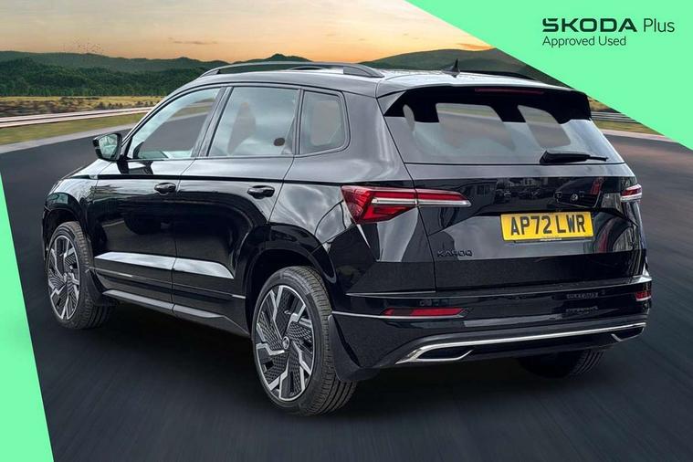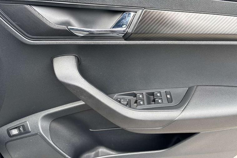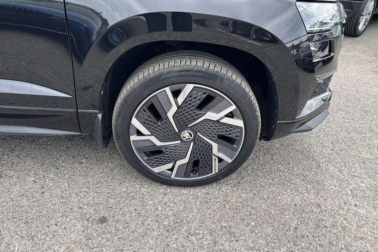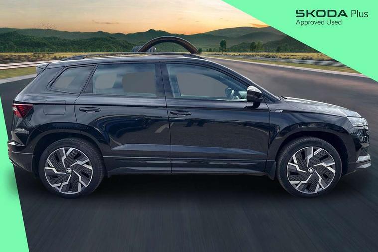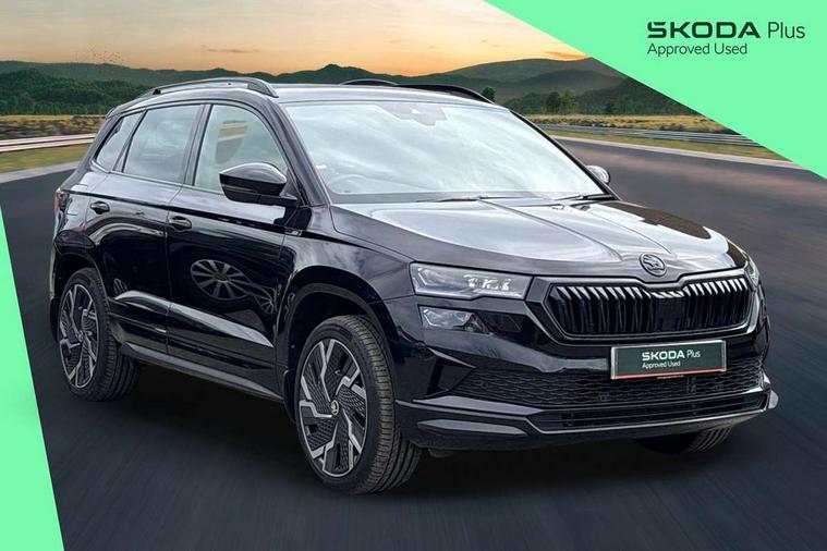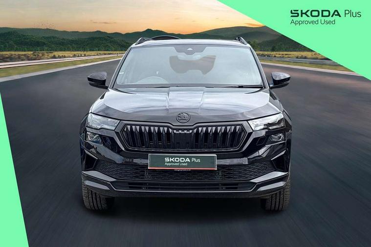 8" Digital display, Care connect, Driver fatigue sensor, Emergency services call system, Outside temperature gauge, Service interval indicator, SmartLink wireless for Apple and wired for Android, Start/stop system with regenerative braking, USB C Port x 2 in front centre console, Virtual pedal with electrically operated boot door, 8 Speakers, DAB radio with Bluetooth, USB connection, Acoustic glass, Aero front windscreen wipers with intermittent function, Auto dimming rear view mirror with light and rain sensors, Black door mirrors, Black electric window control buttons, Black radiator grille, Black roof rails, Body colour door handles, Dynamic headlight range control with cornering light function, Electric front and rear windows with child proof lock, Front door steps with SportLine logo, Heated rear windscreen, LED daytime running lights, LED rear lights with high functionality welcome effect and dynamic indicators, Light assistant (coming/leaving home/tunnel light), Panoramic sliding sunroof, Plastic scuff plates, Privacy glass, Protective door side sills in body colour, Rear diffuser, Rear side wing doors, Rear spoiler, Rear window wiper with washer system and intermittent control, Safety reflectors on front doors, Skoda lettering on tailgate in black, Sportline badge on front fender, Sportline decorative inserts with badging, Sports front and rear bumpers, 1.5 litre bottle holders in driver and front passenger door panels, 12V socket in boot, 12v socket in front centre armrest with storage compartment and rear air vents, 2 Folding hooks and nets in boot, 3 rear height adjustable headrests, 3 seat bench in 2nd row, 3 spoke leather sports multifunction steering wheel and silver stitching with gear shift paddles, 4 foldable roof handles with rear coat hooks, Black floor carpet, Black roof headlining, Chrome inner door handles, Double sided boot floor, Foldable hooks in the boot, Front head restraints, Height adjustable front three point seats belts with tensioners, Height/reach adjust steering wheel, Ice scraper, Illuminated glovebox, Illuminated luggage compartment, Interior noise suppression, Isofix child seat preparation outer rear, Manual lumbar support for front seats, Pen holder, Pollen filter, Rear boot cover, Rear reading lights, Rear seats fixed folding and divided 60:40, Rubbish bin door, Safety vest holder, Single front passenger seat, Storage box in upper central dashboard closed, Sunvisors with illuminated vanity mirrors, Textile floor mats, Ticket holder, Titan black interior ceiling, Welcome animation with sportline logo, Light Pack - Karoq, Parking pack - Karoq, Automatic door unlocking in case of crash, Automatic fuel cut off in case of crash, Child locks on rear doors, Driver airbag, Electronic parking brake with auto hold function, Emergency rear braking signal, ESC including ABS, MSR, ASR, EDS, HBA, DSR, RBS, MKB and traction control, Front side airbags, Hill hold control, Knee airbags, Passenger airbag with switch-off function, Pedestrian monitor, Seatbelt reminder signalisation and pretensioner for all seats, Three point seatbelts rear, Two tone horn, Tyre pressure display, Tyre pressure monitor, Alarm with interior monitoring, back up horn and tilt sensor with safe function, Electronic engine immobiliser, Keyless entry and start/stop, Remote central locking with 2 remote folding keys, Black air vent surround, Black centre console, Satin black dashboard, Satin black door trim, 19" Vega black polished alloy wheels, Anti-theft wheel bolts protection, Matt black aero hub caps, Storage on wheel cover, Tool kit,