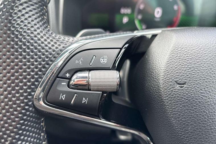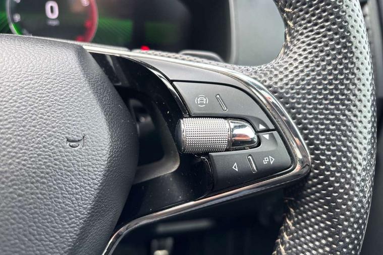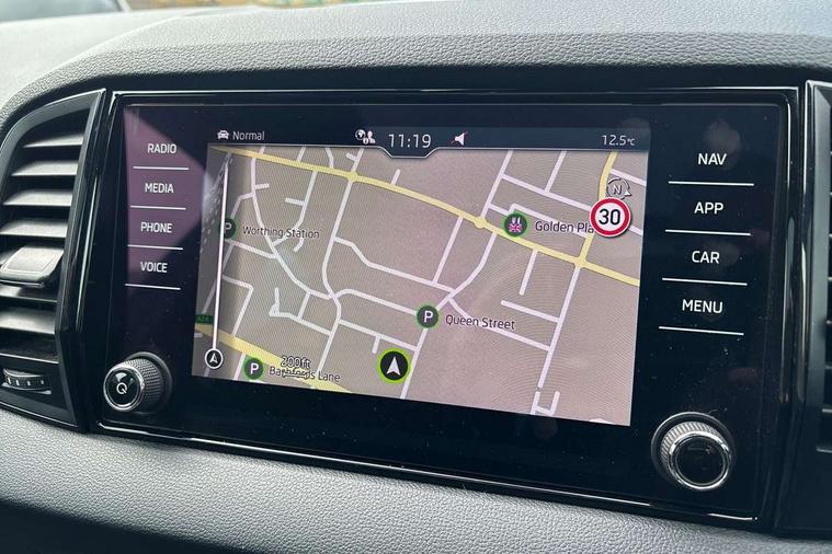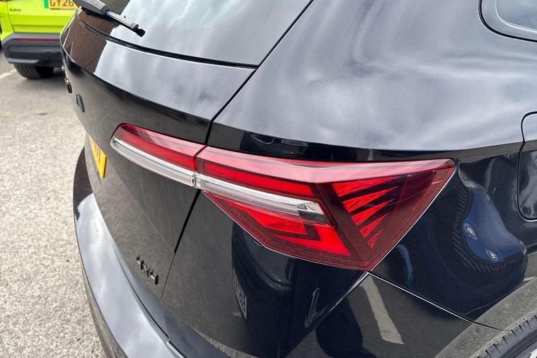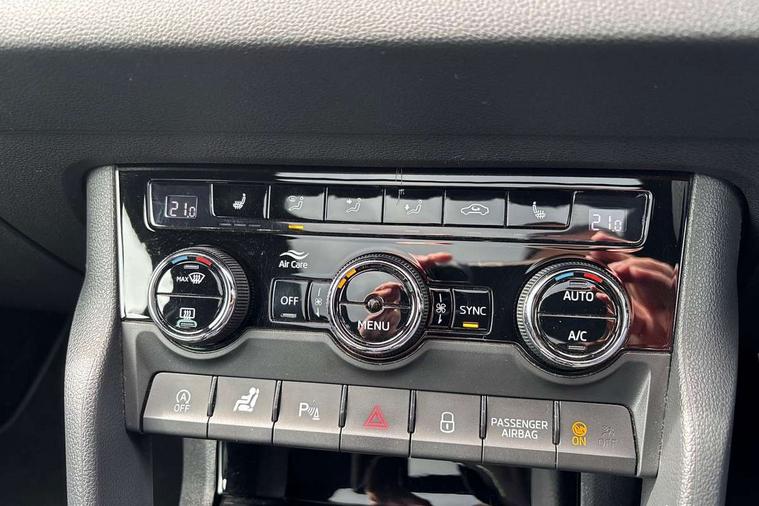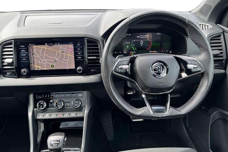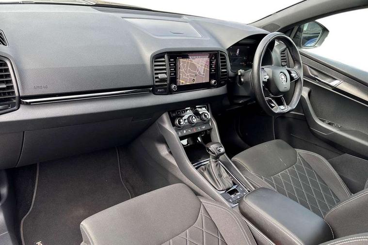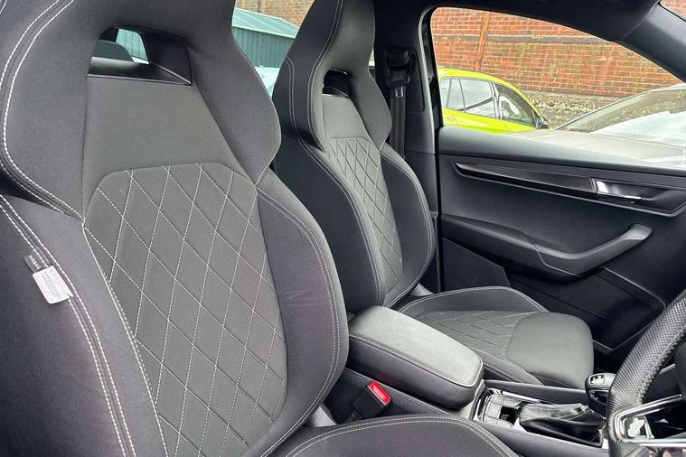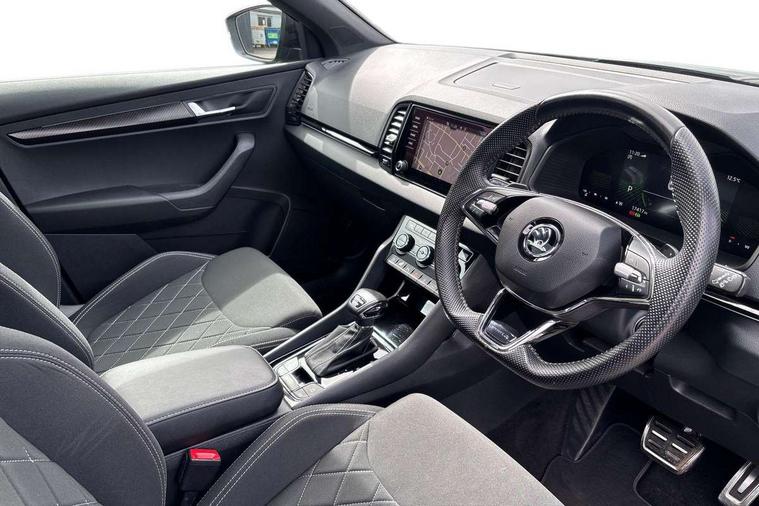 8" Digital display, Care connect, Driver fatigue sensor, Emergency services call system, Outside temperature gauge, Service interval indicator, SmartLink wireless for Apple and wired for Android, Start/stop system with regenerative braking, USB C Port x 2 in front centre console, Virtual pedal with electrically operated boot door, 8 Speakers, DAB radio with Bluetooth, USB connection, Acoustic glass, Aero front windscreen wipers with intermittent function, Auto dimming rear view mirror with light and rain sensors, Black door mirrors, Black electric window control buttons, Black radiator grille, Black roof rails, Body colour door handles, Dynamic headlight range control with cornering light function, Electric front and rear windows with child proof lock, Front door steps with SportLine logo, Heated rear windscreen, LED daytime running lights, LED rear lights with high functionality welcome effect and dynamic indicators, Light assistant (coming/leaving home/tunnel light), Panoramic sliding sunroof, Plastic scuff plates, Privacy glass, Protective door side sills in body colour, Rear diffuser, Rear side wing doors, Rear spoiler, Rear window wiper with washer system and intermittent control, Safety reflectors on front doors, Skoda lettering on tailgate in black, Sportline badge on front fender, Sportline decorative inserts with badging, Sports front and rear bumpers, 1.5 litre bottle holders in driver and front passenger door panels, 12V socket in boot, 12v socket in front centre armrest with storage compartment and rear air vents, 2 Folding hooks and nets in boot, 3 rear height adjustable headrests, 3 seat bench in 2nd row, 3 spoke leather sports multifunction steering wheel and silver stitching with gear shift paddles, 4 foldable roof handles with rear coat hooks, Black floor carpet, Black roof headlining, Chrome inner door handles, Double sided boot floor, Foldable hooks in the boot, Front head restraints, Height adjustable front three point seats belts with tensioners, Height/reach adjust steering wheel, Ice scraper, Illuminated glovebox, Illuminated luggage compartment, Interior noise suppression, Isofix child seat preparation outer rear, Manual lumbar support for front seats, Pen holder, Pollen filter, Rear boot cover, Rear reading lights, Rear seats fixed folding and divided 60:40, Rubbish bin door, Safety vest holder, Single front passenger seat, Storage box in upper central dashboard closed, Sunvisors with illuminated vanity mirrors, Textile floor mats, Ticket holder, Titan black interior ceiling, Welcome animation with sportline logo, Light Pack - Karoq, Parking pack - Karoq, Automatic door unlocking in case of crash, Automatic fuel cut off in case of crash, Child locks on rear doors, Driver airbag, Electronic parking brake with auto hold function, Emergency rear braking signal, ESC including ABS, MSR, ASR, EDS, HBA, DSR, RBS, MKB and traction control, Front side airbags, Hill hold control, Knee airbags, Passenger airbag with switch-off function, Pedestrian monitor, Seatbelt reminder signalisation and pretensioner for all seats, Three point seatbelts rear, Two tone horn, Tyre pressure display, Tyre pressure monitor, Alarm with interior monitoring, back up horn and tilt sensor with safe function, Electronic engine immobiliser, Keyless entry and start/stop, Remote central locking with 2 remote folding keys, Black air vent surround, Black centre console, Satin black dashboard, Satin black door trim, 19" Vega black polished alloy wheels, Anti-theft wheel bolts protection, Matt black aero hub caps, Storage on wheel cover, Tool kit,