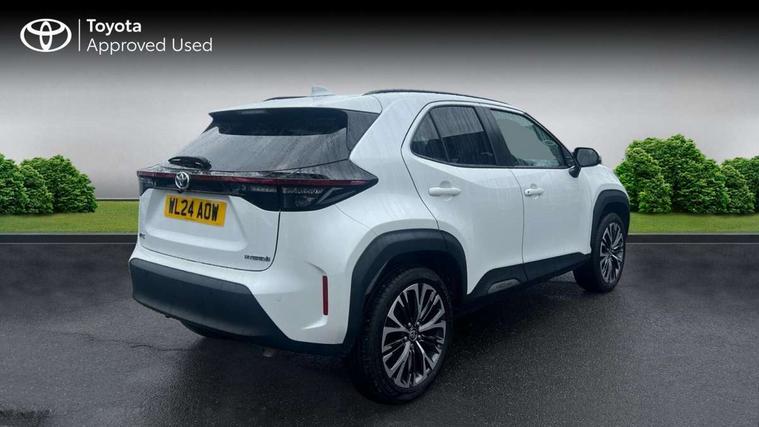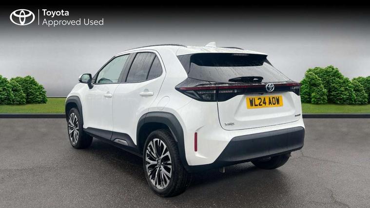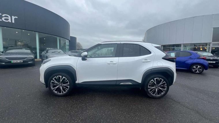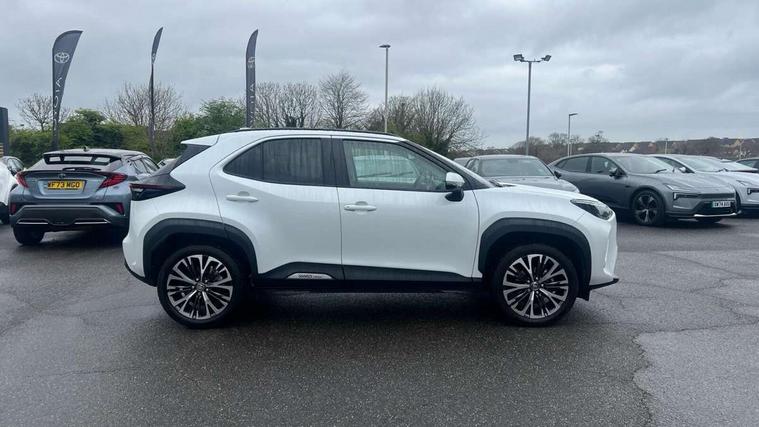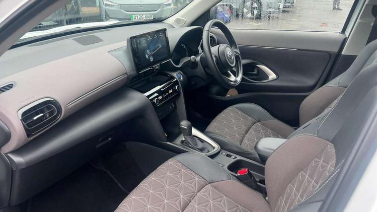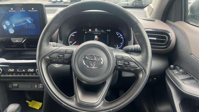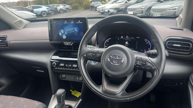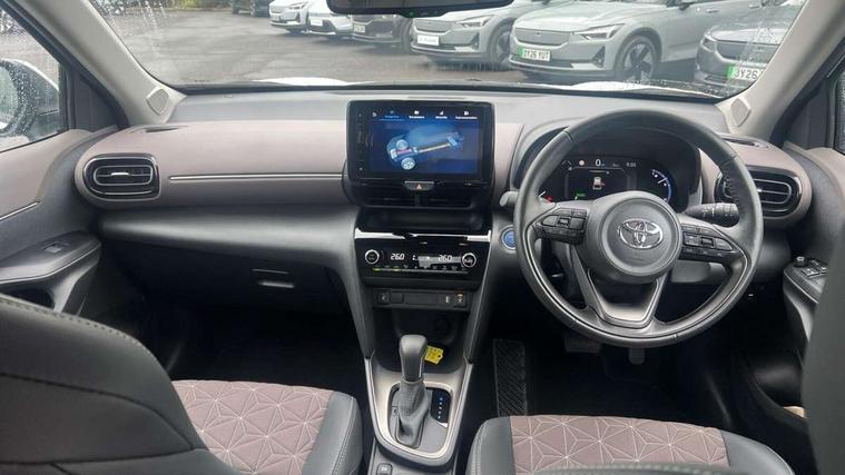 10.5" Multimedia display screen, 10.5" Toyota smart connect+ with navi multimedia system with wireless Smartphone integration incl Apple CarPlay, 360 degree panoramic view monitor, 7" Multi information display screen, Adaptive cruise control, multi info switches on steering wheel, Adjustable speed limiter, Advanced parking assist, Blind spot monitoring, Bluetooth connectivity, Color multi-information display, Digital speedometer, Digital tachometer, Drive mode selector, Driver attention alert system, Dynamic guide lines on reversing camera, eCall emergency system, Electric power steering, Emergency driving stop system, Full range intelligent adaptive cruise control, Hybrid system indicator, Intelligent front and rear parking sensors with clearance sonar and automatic braking, Intersection turn assist, Key reminder warning, Lane change assist, Lane departure warning, Lane trace assist, My T Connected services, Power tailgate, Pre-collision system enhanced with emergency steering assist, Rear cross traffic alert with brake assist, Remote boot door release in cabin, Road sign assist - RSA, Safe exit assist, Telephone switch on steering wheel, Wireless Mobile Phone Charger, Steering assisted vehicle stability control, 6 speakers, DAB Digital radio, Front USB Type-C connector, Front USB-C device charger, 3rd brake light, Acoustic windscreen glass, Anti-jam protection on power windows, Auto dimming rear view mirror, Auto high beam [AHB] with on/off switch, Auto intermittent windscreen wipers, Automatic headlights, Automatic headlights cut-off, Automatically retractable door mirrors, Black door moulding, Black lower front grille, Black protection moulding on side doors, Black roof rails, Black wheel arch mouldings, Body colour door handles, Body colour front bumper, Body colour rear bumper, Electric adjustable heated door mirrors, Follow me home headlights, Front and rear electric windows with auto up/down function, Gloss black upper front grille, Headlight cut off reminder, Indicators integrated on door mirrors, Intermittent rear wiper, Kick activated power back door, LED daytime running lights guide, LED front fog lights, LED front light guide, LED Indicators, LED projector headlights, LED rear lights with sequential indicators, Manual headlight levelling, Meshed shape upper front grille, Noise reduction layer on windscreen, Privacy glass, Rain sensor, Rear side wing doors, Rear spoiler, Rear window defogger, Shark fin antenna, 12v power outlet - front, 12V power point in boot, 2x Rear coat hooks, 3 seat bench in 2nd row, 3 spoke leather steering wheel, 40/60 split deckboard, 40:20:40 split folding rear bench seat, Adjustable rear headrests, Adjustable speed limiter switch on steering wheel, Boot light, Central armrest, Driver and front passenger personal lights, Driver and front passenger Whiplash injury Lesseing seats, Driver and passenger seatback pockets, Dual zone automatic air conditioning, Fabric door trim, Front console box, Front cup holders, Front door pockets, Front head restraints, Front sport seats, Front/rear assist grips, Gear shift indicator, Grey roof lining, Heated driver and passenger seats, Heated steering wheel, Height adjustable driver's seat, Height adjustable front passenger seat, Hooks for luggage holding belts, ISOFIX child restraint system, Lane departure alert switch on steering control, Leather gearshift, LED centre room light, Light on driver and passenger sun visor, Manual telescopic and tilting steering wheel, Mirror on driver and passenger sun visor, Nanoe-X air purifier, Partial synthetic leather upholstery, Pollen air filter, Power adjustable lumbar support on driver seat, Rear cup holders, Rear door pockets, Rear head restraints, Remote air-conditioning system, Single compartment glovebox, Single front passenger seat, Soft tonneau cover, Storage box under boot floor, Voice recognition switch on steering wheel, White ambient lighting in centre console, White ambient lighting in footwell, White ambient lighting on front doors, Yaris cross floor mats, Tech pack - Yaris Cross, 3x3 point rear seat belts, ABS+EBD+Brake assist, Downhill Assist Control (DAC), Driver and passenger central airbags, Driver and passenger front airbags, Driver and passenger side airbags, Electronic parking brake, Emergency brake light system (EBS), Front seat belt reminder, Hill start assist control (HAC), Passenger airbag on/off switch, Pre-collision system with pedestrian and cyclist detection, Rear door child safety locks, Rear passenger side airbags, Rear seat belt reminder, Traction control, Tyre pressure warning system, Immobiliser, Intrusion alarm, Keyless smart entry with push button start, Power door locks, Power passenger window lock, Remote door lock, Gloss black side air vent surrounds, Tyre repair kit,