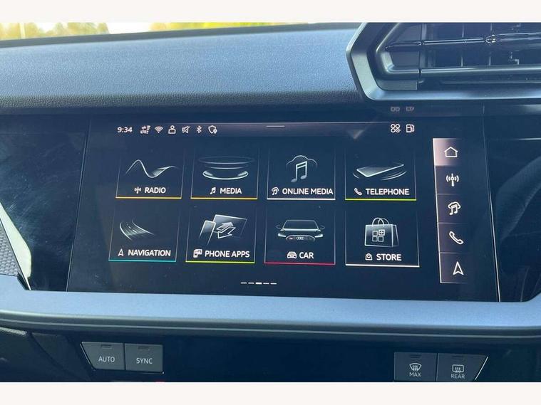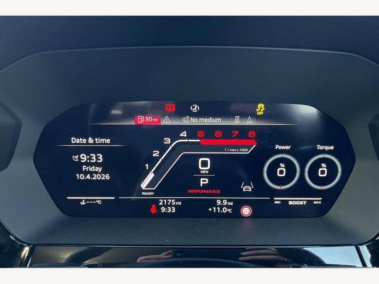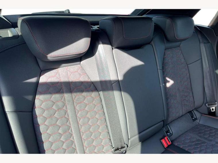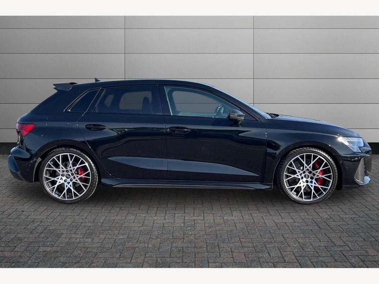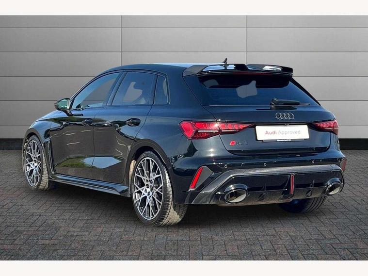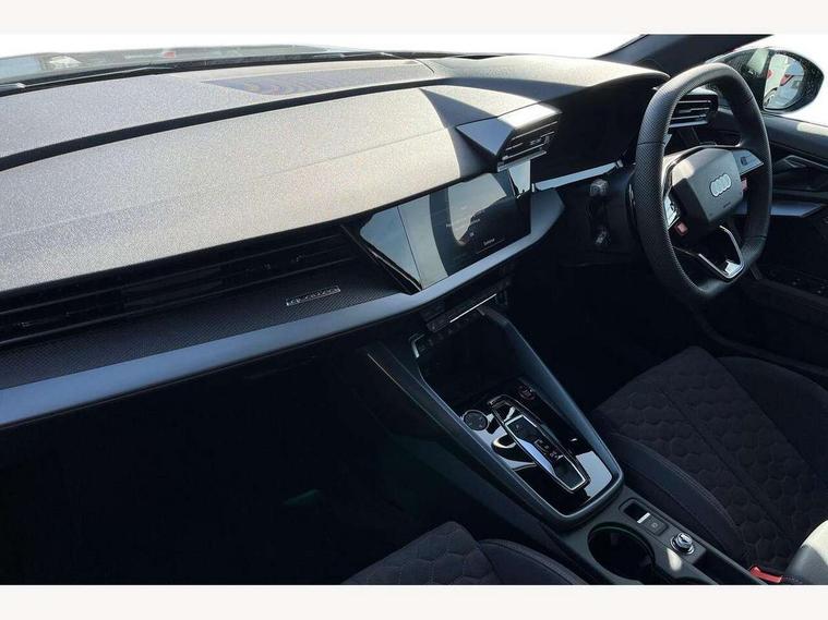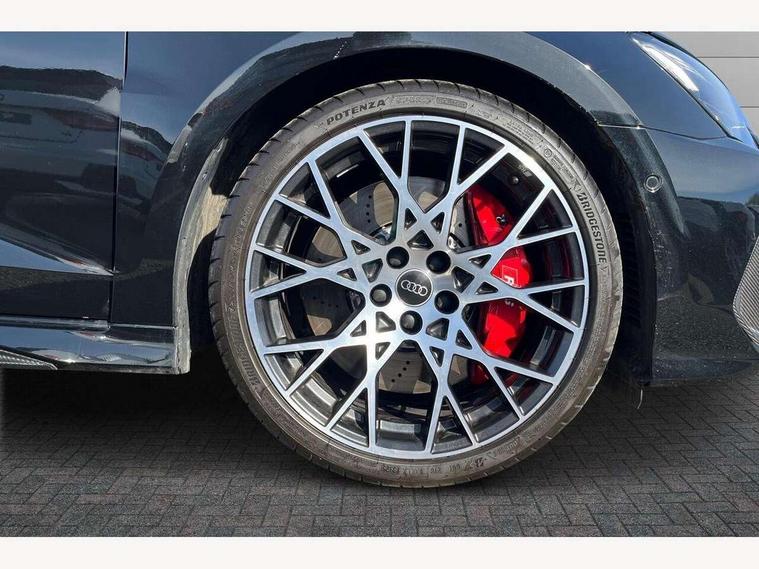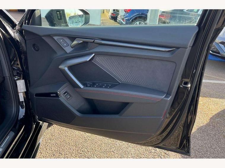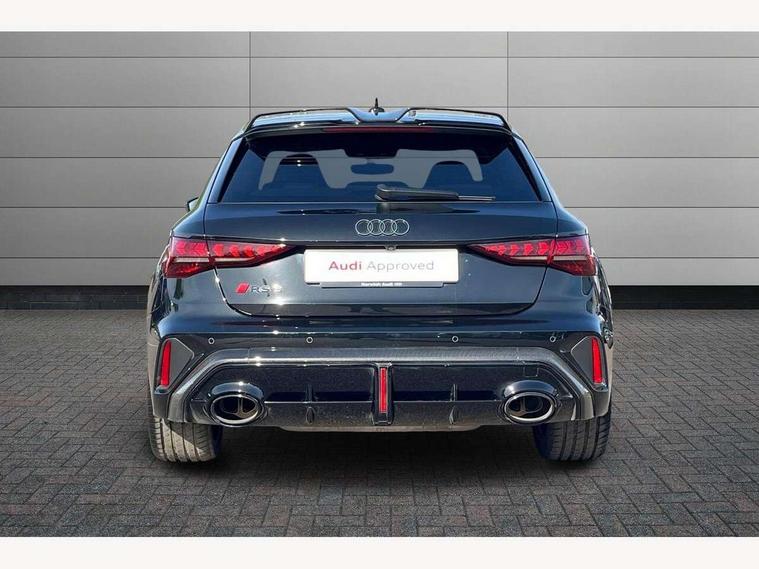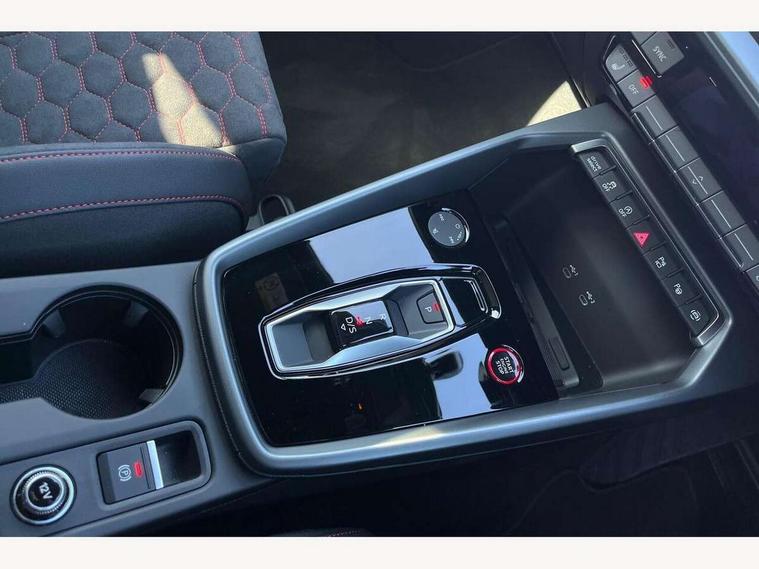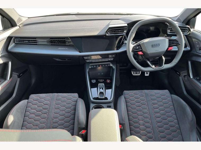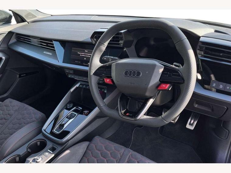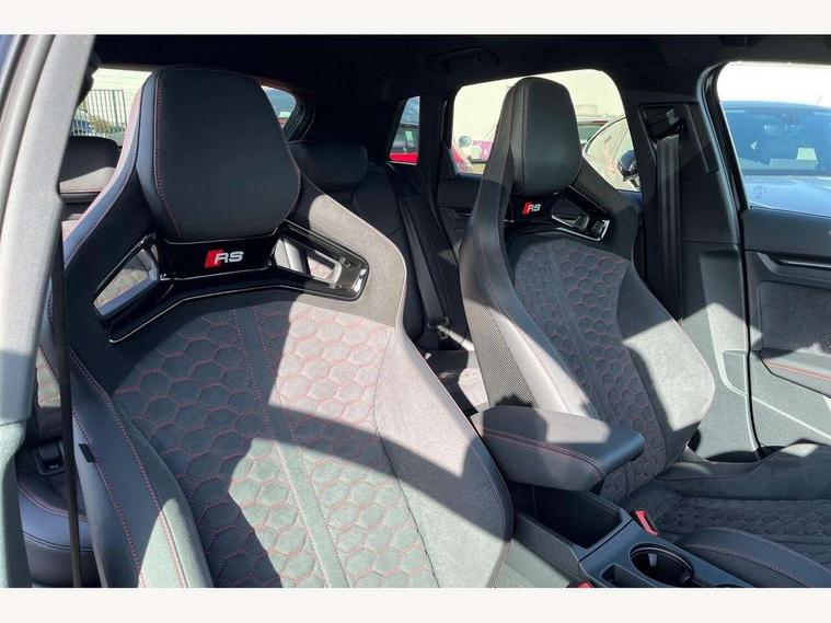 Adjustable speed limiter, Audi drive select comfort, auto, dynamic and efficiency, Audi virtual cockpit plus with RS specific design and 12.3" display with additional graphic display options, Automatic start/stop system with recuperation, Bluetooth interface, Camera based traffic sign recognition, Collision avoidance assistant, Driver attention and fatigue detection, e-Call (emergency call), MMI Navigation Plus with high resolution 10.1" colour touch screen display, Progressive steering, RS specific driving modes - RS Individual, RS Performance and RS Torque rear, Service indicator, Smartphone interface with app store includes wireless Apple carplay, Android auto and Amazon alexa integration, Trip computer, Voice control system with natural language interaction, Adaptive suspension, Increase of top speed to 174 mph, Quattro permanent four wheel drive, Audi Phonebox light with wireless charging, DAB Digital radio, USB ports with charging function in the rear, Audi beam LED projection of RS logo on ground as you exit, Auto dimming frameless rear view mirror, Carbon door mirror housings, Electrically adjustable/heated/folding/auto dimming door mirrors with integrated LED indications + kerb view function for passenger side, Engine compartment cover with carbon trim, Exterior model badging, Front electric windows, Heat insulating glass windscreen, LED 3rd brake light, Light and rain sensors, Privacy glass - dark tinted rear window, rear door and side windows, Rear electric windows, Rear side wing doors, Rear wiper, Roof edge spoiler in carbon, RS sport exhaust system - dual branch with flap control and gloss black oval tailpipe trims, 12V socket and storage compartment in front centre console, 3 seat bench in 2nd row, 3 Spoke flat top and bottomed black leather multi function steering and gear shift paddles, 3-zone deluxe automatic air conditioning, 40/20/40 split folding rear seat bench, Black cloth headlining, Black front and rear floor mats, Front and rear headrests, Front centre armrest, Front door sill trims with RS 3 logo, Heated front seats, Height and reach adjustable steering wheel, Manual boot compartment lid, Rear centre armrest with cupholder, Seat side bolsters, Single front passenger seat, Stainless steel pedals and front footrest in black, Vanadium look - Interior door handles, Door trim, power latching, Air vents, window controls, mirror adjust, rear door lock, Selector lever in centre console, Black Styling plus package - RS3, Extended ambient lighting package Pro with Multi-coloured contour lighting of instrument panel - RS3, RS exterior features pack in carbon and gloss black - RS3, Storage package - RS3 Sportback, 3x3 point rear seat belts, Driver and front passenger airbag with passenger airbag deactivation, Electronic Stabilisation Control (ESC) including ABS, ASR and EDL, First aid kit with warning triangle and 2 safety vests, Hill hold assist, Pre-sense front with pedestrian and cyclist detection, Seatbelt monitoring, Tyre pressure loss indicator, Anti theft alarm, Anti-theft wheel bolts, Electronically operated child locks, Immobiliser, Black dashboard, Inlays in carbon atlas structure, Tyre repair kit,