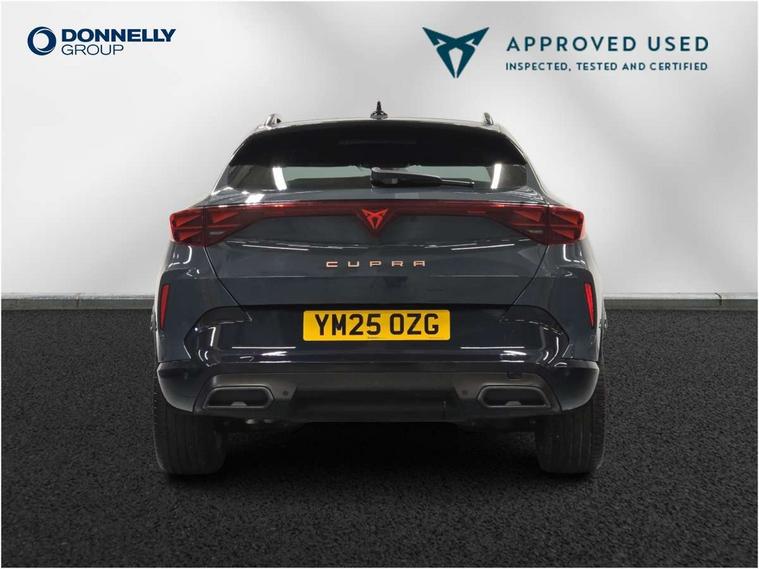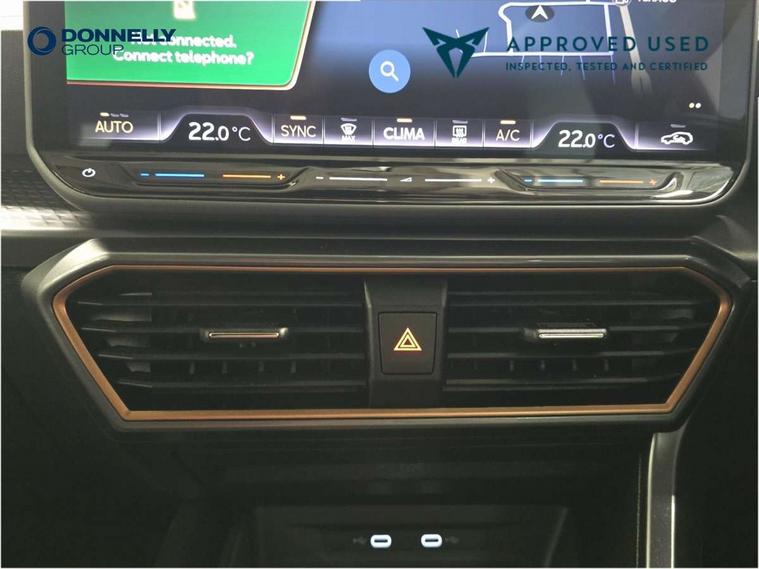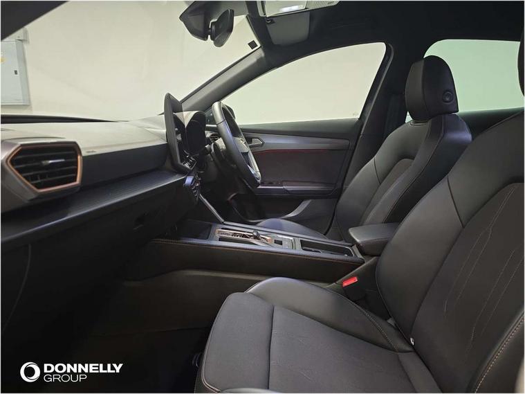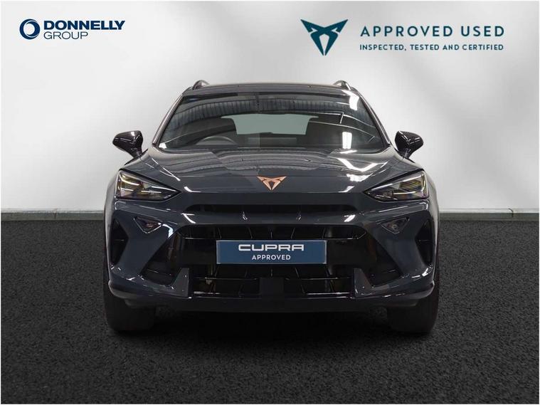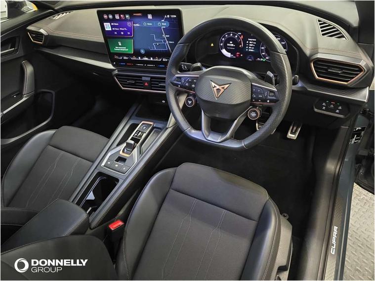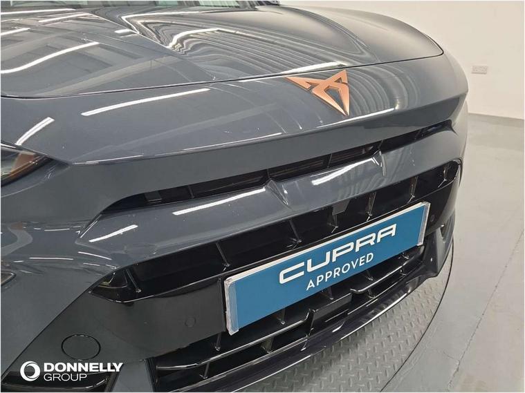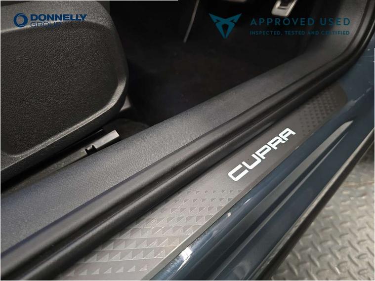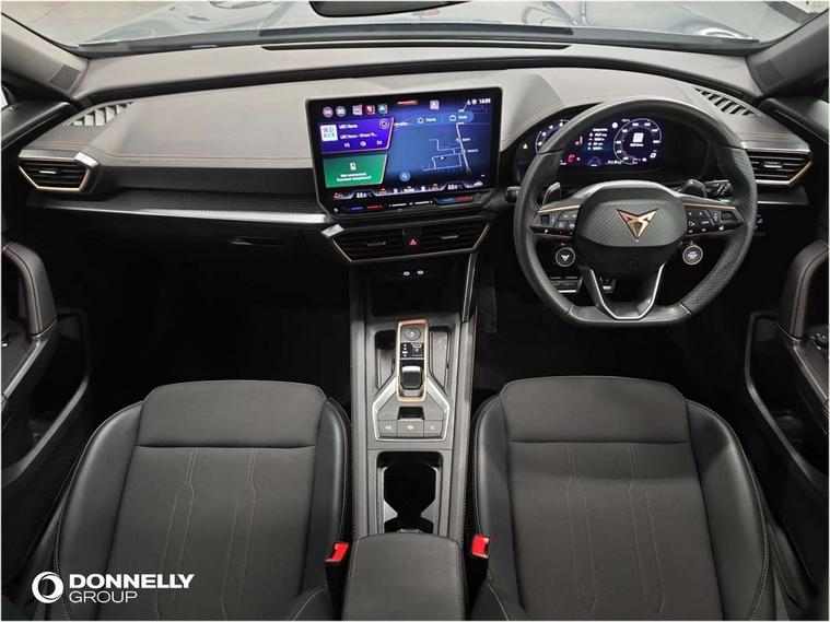 10.25" digital cockpit and configurable dashboard, Adaptive cruise control with follow-to-stop and speed limiter, Advanced driver alert system, Driving profile selection, Dynamic road sign display, Emergency steering support with turn assist, Forward collision warning with automatic braking, Front and rear parking sensors, Full link phone integration, Lane assist, Progressive steering, RPM, trip computer, outside temp gauge, instrument light brightness, low fuel warning light, lights on reminder, gearshift indicator, Service interval indicator, Start/stop system with regenerative braking, Voice control system, Wired Android Auto, Wireless apple carplay, Wireless phone charger, CUPRA sport suspension, Electronic locking differential and dynamic traction support, 2 front and 2 rear USB type C sockets, 7 speakers, Media system with navigation, 12.9" touchscreen display, voice control, DAB, steering wheel mounted controls, Auto dimming rear view mirror, Body colour door handles, Body coloured bumpers, Dark grey wing mirror, Daytime running light with automatic headlight control and coming home feature, Door panel ambient lighting, Dynamic headlight range control, Electric front/rear windows, Electrically adjustable, heated and folding door mirrors, Gloss black roof rails and window surrounds, High beam assist, LED 3rd brake light, LED front fog lamps with cornering function, LED Headlights, LED Taillights with dynamic indicator, Rain sensing wipers, Rear diffuser with black simulated exhaust pipes, Rear fog lights, Rear side wing doors, Rear wash/wipe, Tinted rear windows, Welcome lights (within exterior mirror housing), 12V socket, 2 front and 2 rear reading lights, 3 seat bench in 2nd row, 60/40 split rear bench seat with armrest and mechanical seat release, Black headlining, Black interior roof lining, Cupra sports pedals, Dust/pollen filter, Front and rear head restraints, Front centre armrest, Heated supersports multifunction leather steering wheel with satellite buttons and gear shift paddles, Height/reach adjust steering wheel, Illuminated aluminium doorsteps, Illuminated interior front door sills, Illuminated sunvisor with mirror, Interior ambient lighting, Isofix, Manually adjustable height and lumbar support for front seats, PVC/Cloth upholstery with copper stitching + Sport seats, Satellite steering wheel, Single front passenger seat, Storage pockets on rear of front seats, Three zone climate control with control panel in rear, Variable luggage/load compartment floor, 3 point seatbelts on all rear seats, ABS, Brake control system - ESC and brake booster, Child proof door locks, Driver and front passenger airbags with front passenger airbag de-activation, Electronic parking brake, Front and rear disc brakes, Front side curtain airbags, Hill hold control, Public e-call, Seat belt reminder for front and rear seats, Tyre pressure monitoring system, Anti theft alarm system, Central locking system Keyless Go, Locking wheel bolts, Copper and aluminium interior detailing, 18" Sonora machined silver alloy wheels,