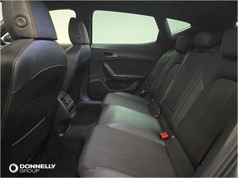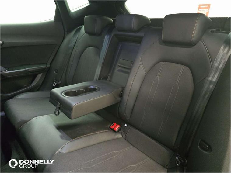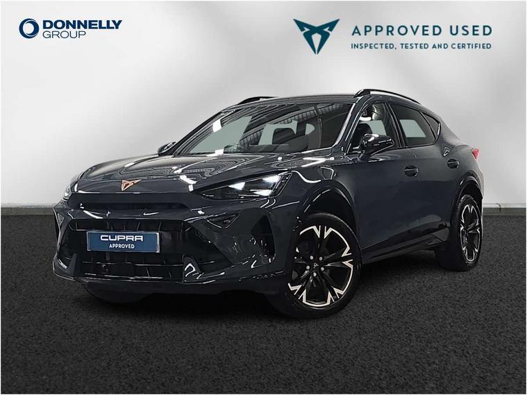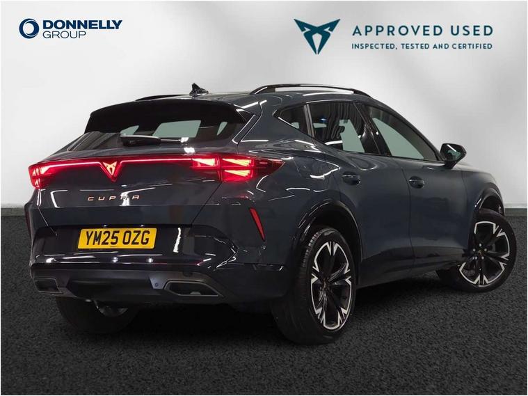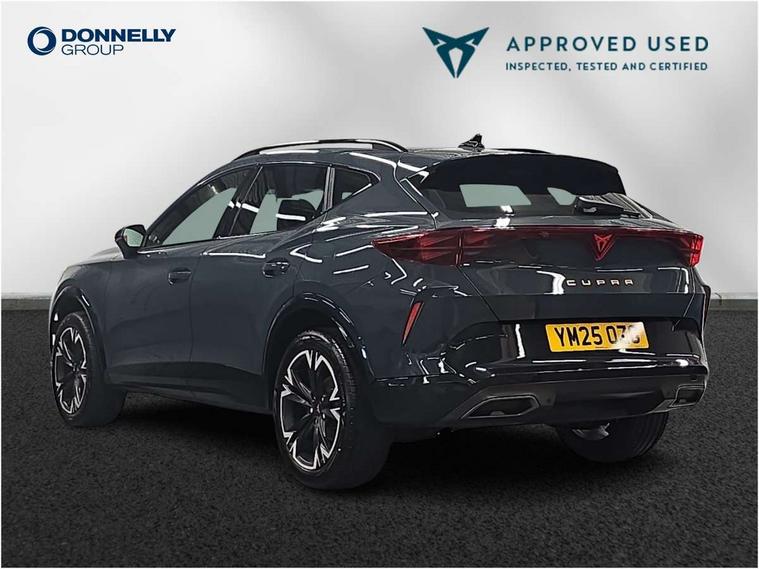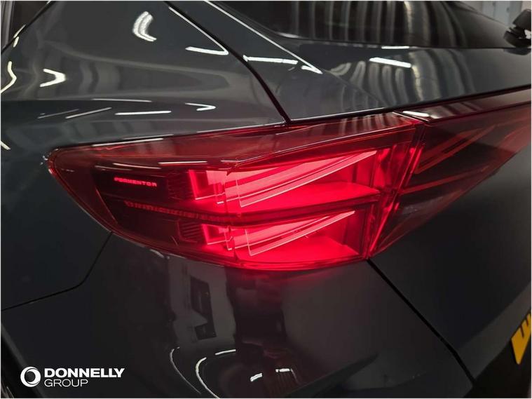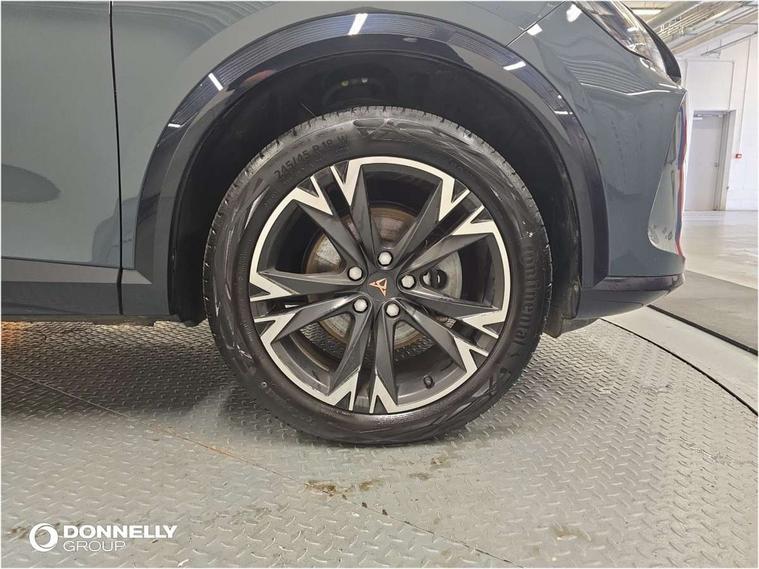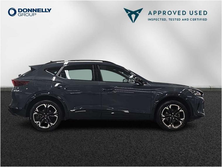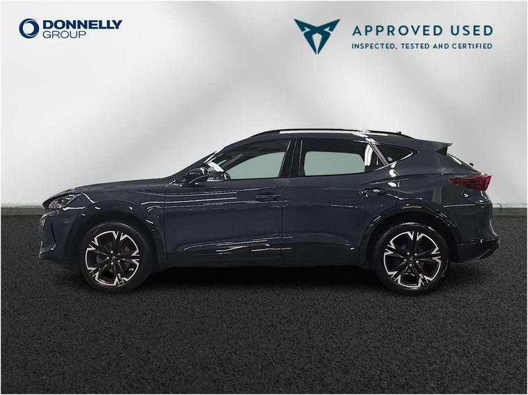 10.25" digital cockpit and configurable dashboard, Adaptive cruise control with follow-to-stop and speed limiter, Advanced driver alert system, Driving profile selection, Dynamic road sign display, Emergency steering support with turn assist, Forward collision warning with automatic braking, Front and rear parking sensors, Full link phone integration, Lane assist, Progressive steering, RPM, trip computer, outside temp gauge, instrument light brightness, low fuel warning light, lights on reminder, gearshift indicator, Service interval indicator, Start/stop system with regenerative braking, Voice control system, Wired Android Auto, Wireless apple carplay, Wireless phone charger, CUPRA sport suspension, Electronic locking differential and dynamic traction support, 2 front and 2 rear USB type C sockets, 7 speakers, Media system with navigation, 12.9" touchscreen display, voice control, DAB, steering wheel mounted controls, Auto dimming rear view mirror, Body colour door handles, Body coloured bumpers, Dark grey wing mirror, Daytime running light with automatic headlight control and coming home feature, Door panel ambient lighting, Dynamic headlight range control, Electric front/rear windows, Electrically adjustable, heated and folding door mirrors, Gloss black roof rails and window surrounds, High beam assist, LED 3rd brake light, LED front fog lamps with cornering function, LED Headlights, LED Taillights with dynamic indicator, Rain sensing wipers, Rear diffuser with black simulated exhaust pipes, Rear fog lights, Rear side wing doors, Rear wash/wipe, Tinted rear windows, Welcome lights (within exterior mirror housing), 12V socket, 2 front and 2 rear reading lights, 3 seat bench in 2nd row, 60/40 split rear bench seat with armrest and mechanical seat release, Black headlining, Black interior roof lining, Cupra sports pedals, Dust/pollen filter, Front and rear head restraints, Front centre armrest, Heated supersports multifunction leather steering wheel with satellite buttons and gear shift paddles, Height/reach adjust steering wheel, Illuminated aluminium doorsteps, Illuminated interior front door sills, Illuminated sunvisor with mirror, Interior ambient lighting, Isofix, Manually adjustable height and lumbar support for front seats, PVC/Cloth upholstery with copper stitching + Sport seats, Satellite steering wheel, Single front passenger seat, Storage pockets on rear of front seats, Three zone climate control with control panel in rear, Variable luggage/load compartment floor, 3 point seatbelts on all rear seats, ABS, Brake control system - ESC and brake booster, Child proof door locks, Driver and front passenger airbags with front passenger airbag de-activation, Electronic parking brake, Front and rear disc brakes, Front side curtain airbags, Hill hold control, Public e-call, Seat belt reminder for front and rear seats, Tyre pressure monitoring system, Anti theft alarm system, Central locking system Keyless Go, Locking wheel bolts, Copper and aluminium interior detailing, 18" Sonora machined silver alloy wheels,