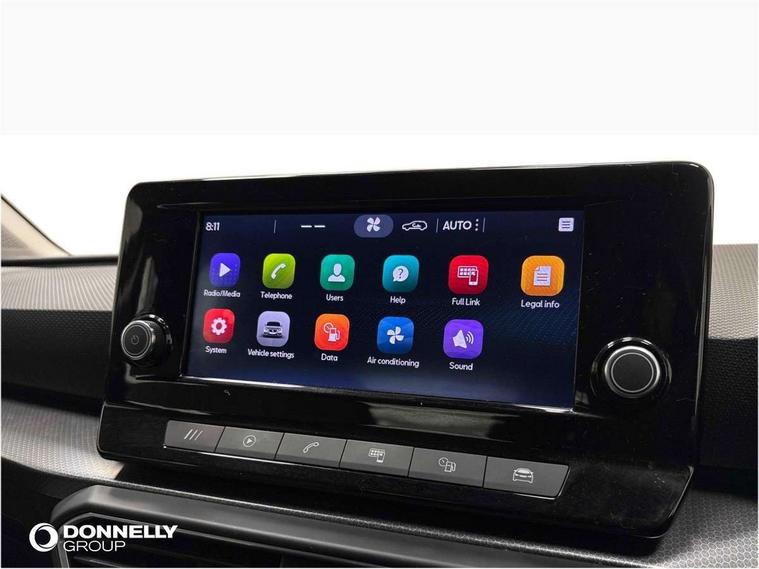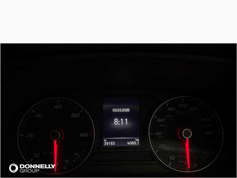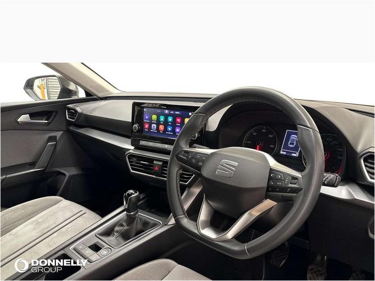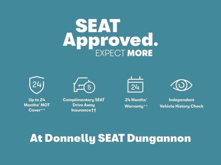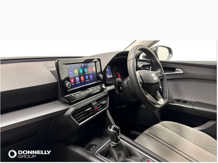 Cruise control with speed limiter, E-call, Front assist with forward collision warning braking reaction to vehicles, pedestrians and cyclists, Full link smartphone integration with Mirror Link, Wired Apple CarPlay and Wired Google Android Auto, Lane assist, Lockable tailgate, Power assisted speed sensitive electro-mechanical steering, Rear parking sensors, RPM, trip computer, outside temp gauge, instrument light brightness, low fuel warning light, lights on reminder, gearshift indicator, Service interval indicator, Start/stop system with regenerative braking, Two USB Type C ports in front, Standard suspension, XDS electronic differential lock and dynamic traction support, 7 speakers, Auxiliary input socket, Body colour door handles, Body coloured bumpers, Body coloured exterior mirrors with integrated LED indicators, Dynamic headlight range control, Electric front/rear windows, Electrically adjustable and heated door mirrors, LED front fog lamps with cornering function, LED headlights and LED tail lights, LED rear fog lamp, Manual dimming rear view mirror, Rain sensor, Rear coast to coast lighting, Rear side wing doors, Rear wash/wipe, Separate daytime running light with automatic headlight control, Third brake light, Welcome light silhouette from exterior mirrors, 12v power point in centre console, 3 seat bench in 2nd row, 60/40 split rear bench seat, Air conditioning, Driver seat lumbar adjustment, Driver/passenger manual seat height adjustment, Dust/pollen filter, Folding boot cover, Front and rear height adjustable headrests, Front and rear reading lights X 4, Front seatback storage pockets, Grey headlining, Height/reach adjust steering wheel, Illuminated glove box interior lighting, ISOFIX points in outer rear seats with top tether anchorage points, Leather flat bottomed, perforated steering wheel and leather gearstick, Luggage tie-down hooks, Single front passenger seat, Sunvisors with mirror, Two tone cloth upholstery, Media system pack - Leon, 3 point seatbelts on all rear seats, ABS, Brake control system - ESC and brake booster, Child proof door locks, Driver and front passenger airbags with front passenger airbag de-activation, front side and curtain airbags, Electronic parking brake, Extended safety system - seat belt tensioner, window closure and hazard lights, Hill hold control, Rear disc brakes, Seat belt reminder for front and rear seats, Tiredness recognition system, driver alert system, Tyre pressure monitoring system, Anti theft alarm system with interior monitoring in cab, backup horn and towing protection, KESSY Go (Keyless start), Locking wheel bolts, Chrome interior detailing, 16" Urban alloy wheels with 91V tyres, Tool kit,