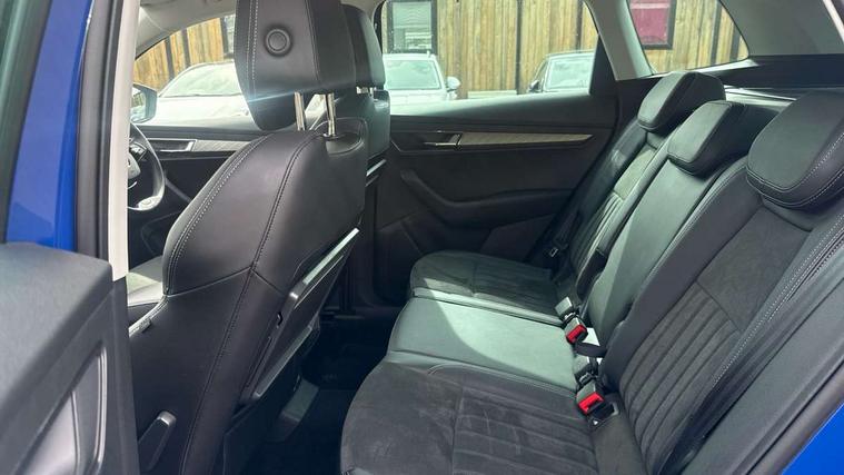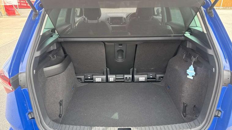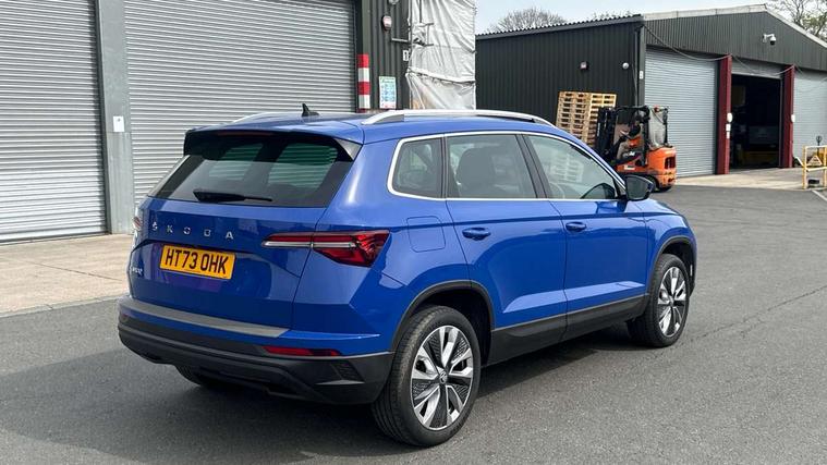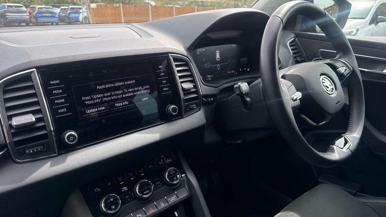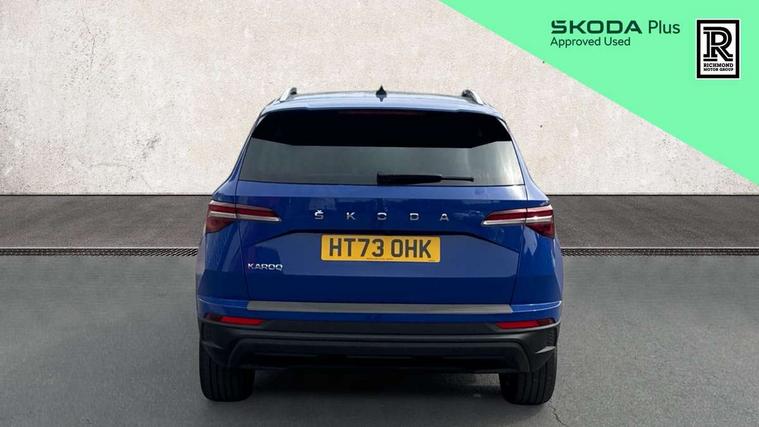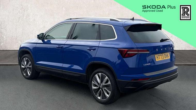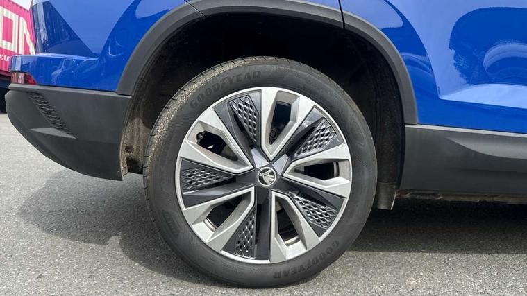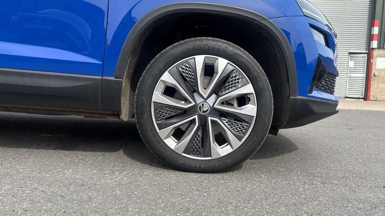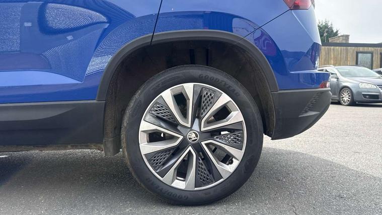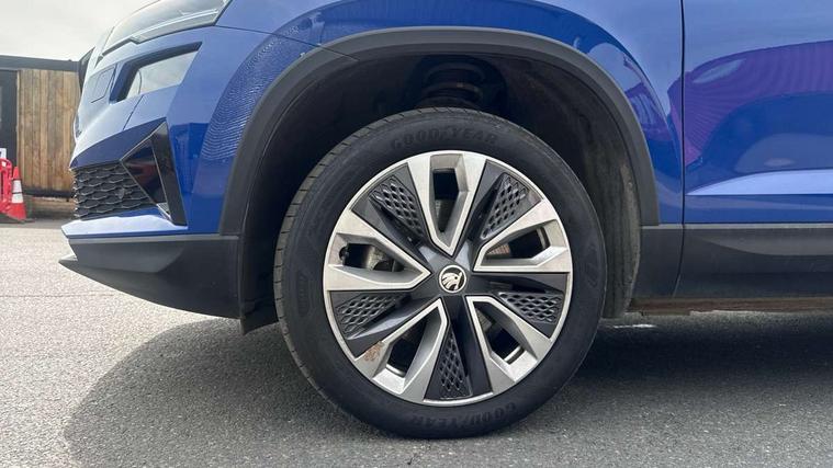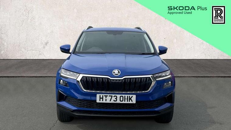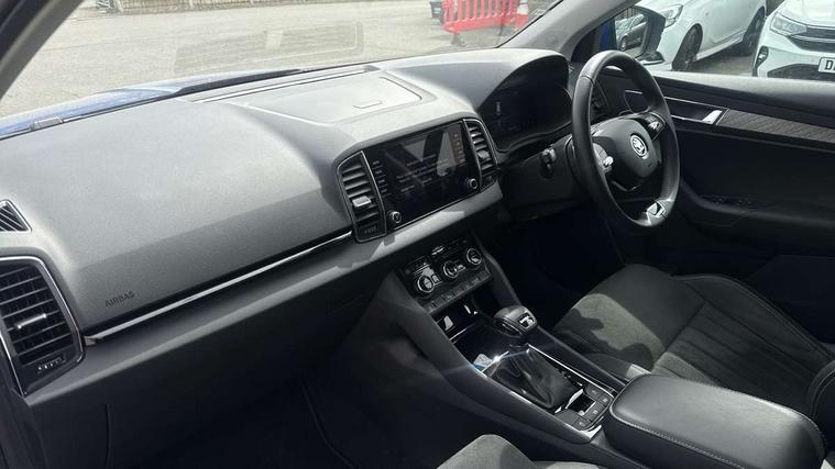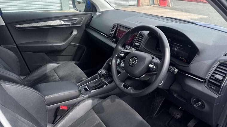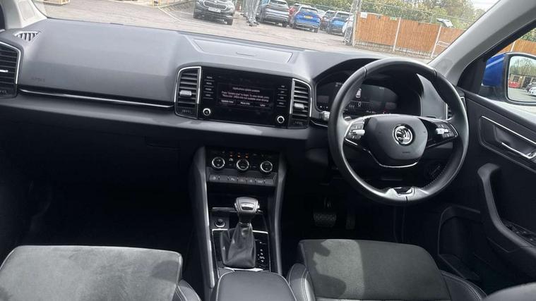 8" Digital display, Care connect, Driver fatigue sensor, Emergency services call system, Outside temperature gauge, Service interval indicator, SmartLink wireless for Apple and wired for Android, Start/stop system with regenerative braking, USB C Port x 2 in front centre console, 8 Speakers, DAB radio with Bluetooth, USB connection, Acoustic glass, Aero front windscreen wipers with intermittent function, Auto dimming rear view mirror with light and rain sensors, Black electric window control buttons, Body colour door mirrors and handles, Dynamic headlight range control with cornering light function, Electric front and rear windows with child proof lock, Heated rear windscreen, LED daytime running lights, LED rear lights with high functionality welcome effect and dynamic indicators, Light assistant (coming/leaving home/tunnel light), Plastic scuff plates, Privacy glass, Rear side wing doors, Rear spoiler, Rear window wiper with washer system and intermittent control, Safety reflectors on front doors, 1.5 litre bottle holders in driver and front passenger door panels, 12V socket in boot, 12v socket in front centre armrest with storage compartment and rear air vents, 2 spoke leather heated multifunction steering wheel with DSG paddles, 2 x Tablet holder, 3 rear height adjustable headrests, 3 seat bench in 2nd row, 4 foldable roof handles with rear coat hooks, Black floor carpet, Chrome inner door handles, Double sided boot floor, Foldable hooks in the boot, Front head restraints, Height adjustable front three point seats belts with tensioners, Height/reach adjust steering wheel, Ice scraper, Illuminated glovebox, Illuminated luggage compartment, Isofix child seat preparation for front passenger seat, Isofix child seat preparation outer rear, Manual lumbar support for front seats, Pen holder, Pollen filter, Rear boot cover, Rear reading lights, Rubbish bin door, Safety vest holder, Single front passenger seat, Storage box in upper central dashboard closed, Sunvisors with illuminated vanity mirrors, Textile floor mats, Ticket holder, VarioFlex seats with standard rear seat release, Boot pack - Karoq, Design Pack - Karoq, Parking pack - Karoq, Automatic door unlocking in case of crash, Automatic fuel cut off in case of crash, Child locks on rear doors, Driver airbag, Electronic parking brake with auto hold function, Emergency rear braking signal, ESC including ABS, MSR, ASR, EDS, HBA, DSR, RBS, MKB and traction control, Front side airbags, Hill hold control, Knee airbags, Passenger airbag with switch-off function, Pedestrian monitor, Seatbelt reminder signalisation and pretensioner for all seats, Three point seatbelts rear, Two tone horn, Tyre pressure display, Tyre pressure monitor, Alarm with interior monitoring, back up horn and tilt sensor with safe function, Electronic engine immobiliser, Keyless entry and start/stop, Remote central locking with 2 remote folding keys, Chrome framed air vents, 18" Miran alloy wheels in black, Anti-theft wheel bolts protection, Tool kit,
