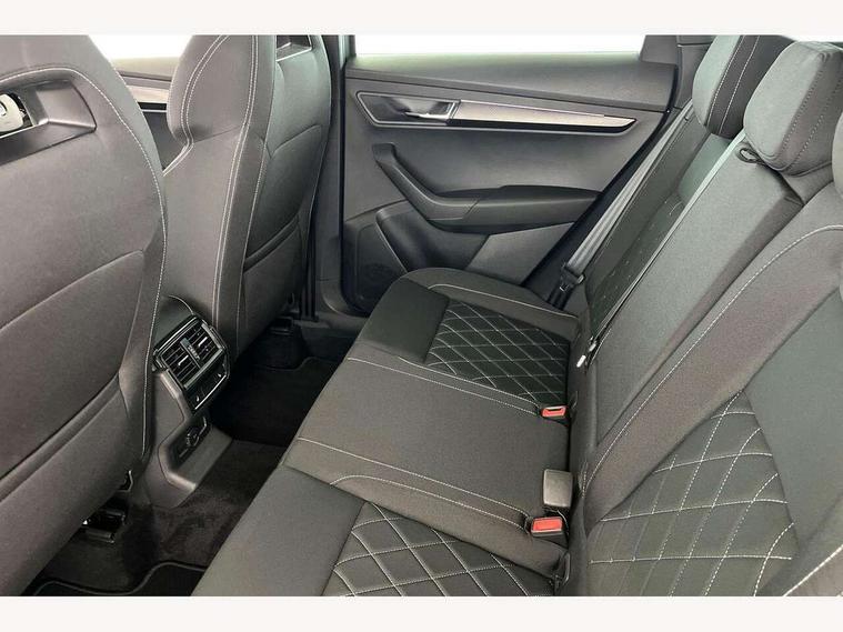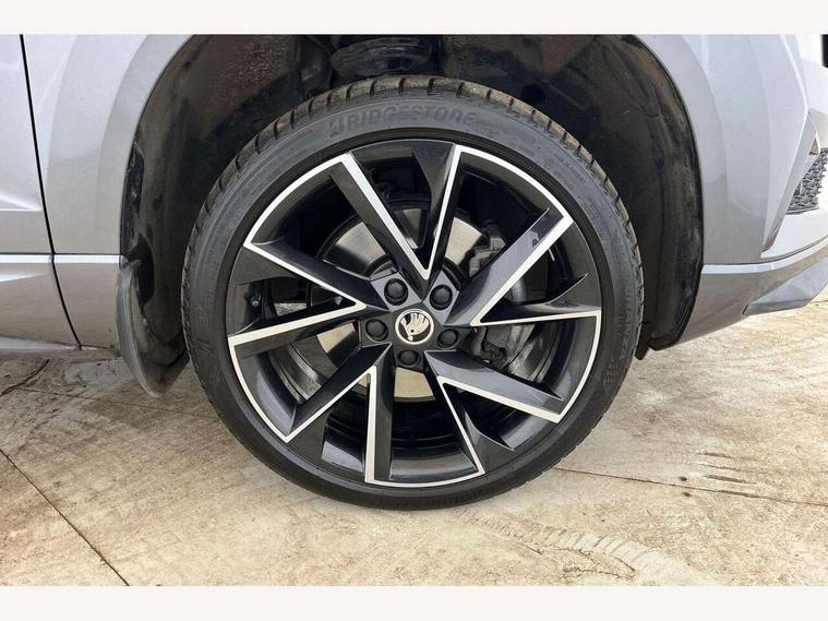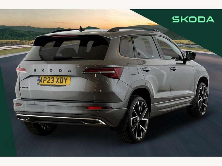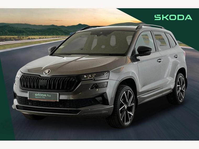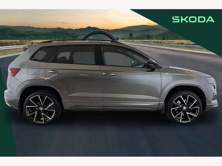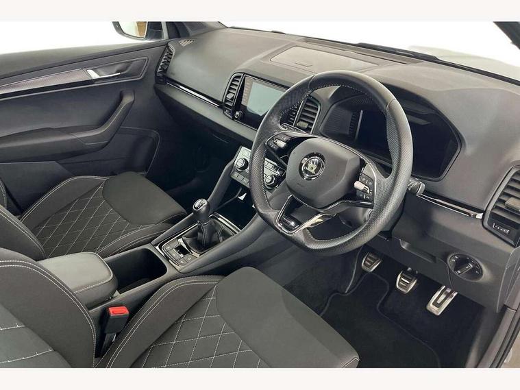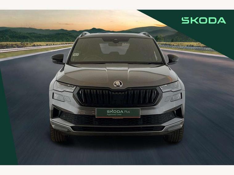 8" Digital display, Care connect, Driver fatigue sensor, Emergency services call system, Outside temperature gauge, Service interval indicator, SmartLink wireless for Apple and wired for Android, Start/stop system with regenerative braking, USB C Port x 2 in front centre console, Virtual cockpit, Virtual pedal with electrically operated boot door, 8 Speakers, DAB radio with Bluetooth, USB connection, Wireless charging without wireless aerial connection, Acoustic glass, Aero front windscreen wipers with intermittent function, Auto dimming rear view mirror with light and rain sensors, Black door mirrors, Black electric window control buttons, Black radiator grille, Black roof rails, Body colour door handles, Electric front and rear windows with child proof lock, Front door steps with SportLine logo, Heated rear windscreen, LED daytime running lights, LED rear lights with high functionality welcome effect and dynamic indicators, Light assistant (coming/leaving home/tunnel light), Panoramic sliding sunroof, Plastic scuff plates, Privacy glass, Protective door side sills in body colour, Rear diffuser, Rear side wing doors, Rear spoiler, Rear window wiper with washer system and intermittent control, Safety reflectors on front doors, Skoda lettering on tailgate in black, Sportline badge on front fender, Sportline decorative inserts with badging, Sports front and rear bumpers, 1.5 litre bottle holders in driver and front passenger door panels, 12V socket in boot, 12v socket in front centre armrest with storage compartment and rear air vents, 3 rear height adjustable headrests, 3 seat bench in 2nd row, 3 spoke leather sports multifunction steering wheel and silver stitching, 4 foldable roof handles with rear coat hooks, Black floor carpet, Black roof headlining, Chrome inner door handles, Double sided boot floor, Foldable hooks in the boot, Front head restraints, Height adjustable front three point seats belts with tensioners, Height/reach adjust steering wheel, Ice scraper, Illuminated glovebox, Illuminated luggage compartment, Isofix child seat preparation outer rear, Manual lumbar support for front seats, Pen holder, Pollen filter, Rear boot cover, Rear reading lights, Rear seats fixed folding and divided 60:40, Rubbish bin door, Safety vest holder, Single front passenger seat, Storage box in upper central dashboard closed, Sunvisors with illuminated vanity mirrors, Textile floor mats, Ticket holder, Titan black interior ceiling, Welcome animation with sportline logo, Boot pack - Karoq, Light Pack - Karoq, Parking pack - Karoq, Automatic door unlocking in case of crash, Automatic fuel cut off in case of crash, Child locks on rear doors, Driver airbag, Electronic parking brake with auto hold function, Emergency rear braking signal, ESC including ABS, MSR, ASR, EDS, HBA, DSR, RBS, MKB and traction control, Front side airbags, Hill hold control, Knee airbags, Passenger airbag with switch-off function, Pedestrian monitor, Seatbelt reminder signalisation and pretensioner for all seats, Three point seatbelts rear, Two tone horn, Tyre pressure display, Tyre pressure monitor, Alarm with interior monitoring, back up horn and tilt sensor with safe function, Electronic engine immobiliser, Keyless entry and start/stop, Remote central locking with 2 remote folding keys, Black air vent surround, Black centre console, Satin black dashboard, Satin black door trim, 19" Sagitarius anthracite alloy wheels with matt black aero inserts, Anti-theft wheel bolts protection, Matt black aero hub caps, Storage on wheel cover, Tool kit,