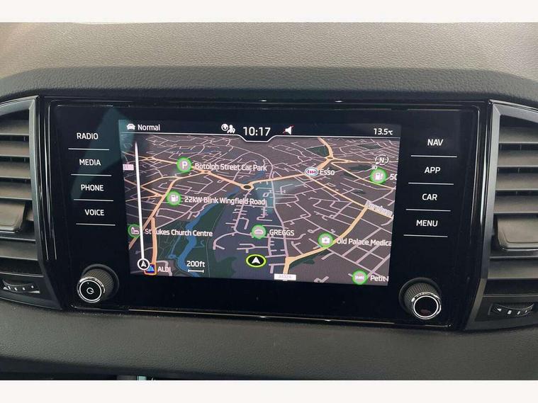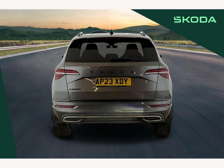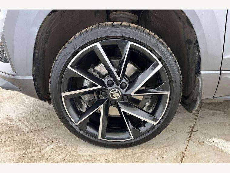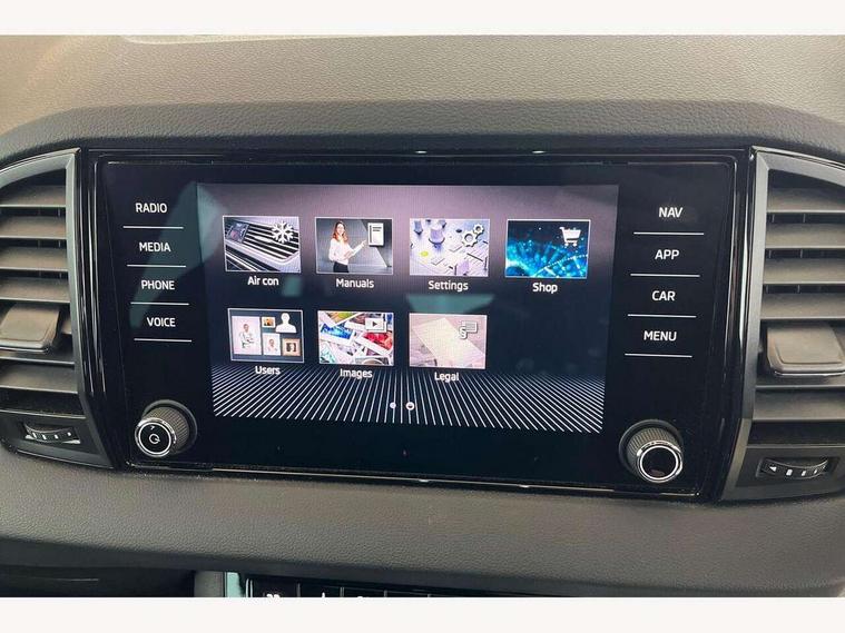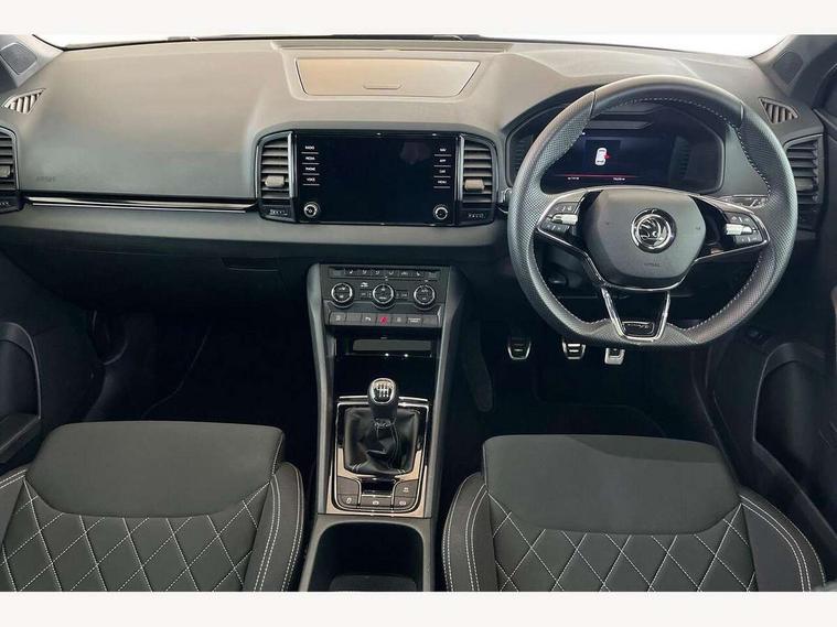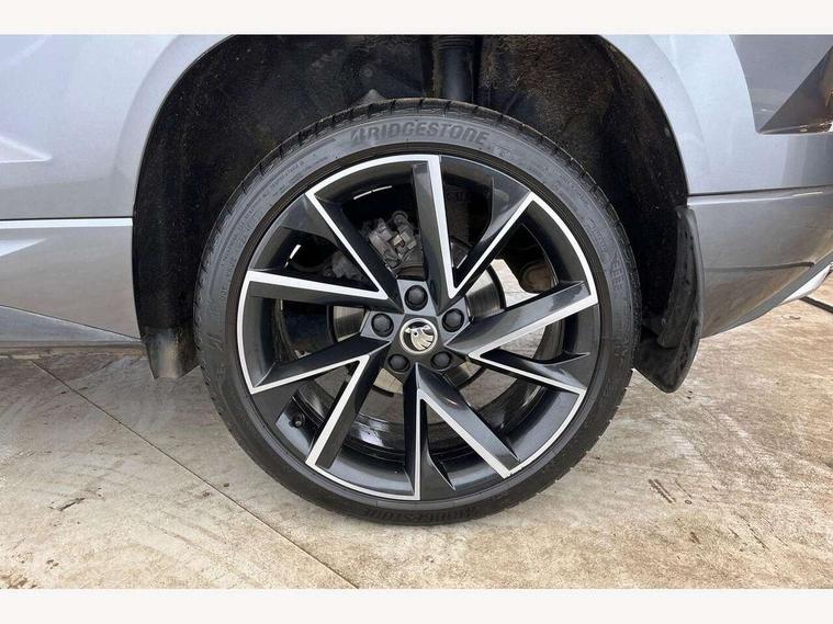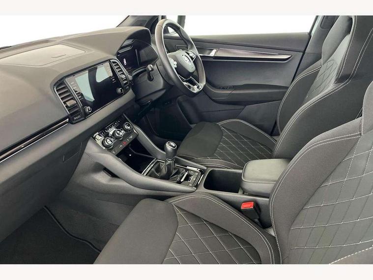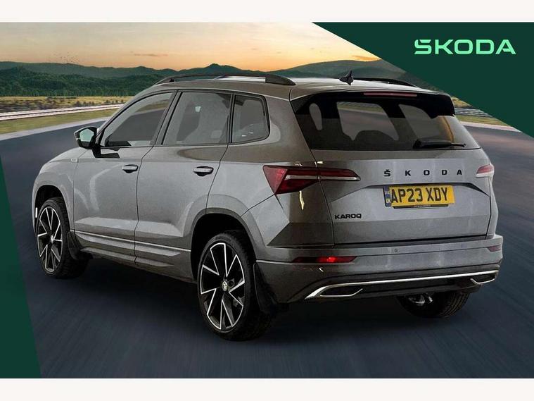 8" Digital display, Care connect, Driver fatigue sensor, Emergency services call system, Outside temperature gauge, Service interval indicator, SmartLink wireless for Apple and wired for Android, Start/stop system with regenerative braking, USB C Port x 2 in front centre console, Virtual cockpit, Virtual pedal with electrically operated boot door, 8 Speakers, DAB radio with Bluetooth, USB connection, Wireless charging without wireless aerial connection, Acoustic glass, Aero front windscreen wipers with intermittent function, Auto dimming rear view mirror with light and rain sensors, Black door mirrors, Black electric window control buttons, Black radiator grille, Black roof rails, Body colour door handles, Electric front and rear windows with child proof lock, Front door steps with SportLine logo, Heated rear windscreen, LED daytime running lights, LED rear lights with high functionality welcome effect and dynamic indicators, Light assistant (coming/leaving home/tunnel light), Panoramic sliding sunroof, Plastic scuff plates, Privacy glass, Protective door side sills in body colour, Rear diffuser, Rear side wing doors, Rear spoiler, Rear window wiper with washer system and intermittent control, Safety reflectors on front doors, Skoda lettering on tailgate in black, Sportline badge on front fender, Sportline decorative inserts with badging, Sports front and rear bumpers, 1.5 litre bottle holders in driver and front passenger door panels, 12V socket in boot, 12v socket in front centre armrest with storage compartment and rear air vents, 3 rear height adjustable headrests, 3 seat bench in 2nd row, 3 spoke leather sports multifunction steering wheel and silver stitching, 4 foldable roof handles with rear coat hooks, Black floor carpet, Black roof headlining, Chrome inner door handles, Double sided boot floor, Foldable hooks in the boot, Front head restraints, Height adjustable front three point seats belts with tensioners, Height/reach adjust steering wheel, Ice scraper, Illuminated glovebox, Illuminated luggage compartment, Isofix child seat preparation outer rear, Manual lumbar support for front seats, Pen holder, Pollen filter, Rear boot cover, Rear reading lights, Rear seats fixed folding and divided 60:40, Rubbish bin door, Safety vest holder, Single front passenger seat, Storage box in upper central dashboard closed, Sunvisors with illuminated vanity mirrors, Textile floor mats, Ticket holder, Titan black interior ceiling, Welcome animation with sportline logo, Boot pack - Karoq, Light Pack - Karoq, Parking pack - Karoq, Automatic door unlocking in case of crash, Automatic fuel cut off in case of crash, Child locks on rear doors, Driver airbag, Electronic parking brake with auto hold function, Emergency rear braking signal, ESC including ABS, MSR, ASR, EDS, HBA, DSR, RBS, MKB and traction control, Front side airbags, Hill hold control, Knee airbags, Passenger airbag with switch-off function, Pedestrian monitor, Seatbelt reminder signalisation and pretensioner for all seats, Three point seatbelts rear, Two tone horn, Tyre pressure display, Tyre pressure monitor, Alarm with interior monitoring, back up horn and tilt sensor with safe function, Electronic engine immobiliser, Keyless entry and start/stop, Remote central locking with 2 remote folding keys, Black air vent surround, Black centre console, Satin black dashboard, Satin black door trim, 19" Sagitarius anthracite alloy wheels with matt black aero inserts, Anti-theft wheel bolts protection, Matt black aero hub caps, Storage on wheel cover, Tool kit,