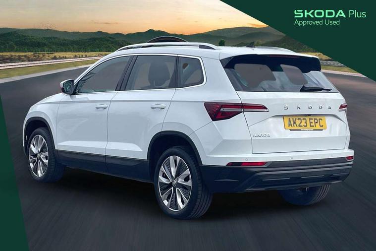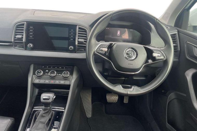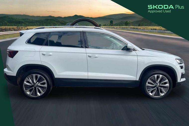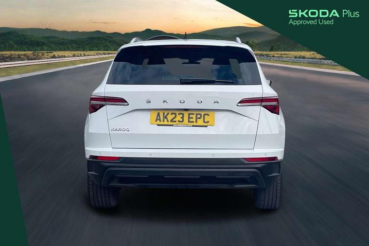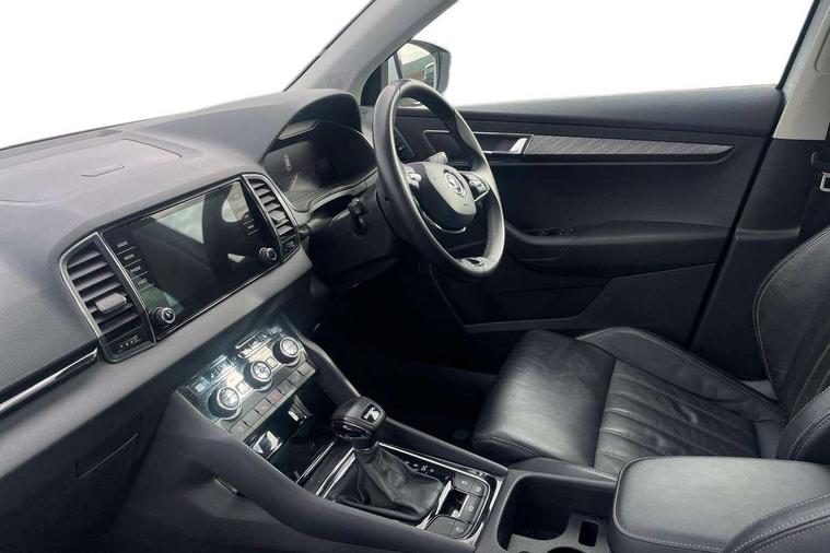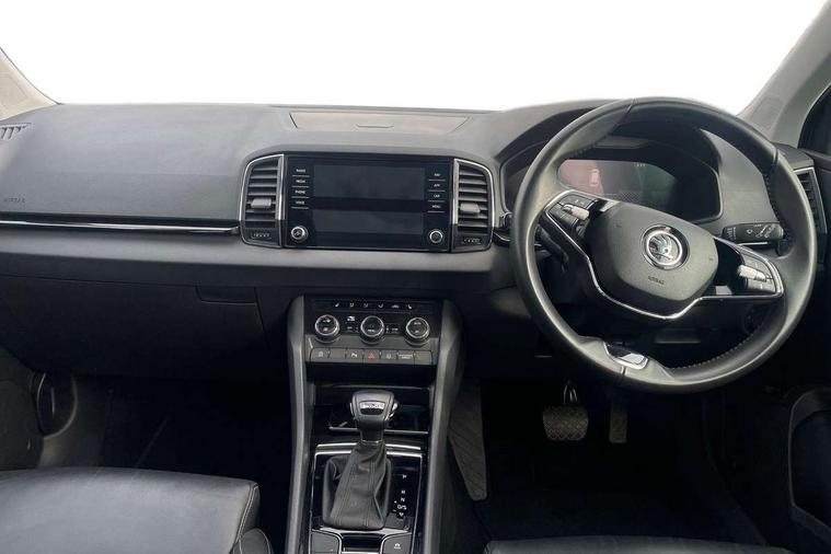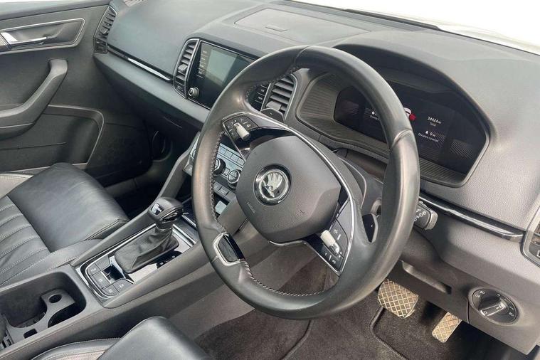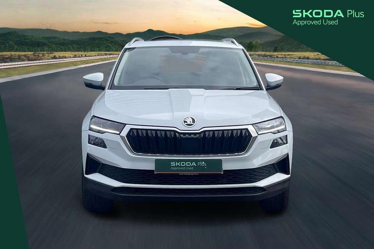 8" Digital display, Care connect, Driver fatigue sensor, Emergency services call system, Outside temperature gauge, Service interval indicator, SmartLink wireless for Apple and wired for Android, Start/stop system with regenerative braking, USB C Port x 2 in front centre console, 8 Speakers, DAB radio with Bluetooth, USB connection, Acoustic glass, Aero front windscreen wipers with intermittent function, Auto dimming rear view mirror with light and rain sensors, Black electric window control buttons, Body colour door mirrors and handles, Dynamic headlight range control with cornering light function, Electric front and rear windows with child proof lock, Heated rear windscreen, LED daytime running lights, LED rear lights with high functionality welcome effect and dynamic indicators, Light assistant (coming/leaving home/tunnel light), Plastic scuff plates, Privacy glass, Rear side wing doors, Rear spoiler, Rear window wiper with washer system and intermittent control, Safety reflectors on front doors, 1.5 litre bottle holders in driver and front passenger door panels, 12V socket in boot, 12v socket in front centre armrest with storage compartment and rear air vents, 2 Folding hooks and nets in boot, 2 spoke leather heated multifunction steering wheel with DSG paddles, 2 x Tablet holder, 3 rear height adjustable headrests, 3 seat bench in 2nd row, 4 foldable roof handles with rear coat hooks, Black floor carpet, Chrome inner door handles, Decorative door sills with KAROQ badging, Double sided boot floor, Foldable hooks in the boot, Front head restraints, Height adjustable front three point seats belts with tensioners, Height/reach adjust steering wheel, Ice scraper, Illuminated glovebox, Illuminated luggage compartment, Isofix child seat preparation for front passenger seat, Isofix child seat preparation outer rear, Manual lumbar support for front seats, Pen holder, Pollen filter, Rear boot cover, Rear reading lights, Rubbish bin door, Safety vest holder, Single front passenger seat, Storage box in upper central dashboard closed, Sunvisors with illuminated vanity mirrors, Textile floor mats, Ticket holder, VarioFlex seats with standard rear seat release, Chrome roof rails + chrome pack - Karoq, Parking pack - Karoq, Automatic door unlocking in case of crash, Automatic fuel cut off in case of crash, Child locks on rear doors, Driver airbag, Electronic parking brake with auto hold function, Emergency rear braking signal, ESC including ABS, MSR, ASR, EDS, HBA, DSR, RBS, MKB and traction control, Front side airbags, Hill hold control, Knee airbags, Passenger airbag with switch-off function, Pedestrian monitor, Seatbelt reminder signalisation and pretensioner for all seats, Three point seatbelts rear, Two tone horn, Tyre pressure display, Tyre pressure monitor, Alarm with interior monitoring, back up horn and tilt sensor with safe function, Electronic engine immobiliser, Keyless entry and start/stop, Remote central locking with 2 remote folding keys, Chrome framed air vents, 18" Procyon silver alloy wheels with anthracite aero inserts, Anti-theft wheel bolts protection, Storage on wheel cover, Tool kit,