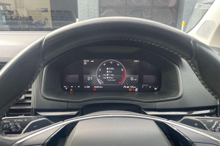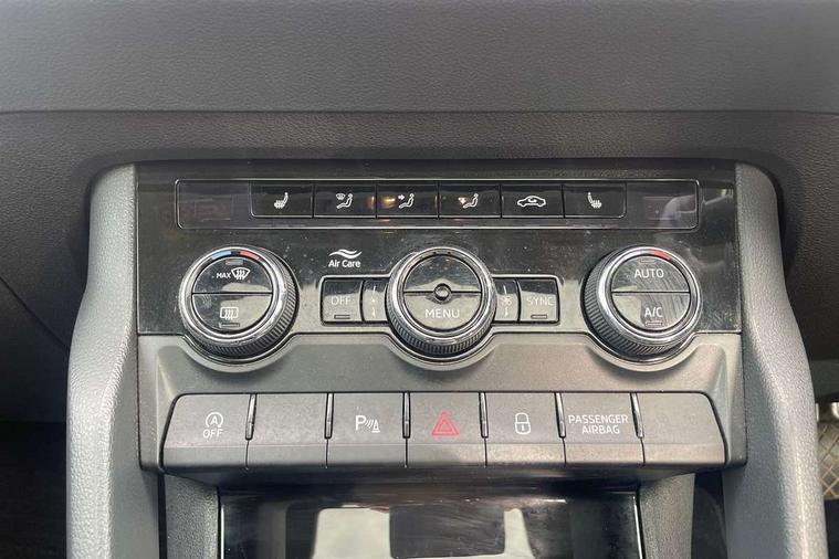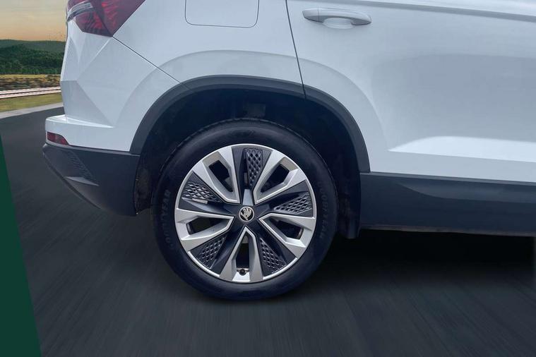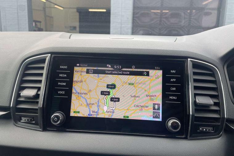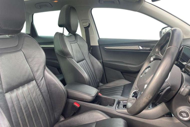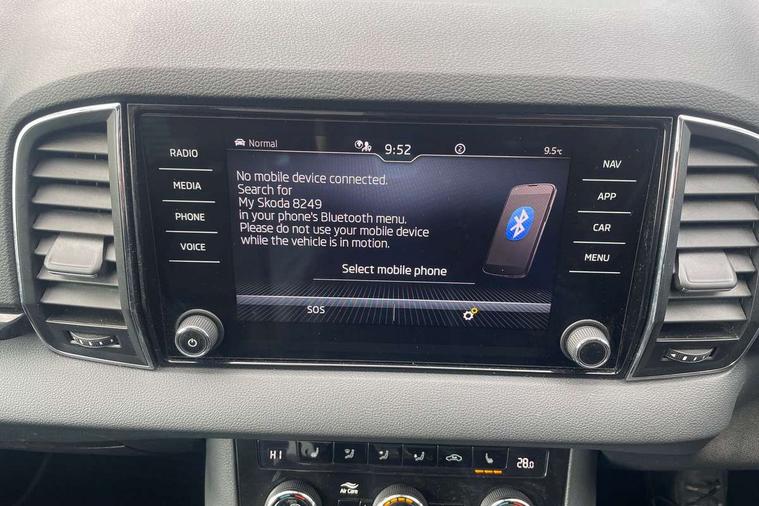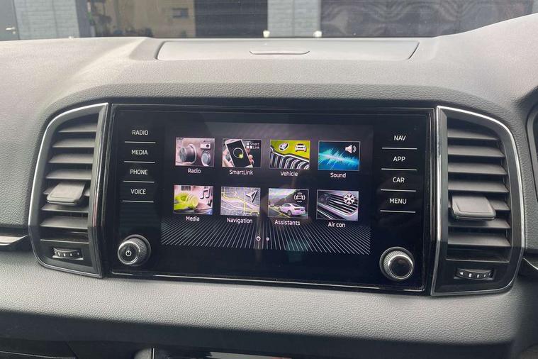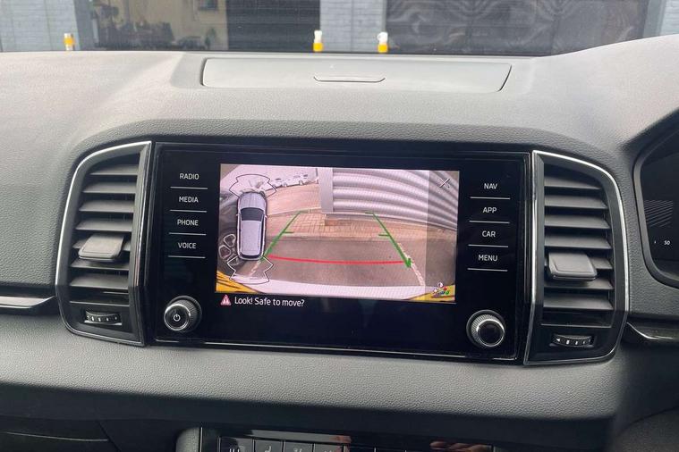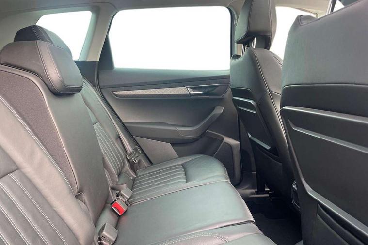 8" Digital display, Care connect, Driver fatigue sensor, Emergency services call system, Outside temperature gauge, Service interval indicator, SmartLink wireless for Apple and wired for Android, Start/stop system with regenerative braking, USB C Port x 2 in front centre console, 8 Speakers, DAB radio with Bluetooth, USB connection, Acoustic glass, Aero front windscreen wipers with intermittent function, Auto dimming rear view mirror with light and rain sensors, Black electric window control buttons, Body colour door mirrors and handles, Dynamic headlight range control with cornering light function, Electric front and rear windows with child proof lock, Heated rear windscreen, LED daytime running lights, LED rear lights with high functionality welcome effect and dynamic indicators, Light assistant (coming/leaving home/tunnel light), Plastic scuff plates, Privacy glass, Rear side wing doors, Rear spoiler, Rear window wiper with washer system and intermittent control, Safety reflectors on front doors, 1.5 litre bottle holders in driver and front passenger door panels, 12V socket in boot, 12v socket in front centre armrest with storage compartment and rear air vents, 2 Folding hooks and nets in boot, 2 spoke leather heated multifunction steering wheel with DSG paddles, 2 x Tablet holder, 3 rear height adjustable headrests, 3 seat bench in 2nd row, 4 foldable roof handles with rear coat hooks, Black floor carpet, Chrome inner door handles, Decorative door sills with KAROQ badging, Double sided boot floor, Foldable hooks in the boot, Front head restraints, Height adjustable front three point seats belts with tensioners, Height/reach adjust steering wheel, Ice scraper, Illuminated glovebox, Illuminated luggage compartment, Isofix child seat preparation for front passenger seat, Isofix child seat preparation outer rear, Manual lumbar support for front seats, Pen holder, Pollen filter, Rear boot cover, Rear reading lights, Rubbish bin door, Safety vest holder, Single front passenger seat, Storage box in upper central dashboard closed, Sunvisors with illuminated vanity mirrors, Textile floor mats, Ticket holder, VarioFlex seats with standard rear seat release, Chrome roof rails + chrome pack - Karoq, Parking pack - Karoq, Automatic door unlocking in case of crash, Automatic fuel cut off in case of crash, Child locks on rear doors, Driver airbag, Electronic parking brake with auto hold function, Emergency rear braking signal, ESC including ABS, MSR, ASR, EDS, HBA, DSR, RBS, MKB and traction control, Front side airbags, Hill hold control, Knee airbags, Passenger airbag with switch-off function, Pedestrian monitor, Seatbelt reminder signalisation and pretensioner for all seats, Three point seatbelts rear, Two tone horn, Tyre pressure display, Tyre pressure monitor, Alarm with interior monitoring, back up horn and tilt sensor with safe function, Electronic engine immobiliser, Keyless entry and start/stop, Remote central locking with 2 remote folding keys, Chrome framed air vents, 18" Procyon silver alloy wheels with anthracite aero inserts, Anti-theft wheel bolts protection, Storage on wheel cover, Tool kit,