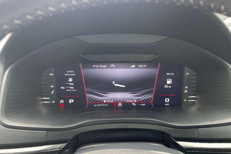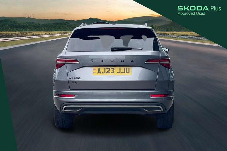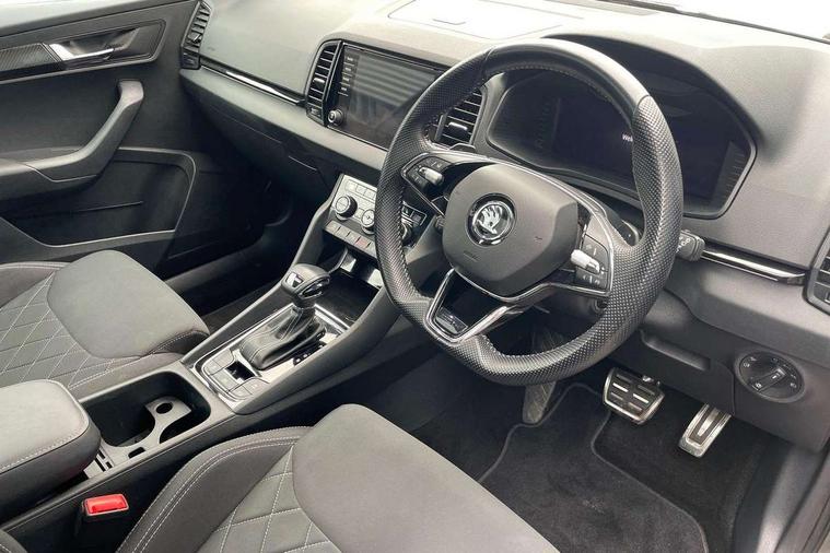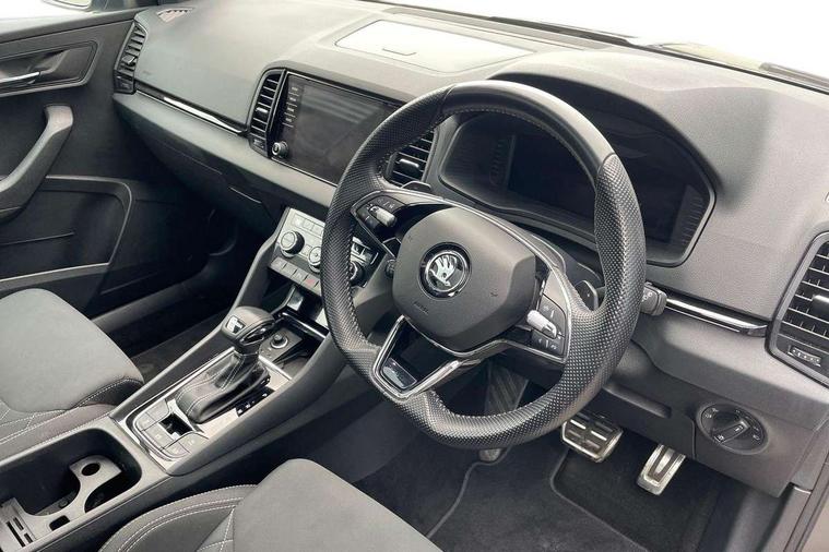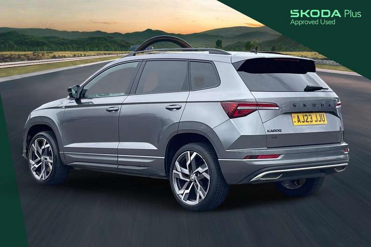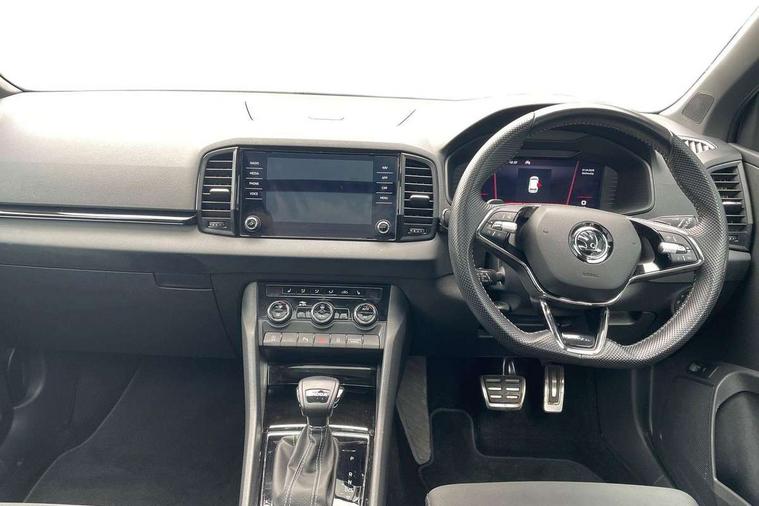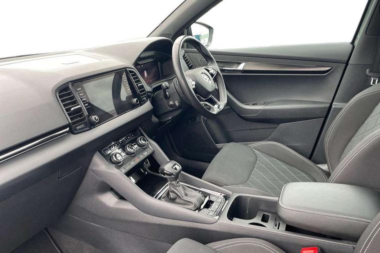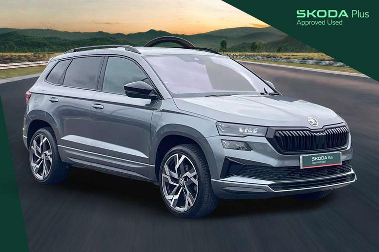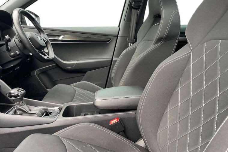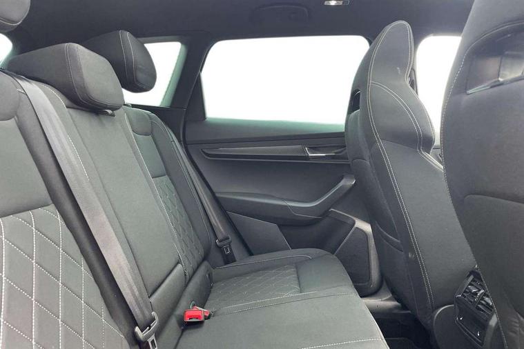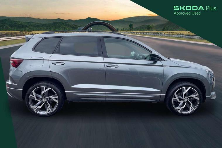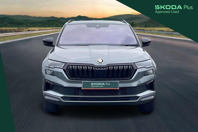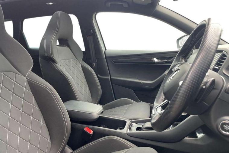 8" Digital display, Care connect, Driver fatigue sensor, Emergency services call system, Outside temperature gauge, Service interval indicator, SmartLink wireless for Apple and wired for Android, Start/stop system with regenerative braking, USB C Port x 2 in front centre console, Virtual cockpit, Virtual pedal with electrically operated boot door, 8 Speakers, DAB radio with Bluetooth, USB connection, Wireless charging without wireless aerial connection, Acoustic glass, Aero front windscreen wipers with intermittent function, Auto dimming rear view mirror with light and rain sensors, Black door mirrors, Black electric window control buttons, Black radiator grille, Black roof rails, Body colour door handles, Dynamic headlight range control with cornering light function, Electric front and rear windows with child proof lock, Front door steps with SportLine logo, Heated rear windscreen, LED daytime running lights, LED rear lights with high functionality welcome effect and dynamic indicators, Light assistant (coming/leaving home/tunnel light), Panoramic sliding sunroof, Plastic scuff plates, Privacy glass, Protective door side sills in body colour, Rear diffuser, Rear side wing doors, Rear spoiler, Rear window wiper with washer system and intermittent control, Safety reflectors on front doors, Skoda lettering on tailgate in black, Sportline badge on front fender, Sportline decorative inserts with badging, Sports front and rear bumpers, 1.5 litre bottle holders in driver and front passenger door panels, 12V socket in boot, 12v socket in front centre armrest with storage compartment and rear air vents, 3 rear height adjustable headrests, 3 seat bench in 2nd row, 3 spoke leather sports multifunction steering wheel and silver stitching with gear shift paddles, 4 foldable roof handles with rear coat hooks, Black floor carpet, Black roof headlining, Chrome inner door handles, Double sided boot floor, Foldable hooks in the boot, Front head restraints, Height adjustable front three point seats belts with tensioners, Height/reach adjust steering wheel, Ice scraper, Illuminated glovebox, Illuminated luggage compartment, Isofix child seat preparation outer rear, Manual lumbar support for front seats, Pen holder, Pollen filter, Rear boot cover, Rear reading lights, Rear seats fixed folding and divided 60:40, Rubbish bin door, Safety vest holder, Single front passenger seat, Storage box in upper central dashboard closed, Sunvisors with illuminated vanity mirrors, Textile floor mats, Ticket holder, Titan black interior ceiling, Welcome animation with sportline logo, Boot pack - Karoq, Light Pack - Karoq, Parking pack - Karoq, Automatic door unlocking in case of crash, Automatic fuel cut off in case of crash, Child locks on rear doors, Driver airbag, Electronic parking brake with auto hold function, Emergency rear braking signal, ESC including ABS, MSR, ASR, EDS, HBA, DSR, RBS, MKB and traction control, Front side airbags, Hill hold control, Knee airbags, Passenger airbag with switch-off function, Pedestrian monitor, Seatbelt reminder signalisation and pretensioner for all seats, Three point seatbelts rear, Two tone horn, Tyre pressure display, Tyre pressure monitor, Alarm with interior monitoring, back up horn and tilt sensor with safe function, Electronic engine immobiliser, Keyless entry and start/stop, Remote central locking with 2 remote folding keys, Black air vent surround, Black centre console, Satin black dashboard, Satin black door trim, 19" Vega black polished alloy wheels, Anti-theft wheel bolts protection, Matt black aero hub caps, Storage on wheel cover, Tool kit,