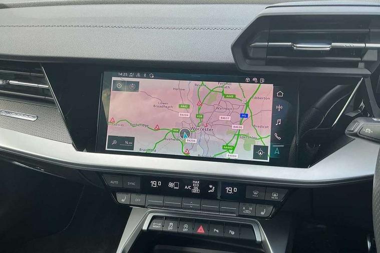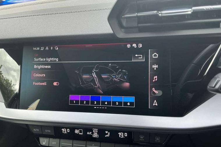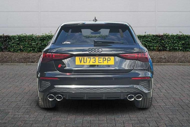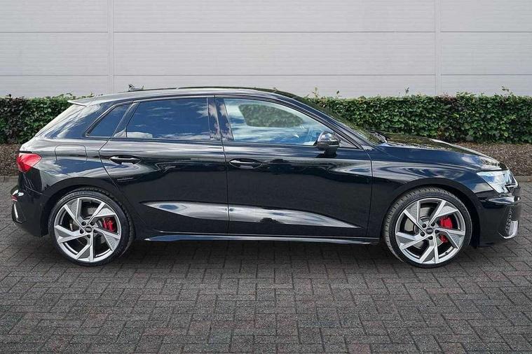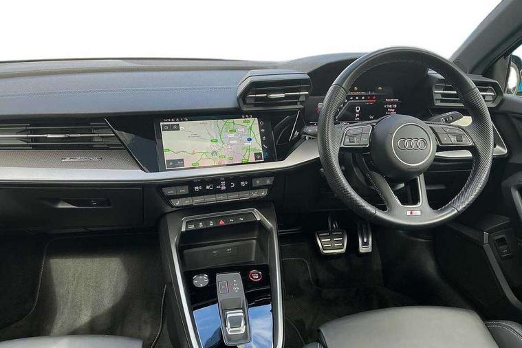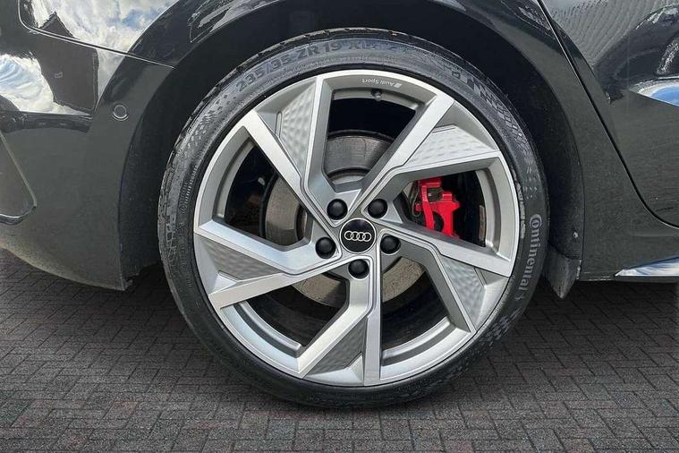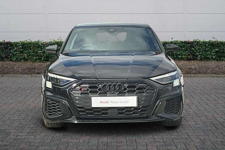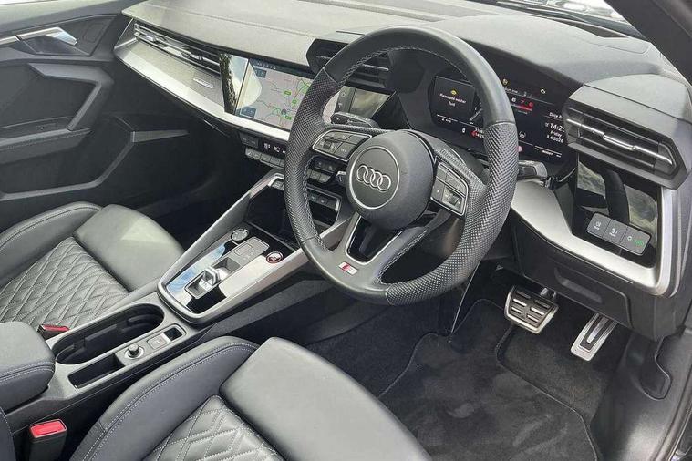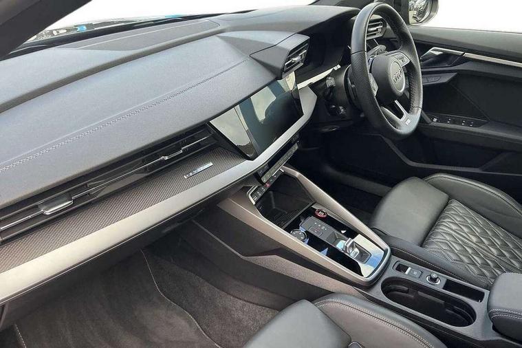 Adaptive cruise assist, Audi drive select (Auto, Comfort, Dynamic, Efficiency and Individual), Audi smartphone interface, Audi virtual cockpit plus - 12.3" full HD resolution dynamic digital instrument cluster, Automatic start/stop system with recuperation, Bluetooth interface, Collision avoidance assistant, e-Call (emergency call), Head up Display, Lane change assistant with exit warning system and rear cross traffic alert, Lane departure warning system, MMI Navigation Plus with high resolution 10.1" colour touch screen display, Power operated tailgate - Luggage compartment lid opens/closes electrically, Progressive steering, Service indicator, Trip computer, Voice control system with natural language interaction, Quattro permanent all wheel drive, S suspension with damper control, 2xUSB-C connection with data and charging functions, DAB Digital radio, 3rd brake light, Acoustic glass windscreen, Audi Beam uses LEDs to project Vorsprung onto the ground as you exit your S3, Auto dimming frameless rear view mirror, Carbon door mirror housings, Dual branch oval twin tailpipes in chrome plated finish, Electrically adj heated/folding + automatically dimming exterior mirrors with memory + automatic kerb side function for passenger side exterior mirror, Front electric windows, Headlight washers, Heat insulating glass windscreen, Illuminated door sills with aluminium inserts at the front with S logo, Integrated LED indicators in door mirrors, LED daytime running lights, Light and rain sensors, Privacy glass - dark tinted rear window, rear door and side windows, Rear electric windows, Rear side air outlets in grained matt black, Rear side wing doors, Rear wiper, 12V socket and storage compartment in front centre console, 3 seat bench in 2nd row, 3 spoke leather multifunction steering wheel with gear shift paddles, 4 way electrically adjustable lumbar support for driver and front passenger, 60/40 split folding rear seat bench, Black cloth headlining, Dual zone electronic climate control, Fine Nappa leather upholstery with front sports seats S embossed logo, Front and rear centre armrest in artificial leather, Front and rear headrests, Front/rear floor mats, Height and reach adjustable steering wheel, Interior lighting - glove compartment light and right hand side, Luggage compartment floor covering, Seat side bolsters, Single front passenger seat, Stainless steel pedals and front footrest in black, Aluminium interior elements pack - A3 Sportback, Black styling pack - A3 Sportback/S3, Body styling design pack - S3, Extended ambient lighting pack - A3 Sportback, Storage pack - A3 Sportback, Technology pack pro with 360 camera - A3 Sportback/Voursprung, 3x3 point rear seat belts, Driver and front passenger airbag with passenger airbag deactivation, Electronic Stabilisation Control (ESC) including ABS, ASR and EDL, First aid kit with warning triangle and 2 safety vests, Front side airbags with head airbags and interaction airbag, Pre-sense front with pedestrian and cyclist detection, Seatbelt monitoring, Tyre pressure loss indicator, Anti theft alarm, Anti-theft wheel bolts, Electronically operated child locks, Immobiliser, Remote control central locking, Carbon inlays, accent surfaces in the dashboard and centre console in platinum grey silk effect paint finish,