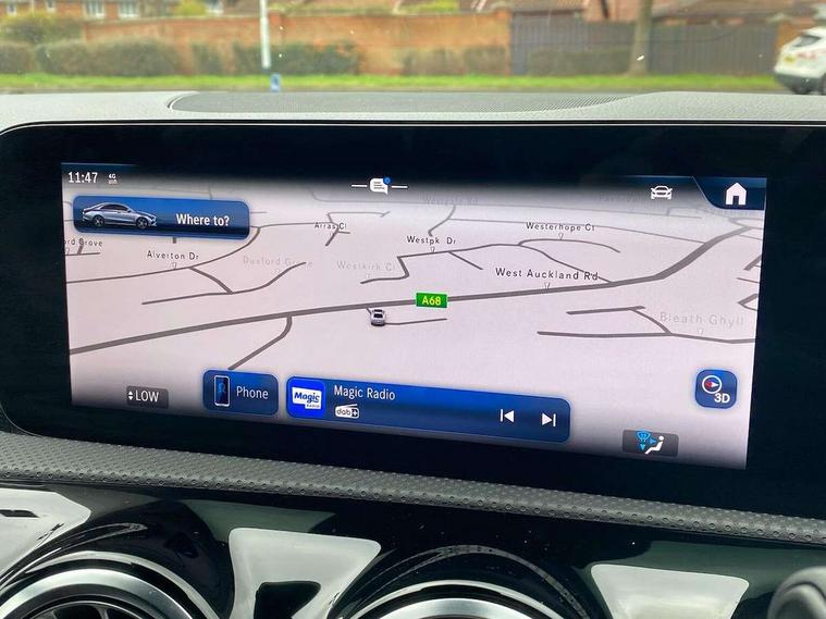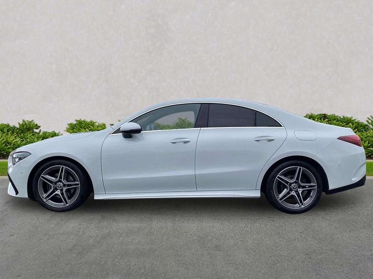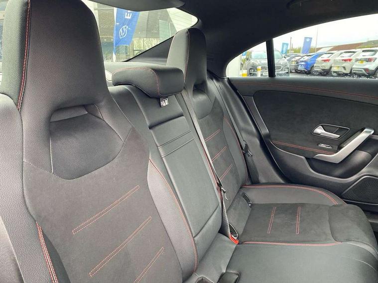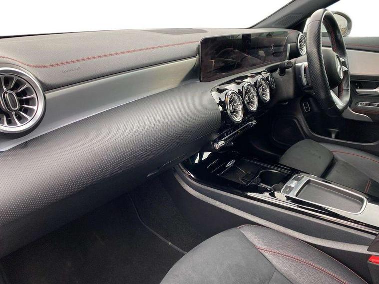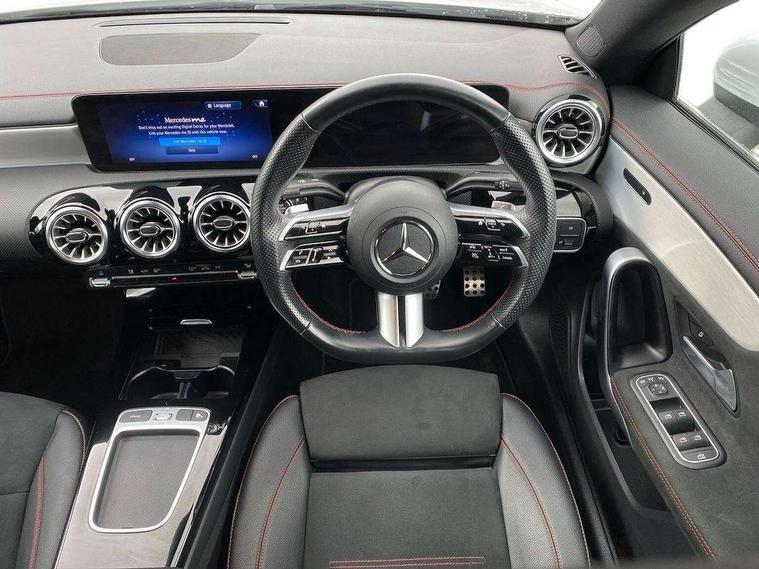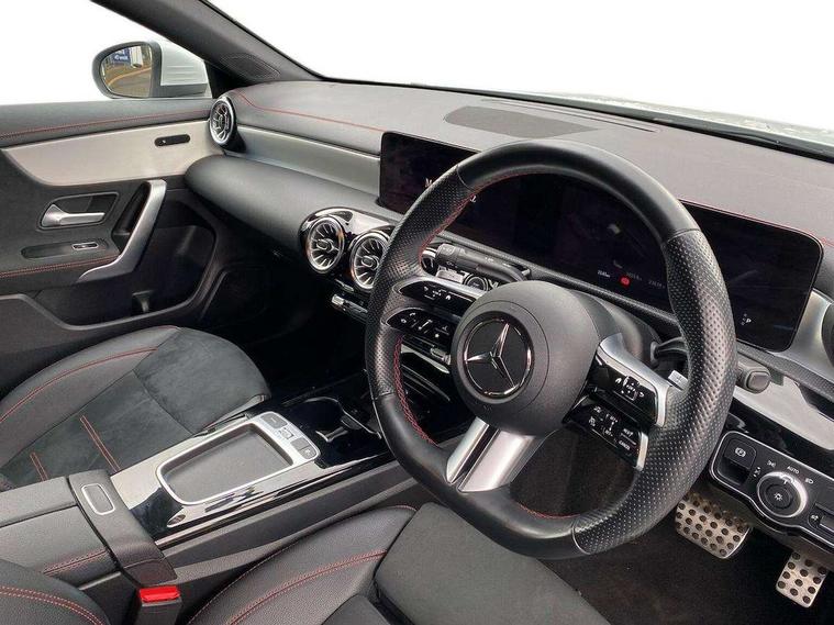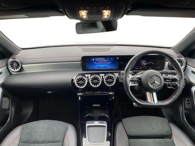 10.25 inch Instrument display with digital cockpit, 10.25 inch touchscreen central media display, Active lane keeping assist, Attention assist - Monitors steering behaviour and long journey fatigue, Bluetooth connection, Car wash mode, Cruise control with limiter, Direct steer system, DYNAMIC SELECT with a choice of driving modes (ECO, Comfort, Sport and Individual), ECO start/stop function, Fluid level warning indicator for fuel, oil, coolant and washer fluid, Hard-disk navigation, Hey Mercedes Voice activation, Lamp failure indicator, Mercedes me connect including emergency call system, accident recovery, breakdown and maintenance management, Mercedes me remote services, Outside temperature gauge, Owners manual in English, Pre-installation of private car share, Radio aerial integrated into front and rear windshields, Service indicator (ASSYST), Smartphone integration with Apple CarPlay and Android auto, Speed limit assist, Trip computer in multifunction display with current consumption indicator, Wireless charging in the front centre console, Comfort suspension with ride height lowering, Rear axle multi-link, DAB digital radio tuner, MBUX multimedia system, Mercedes Benz sound system (100 W) with 6 speakers, Pre installation for Mercedes Benz Link, Adaptive brake lights, AMG body styling with AMG front apron and rear apron and visible exhaust tailpipe in chrome trim elements, Body colour door handles, Chrome beltline strips, Electric windows, Electrically adjustable and heated door mirrors with integrated LED indicators, Exhaust system with 2 Visible tailpipe trim elements and rear apron with trim in chrome, Hand free access, Headlamp assist automatic headlamp activation, Heated glass rear windscreen + timer control, High level LED third brake light, Interior mirror with black reading lamps and frameless, LED high performance headlamps with integrated LED daytime running lights and adaptive highbeam assist, LED tail lamp, Privacy glass with dark tinting on rear side windows and rear window, Radiator grille with Mercedes-Benz pattern in chrome with central Mercedes star and single louvre with chrome inserts, Rain sensing windscreen wipers with two sensitivity settings, Rear boot, Rear fog lamp, Rear side wing doors, Variable front intermittent wipers, Window line trim strip in high gloss aluminium, 3 seat bench in 2nd row, 3 twin spoke flattened multifunction steering wheel in nappa leather - horizontal twin spoke in high gloss black, vertical twin spoke in silver chrome, 4 way lumbar support, 40:20:40 split folding rear seat backrests, Air condition air vents with surround in silver chrome, Air conditioning - One zone THERMATIC automatic climate control with automatically controlled air distribution, Artico man-made leather/Microcut microfibre upholstery, Automatic child seat recognition sensor, Black roof lining, Brushed stainless steel sports pedals with rubber studs, Floor mats with stitched AMG lettering, Fluorescent jacket, Front centre armrest with stowage, Galvanished gear shift paddles in silver chrome, Heated front seats, Interior lighting - 64 colour Ambient lighting, Luggage net on driver/front passenger seat backrest, Manually height and reach adjustable steering column, Rear head restraints, Single front passenger seat, Sport seats with fixed head restraints, Stowage compartment in centre console with retractable cover, Sunvisors with illuminated vanity mirrors, Twin front cupholders, Two outer rear seat isofix and top tether child seat fixing points, Keyless go comfort pack - CLA, Light and sight pack - CLA, Mirror pack - CLA, Parking pack with reversing camera - CLA, Seat comfort pack - CLA, USB package plus - CLA, Active bonnet pedestrain safety measure which detects an impact and raises bonnet by 65mm, Active brake assist includes forward collision warning system with autonomous braking, Adaptive brake assist with hold function and hill start assist, Anti lock braking system (ABS) with brake assist, Black seat belts, Bonnet with power domes, Brake calipers with Mercedes-Benz lettering, Brake pad wear warning indicator, Childproof locks manually operated for rear doors and electrically operated for rear power windows, Crash responsive emergency lighting, Driver and front passenger head and sidebags, Driver and front passenger windowbags, Drivers knee airbag, Dual stage driver and front passenger airbags, Electric parking brake, Electronic stability programme with acceleration skid control, ESP curve dynamic assist, Front and rear seatbelt reminder, Front passenger seat occupancy sensor, Perforated front brake discs, Sports braking system, Three point rear seat belts, Tyre pressure monitoring system, Warning triangle and first aid kit, Alarm system with immobiliser and interior protection -Thatcham category 1, Guard 360 deg vehicle protection - tow away protection with visual, acoustic warning, interior monitoring, preinstallation for parking damage, Remote central locking and crash sensor with emergency opening function, Light aluminium with longitudinal grain interior trim, 18" AMG 5 twin spoke light alloy wheels painted in termolite grey with high sheen finish, Summer tyres, Tirefit tyre sealant kit,