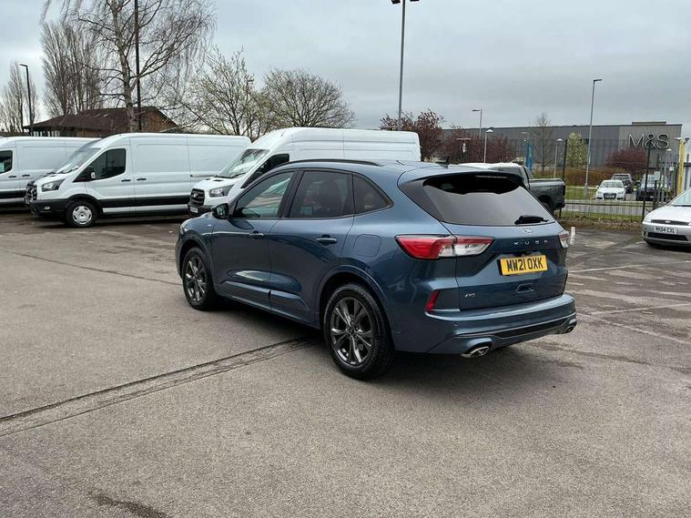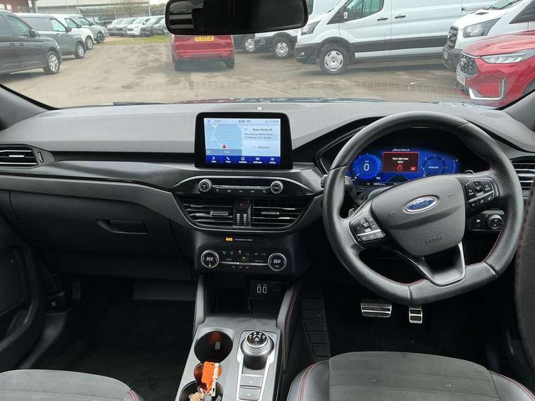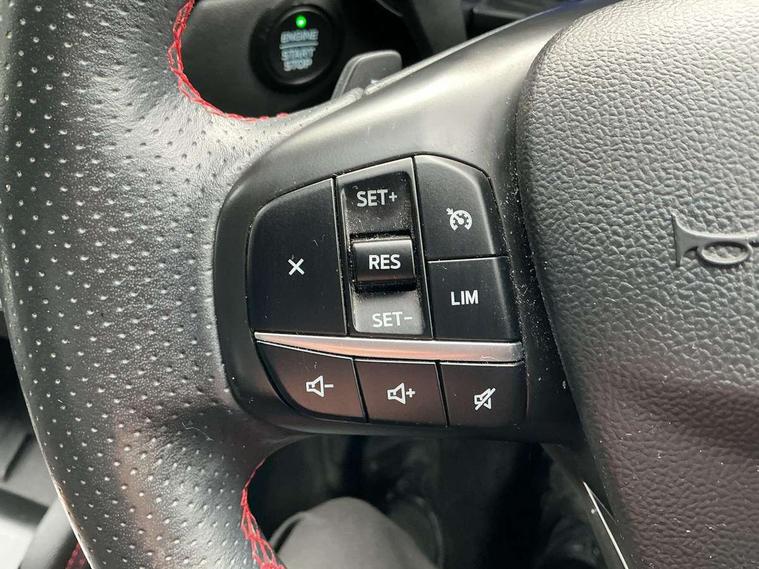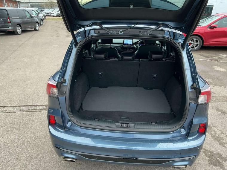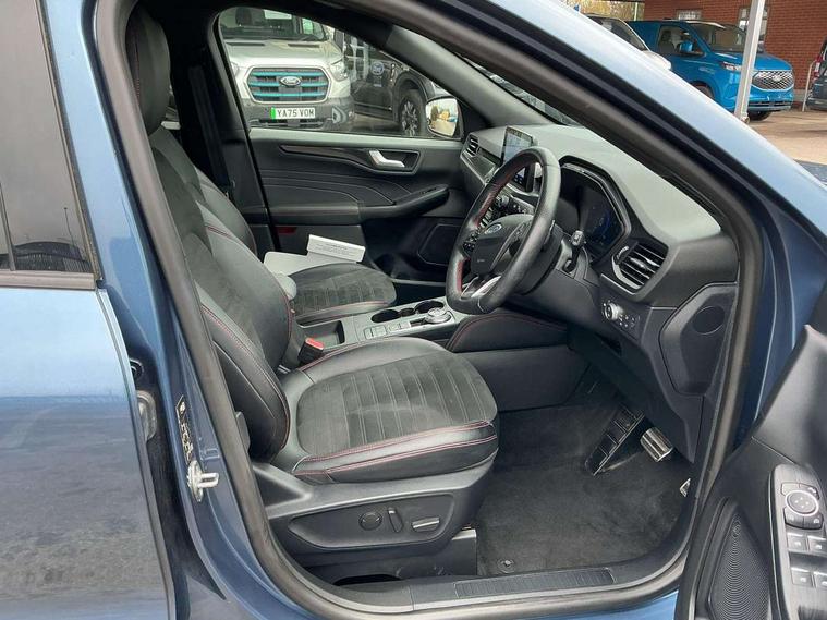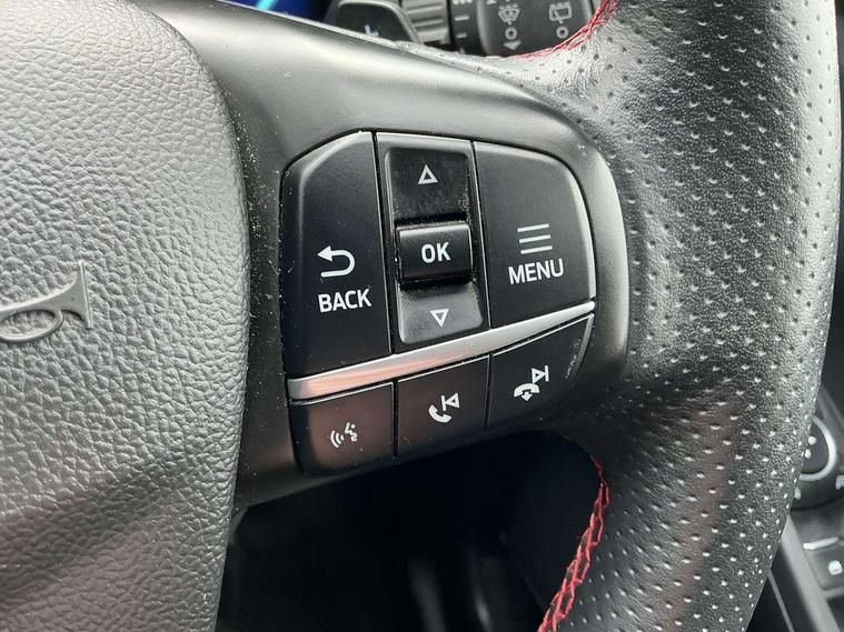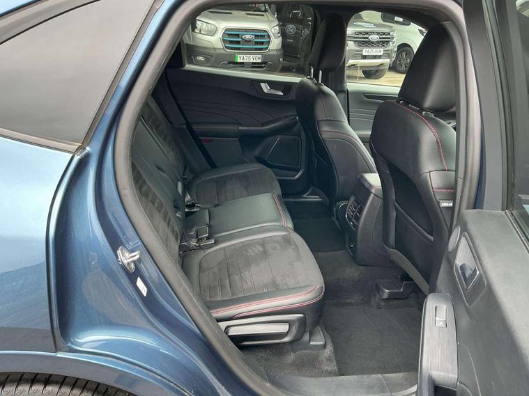 Ford easy fuel, Front and rear parking sensors, Hands free power tailgate, Lane keeping aid with lane departure warning, Mobile phone wireless charging pad, Power assist steering, Selectable drive modes, Auto headlamps with high and low beam, Black roof rails, Front LED fog lamps, Large rear spoiler, LED daytime running lights, LED rear lights, Power front/rear windows with global close, Privacy glass, Quickclear heated windscreen, ST Line body styling kit with unique front and rear fascia and bumper, rear painted diffuser, front painted skid plates, dark mesh upper grille, ST Line front scuff plates, Twin exhausts, 10 way power adjustable drivers seat, 2nd row sliding seats with 60:40 split, Alloy pedals, Centre console with electronic parking brake, Dark headlining and pillars, Dual electronic automatic temperature control, Flat bottomed leather steering wheel in sensico with red stitching, Front and rear head restraints, Rear charging point, Sensico partial premium leather upholstery, Sports seats, ST Line front and rear floor mats, Steering wheel mounted paddle shift, B&O with large instrument cluster pack - Kuga, 3x3 point rear seatbelts, Airbags - front driver/passenger, front and rear curtain, Drivers knee airbag, Electronic stability control (ESC) and ABS, Ford MyKey Gen 2 safety system, Manual child proof rear door locks, Post collision braking, Pre collision assist with autonomous emergency braking, Rear seat Occupancy alert, Red brake calipers, Tyre pressure monitoring system, Engine immobiliser, Keyless start with 'Ford Power' starter button, Locking wheel nuts, Remote powered central double locking doors, Thatcham category 1 alarm,