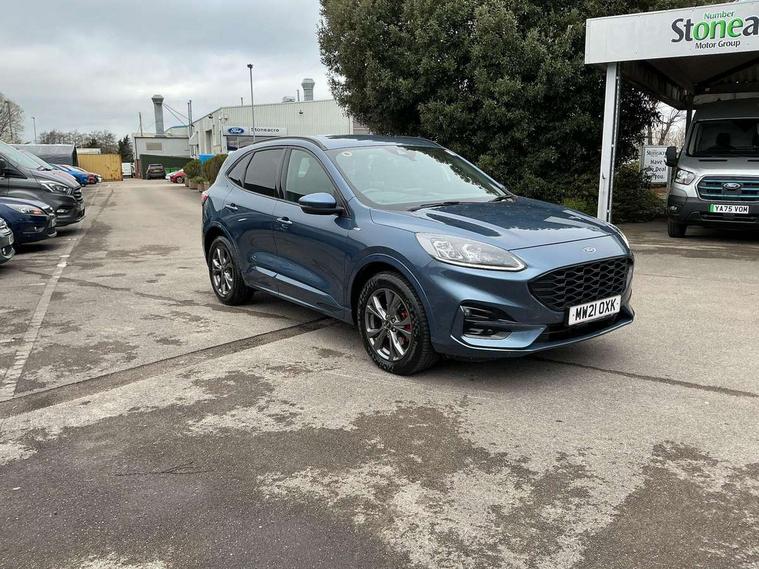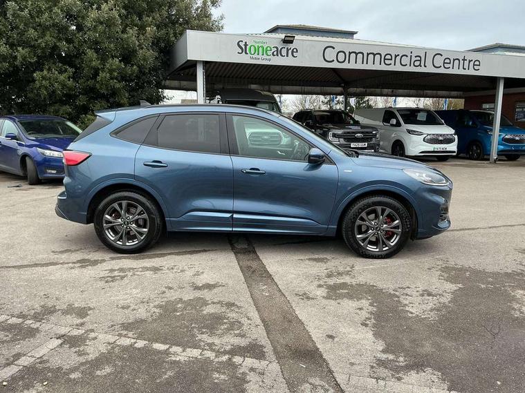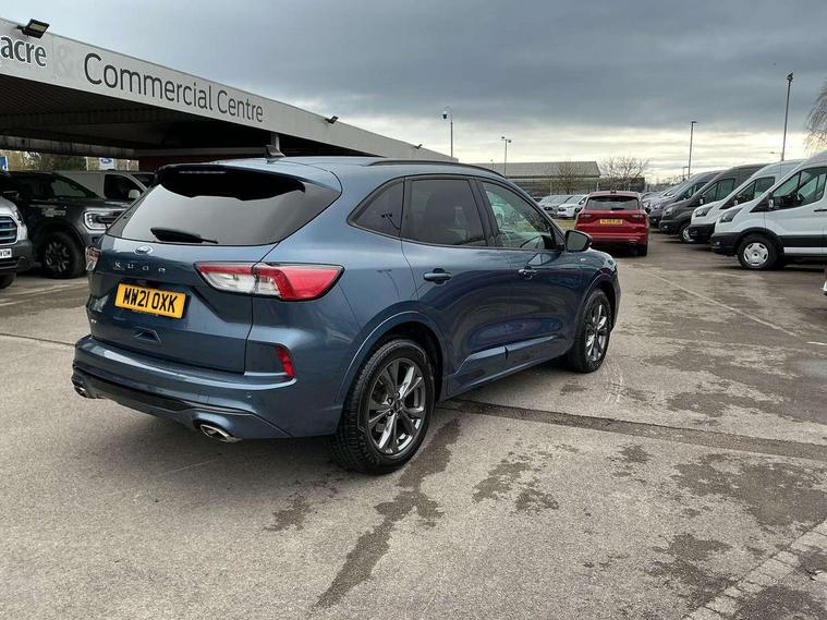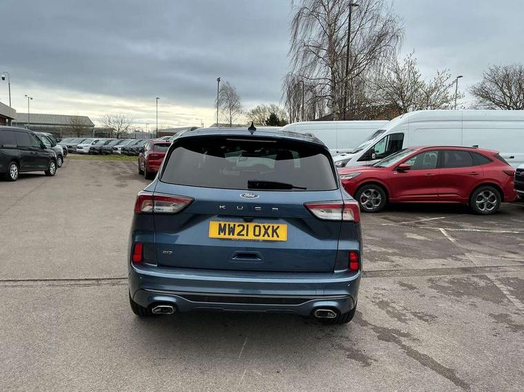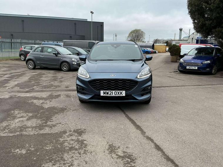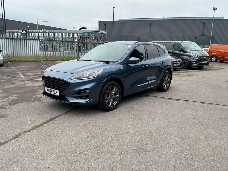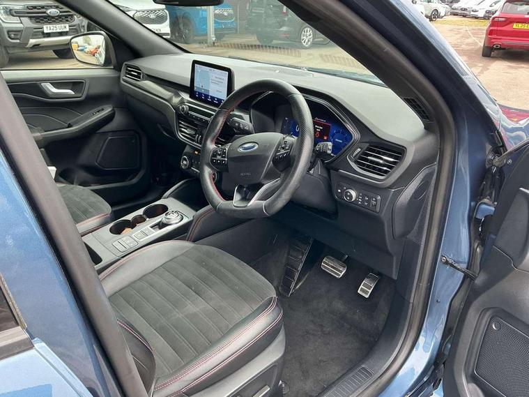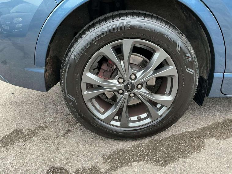 Ford easy fuel, Front and rear parking sensors, Hands free power tailgate, Lane keeping aid with lane departure warning, Mobile phone wireless charging pad, Power assist steering, Selectable drive modes, Auto headlamps with high and low beam, Black roof rails, Front LED fog lamps, Large rear spoiler, LED daytime running lights, LED rear lights, Power front/rear windows with global close, Privacy glass, Quickclear heated windscreen, ST Line body styling kit with unique front and rear fascia and bumper, rear painted diffuser, front painted skid plates, dark mesh upper grille, ST Line front scuff plates, Twin exhausts, 10 way power adjustable drivers seat, 2nd row sliding seats with 60:40 split, Alloy pedals, Centre console with electronic parking brake, Dark headlining and pillars, Dual electronic automatic temperature control, Flat bottomed leather steering wheel in sensico with red stitching, Front and rear head restraints, Rear charging point, Sensico partial premium leather upholstery, Sports seats, ST Line front and rear floor mats, Steering wheel mounted paddle shift, B&O with large instrument cluster pack - Kuga, 3x3 point rear seatbelts, Airbags - front driver/passenger, front and rear curtain, Drivers knee airbag, Electronic stability control (ESC) and ABS, Ford MyKey Gen 2 safety system, Manual child proof rear door locks, Post collision braking, Pre collision assist with autonomous emergency braking, Rear seat Occupancy alert, Red brake calipers, Tyre pressure monitoring system, Engine immobiliser, Keyless start with 'Ford Power' starter button, Locking wheel nuts, Remote powered central double locking doors, Thatcham category 1 alarm,