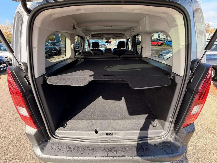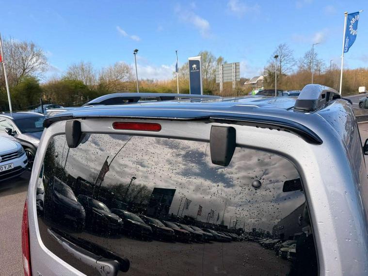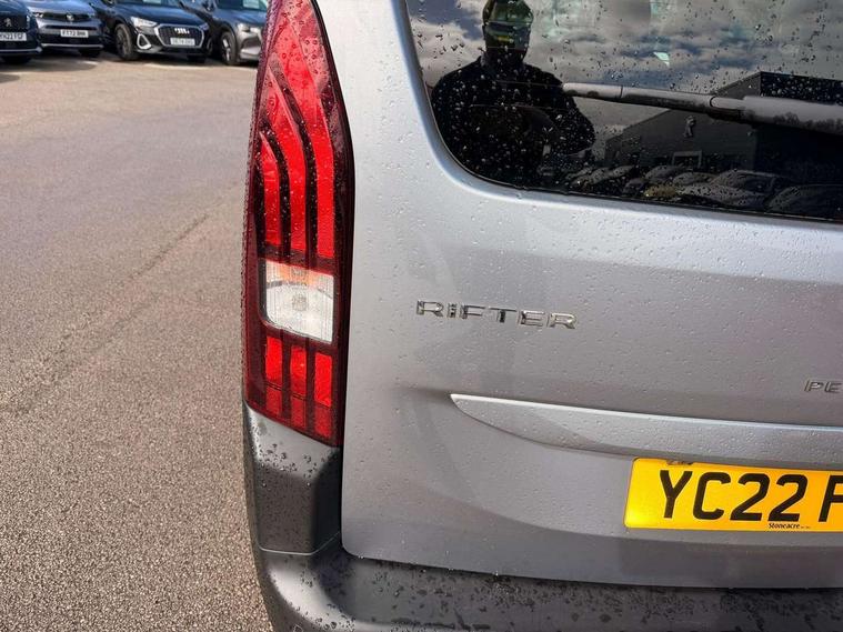 Picasso blue interior ambiance, Visibility pack - Rifter, 16" Taranaki anthra grey alloy wheels, Tyre puncture repair kit, Auto door lock when driving, Automatic hazard light activation upon heavy brake application, Deadlocks, Electronic immobiliser, Remote central locking, 6 speakers, DAB radio with buttons, MP3 connection, Steering wheel mounted controls, USB socket, USB socket at the back, 3 X 2nd row and 2 x 3rd row 3 point seatbelts, ABS (Anti-lock Braking System) with EBD (Electronic Braking Distribution) and EBA (Emergency Braking Assistance), Adaptive driver and front passenger airbags with passenger airbag deactivation function, Child locking functionality on rear doors, Driver/front passenger side airbags, Electronic parking brake, ESP (Electronic Stability Program) + Hill Start Assist, Front and rear curtain airbags, Front and rear disc brakes, Front and rear seats seatbelt unfastened on the move audible and visual alert, Front optimised safety headrests and 3 x rear retractable headrests with height adjustable, Front three point retractable seatbelts with force limiters, Tyre pressure sensor, Aluminium roof bars, Black bumpers, Body colour door handles, Contrasting wheel arch trim, Dark tinted rear side windows + tailgate window, Electric front windows, Electric heated door mirrors, Electric rear windows, Front and rear scuff plates, Front fog lights, Front windscreen wiper with multispeed setting, Gloss black door mirrors, Halogen headlights, Headlights left on audible warning, LED daytime running lights, LED rear signature claw effect lights, Opening rear tailgate window, Power folding door mirrors, Radiator grille in 3D stamped effect and chrome surround, Rear windscreen wiper triggered automatically in reverse gear, Tailgate with heated rear windscreen and wiper blade, Two glazed sliding side doors, 12V socket, 2 independent and removable sliding 3 row seat, Air vents in 2nd row with fan strength command and USB socket, Door sill protectors, Driver and passenger dashboard mounted cup holders, Electric power steering with reach and rake adjustable steering column, Fixing rings x 4 in load area, Foldable passenger seat with under-seat storage and elbow rest, Front interior light with 2 reading spotlights and rear interior light with timer, Full width overhead storage shelf, Gear shift indicator, Height adjustable drivers seat with lumbar support, High console between front seats with storage compartment, Isofix child seat fittings x 3 in the second row, Leather steering wheel with integrated controls, Parcel shelf - retractable, Puma cloth upholstery, Tray tables at the back of the front seats, Under-seat storage and elbow rest for driver seat, Upper glove compartment, 8" capacitive colour touch screen with mirror screen (Apple CarPlay and Android Auto), Analogic cluster, Bluetooth telephone facility, e-Call (emergency call), Multi function trip computer, PEUGEOT i-Cockpit with compact steering wheel, PEUGEOT i-Cockpit with head-up instrument panel, Rotary switch driving selector, Stop/start system, Voice control system, Voice recognition for radio and telephone,