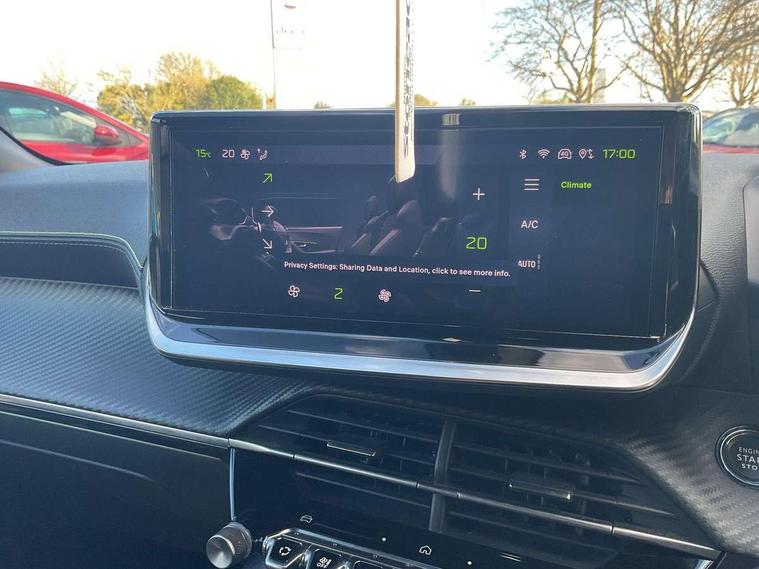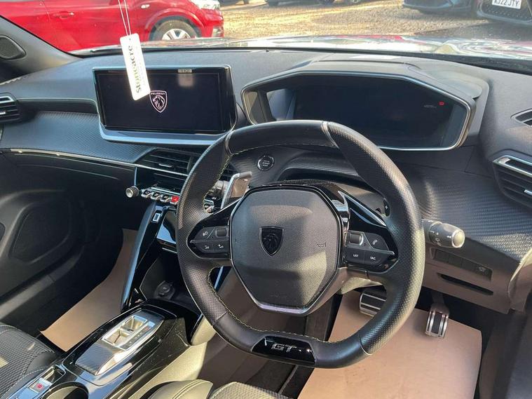 Bluetooth telephone facility, Driver attention warning, E-call, Exterior temperature indicator with ice warning, Multi function trip computer, PEUGEOT i-Cockpit with compact steering wheel, PEUGEOT i-Cockpit with configurable 3D headup instrument panel, PEUGEOT SOS and assistance, Smartphone charging plate, Speed limit recognition and recommendation, Wireless mirror screen with mirror link, apple carplay and android auto, Petrol Particulate Filter, 1x USB-C socket in rear and 1x USB-A socket in rear, 2 USB-C ports in the front, 6 speakers radio with mp3 compatible, DAB Radio (Digital Audio Broadcasting), Voice recognition for radio, navigation and telephony features, 2 X Rear number plate lights, Aluminium door sill scuff plates with peugeot lettering, Automatic hazard light activation upon heavy brake application, Black diamond roof, Black front wing trim with gloss black detail and GT badging, Body coloured exterior door handles, Dark tinted rear side and tailgate windows, Diamond black mirror shells, Diamond black rear roof spoiler, Electric, heated, and power folding door mirrors, Frameless electrochrome interior rear view mirror, Front bumper - Meteor grey lower trim, Full LED headlights with smartbeam assist with auto height adjustment, Gloss black finish on B pillar, Gloss black rear cluster connecting strip, Gloss black roof bars, Gloss black window surround, GT model designation badging on tailgate, Headlights left on audible warning, LED daytime running lights with distinctive 3 claw signature, LED side indicator lights integrated into door mirrors, LED third brake light, Model designation badges front and rear, One touch electric front/rear windows with pinch protection, Radiator grille - body coloured vertical chequered grille, Radiator grille - gloss black top edge trim, Rear full LED 3D peugeot signature claw effect lights with daylight function, Rear reversing lights, Rear side wing doors, Rear windscreen wiper triggered automatically in reverse gear, Tailgate with heated rear windscreen and wiper blade, Twin chromed exhaust pipes, Wheel arch extensions, 1/3 to 2/3 split folding rear seats, 12V socket, 3 seat bench in 2nd row, 8 Colour personalisable ambient lighting, Automatic air conditioning with pollen and active carbon filter, Central front armrest with storage compartment, Driver and front passenger sport seats, Electric power steering with reach and rake adjustable steering column, Front and rear carpet mats in black, Front LED interior light with 2 reading spotlights and rear interior light with timer, Front passenger seat manual adjustment - height, longitudinal and back rest angle, High centre console, ISOFIX child seat mounting points on passenger seat, Mistral full-grain perforated leather steering wheel with Lime Green stitch detail and satin chrome 'GT' emblem, Multifunction steering wheel, Piano keys: Gloss black and chrome toggle switches to access main functions of the vehicle and touchscreen functions, Roof lining - Mistral black, Seatbelt unfastened on the move audible and visual alert for front and rear seats, Single front passenger seat, Two position modular boot floor, Visibility pack - 2008, 2x 2nd row ISOFIX child seat mountings, ABS (Anti-lock Braking System) with EBD (Electronic Brakeforce Distribution) and EBA (Emergency Braking Assistance), Active safety brake with night function/cyclists/pedestrians, Adaptive driver and front passenger airbags with passenger airbag deactivation function, Child locking functionality on rear doors, Driver/front passenger side airbags, Electric parking brake, ESP (Electronic Stability Program) + Hill Start Assist, Front and rear curtain airbags, Front and rear disc brakes, Front and rear three-point retractable seatbelts, with force limiters, Front optimised safety headrests and rear retractable headrests (x3), height adjustable, Tyre pressure sensor, Automatic door locking when moving off, Deadlocks, Electronic code immobiliser, Peugeot Open and Go (keyless entry and push button start), Thatcham category 1 alarm, Carbon effect Dashboard, front and rear door panel finish,