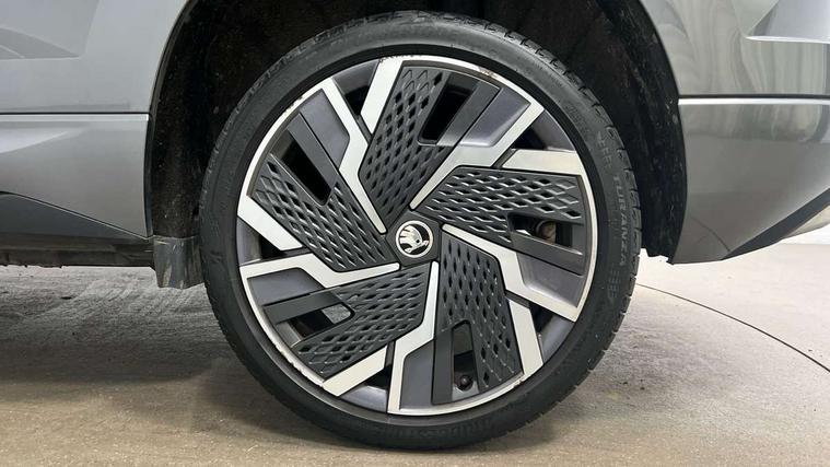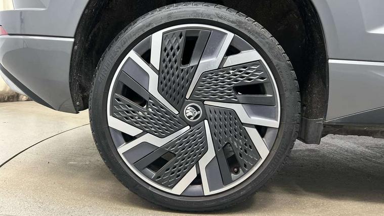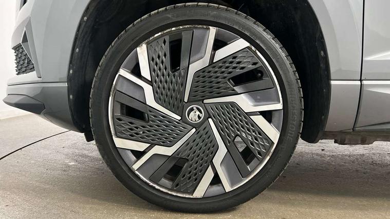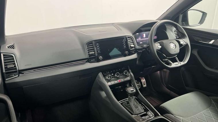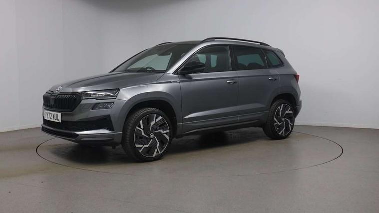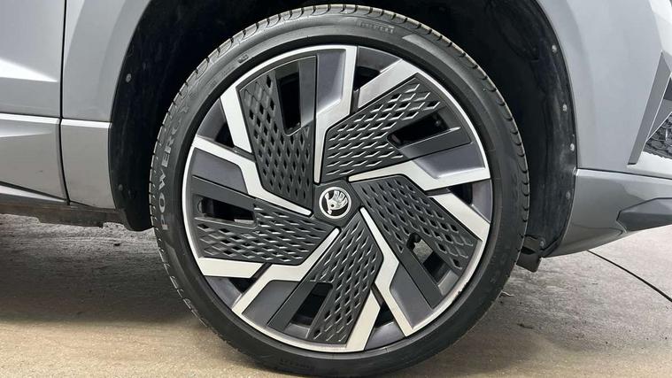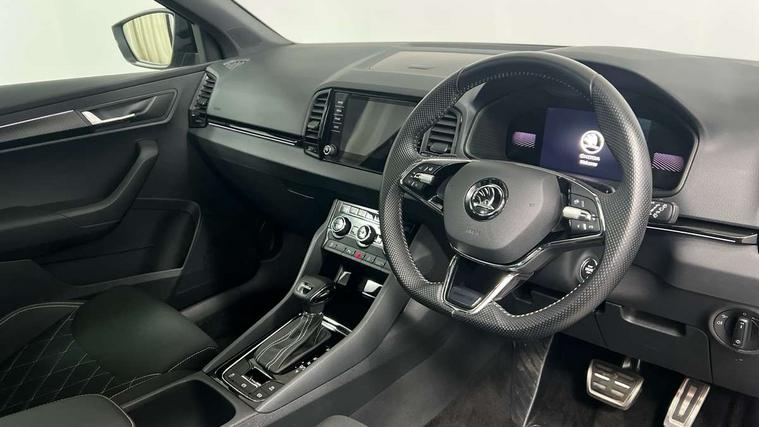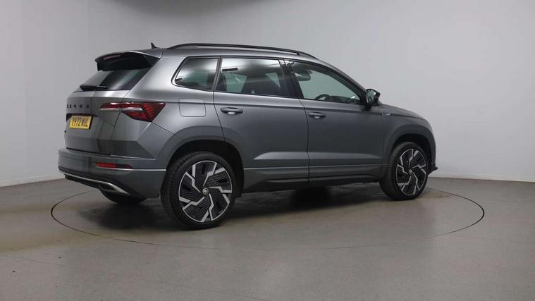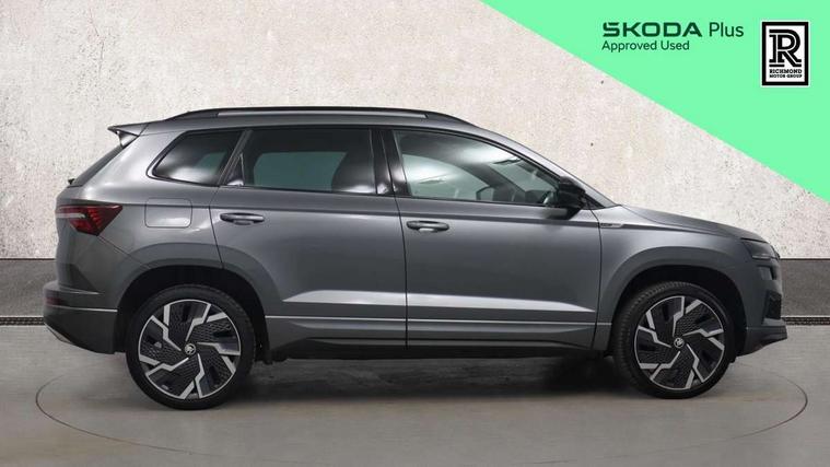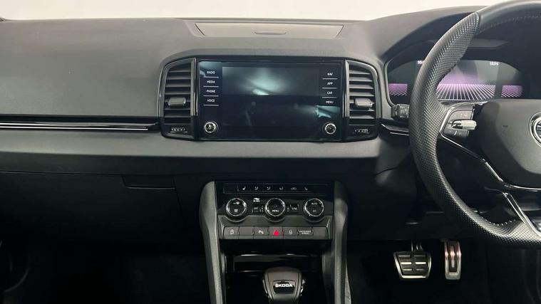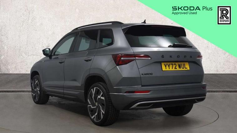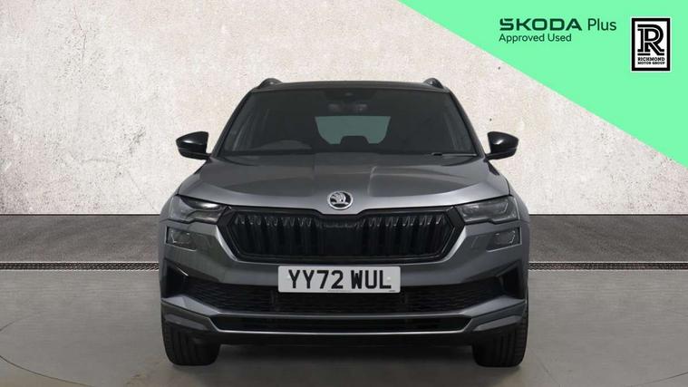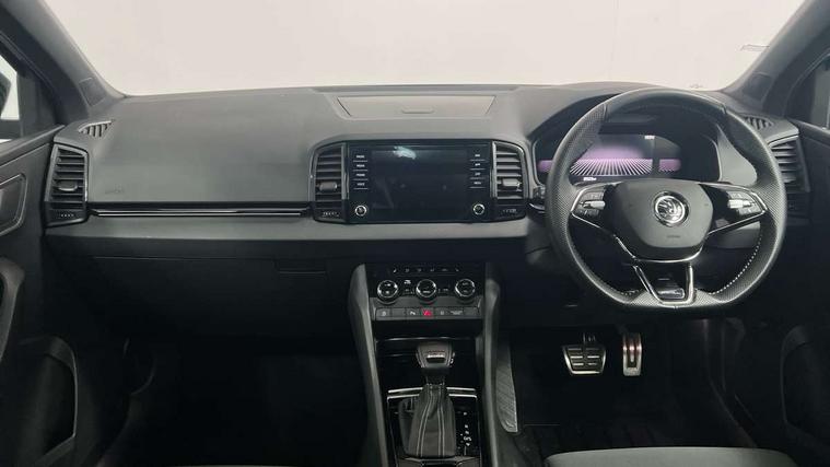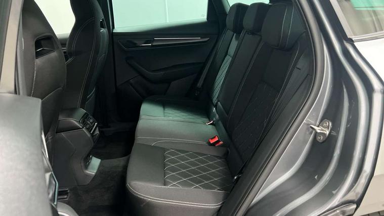 8" Digital display, Care connect, Driver fatigue sensor, Emergency services call system, Outside temperature gauge, Service interval indicator, SmartLink wireless for Apple and wired for Android, Start/stop system with regenerative braking, USB C Port x 2 in front centre console, Virtual pedal with electrically operated boot door, 8 Speakers, DAB radio with Bluetooth, USB connection, Acoustic glass, Aero front windscreen wipers with intermittent function, Auto dimming rear view mirror with light and rain sensors, Black door mirrors, Black electric window control buttons, Black radiator grille, Black roof rails, Body colour door handles, Dynamic headlight range control with cornering light function, Electric front and rear windows with child proof lock, Front door steps with SportLine logo, Heated rear windscreen, LED daytime running lights, LED rear lights with high functionality welcome effect and dynamic indicators, Light assistant (coming/leaving home/tunnel light), Panoramic sliding sunroof, Plastic scuff plates, Privacy glass, Protective door side sills in body colour, Rear diffuser, Rear side wing doors, Rear spoiler, Rear window wiper with washer system and intermittent control, Safety reflectors on front doors, Skoda lettering on tailgate in black, Sportline badge on front fender, Sportline decorative inserts with badging, Sports front and rear bumpers, 1.5 litre bottle holders in driver and front passenger door panels, 12V socket in boot, 12v socket in front centre armrest with storage compartment and rear air vents, 2 Folding hooks and nets in boot, 3 rear height adjustable headrests, 3 seat bench in 2nd row, 3 spoke leather sports multifunction steering wheel and silver stitching with gear shift paddles, 4 foldable roof handles with rear coat hooks, Black floor carpet, Black roof headlining, Chrome inner door handles, Double sided boot floor, Foldable hooks in the boot, Front head restraints, Height adjustable front three point seats belts with tensioners, Height/reach adjust steering wheel, Ice scraper, Illuminated glovebox, Illuminated luggage compartment, Isofix child seat preparation outer rear, Manual lumbar support for front seats, Pen holder, Pollen filter, Rear boot cover, Rear reading lights, Rear seats fixed folding and divided 60:40, Rubbish bin door, Safety vest holder, Single front passenger seat, Storage box in upper central dashboard closed, Sunvisors with illuminated vanity mirrors, Textile floor mats, Ticket holder, Titan black interior ceiling, Welcome animation with sportline logo, Light Pack - Karoq, Parking pack - Karoq, Automatic door unlocking in case of crash, Automatic fuel cut off in case of crash, Child locks on rear doors, Driver airbag, Electronic parking brake with auto hold function, Emergency rear braking signal, ESC including ABS, MSR, ASR, EDS, HBA, DSR, RBS, MKB and traction control, Front side airbags, Hill hold control, Knee airbags, Passenger airbag with switch-off function, Pedestrian monitor, Seatbelt reminder signalisation and pretensioner for all seats, Three point seatbelts rear, Two tone horn, Tyre pressure display, Tyre pressure monitor, Alarm with interior monitoring, back up horn and tilt sensor with safe function, Electronic engine immobiliser, Keyless entry and start/stop, Remote central locking with 2 remote folding keys, Black air vent surround, Black centre console, Satin black dashboard, Satin black door trim, 19" Sagitarius anthracite alloy wheels with matt black aero inserts, Anti-theft wheel bolts protection, Matt black aero hub caps, Storage on wheel cover, Tool kit,