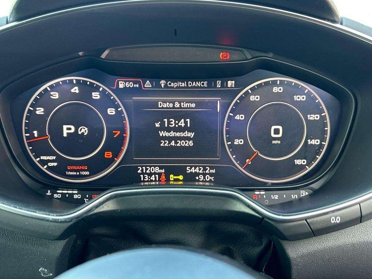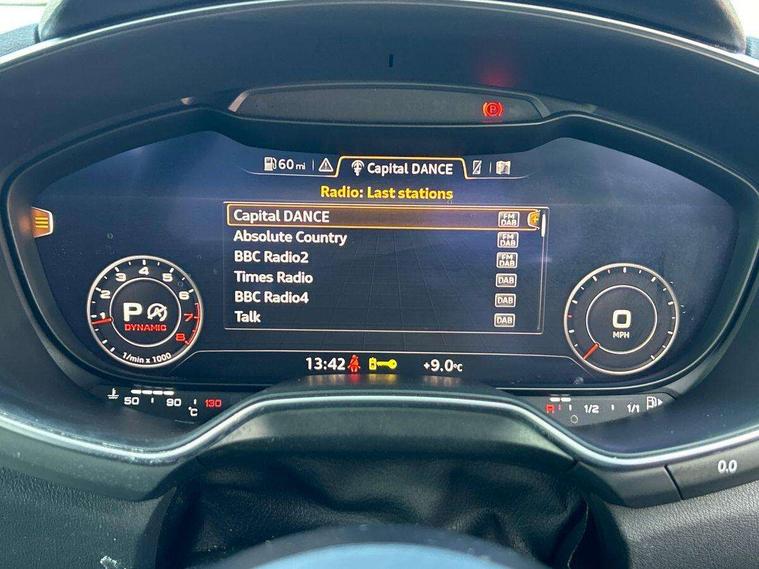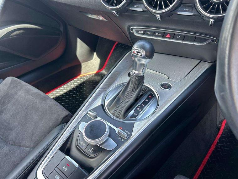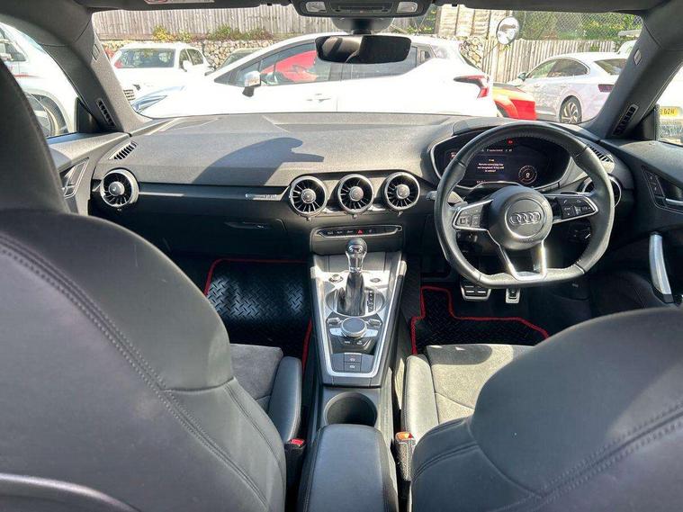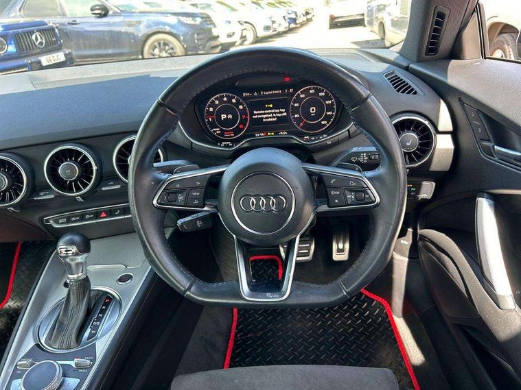 Audi drive select with 4 Pre configured modes, Audi smartphone interface, Audi virtual cockpit - 12.3" high-resolution LCD display with fully customisable instrument cluster, Cruise control + speed limiter, MMI touch panel, Mobile phone preparation with bluetooth interface, Progressive power assisted steering, Service interval indicator, Start/Stop system with energy recuperation, TP memo, Sports suspension, AM/FM radio, Bluetooth audio streaming, DAB Digital radio, MMI Radio with CD player and SD/XC card slot, Auto dimming rear view mirror, Body colour bumpers, Body colour electrically adjustable and heated door mirrors with built in LED side indicators, Electric folding door mirrors, Electric front windows, Front fog lights, Green tinted heat insulating glass, Light and rain sensors, Retractable rear spoiler, Sunband for windscreen, Xenon headlights with LED daytime running lights with automatic headline range control + LED rear lights, brake lights and rear indicators, 12V socket, 3 spoke flat bottomed high multi-function leather sport steering wheel with gearshift paddles, Alcantara/Leather upholstery includes seat centre panels, door trim inserts in black Alcantara with side bolsters, head restraints in black leather, Aluminium door sill trims, Front centre armrest, Front sports seats, Heated front seats, Height adjustable driver's seat, Height adjustable front head restraints, Height/reach adjust steering wheel, ISOFIX child seat mounting for front passenger seat with airbag deactivation, Rear head restraints, Rear top tether child seat ISOFIX attachment, Split folding rear seat, Tool kit, Non smoking pack - TT/TT RS, 3 point front seat belts, ABS, ASR traction control, Curtain airbags, Driver and front passenger airbag with front passenger airbag deactivation, EDL traction control, Electromechanical parking brake, ESP, First aid kit, Front side airbags, Head airbags, Hill hold assist, Seatbelt warning, Tyre pressure loss indicator, Warning triangle, Anti theft alarm, Anti theft wheel bolts, Immobiliser, Keyless Go, Remote central locking, Aluminium design inlays, Tyre repair kit,