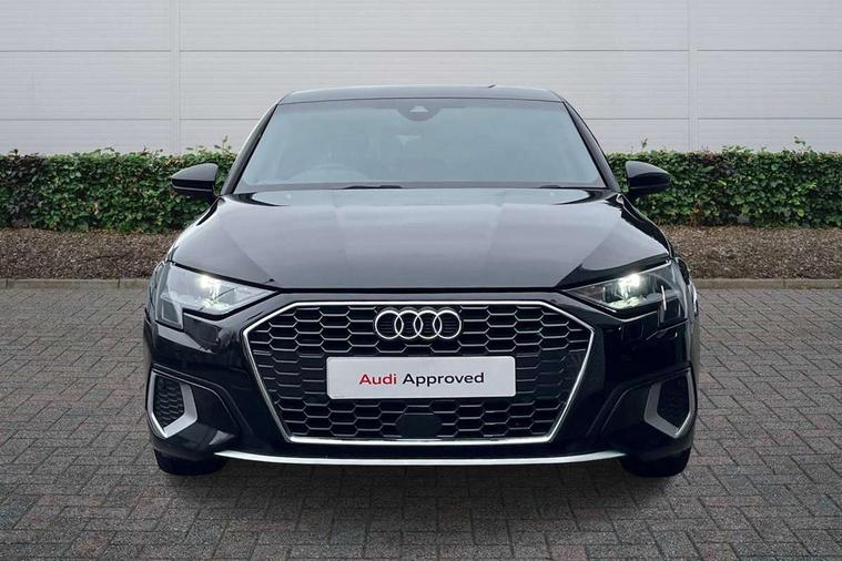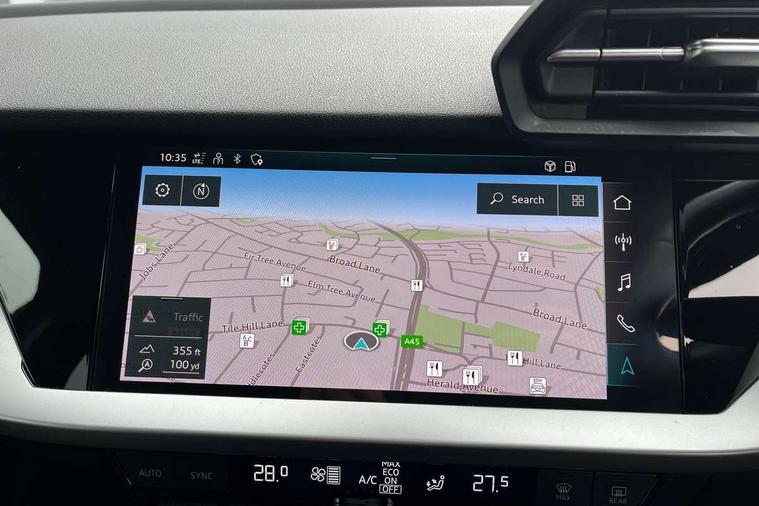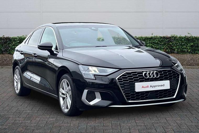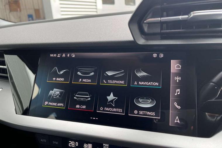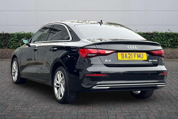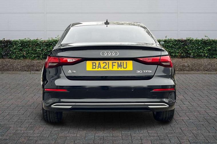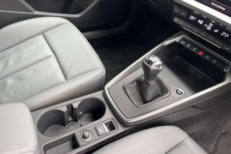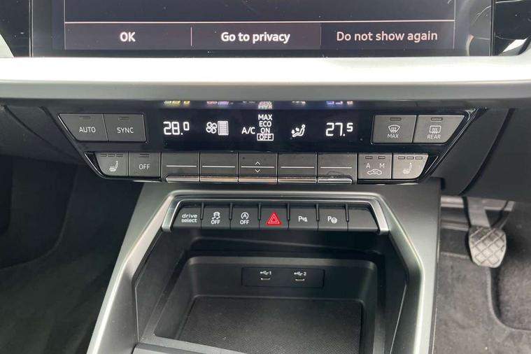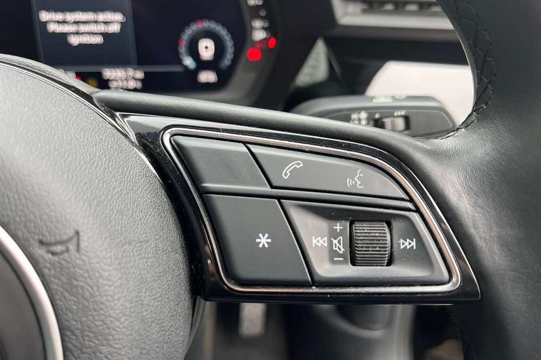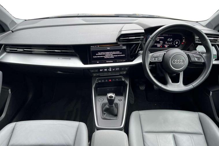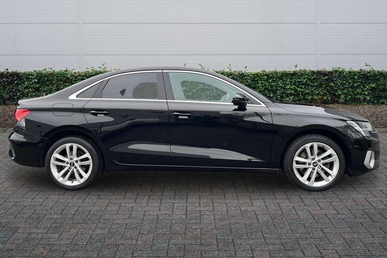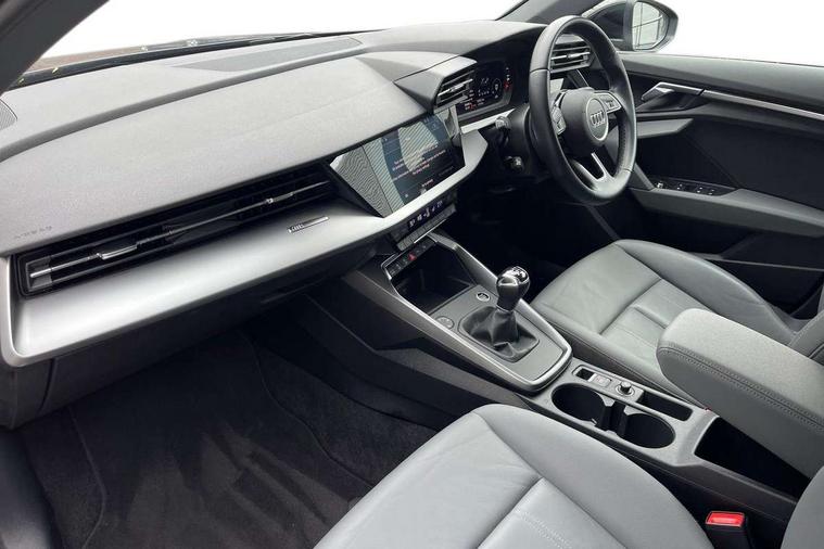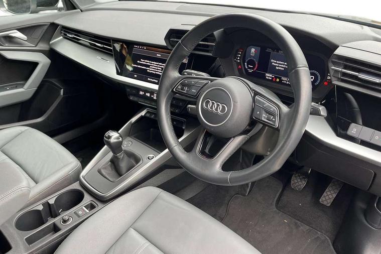 Audi connect emergency call and service, Audi drive select (Auto, Comfort, Dynamic and Individual), Audi smartphone interface, Audi Virtual Cockpit - 10.25" digital and colour instrument cluster, Automatic start/stop system with recuperation, Bluetooth interface, Collision avoidance assistant, Cruise control + speed limiter, Electromechanical power speed sensitive steering, Lane departure warning system, MMI Navigation Plus with high resolution 10.1" colour touch screen display, Rear parking sensors, Service indicator, Voice control system with natural language interaction, Standard suspension, 2x USB Type C ports (for charging and data transfer), 6 passive loudspeakers, CD player, DAB Digital radio, 3rd brake light, Acoustic glass windscreen, Aluminium window trim, Auto dimming frameless rear view mirror, Body colour exterior mirrors, Body colour roof spoiler, Electrically adjustable/heated/folding/dimming door mirrors with kerb view includes integrated LED indications + kerb view function for passenger side, Front electric windows, LED daytime running lights, LED headlights and halogen rear lights, Light and rain sensors, Model and engine designation badges at rear, Rear electric windows, Rear window, rear door windows and rear side windows in clear glass, 12V socket and storage compartment in front centre console, 40/20/40 split folding rear seat bench with cupholder, Dual zone electronic climate control, Front and rear headrests, Front centre armrest, Front door sill trims with aluminium inlay, Front/rear floor mats, Height and reach adjustable steering wheel, Interior lighting - Front and rear roof module including reading lights, glove compartment light and right hand side, Luggage compartment floor covering, Manual boot compartment lid, Manually adjustable front seats, Seat side bolsters, Steel grey cloth headlining, Twin leather upholstery, Aluminium interior elements pack - A3 Saloon, Sport styling pack - A3 Saloon, 3x3 point rear seat belts, Driver and front passenger airbag with passenger airbag deactivation, Electronic Stabilisation Control (ESC) including ABS, ASR and EDL, First aid kit with warning triangle and 2 safety vests, Front side airbags with head airbags and interaction airbag, Hill hold assist, Pre-sense front with pedestrian and cyclist detection, Seatbelt monitoring, Tyre pressure loss indicator, Anti theft alarm, Anti-theft wheel bolts, Electronically operated child lock, Immobiliser, Remote control central locking, Aluminium air vent surrounds, Aluminium trim elements, Inlays with silk effect paint in platinum grey,