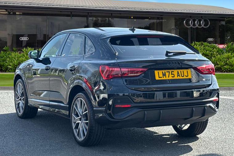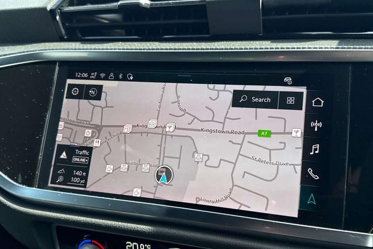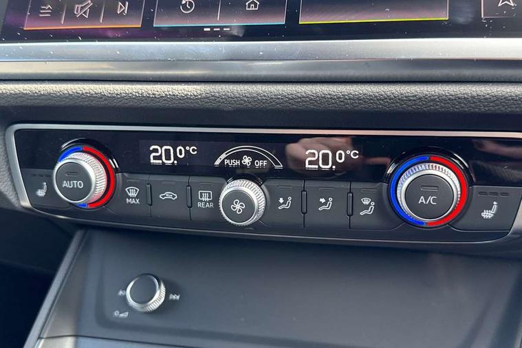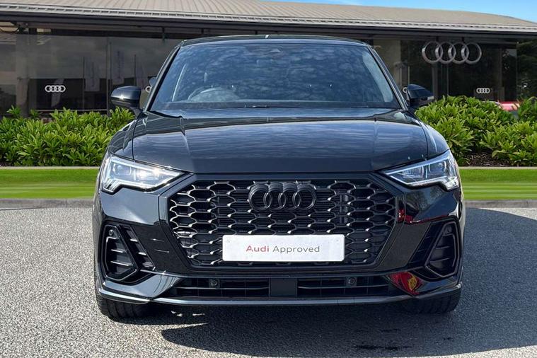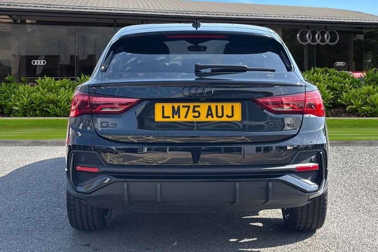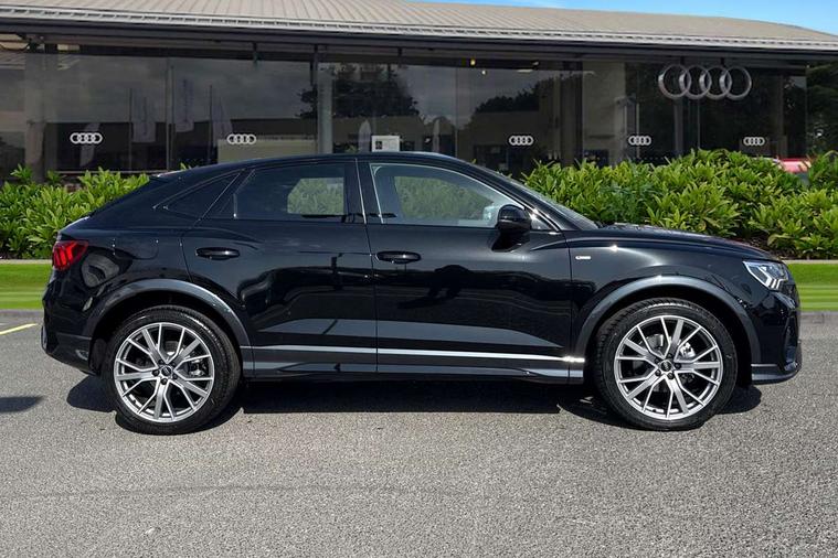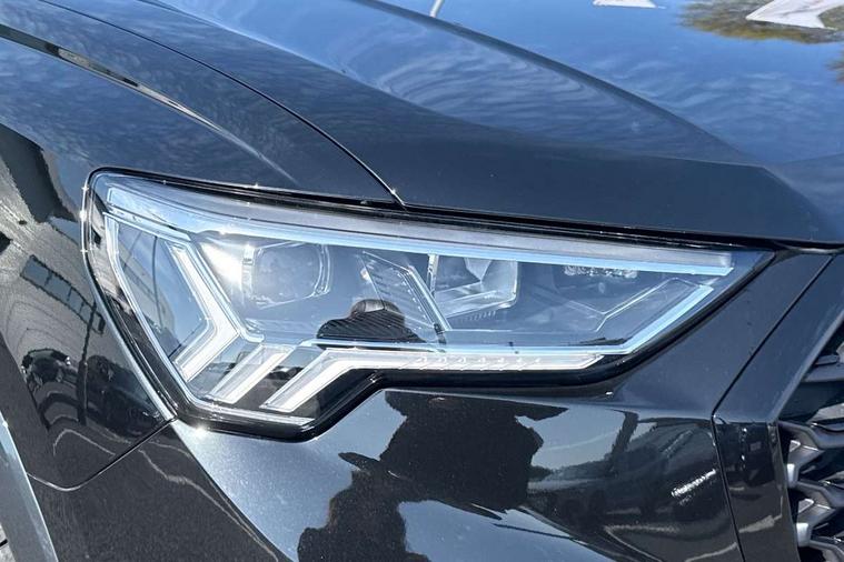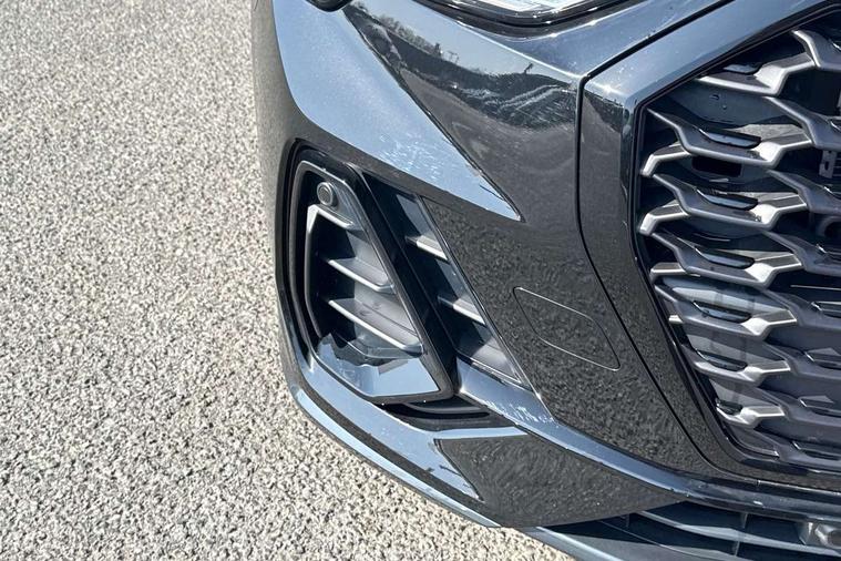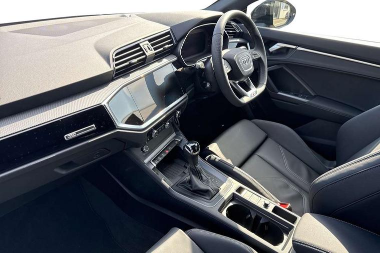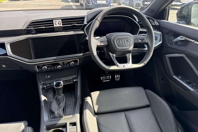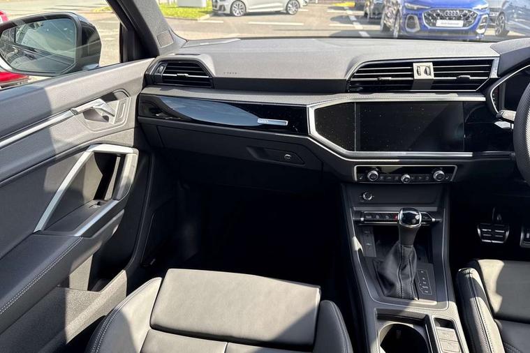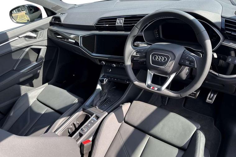 Audi connect safety and service, Audi drive select, Audi lane departure warning, Audi Virtual Cockpit - 10.25" display, Bluetooth interface, Camera based traffic sign recognition, Distraction and Fatigue warning, Legal emergency call, MMI Navigation Plus with high resolution 10.1 inch touchscreen colour display, Power operated tailgate, Progressive steering, Service interval indicator, Smartphone interface includes wireless Apple carplay/Android Auto, Start stop system with recuperation, Voice control system with natural language interaction, Sports suspension, 2 USB-C ports with charge and data functions, 6 passive loudspeakers, DAB digital radio module, Acoustic windscreen, Audi Beam uses LEDs to project the Audi logo onto the ground as you exit your Q3, Auto dimming door mirrors, Auto dimming frameless rear view mirror, Electrically folding, adjustable and heated door mirrors with integrated LED side indicators and kerb view function for passenger side, Front and rear electric windows, Front fog lights, Front underbody protection in manhattan grey paint finish, High gloss black finish B and C pillars, Honeycomb design radiator grille in matt anthracite black, LED Dynamic rear indicators, LED headlights with LED daytime running lights, LED rear lights, LED third brake light, Privacy glass dark tinted rear and rear-side windows (from B-pillar backwards), Rain and light sensors, Rear diffuser grille in grained matt black, Rear diffuser strip in matt anthracite black, Rear side wing doors, Rear underbody protection in matt black, Rear wiper, S line front and rear bumpers and side skirts in contrasting Manhattan grey paint finish, Variable front intermittent wipers, 12V socket in rear centre console, 3 seat bench in 2nd row, 40:20:40 folding with manual adjustment for 60:40 forwards/backwards position and backrest angle, Adjustable rear seat bench/backrest with centre armrest and cupholder, Black carpet mats, Black cloth headlining, Dual zone electronic climate control, Electric lumbar support, Front and rear black floor mats with contrast stitching in rock grey, Front and rear headrests, Front centre armrest, Height and reach adjustable steering wheel, Illuminated door sill trims with S logo, ISOFIX child seat mounting for front passenger with airbag deactivation and outer rear seat including top tether attachment point for outer rear seats, Luggage compartment sill protection in stainless steel, Manual front seats with height adjustment, Perforated leather gearknob, Single front passenger seat, Stainless steel pedals, Twin leather upholstery with front sport seats + S embossing, Black styling pack - Q3, Non smoking pack - Q3, 3x3 point rear seatbelts, 6 airbags - Driver, front passenger, curtain and side windows, Audi pre-sense front with pedestrain and cyclist recognition, Electrically operated child locks on rear doors, Electromechanical parking brake, Electronic stabilisation control including ABS, ASR and EDL, Front seatbelt reminder, Hill descent control, Hill hold assist, Pre sense basic, Seatbelt monitoring, Tyre pressure warning, Warning triangle and first aid kit, Anti theft wheel bolts, Immobiliser, Remote central locking, Thatcham approved category 1 anti theft alarm, Aluminium look interior elements, Detail dashboard around MMI touch colour display in glass look, black with surround in aluminium look, Leatherette door armrest, Piano black inlay,