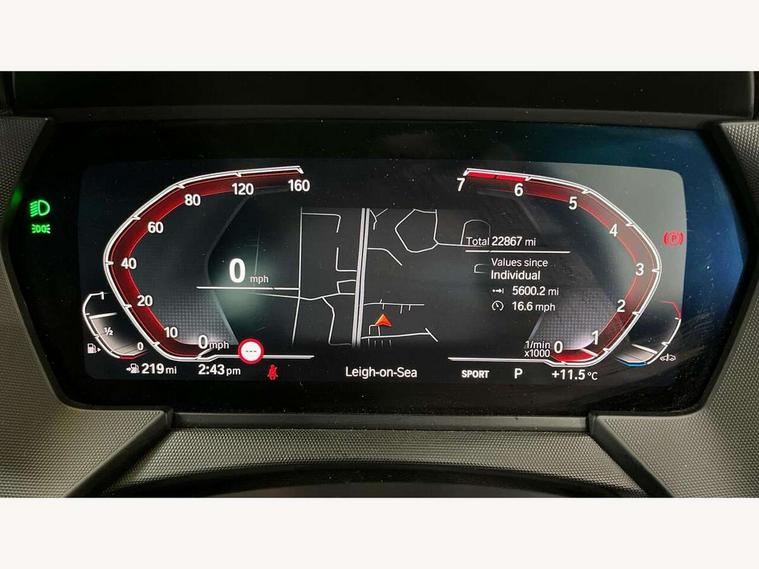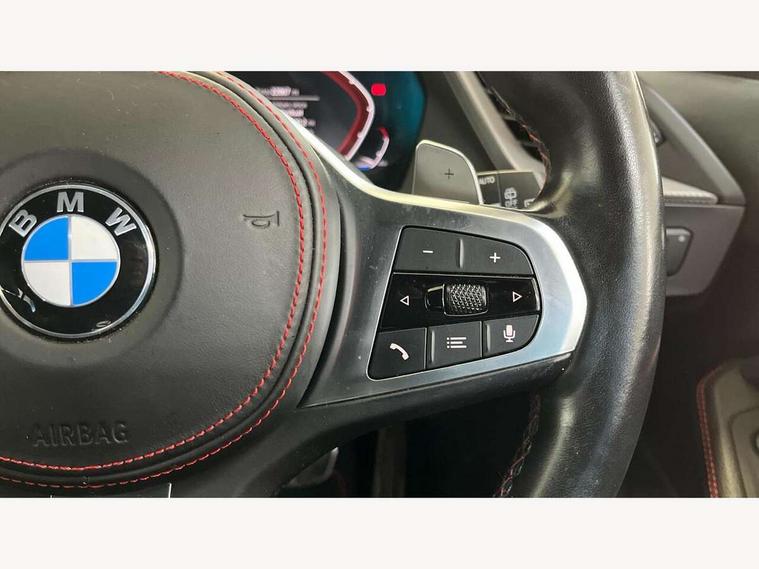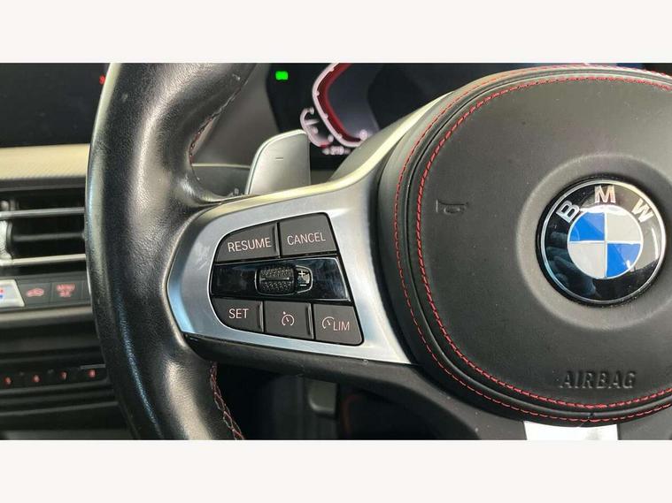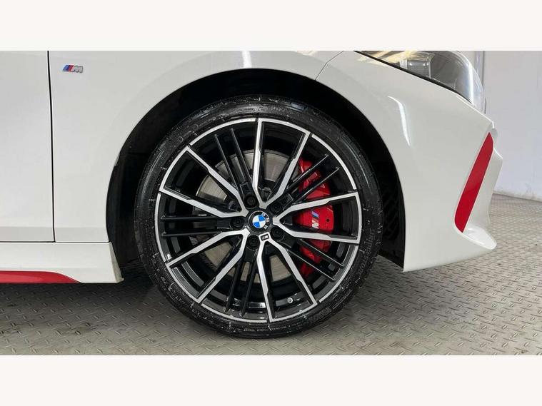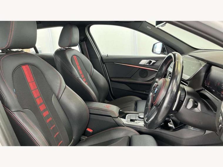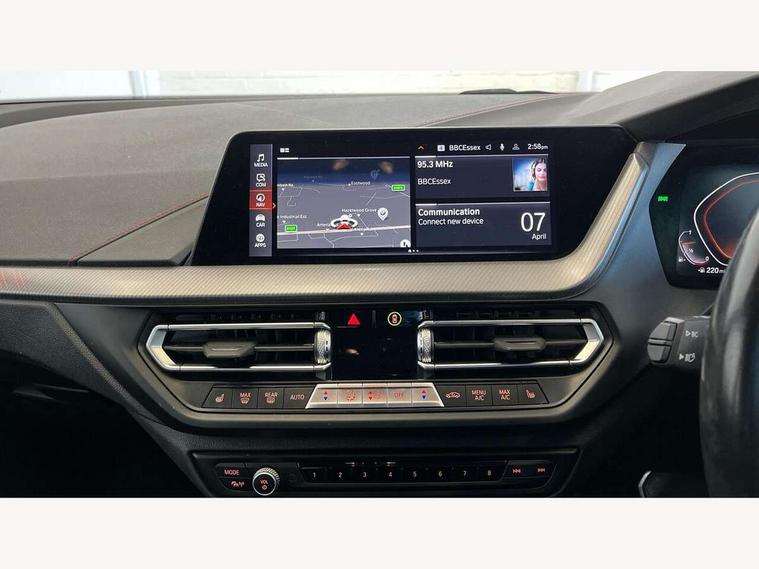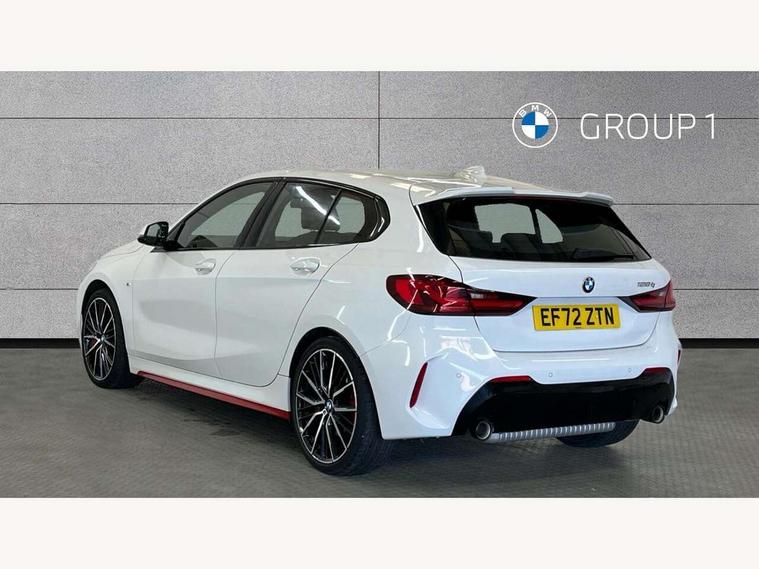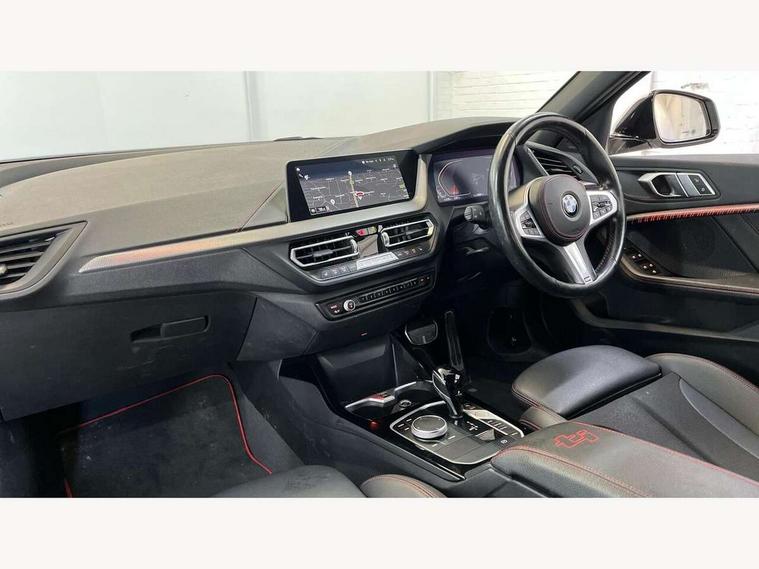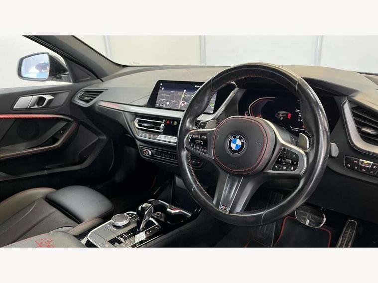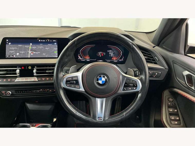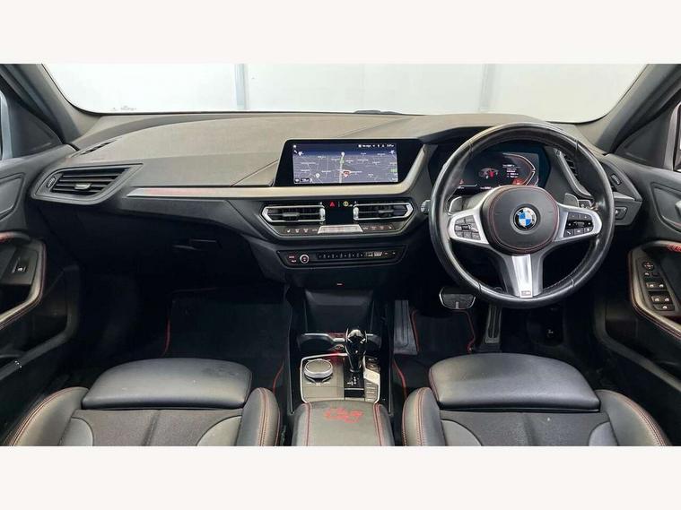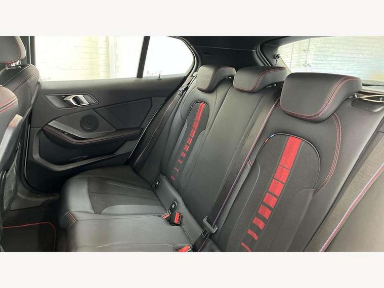 Active guard plus, Attentiveness assist, BMW ConnectedDrive online services, BMW Teleservices, Check Control warning system for monitoring of lights and door/luggage compartment open warning, Cruise control with brake assist, Eco pro mode, Electric power steering with Servotronic steering optimised at all speed ranges, Front axle single joint with specific axle kinematics to minimise drive influences on steering + provide increased rigidity agile driving behaviour, Integrated owners handbook, Lane departure warning system, Oil sensor for level and grade, On board computer, Optimum shift indicator, Personal Profile, Pull away assistant, Rigidly mounted rear subframe - Multi link construction with separate spring / damper configuration and excellent driving characteristics, Speed limit Info including no-overtaking indicator, Speed limiter, Aluminium lightweight construction, Anti roll bar front and rear, Balancer shaft, Double VANOS twin scroll turbocharging system, Drive Performance Control, Eight speed sport automatic transmission with gearshift paddle switches, Electronic differential lock, High precision injection, Larger fuel tank capacity (50 litres), M sport suspension with M128i xDrive specific settings, Petrol Particulate Filter, Twin tube gas filled shock absorbers with degressive characteristic curve, VALVETRONIC engine management, DAB Digital radio, Auto dimming rear view mirror, Automatic headlight beam throw control, Automatic windscreen wipers and automatic headlight, Black chrome tailpipe finishers, BMW individual high gloss shadow line with extended content, Body colour door handles, Body colour mirror caps, Body colour roof trims, Chrome 'M' logo side designation, Chrome kidney grille frame with Satin Aluminium struts, Direction indicator side lights in exterior mirrors, Fading support, Folding side mirrors with auto dimming/folding wing mirrors with auto dimming, Follow me home headlights, Front and rear bumper system with replaceable deformation elements, Front and rear electric windows with open and close fingertip control, anti trap facility and comfort closing, Front door sill finishers in black plastic with M designation in metallic look, Green tinted heat protection glazing, Heated, electrically adjustable exterior mirror aspheric on driver side, convex on passenger side, High gloss shadowline window frame, Recess cover mirror frames and B/C pillar embelisher trim, High level third brake light, Integrated front windscreen with washer jets, Kidney frame and struts in high gloss black extended, LED daytime running lights, LED eyebrow turn indicators, LED front fog lights, LED Headlights, Lightweight engineering, Matt black air guide grilles, Matt black wheel arch trim, Model designation on electric bootlid, Nearside reverse light in rear light cluster, Preparation for high beam assistant, Rear fog lights, Rear side wing doors, Rear window wiper, Shark fin antenna, Trailer stabilisation logic, Visible VIN plate, Welcome lighting, 12V power socket in front centre console with blanking plug, 3 rear seat head restraints, 3 seat bench in 2nd row, Anthracite headlining, Black boot net with lashing eyes, Cargo function on 2nd seat row, Centre armrest in black/red highlight including embroidered 'ti' designation in red, Child seat ISOFIX attachment for two outer rear seats and front passenger seat with anchorage points, Conditioned based service, Driver and front passenger seat heating, Floor mats with red binding, Folding rear clothes hook, Four grab handles integrated in roof lining, Front and rear door pockets with bottle holders, Front and rear side armrest integrated into door trim, Front armrest, Front sports seats, Glove compartment, Height adjustable front head restraints, Instrument panel top section , door armrests and door panels in black/red highlight, Luggage compartment for bag hooks on left and right, foldable luggage compartment liner and four lashing eyelets, Manual adjust steering wheel, Multi-function controls for steering wheel, Single front passenger seat, Storage compartment in centre console, Sun visors with vanity mirrors and insert tab, Three spoke M sport design multi function leather steering wheel in unique red stitching, Two front centre console cupholders, Two zone automatic air conditioning, Additional interior lighting pack - 1 Series, BMW live cockpit professional pack- 1 Series, Connected pack professional - 1 Series, Interior lights pack - 1 Series, M Sport exterior styling aerodynamics pack - 1 Series, 2 tone horn, 3 point seatbelts on all seats, front pyrotechnic belt tensioners, stopper and belt force limiters, rear coded belt buckles, Airbags - Front driver/passenger, front and rear curtain head protection, front side, manual deactivation of front passenger airbag, Anti lock braking system (ABS) with brake assist, BMW emergency call, Brake drying, Braking readiness, Child proof locking system in rear door, City braking function, Comfort modes, Cornering brake control, Crash sensor activating central locking release, hazard warning lights, fuel cut off, interior lighting + activation of safety battery terminal clamp, Driver and front passenger seat belt security check, Dynamic stability control + (DSC+), Dynamic Traction Control - DTC, Electrically operated hand brake including automatic hold function, Front and rear disc brakes, M Sport brakes with red calipers, M Sport seatbelts, Seatbelt warning, Side impact protection, Tyre pressure monitoring system, Warning triangle and first aid kit, Central locking switch for all doors, fuel filler cap and luggage compartment, Deadlocking function system to all doors, Drive away locking system on all doors and luggage compartment with de-activated in iDrive settings, Locking wheel bolts, Remote control with integrated key with High-gloss Black inlay and M designation and 1 button for open/ close lock, window, open luggage compartment, Start/stop button illuminated in centre console with keyless e