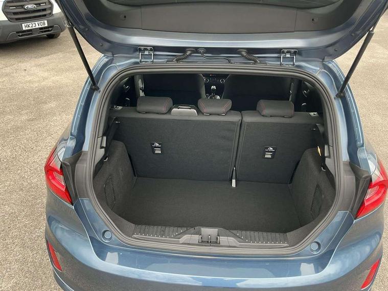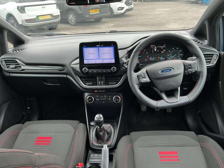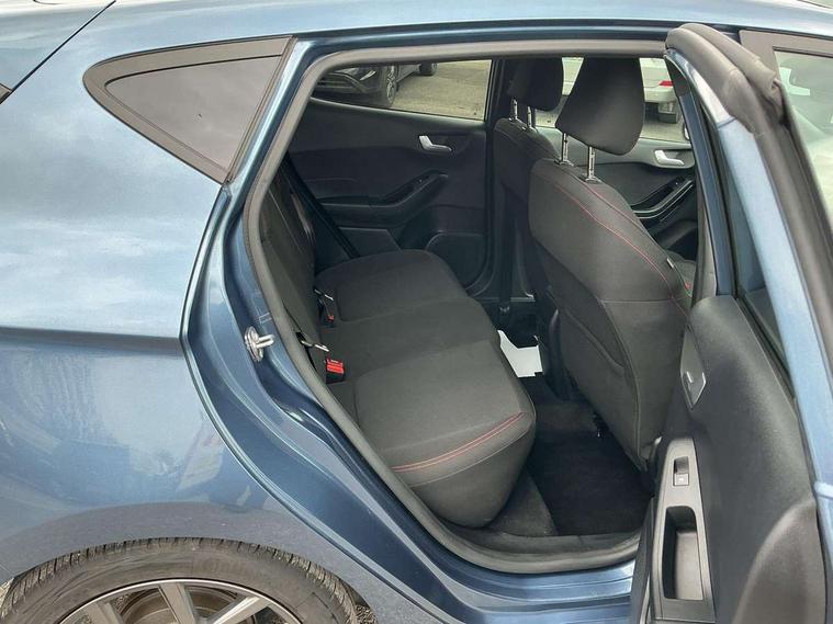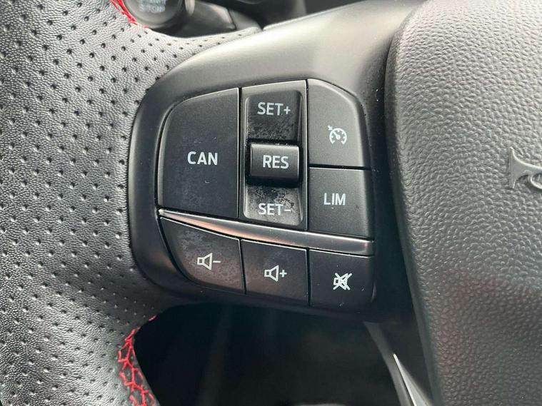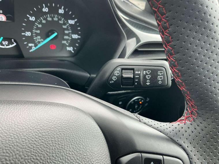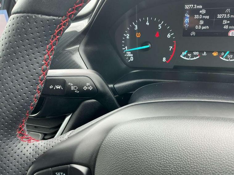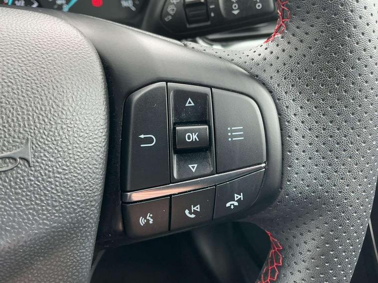 4.2" Colour TFT Ice blue illumination analogue cluster, Driver alert system, Electric power steering, Ford easy fuel, Lane keep assist, Lane keeping aid, Rear parking distance sensors, Selectable drive modes (Normal, Sport, Track), Trip computer, Sports suspension, 3rd brake light, Auto high beam, Automatic headlights, Body colour bumpers, Body colour large rear spoiler, Body coloured electrically operated with side indicators, Electric front windows/one touch facility, Electric rear windows, Quickclear heated windscreen, Rain sensing wipers and auto dimming rear view mirror, Rear privacy glass, Rear side wing doors, Rear wiper, Unique ST-Line grille, full bodystyling kit and large body coloured rear spoiler, 3 rear headrests, 3 seat bench in 2nd row, Adjustable head restraints, Black headlining, Centre console with opening armrest, 2x cupholders, 12v and USB, Cloth upholstery with red stitching, Leather gear knob, Manual 2 way passenger seat adjust, Manual 4-way driver seat adjust, Manual air conditioning, Premium floor mats, Sensico wrapped steering wheel, Single front passenger seat, 3 point seatbelts on all rear seats, Electronic stability control with hill start assist, Front and rear seat belt warning, Manual child lock in rear doors, Tyre pressure monitoring system, Keyless start with 'Ford Power' starter button, MyKey system, Remote central locking, Thatcham alarm with power door dead locks, 17" 5x2 spoke alloy wheels with rock metallic finish,