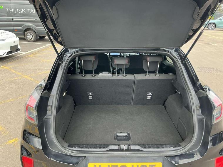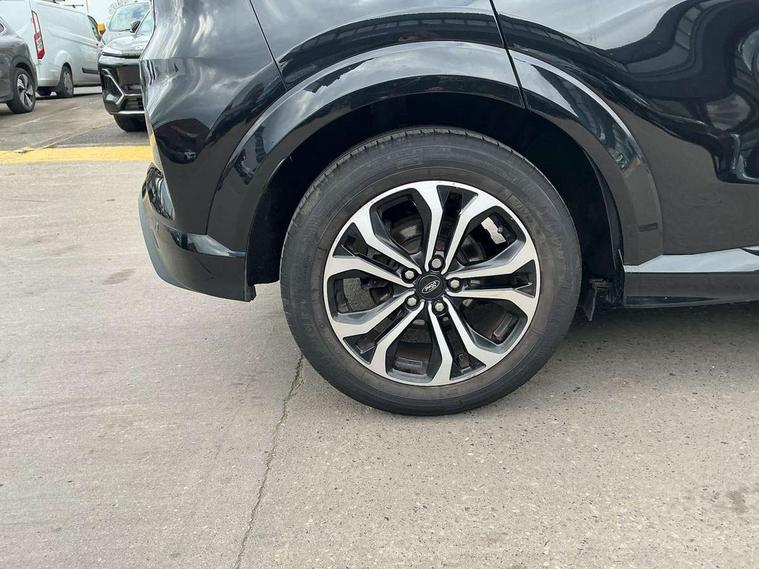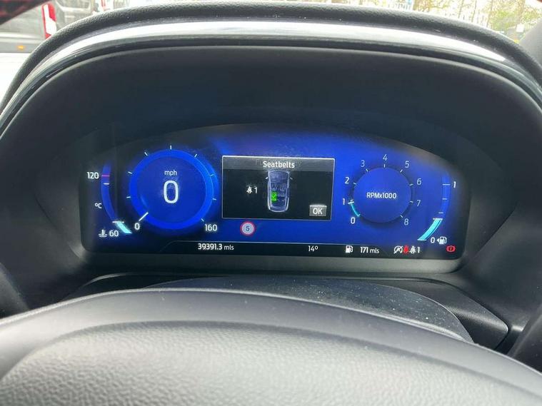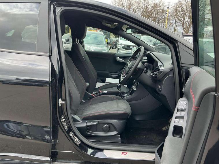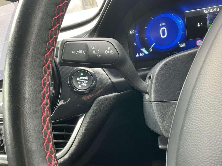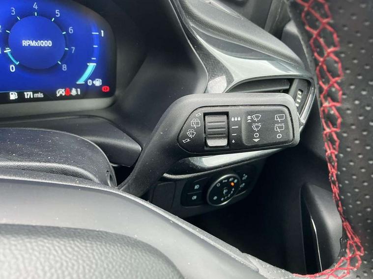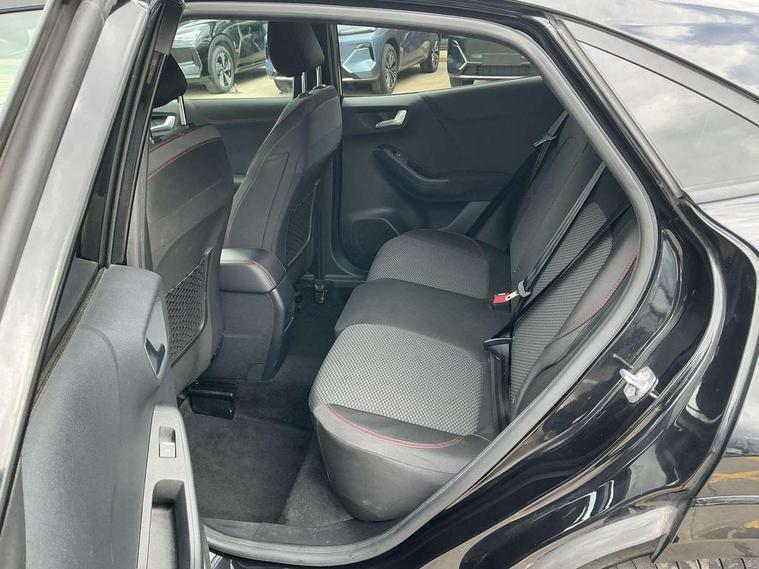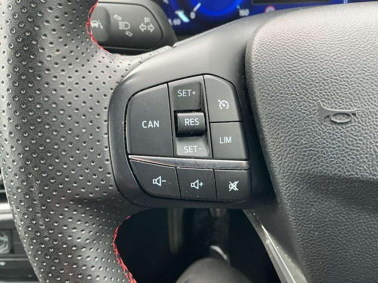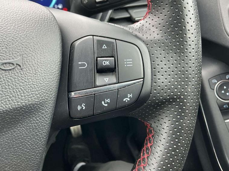 Ford easy fuel, Full digital 12.3" instrument cluster, Lane keeping aid with lane departure warning, Power assist steering, Rear parking sensor, Selectable drive modes(Normal, Eco, Sport, Slippery and Trail), Wireless charging pad, Automatic headlights with rain sensing wipers and auto high beam, Body coloured door mirrors, Front fog lights with cornering lights and LED rear lamps, Power foldable heated door mirrors with puddle lamps, Quickclear heated windscreen, ST-Line body kit with large rear spoiler wth sports suspension, Alloy sports pedals, Centre console with armrest and stowage, Court cloth upholstery with belgrano bolsters, Driver seat height/lumbar adjust, Ford megabox extended bootspace, Front and rear floor mats, Front and rear head restraints, Manual air conditioning, ST-Line flat bottomed sensico leather steering wheel with leather handbrake and aluminium gear knob, 3 rear seatbelts, Electronic stability control (ESC) and hill start assist, Pre-collision assist with autonomous emergency braking, pedestrian/cyclist detection & post-collision braking, Tyre pressure monitoring system (TPMS), Thatcham alarm, Tyre inflation kit,