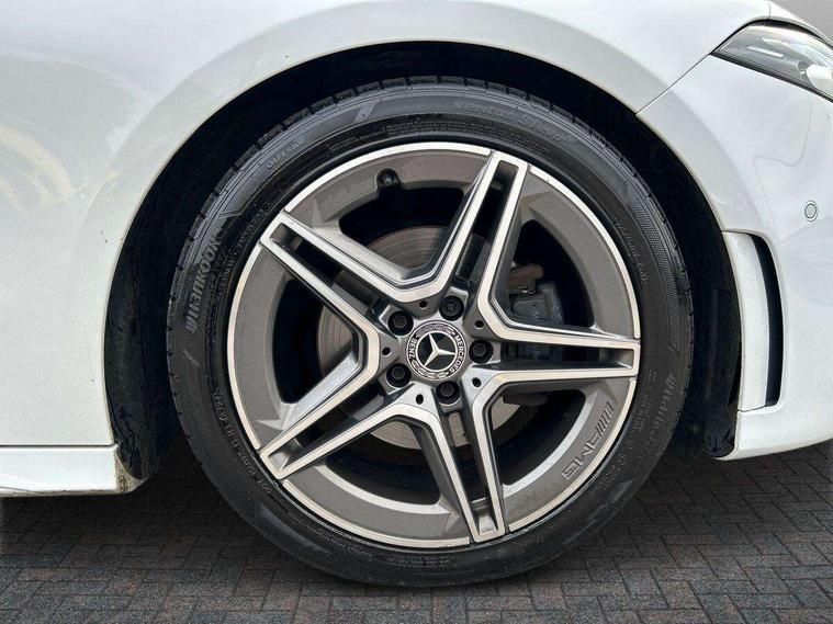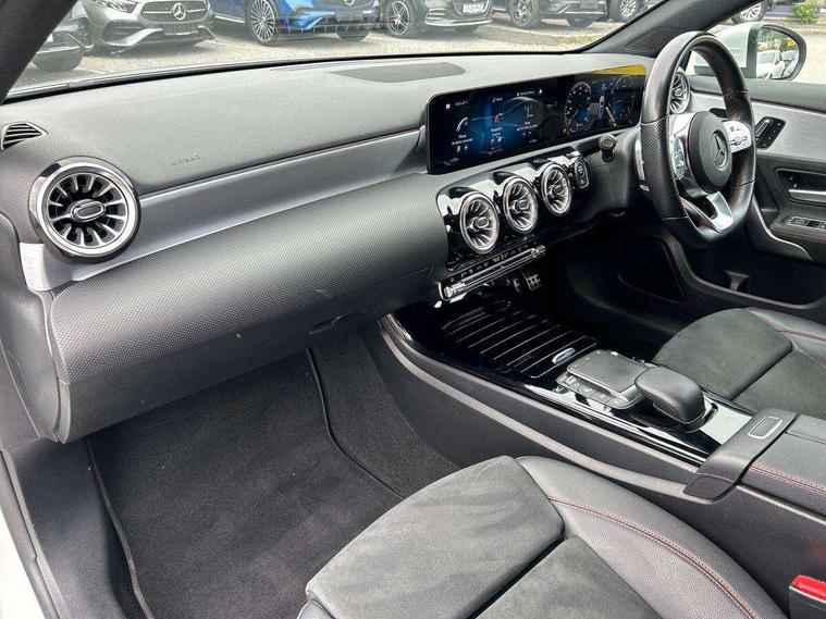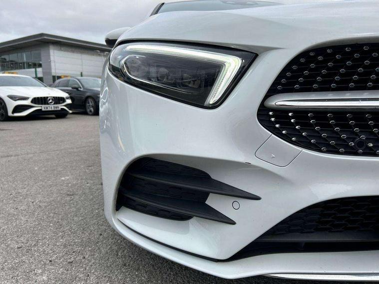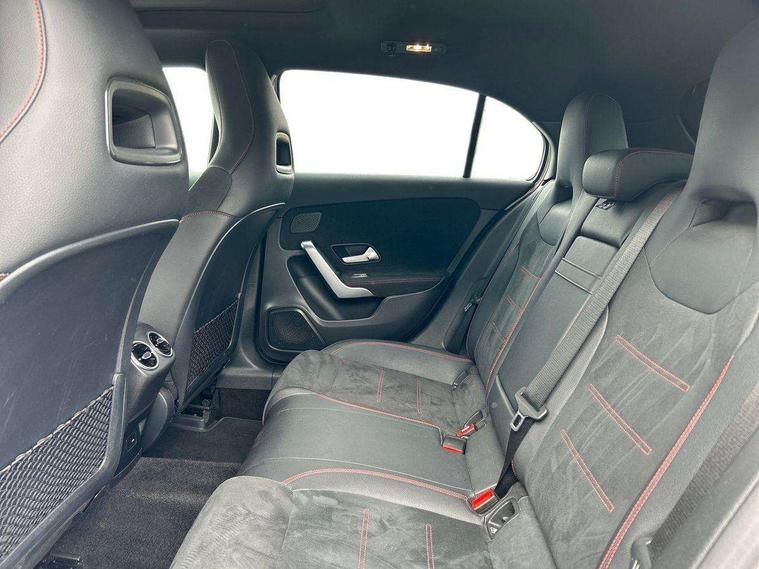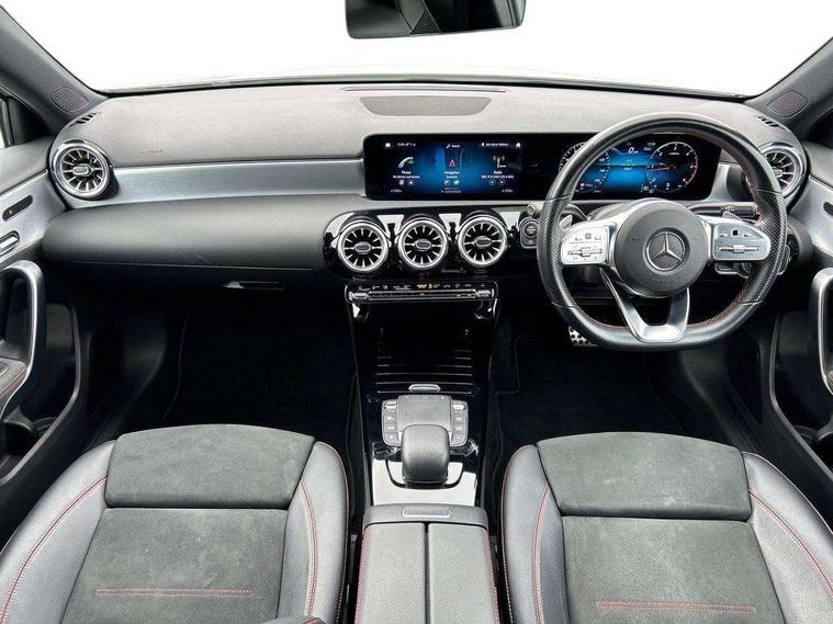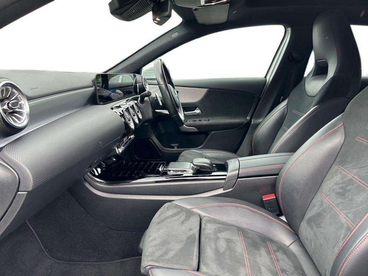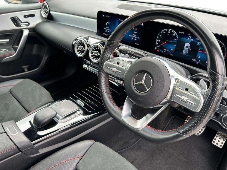 Ultrasonic sensors positioned in the front and rear bumpers, 10.25" Digital instrument cluster display screen, 10.25" media display, 180 degree rear view camera with parking guidelines, Active parking assist with visual and audible warning of detected obstacles, Attention assist, Brake pad wear indicator warning light, Car wash mode, Direct steering, Dual bluetooth interfaces, DYNAMIC SELECT with a choice of driving modes (ECO, Comfort, Sport and Individual), ECO start/stop function, Fluid level warning indicator for fuel, oil, coolant and washer fluid, Hard-disk navigation, Hey Mercedes Voice activation, Lamp failure indicator, MBUX augmented reality for navigation, Mercedes me connect including emergency call system, accident recovery, breakdown management and maintenance, Mercedes me remote services, Outside temperature gauge, Owners manual in English, Pre-installation for car sharing, Preinstallation for Mercedes Benz link, Service indicator (ASSYST), Smartphone integration with Apple CarPlay and Android auto, Traffic sign assist, Trip computer, Wireless charging, Lowered comfort suspension, Rear axle torsion beam, 10 speakers, 2 USB ports (type C) in rear stowage compartment and one in front of center console, DAB Digital radio, MBUX multimedia system with DAB digital radio and touchpad including satellite navigation, Mercedes-Benz advanced sound system - 225W, 4 Electric Front and Rear windows, Adaptive brake lights, AMG bodystyling - Front apron with splitter in chrome, rear apron with chrome trim and chrome visible trim elements in tailpipe, Black weather strip, Body colour bumpers, Body colour door handles, Body colour side skirt, Body coloured door mirrors, Chrome beltline trim, Diamond radiator grille with chrome pins and silver louvre + chrome insert, Electric adjustable and heated door mirrors with integrated LED side indicators, Exhaust system - Twin visible tailpipes in polished stainless steel, Headlamp assist automatic headlamp activation, Heated glass rear windscreen + timer control, LED high performance headlamps with integrated LED daytime running lights, LED tail lamp, LED third brake light, Multibeam LED with adaptive highbeam assist plus, Panoramic sliding sunroof, Privacy glass, Radio aerial, Rain sensing windscreen wipers with two sensitivity settings, Rear fog lights, Rear wiper, Window line trim strip in chrome, 3 Spoke flat bottom leather multi function steering wheel with perforated leather in grip area, 40:20:40 split folding rear seats, Artico man-made leather/Microfibre Dinamica upholstery with red contrast stitching, Auto Mercedes-Benz child seat recognition sensor, Black air vents with surround in silver chrome, Black roof lining, Brushed stainless steel sports pedals with rubber studs, Controller on centre console with chrome surround, Electrically adjustable front memory seats including lumbar support, Floor mats with stitched edging and AMG lettering, Front centre armrest with storage compartment, Front seat backs luggage nets, Front seat cushion length adjustment, Galvanished gear shift paddles on steering wheel, Heated front seats, Height/reach adjustable steering column, Illuminated front door sills with changeable cover, Interior lighting - 64 colour Ambient lighting, Interior mirror with reading lamps in black and frameless, ISOFIX and top tether child seat fixing points in two outer rear seats, Rear armrest with 2 cupholders, Rear head restraints, Seat occupancy sensor for front passenger seat, Sports seats with integrated headrests, Stowage compartment in centre console with retractable cover, Sunvisors with illuminated vanity mirrors, Touchpad on center console, Twin front cupholders, Two zone thermotronic luxury automatic climate control, Light and sight pack - A Class, Mirror package - A Class, Seat comfort pack - A Class, 3 rear 3 point seatbelts, ABS with Brake Assist, Active bonnet, Adaptive brake assist with hold function and hill start assist, Black seatbelts, Childproof locks manually operated for rear doors and electrically operated for rear power windows, Crash responsive emergency lighting, Driver and passenger head and side airbags, Drivers knee airbag, Dual stage driver/passenger airbags, Electronic parking brake, ESP curve dynamic assist, ESP with ASR, Front and rear seatbelt reminder, Front brake callipers with Mercedes Benz lettering, Tyre pressure monitoring system, Warning triangle and first aid kit, Window airbags, Alarm system/interior protection/immobiliser, Keyless entry lock/unlock, Keyless Go, Remote central locking and crash sensor with emergency opening function, Urban guard vehicle protection system with immobiliser and interior protection, Light aluminium with longitudinal grain interior trim, 18" AMG 5 twin spoke light alloy wheels in titanium grey with highsheen finish, Summer tyres, Tirefit sealant kit,