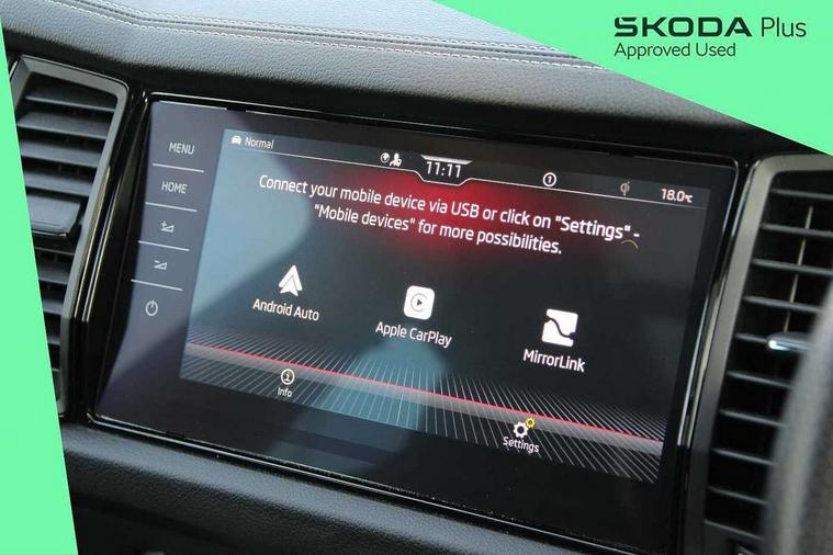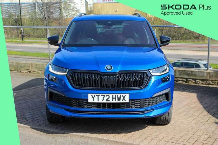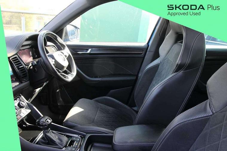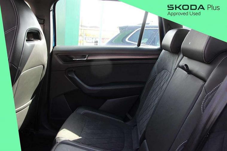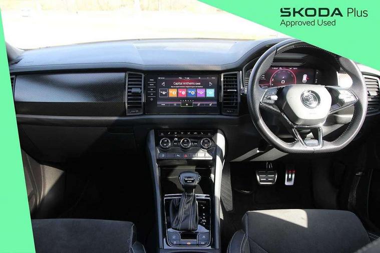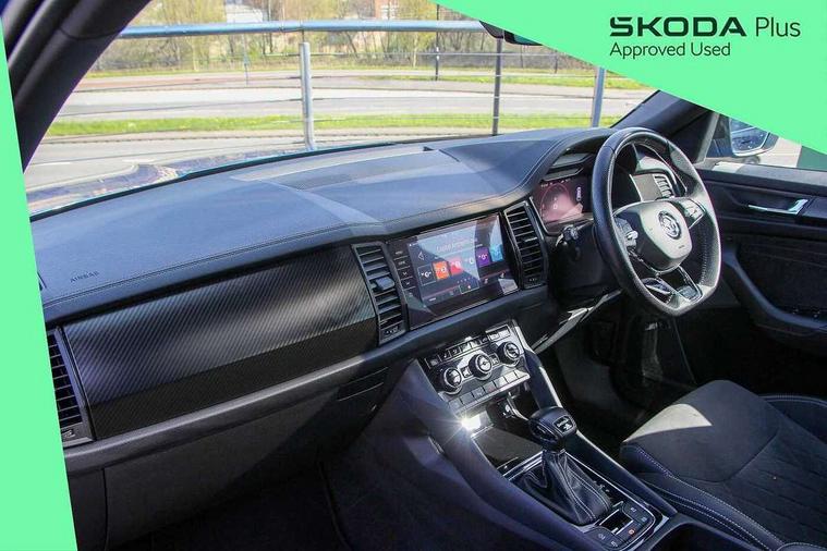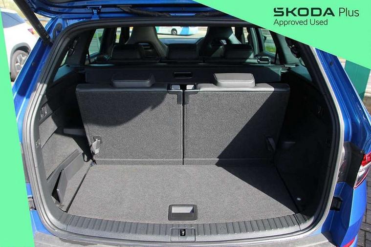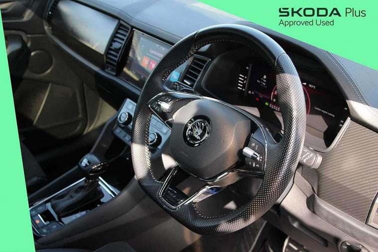 Bluetooth system, Columbus satellite navigation with 9.2" touchscreen, integrated Wi-Fi, web radio, Digital voice enhancement, E-call, ECO Stop/start function, Exterior temperature indicator, Progressive steering, Rear view camera, Smartlink wireless for apple carplay and wired for android auto, Speed limiter, Tailgate unlocking from outside, USB C Port x 2 in front centre console, Wireless charging, 8 Speakers, DAB Digital radio, Aero front windscreen wipers with intermittent function, Aero rear window wiper, Auto dimming rear view mirror, Black roof rails, Black sports styling including front grille and window surrounds, Black wheel arch surrounds, Body colour bumpers, Body colour door handles, Electric adjustable/heated/folding door mirrors, driver side auto dimming with boarding sports and memory function, Electric front and rear windows, Extended rear spoiler with finlets in gloss black, Front fog lights, Full LED matrix headlights with AFS (adaptive front light system), cornering function and AWL (all weather lighting system), Gloss black door mirrors, Headlight washers, Heated rear window, Invisible tailpipe, LED daytime running lights, LED rear fog light, LED third brake light in rear spoiler, Light assistant (coming/leaving home/tunnel light), Off-road style lower front bumper element, Privacy glass, Rain and light sensors, Rear diffuser, Rear LED lights (high functionality) with welcome effect and dynamic indicators, Rear side wing doors, Safety reflectors on front and rear doors, Sportline badge on front fender, Sports front and rear bumpers including lower rear chrome strip, Tailgate lettering in Black, Window control switches with black trim, Without engine designation, 12V socket in boot, 2 rails with 2 hooks, 2 seat bench in 3rd row, 3 seat bench in 2nd row, 4 foldable roof handles with rear coat hooks, 60:40 foldable rear seat with sliding adjustment and backrest angle adjustment, Aluminium pedals, Black roof headlining, Bottle holders in door panel in the 1.5 litre front and 1 litre rear, Cargo storage compartments, Chrome headlight control button, Chrome interior door handles, Coat hooks on B pillar, Covered storage compartment on driver side, Front centre armrest with storage compartment, cup holder and 12V socket, Front courtesy lights, Gear shift lever with chrome frame and black gloss insert, Grey stitching in front and rear armrests and door armrests + door inserts, Height adjustable front headrests, Illuminated and cooled glovebox, Illuminated luggage compartment, Isofix child seat fittings in outer rear seats with top tether, Manually adjustable steering column, Microsuede door panels, Net programme in boot (1x horizontal Net, 2x vertical Nets), Overhead glasses storage compartment, Pollen filter, Rear centre armrest with cupholders, Single front passenger seat, Sliding trunk cover, Small Bags on the inner sides of the front backrests, Sports seats, Sunvisors with illuminated vanity mirrors, Three rear height adjustable headrests, Ticket holder on A Pillar, Umbrella in door panel, Variable boot floor, LED Interior light pack - Kodiaq, Auto door release and activation of warning lights in the event of an accident, Child locks on rear doors, Driver and front passenger airbag with knee airbag and front passenger airbag deactivation, Electronic parking brake with hill start assist, Emergency rear braking signal, ESC (incl. ABS+MSR+ASR+EDS+HBA+DSR+RBS+MKB), Front assist with autonomous emergency braking, Front side airbags with curtain airbags, Fuel cut off safety device, Height adjustable front 3 point seatbelts + pretensioners, Hill hold control, Rear disc brakes, Safety vest holder in door, Seat belt reminder for all seats, Three point rear seat belts, Two tone horn, Tyre pressure monitor, Alarm with interior monitoring and tilt sensor with safe function, Anti-theft wheel bolts, Immobiliser, Keyless entry and start system (KESSY), Remote central locking with 2 keys, Black air vent surround, Carbon finish dashboard and door inserts, Grey stitching in dashboard, 20" Vega Anthracite alloy wheels, Temporary spare wheel (space saver),