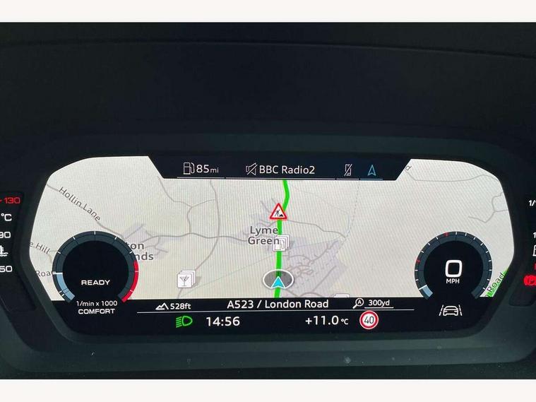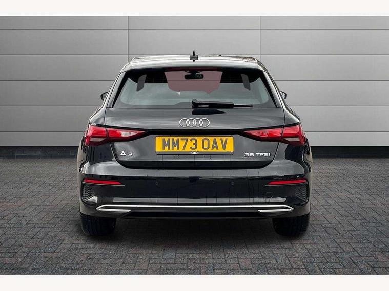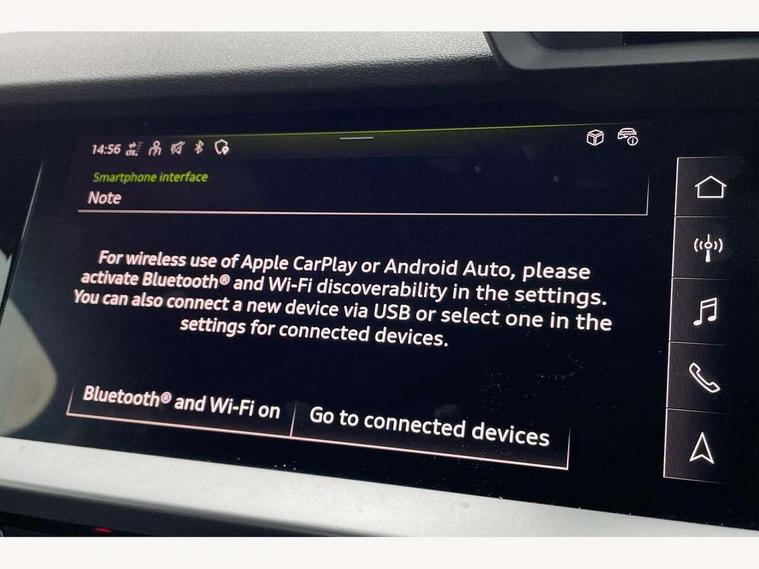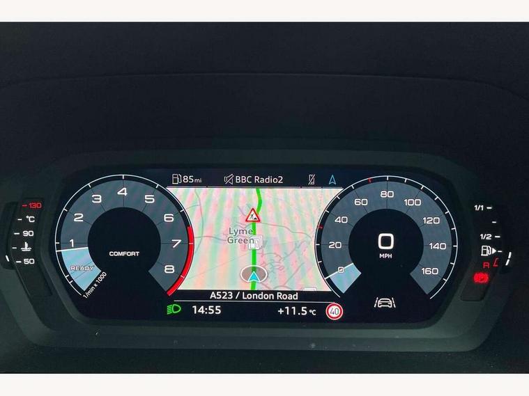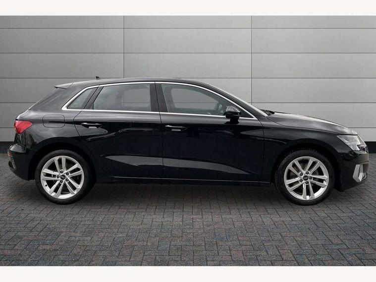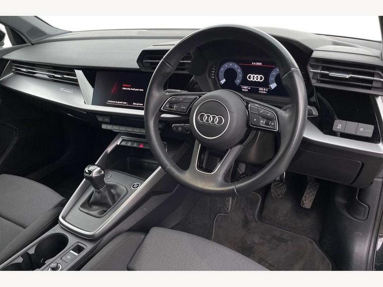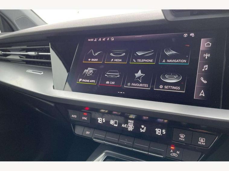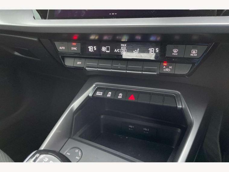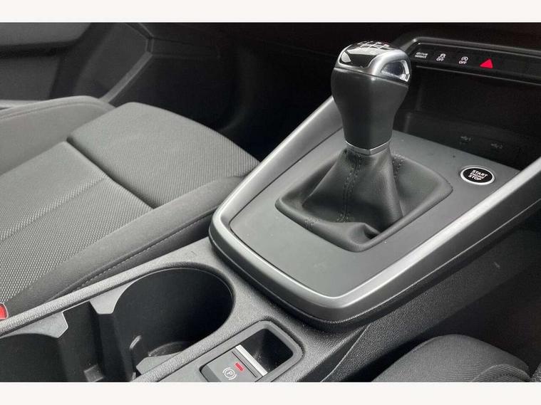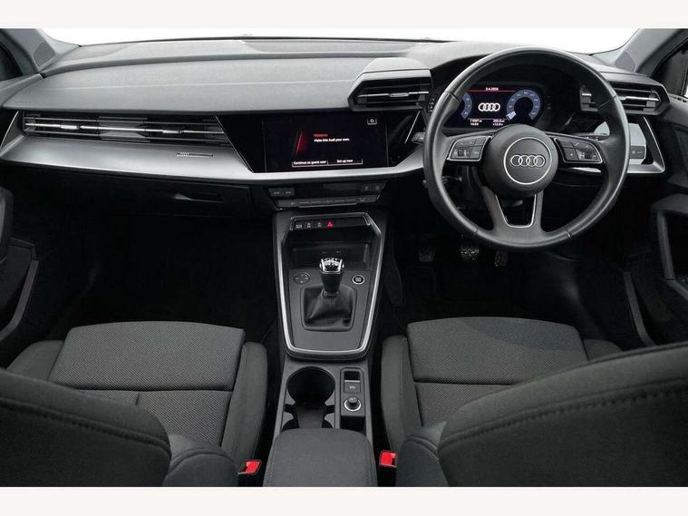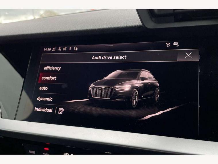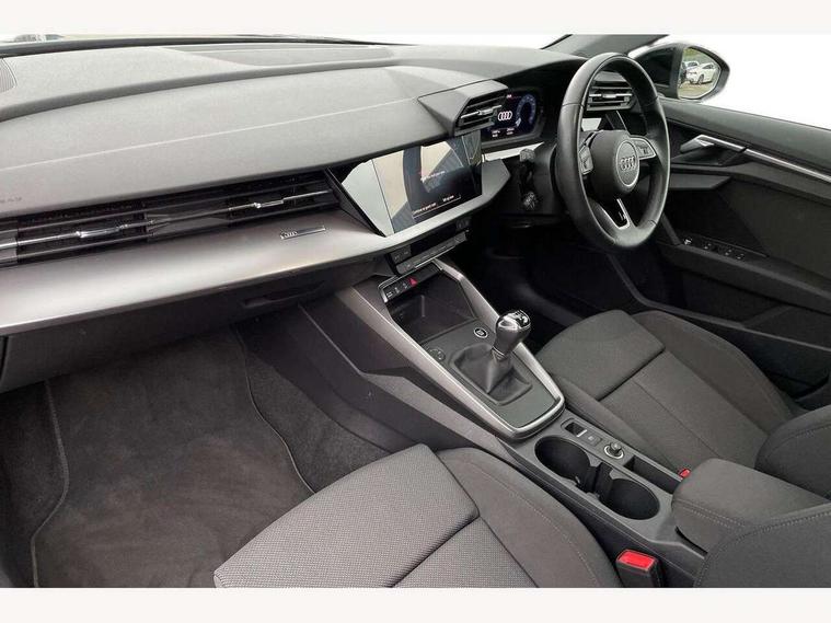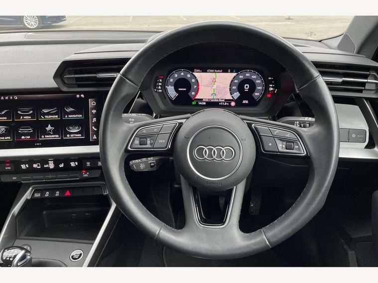 Audi drive select (Auto, Comfort, Dynamic, Efficiency and Individual), Audi smartphone interface, Audi Virtual Cockpit - 10.25" digital and colour instrument cluster, Automatic start/stop system with recuperation, Bluetooth interface, Camera based traffic sign recognition, Collision avoidance assistant, Cruise control, e-Call (emergency call), Electromechanical power speed sensitive steering, Lane departure warning system, MMI Navigation Plus with high resolution 10.1" colour touch screen display, Rear parking sensors, Service indicator, Trip computer, Voice control system with natural language interaction, Standard suspension, 2xUSB-C connection with data and charging functions, 6 passive loudspeakers, DAB Digital radio, 3rd brake light, Acoustic glass windscreen, Aluminium window trim, Auto dimming frameless rear view mirror, Body colour exterior mirrors, Body colour roof spoiler, Electrically adjustable/heated/folding/auto dimming door mirrors with integrated LED indications + kerb view function for passenger side, Front electric windows, LED daytime running lights, LED headlights and halogen rear lights, Light and rain sensors, Rear electric windows, Rear side wing doors, Rear window, rear door windows and rear side windows in clear glass, Rear wiper, 12V socket and storage compartment in front centre console, 3 seat bench in 2nd row, 3 spoke leather multifunction steering wheel, 4 way electrically adjustable lumbar support for driver and front passenger, 60/40 split folding rear seat bench, Dual zone electronic climate control, Front and rear headrests, Front centre armrest, Front door sill trims with aluminium inlay, Front/rear floor mats, Height and reach adjustable steering wheel, Interior lighting - Front and rear roof module including reading lights, glove compartment light and right hand side, Interior lighting - glove compartment light and right hand side, Luggage compartment floor covering, Manual boot compartment lid, Manually adjustable front seats, Routine cloth upholstery with front sports seats, Seat side bolsters, Single front passenger seat, Steel grey cloth headlining, Aluminium interior elements pack - A3 Sportback, LED interior lighting pack - A3 Sportback, Sport styling pack - A3 Sportback, 3x3 point rear seat belts, Driver and front passenger airbag with passenger airbag deactivation, Electronic Stabilisation Control (ESC) including ABS, ASR and EDL, First aid kit with warning triangle and 2 safety vests, Front side airbags with head airbags and interaction airbag, Pre-sense front with pedestrian and cyclist detection, Seatbelt monitoring, Tyre pressure loss indicator, Anti theft alarm, Anti-theft wheel bolts, Electronically operated child locks, Immobiliser, Remote control central locking, Inlays with silk effect paint in platinum grey,