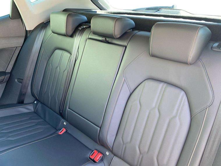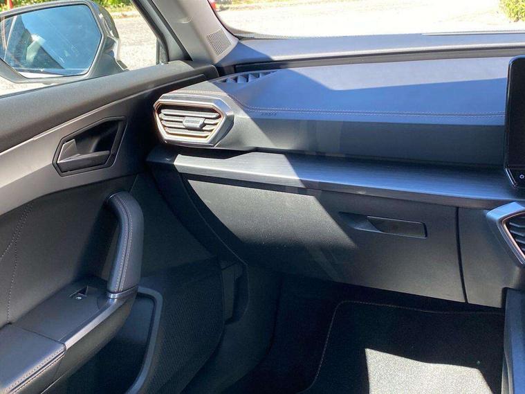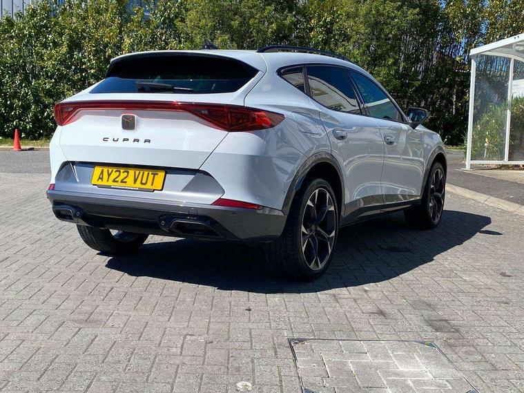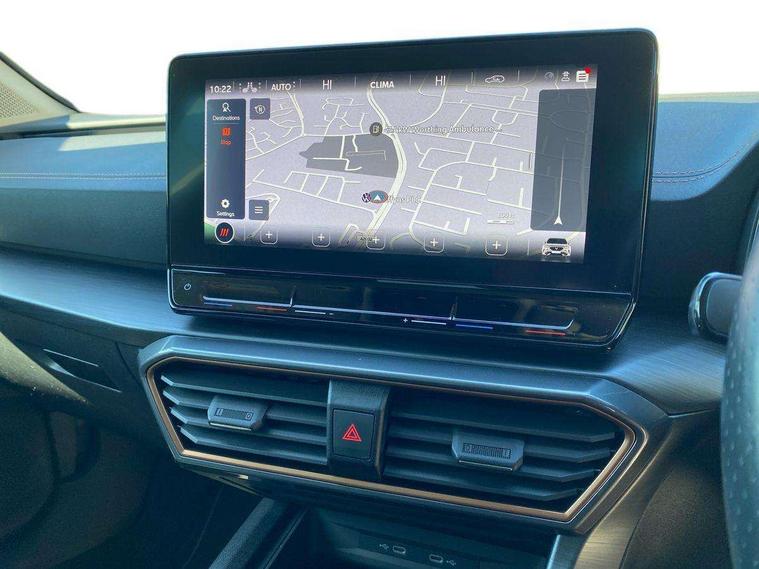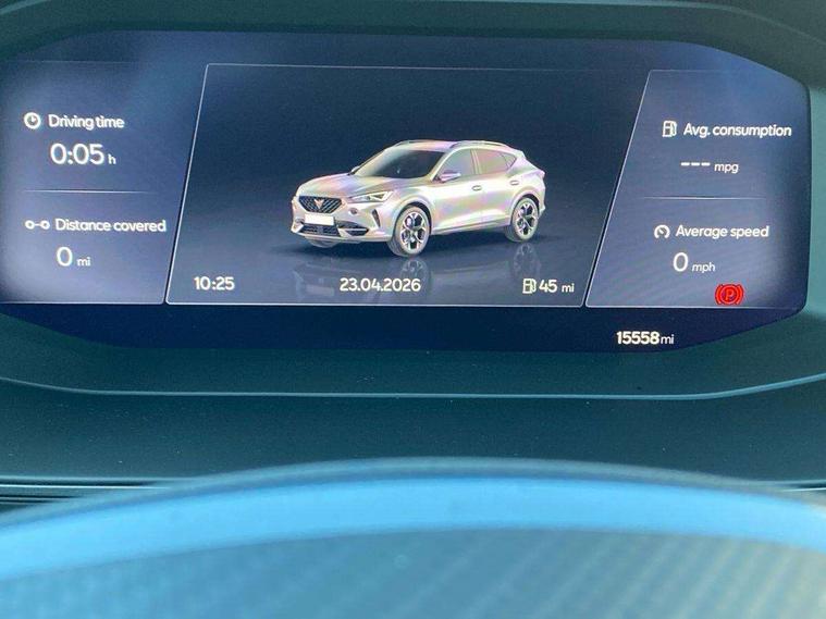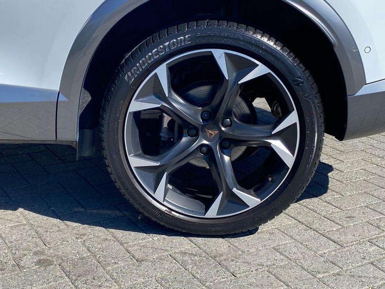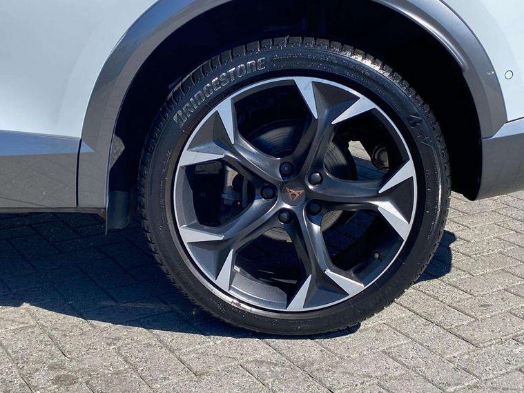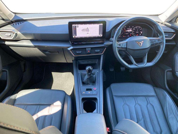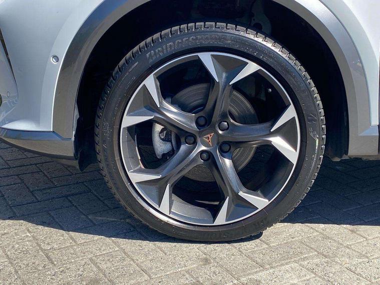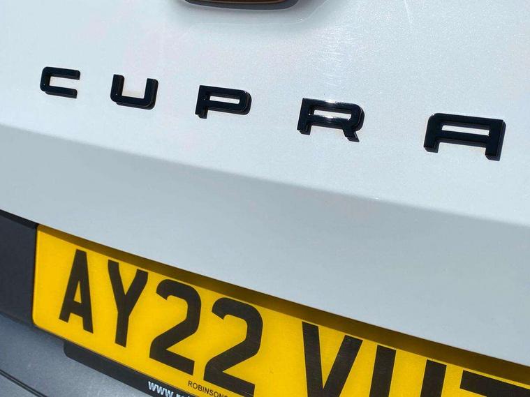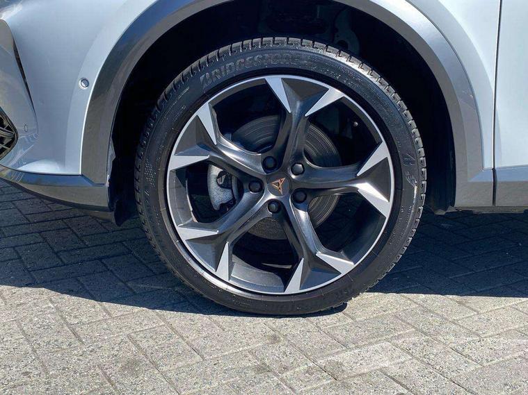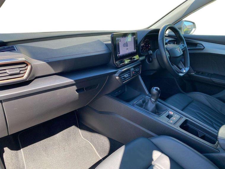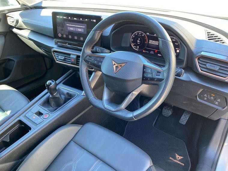 Digital cockpit and configurable dashboard, Driver alert system, Driving profile selection, E-call, Forward collision warning with automatic braking, Lane assist, Navigation system with 12'' Touchscreen Display, Park assist (inc front/rear parking sensors), PAS, Predictive adaptive cruise control with speed limiter, Rear view camera, RPM, trip computer, outside temp gauge, instrument light brightness, low fuel warning light, lights on reminder, gearshift indicator, Service interval indicator, Start/stop system with regenerative braking, Voice control system, Wireless apple carplay, Wireless phone charger, Electronic locking differential and dynamic traction support, Standard suspension, 2 front and 2 rear USB type C sockets, Auxiliary input socket, DAB radio, Auto dimming rear view mirror, Body colour door handles, Body coloured bumpers, Dark grey wing mirror, Daytime running light with automatic headlight control and coming home feature, Dynamic headlight range control, Electric front/rear windows, Electrically adjustable heated and folding door mirrors with memory function, Front fog lamps with cornering function, Gloss black roof rails and window surrounds, LED Headlights, LED Taillights with dynamic indicator, Rain sensing wipers, Rear diffuser with black simulated exhaust pipes, Rear side wing doors, Rear wash/wipe, Third brake light, Tinted rear windows, Welcome lights, 12v power supply in centre console, 12V socket, 12v socket in loadspace, 2 front and 2 rear reading lights, 230V socket, 3 seat bench in 2nd row, 60/40 split rear bench seat with armrest and mechanical seat release, Dust/pollen filter, Front and rear head restraints, Front centre armrest, Height/reach adjust steering wheel, Illuminated interior front door sills, Illuminated sunvisor with mirror, Isofix, Leather multi function steering wheel, Luggage tie-down hooks, Single front passenger seat, Three zone climate control with control panel in rear, Variable luggage/load compartment floor, Wraparound lighting, Genuine Nappa leather Pack - Cupra, Safety and driving pack (M) - Formentor, 3 point seatbelts on all rear seats, ABS, Brake control system - ESC and brake booster, Child proof door locks, Driver and front passenger airbags with front passenger airbag de-activation, Electronic parking brake, Front and rear disc brakes, Front side curtain airbags, Hill hold control, Seat belt reminder for front and rear seats, Tyre pressure monitoring system, Anti theft alarm system, Keyless entry and start system (KESSY), Locking wheel bolts, Copper and aluminium interior detailing, 19" 'Exclusive' machined sport matte black and silver alloy wheels,