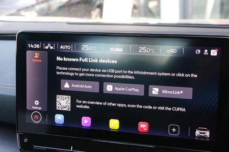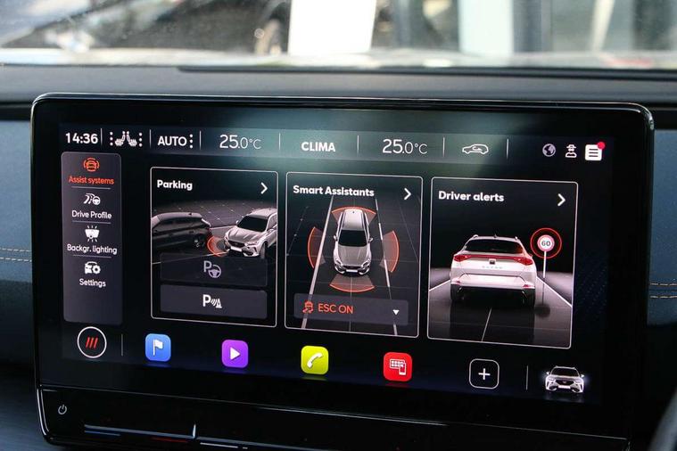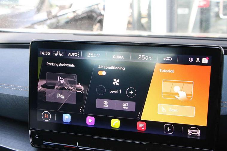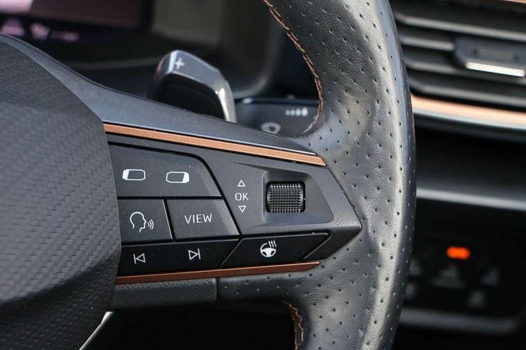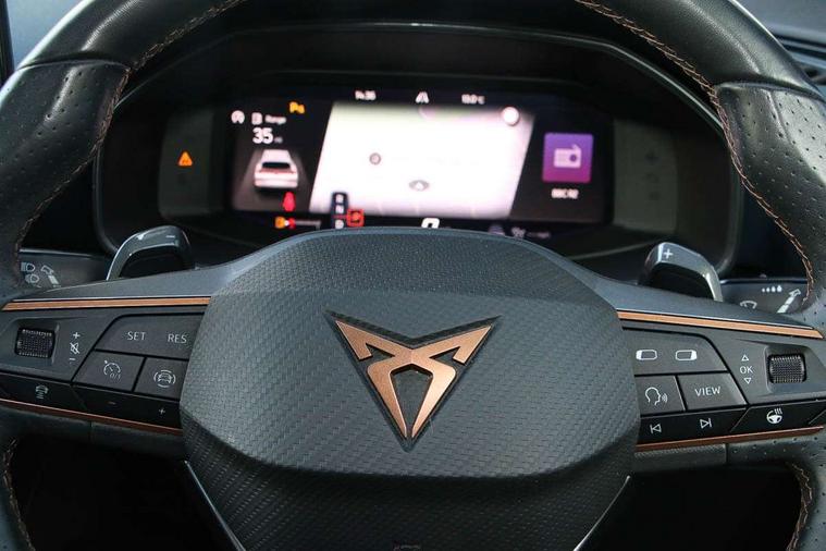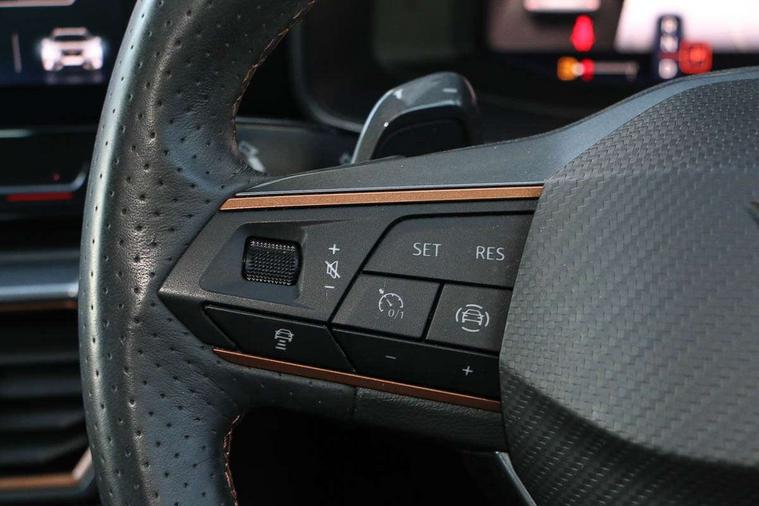 Digital cockpit and configurable dashboard, Driver alert system, Driving profile selection, Forward collision warning with automatic braking, Lane assist, Navigation system with 12'' Touchscreen Display, Park assist (inc front/rear parking sensors), PAS, Predictive adaptive cruise control with speed limiter, Rear view camera, RPM, trip computer, outside temp gauge, instrument light brightness, low fuel warning light, lights on reminder, gearshift indicator, Service interval indicator, Start/stop system with regenerative braking, Voice control system, Wireless apple carplay, Wireless phone charger, Electronic locking differential and dynamic traction support, Standard suspension, 2 front and 2 rear USB type C sockets, Auxiliary input socket, DAB radio, Auto dimming rear view mirror, Body colour door handles, Body coloured bumpers, Dark grey wing mirror, Daytime running light with automatic headlight control and coming home feature, Dynamic headlight range control, Electric front/rear windows, Electrically adjustable heated and folding door mirrors with memory function, Front fog lamps with cornering function, Gloss black roof rails and window surrounds, LED Headlights, LED Taillights with dynamic indicator, Rain sensing wipers, Rear diffuser with black simulated exhaust pipes, Rear side wing doors, Rear wash/wipe, Third brake light, Tinted rear windows, Welcome lights, 12v power supply in centre console, 12V socket, 12v socket in loadspace, 2 front and 2 rear reading lights, 230V socket, 3 seat bench in 2nd row, 60/40 split rear bench seat with armrest and mechanical seat release, Black headlining, Dust/pollen filter, Front and rear head restraints, Front centre armrest, Height/reach adjust steering wheel, Illuminated interior front door sills, Illuminated sunvisor with mirror, Isofix, Leather multi function heated steering wheel with gear shift paddles, Luggage tie-down hooks, Single front passenger seat, Three zone climate control with control panel in rear, Variable luggage/load compartment floor, Wraparound lighting, Genuine Nappa leather Pack - Cupra, 3 point seatbelts on all rear seats, ABS, Brake control system - ESC and brake booster, Child proof door locks, Driver and front passenger airbags with front passenger airbag de-activation, Electronic parking brake, Front and rear disc brakes, Front side curtain airbags, Hill hold control, Public e-call, Seat belt reminder for front and rear seats, Tyre pressure monitoring system, Anti theft alarm system, Keyless entry and start system (KESSY), Locking wheel bolts, Copper and aluminium interior detailing, 19" 'Exclusive' machined sport matte black and silver alloy wheels,