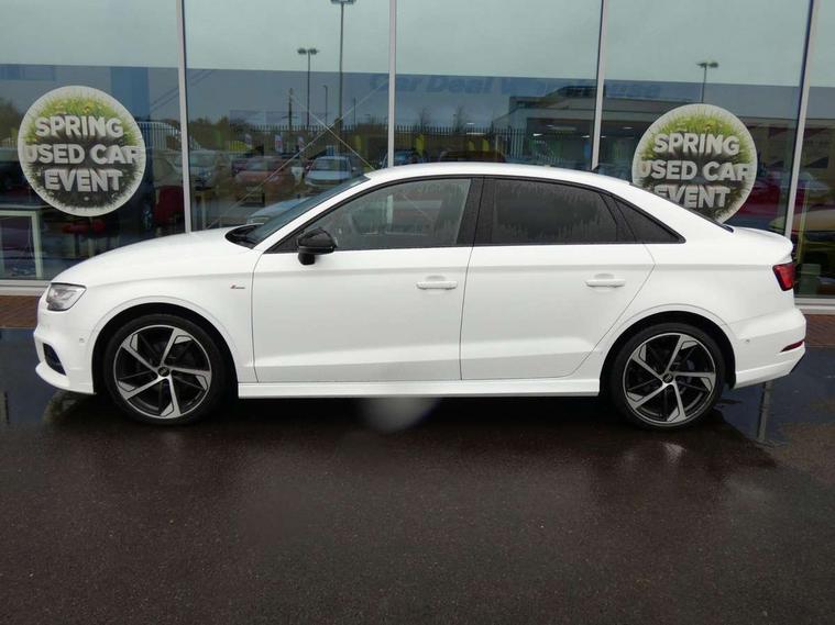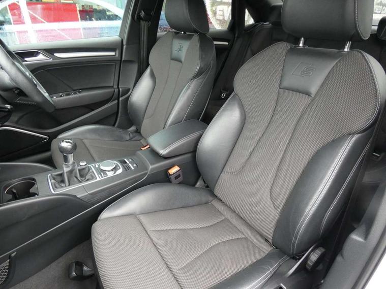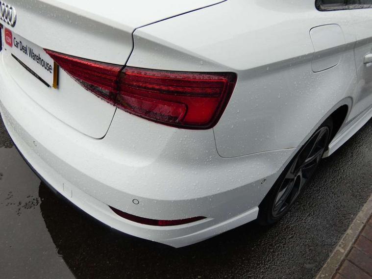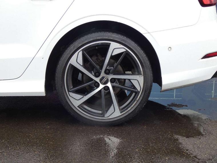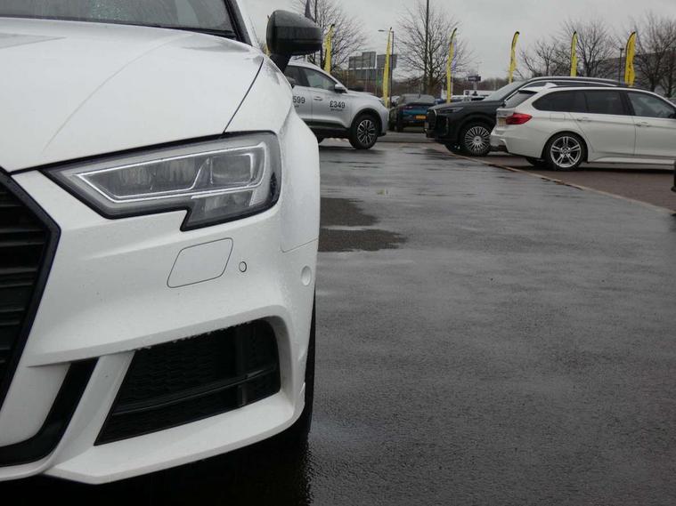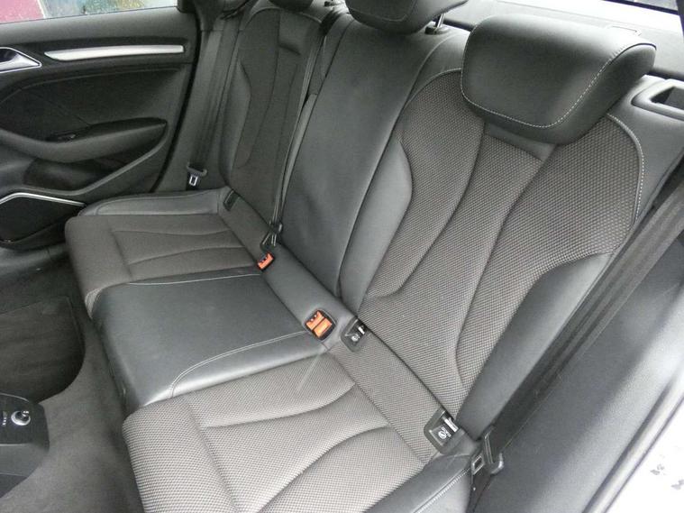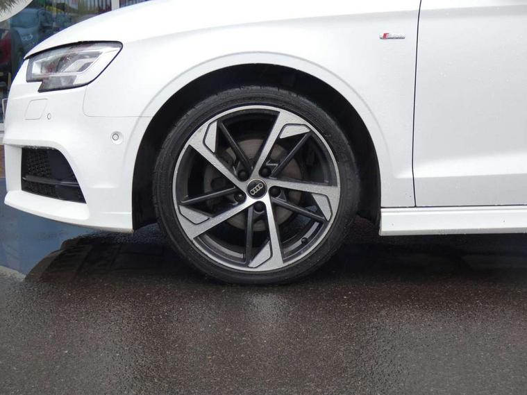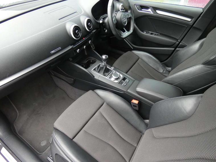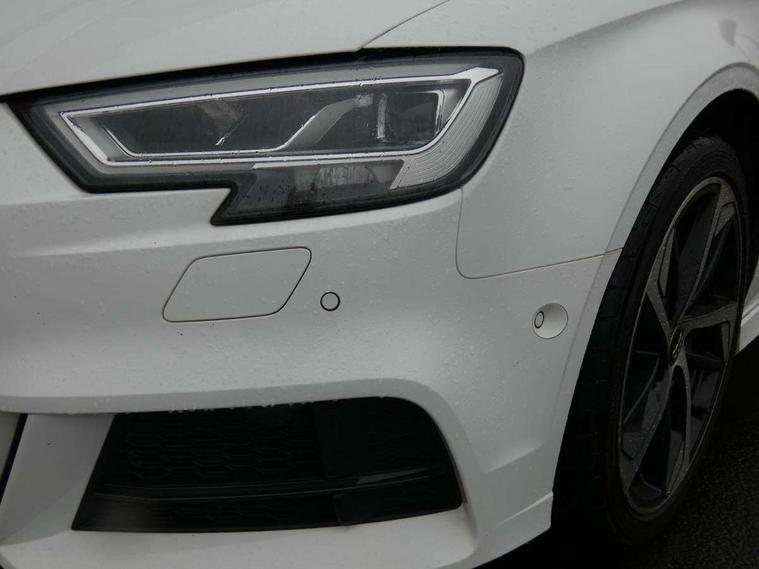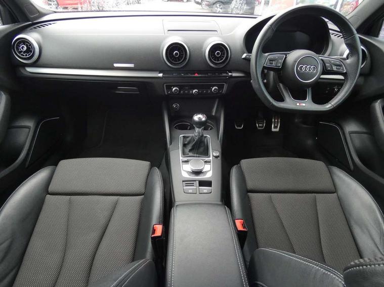 Audi connect, Audi drive select, Audi smartphone interface, Automatic start/stop system, Bluetooth interface, Colour driver's information system display, Electro-mechanical PAS, SD card based MMI navigation, Service indicator, Voice control system, Diesel particulate filter, 2 USB interfaces and Aux-In jack, CD player, DAB Digital radio, MMI radio plus with 7" colour MMI screen and MMI controller, Two SDXC card slots, Auto dimming rear view mirror, Automatic lights and wipers, Black door mirrors, Electrically adjustable and heated door mirrors with integrated LED side indicators, Front and rear electric windows, Heated rear window, Heated windscreen washer jets, Privacy glass, S Line badges on the front wings, S Line body styling, S Line body styling with high gloss dark chrome radiator grille and rear diffuser in platinum grey, S Line body with front and rear bumpers and side skirts, S Line roof edge spoiler, Single branch dual exhaust tailpipe, 3 adjustable rear headrests, 3 spoke flat bottomed multi-function leather sport steering wheel, 4 lashing points to secure luggage, Adjustable front centre armrest, Black cloth headlining, Driver/passenger sunvisors, Dual zone electronic climate control, Front and rear interior lights with delay, Front sport seats with S embossed logo, Front/rear floor mats, Height/depth adjustable steering column, Illuminated door sill trims with S logo, Illuminated glovebox, Illuminated luggage compartment, ISOFIX child seat mounting and Top Tether with front passenger airbag deactivation, Stainless steel pedals, Storage compartments in doors side trims, centre console and under front drivers seat, Black styling pack - A3/S3, LED interior light pack - A3/RS3, Non smoking pack - A3, Storage and luggage pack - A3/RS3, 3 point seatbelts on all seats, ABS/EBD, Airbags - front driver/passenger, front & rear side, curtain, drivers knee, ASR, EDL, Electromechanical parking brake, ESC - Electronic Stability Control + traction control, Hill hold assist, Predictive pedestrian protection, Seatbelt warning, Tyre pressure warning, Warning triangle and first aid kit, Anti theft alarm, Anti-theft wheel bolts, Immobiliser, Remote control central locking, Aluminium air vent surrounds, Aluminium trim elements, Matt brushed aluminium inlays, 18" 5 arm trapezoid design sport alloy wheels in gloss anthracite black with diamond cut finish, Tool kit, Tyre repair kit,