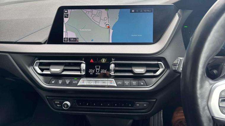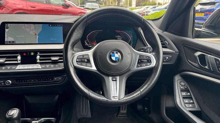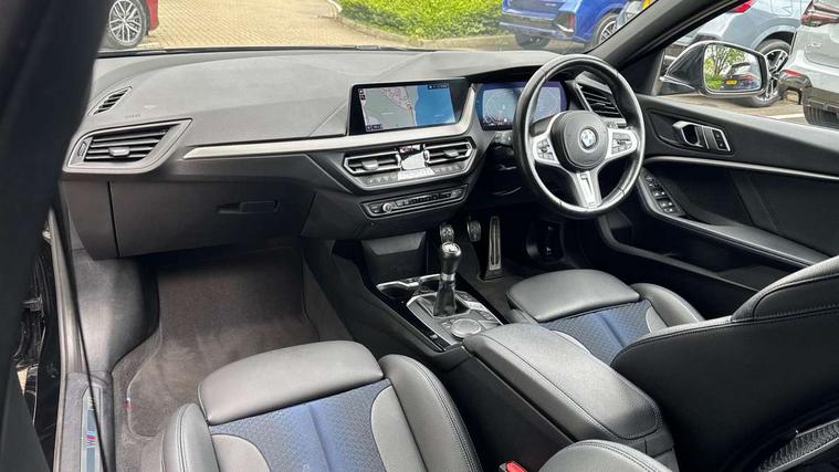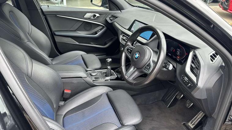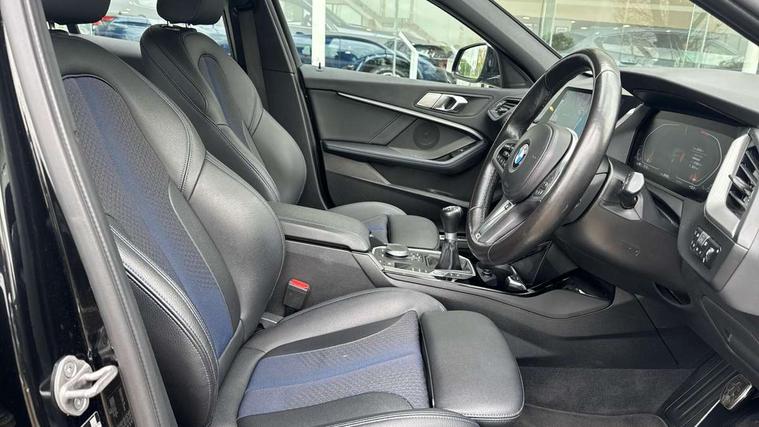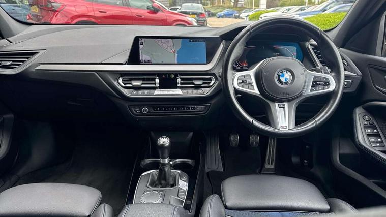 Active guard plus, Attentiveness assist, Bluetooth / WiFi interface for wireless connection of mobile terminal devices and audio streaming, BMW ConnectedDrive online services, BMW Teleservices, Check Control warning system for monitoring of lights and door/luggage compartment open warning, Cruise control with brake assist, Eco pro mode, Front axle single joint with specific axle kinematics to minimise drive influences on steering + provide increased rigidity agile driving behaviour, Integrated owners handbook, Lane departure warning system, Oil sensor for level and grade, On board computer, Optimum shift indicator, Personal Profile, Pull away assistant, Rigidly mounted rear subframe - Multi link construction with separate spring / damper configuration and excellent driving characteristics, Speed limit Info including no-overtaking indicator, Speed limiter, Aluminium lightweight construction, Anti roll bar front and rear, Balancer shaft, Double VANOS twin scroll turbocharging system, Drive Performance Control, Electronic differential lock, High precision injection, M sport suspension, Petrol Particulate Filter, Twin tube gas filled shock absorbers with degressive characteristic curve, VALVETRONIC engine management, DAB Digital radio, Auto dimming rear view mirror, Automatic headlight beam throw control, Automatic windscreen wipers and automatic headlight, Body colour door handles, Body colour mirror caps, Body colour roof trims, Chrome 'M' logo side designation, Chrome exhaust twin tailpipes round 90mm in left, Chrome kidney grille frame with Satin Aluminium struts, Direction indicator side lights in exterior mirrors, Fading support, Folding side mirrors with auto dimming/folding wing mirrors with auto dimming, Follow me home headlights, Front and rear bumper system with replaceable deformation elements, Front and rear electric windows with open and close fingertip control, anti trap facility and comfort closing, Front door sill finishers in black plastic with M designation in metallic look, Green tinted heat protection glazing, Heated, electrically adjustable exterior mirror aspheric on driver side, convex on passenger side, High gloss shadowline window frame, Recess cover mirror frames and B/C pillar embelisher trim, High level third brake light, Integrated front windscreen with washer jets, LED daytime running lights, LED eyebrow turn indicators, LED front fog lights, Lightweight engineering, Matt black air guide grilles, Matt black wheel arch trim, Model designation on electric bootlid, Nearside reverse light in rear light cluster, Preparation for high beam assistant, Rear fog lights, Rear side wing doors, Rear window wiper, Shark fin antenna, Trailer stabilisation logic, Visible VIN plate, Welcome lighting, 12V power socket in front centre console with blanking plug, 3 rear seat head restraints, 3 seat bench in 2nd row, 3 spoke sports leather steering wheel in black leather with black stitching and decorative finisher in pearl chrome, specific M badge + leather knob, Ambient interior lighting, Anthracite headlining, Black boot net with lashing eyes, Cargo function on 2nd seat row, Child seat ISOFIX attachment for two outer rear seats and front passenger seat with anchorage points, Conditioned based service, Driver and front passenger seat heating, Folding rear clothes hook, Four grab handles integrated in roof lining, Front and rear door pockets with bottle holders, Front and rear side armrest integrated into door trim, Front armrest, Front sports seats, Gearshift lever with M designation, Glove compartment, Height adjustable front head restraints, Luggage compartment for bag hooks on left and right, foldable luggage compartment liner and four lashing eyelets, Manual adjust steering wheel, Multi-function controls for steering wheel, Single front passenger seat, Storage compartment in centre console, Sun visors with vanity mirrors and insert tab, Two front centre console cupholders, Two zone automatic air conditioning, Velour floor mats, Additional interior lighting pack - 1 Series, BMW live cockpit professional pack- 1 Series, Connected pack professional - 1 Series, Interior lights pack - 1 Series, M Sport exterior styling aerodynamics pack - 1 Series, 2 tone horn, 3 point seatbelts on all seats, front pyrotechnic belt tensioners, stopper and belt force limiters, rear coded belt buckles, Airbags - Front driver/passenger, front and rear curtain head protection, front side, manual deactivation of front passenger airbag, Anti lock braking system (ABS) with brake assist, BMW emergency call, Brake drying, Braking readiness, Child proof locking system in rear door, City braking function, Comfort modes, Cornering brake control, Crash sensor activating central locking release, hazard warning lights, fuel cut off, interior lighting + activation of safety battery terminal clamp, Driver and front passenger seat belt security check, Dynamic stability control + (DSC+), Dynamic Traction Control - DTC, Electrically operated hand brake, Front and rear disc brakes, Seatbelt warning, Side impact protection, Tyre pressure monitoring system, Warning triangle and first aid kit, Central locking switch for all doors, fuel filler cap and luggage compartment, Deadlocking function system to all doors, Drive away locking system on all doors and luggage compartment with de-activated in iDrive settings, Locking wheel bolts, Remote control with integrated key with High-gloss Black inlay and M designation and 1 button for open/ close lock, window, open luggage compartment, Start/stop button illuminated in centre console with keyless engine start and auto start stop deactivation button, Thatcham Cat.1 alarm and immobiliser, Wheel slip limitation close to the actuator (ARB), Contrast stitching on instrument panel, Electrically powered 12V compressor, Reduced rolling resistance tyres,