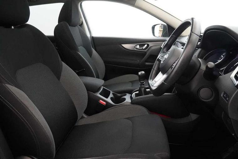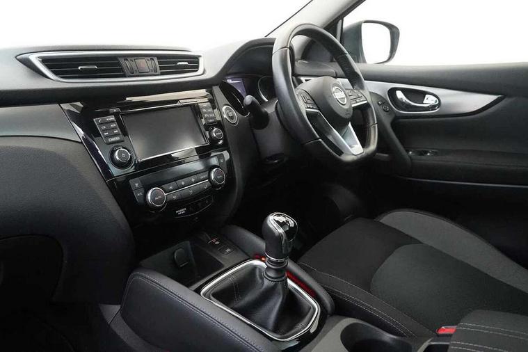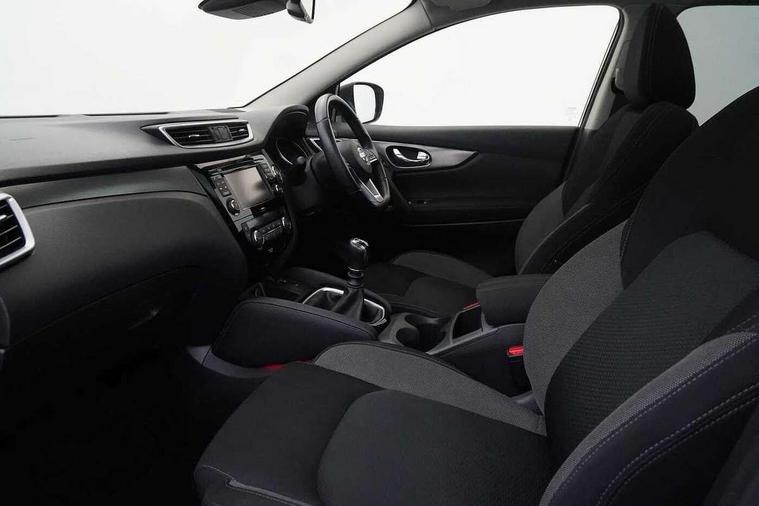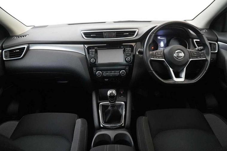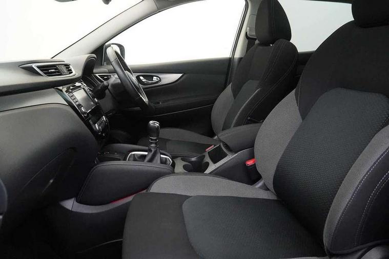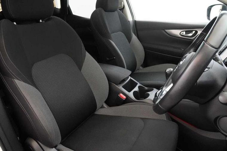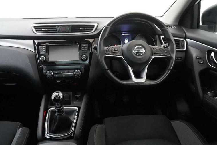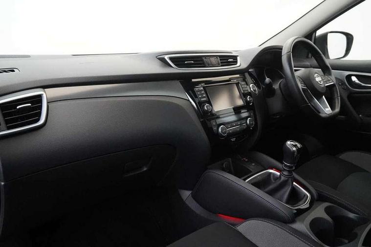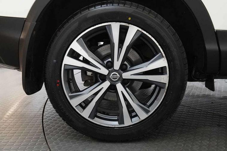 5" TFT driver information centre, Around View Monitor, Bluetooth phone integration system, Cruise control, Electric speed sensitive power steering, Front and rear parking sensors, Lane departure warning system, Nissan connect sat nav system, Outside temperature display, Push button starter, Rear view camera, Service interval indicator, Speed limiter, Traffic sign recognition, Trip computer, 'Shark fin' mobile antenna, 6 speakers, DAB Digital radio, Radio/CD, Smartphone apps, Steering wheel mounted audio controls, USB/aux input socket, Automatic headlamp activation, Body colour bumpers, Body colour door handles, Body colour door mirrors, Chrome window surround, Electric folding and heated door mirrors, Front fog lights, High beam assist, Interior mirror with auto anti dazzle, LED indicators in door mirrors, Matt silver roof rails, One touch electric front/rear windows, Privacy glass, Rain sensor windscreen wipers, Rear roof spoiler, Rear wiper, 2 X front 12v power sockets, 60/40 split folding rear seat, Ambient interior lighting, Centre console with armrest, Chrome interior door handles, Cloth upholstery, Configurable luggage board system, Driver + front passenger lumbar support, Dual zone climate control, Front and rear door pockets with bottle holders, Front headrests, Front seat belt pre-tensioners with load limiters, Height adjustable driver's seat, Height adjustable passenger seat, Illuminated electric window switch, Isofix child seat preparation, Leather gearknob, Leather interior door handles, Leather knee rest, Leather steering wheel, Luggage compartment lighting, Parcel shelf, Pollen filter, Rake/reach adjustable steering wheel, Rear armrest with 2 cupholders, Rear headrests, ABS, brake assist and EBD, Child locks on rear doors, Curtain airbags, Driver/front passenger airbag, Electronic parking brake, ESP + traction control, Forward emergency braking, Front passenger airbag deactivation, Height adjustable front seatbelts, Hill start assist, Seatbelt warning, Side airbags, Three 3 point rear seatbelts, Tyre pressure monitoring system, Alarm, Immobiliser, Intelligent Key, Remote central locking, Piano black interior trim, 18" Bi-colour alloy wheels, Tyre puncture repair kit,
