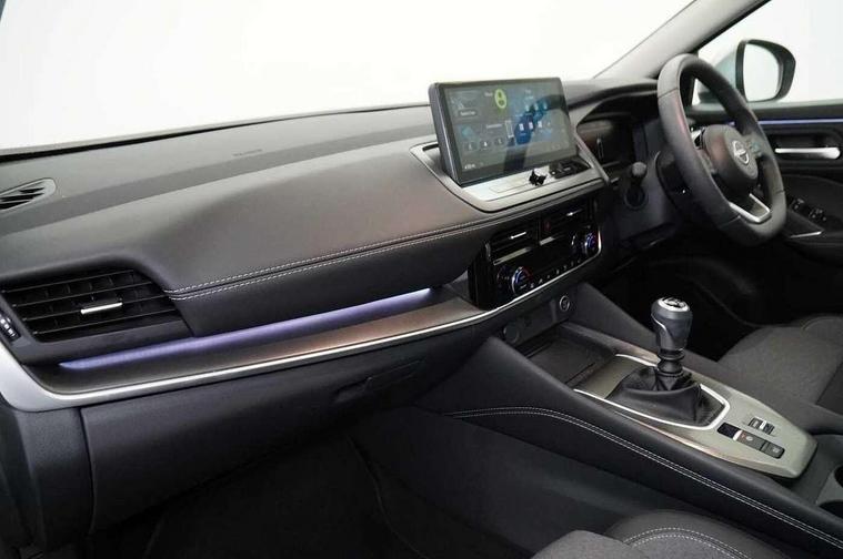 360 degree Intelligent around view monitor with moving object detection, Blind spot intervention, Blind spot warning, Drive assist, Drive assist custom mode, Drive modes (sport, normal, eco), Driver drowsiness and attention warning, Electric speed sensitive power steering, Emergency and breakdown call, Emergency lane keep assist, Emergency Stop Signal (ESS), Engine start/stop button, Event data recorder, Front and rear parking sensors, Full Digital 12.3" TFT Digital Combimeter, Google virtual personal assistance, Idle stop/start system, In-car WIFI hotspot, Intelligent Cruise control (ICC), Intelligent forward collision warning, Intelligent speed assist, Lane departure warning system, Nissan connect 12.3 inch touchscreen infotainment system, Nissan connect navigation with google maps, Nissan connect services 2.0 (Google Automotive System), Outside temperature sensor, Rear cross traffic alert, Reversing detection, Wireless Apple CarPlay/Android Auto, Wireless charging pad, Limited slip differential, 2 front USB-C ports, 2 rear USB-C ports, 6 speakers, AM/FM audio system with DAB, Bluetooth audio streaming, Auto rear wiper when reversing, Body colour mirror caps, Body coloured door handles, Bodyside mouldings, Chrome side window finisher, Electric auto folding door mirrors, Electrically adjustable and heated door mirrors with LED turn indicator, Follow me home headlights, High beam assist, Intelligent auto headlights, LED 3rd brake light, LED daytime running lights, LED Headlights, LED rear lights, One touch front and rear electric windows with remote opening and closing, One touch passenger window, Partially body coloured bumpers, Rear privacy glass, Rear roof spoiler, Rear side wing doors, Rear styling plate, Shark fin antenna, Splash free rain sensing wipers, Super UV and infrared cut glass, Three blink turn signal, 3 bench rear seats in 2nd row, 3 rear headrests, 60/40 split folding rear seat bench, Chrome interior door handles, Cloth upholstery, Dark headlining, Driver seat back pocket, Dual zone automatic climate control with pollen filter, Front door with bottle holders, Height adjustable front headrests, Leather shift knob, Luggage board system, Luggage space lighting, Multifunction steering wheel, Passenger seat back pocket, Rear door bottle holders, RGB ambient light (Full area coverage), Single front passenger seat, Smooth leather steering wheel, Tilt/telescopic adjustable steering wheel, Two rear isofix child seat anchorage points with top tether, 3x3 point rear seatbelt pretensioners + load limiters, Autonomous emergency braking, Child locks on rear doors, Curtain and front side, far side airbags, Driver and passenger airbags, Driver, passenger and 2nd row rear seat belt reminder, Electric handbrake with auto hold function, Front seatbelt pretensioners + load limiters, Height adjustable front seatbelts, Hill start assist, intelligent front emergency braking, Rear automatic braking, Tyre pressure monitoring system, Vehicle dynamic control, Engine immobiliser, Intelligent key with walk away lock and approach unlock functions, Remote central door locking with deadlocking, Thatcham alarm, 18" Diamond cut alloy wheels, Tyre puncture repair kit,