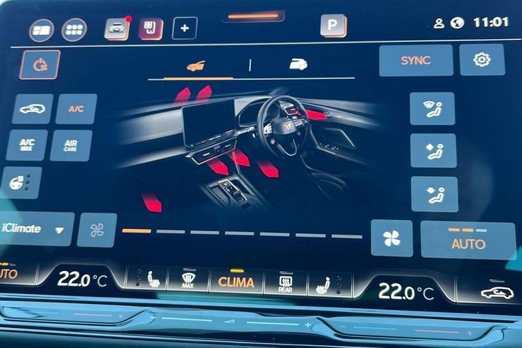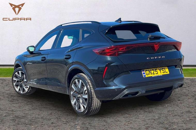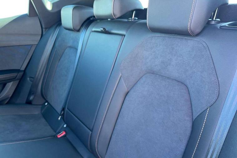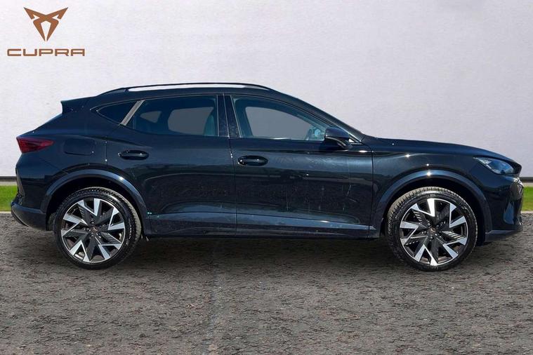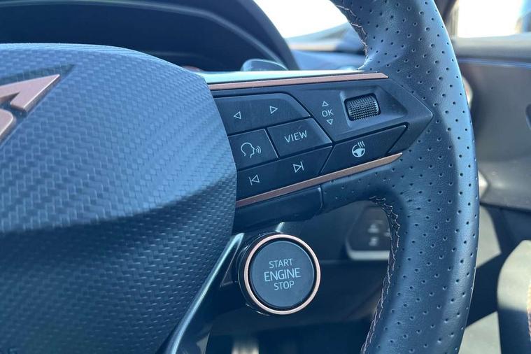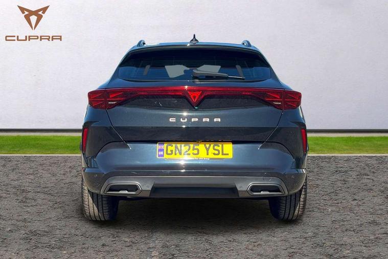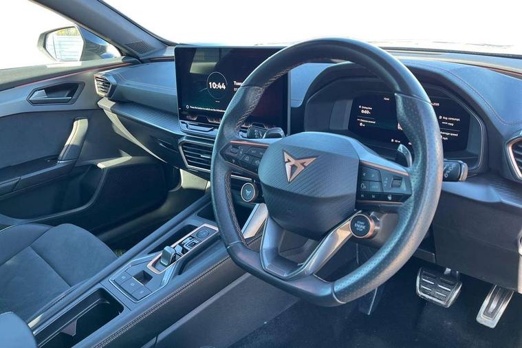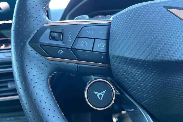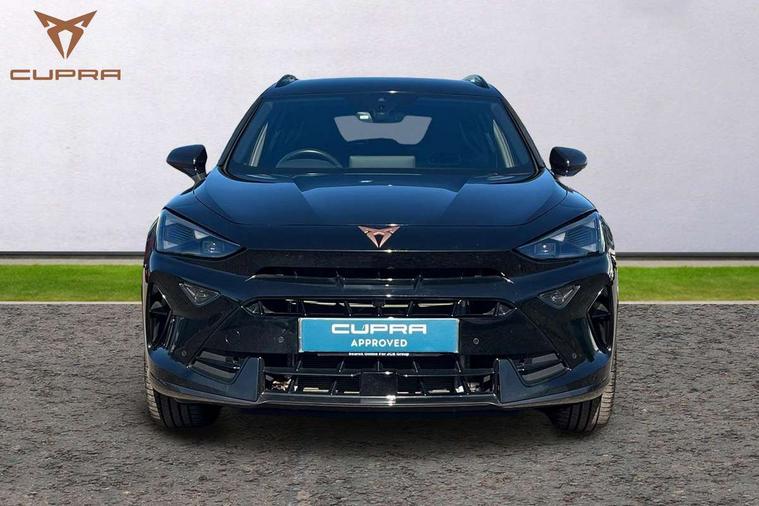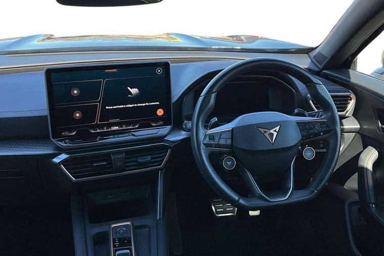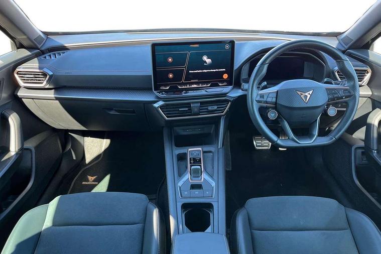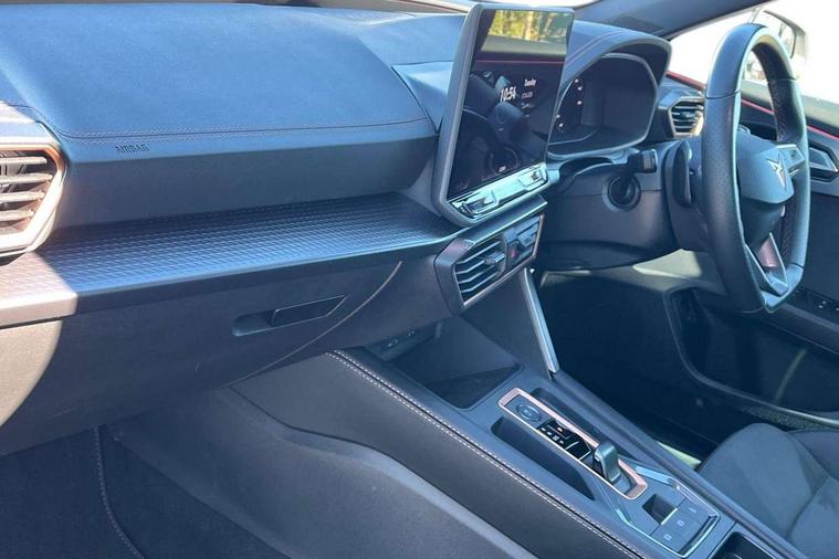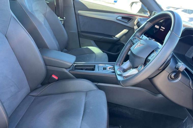 10.25" digital cockpit and configurable dashboard, Adaptive cruise control with follow-to-stop and speed limiter, Advanced driver alert system, Driving profile selection, Dynamic road sign display, Emergency steering support with turn assist, Forward collision warning with automatic braking, Front and rear parking sensors, Full link phone integration, Lane assist, Progressive steering, Rear view camera, RPM, trip computer, outside temp gauge, instrument light brightness, low fuel warning light, lights on reminder, gearshift indicator, Service interval indicator, Start/stop system with regenerative braking, Virtual pedal and electric tailgate, Voice control system, Wired Android Auto, Wireless apple carplay, Wireless phone charger, CUPRA sport suspension, Electronic locking differential and dynamic traction support, 2 front and 2 rear USB type C sockets, Media system with navigation, 12.9" touchscreen display, voice control, DAB, steering wheel mounted controls, Auto dimming rear view mirror, Body colour door handles, Body coloured bumpers, Dark grey wing mirror, Daytime running light with automatic headlight control and coming home feature, Door panel ambient lighting, Dynamic headlight range control, Electric front/rear windows, Electrically adjustable heated and folding door mirrors with memory function, Gloss black roof rails and window surrounds, High beam assist, LED 3rd brake light, LED front fog lamps with cornering function, LED Headlights, LED Taillights with dynamic indicator, Rain sensing wipers, Rear diffuser with black simulated exhaust pipes, Rear fog lights, Rear side wing doors, Rear wash/wipe, Tinted rear windows, Welcome lights (within exterior mirror housing), 12V socket, 2 front and 2 rear reading lights, 3 seat bench in 2nd row, 60/40 split rear bench seat with armrest and mechanical seat release, Black headlining, Black interior roof lining, Cupra sports pedals, Dust/pollen filter, Electrically adjustable driver's seat with memory and lumbar support, Front and rear head restraints, Front centre armrest, Heated front seats, Heated supersports multifunction leather steering wheel with satellite buttons and gear shift paddles, Height/reach adjust steering wheel, Illuminated aluminium doorsteps, Illuminated interior front door sills, Illuminated sunvisor with mirror, Isofix, Leather dashboard, door insert and side trim panel, LED smart wraparound lighting, PVC/Dinamica microfiber upholstery + bucket seats, Satellite steering wheel, Single front passenger seat, Storage pockets on rear of front seats, Three zone climate control with control panel in rear, Variable luggage/load compartment floor, 3 point seatbelts on all rear seats, ABS, Brake control system - ESC and brake booster, Child proof door locks, Driver and front passenger airbags with front passenger airbag de-activation, Electronic parking brake, Front and rear disc brakes, Front side curtain airbags, Hill hold control, Public e-call, Seat belt reminder for front and rear seats, Tyre pressure monitoring system, Anti theft alarm system, KESSY Advanced - Keyless start, keyless entry with SAFELOCK, Locking wheel bolts, Copper and aluminium interior detailing, 19" Sandstorm machined sport black and silver alloy wheels,