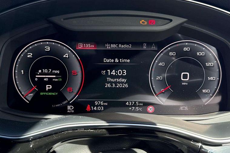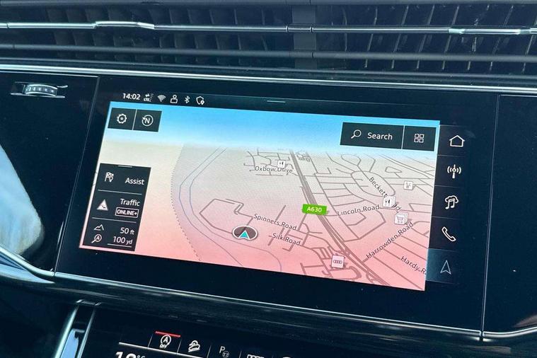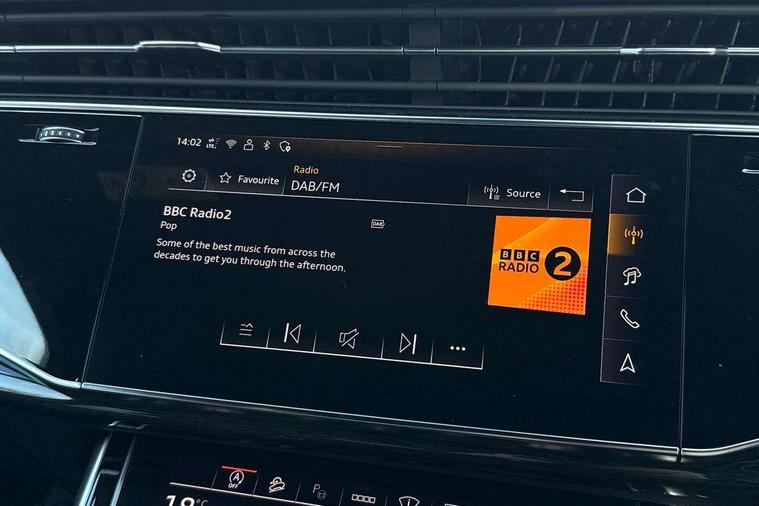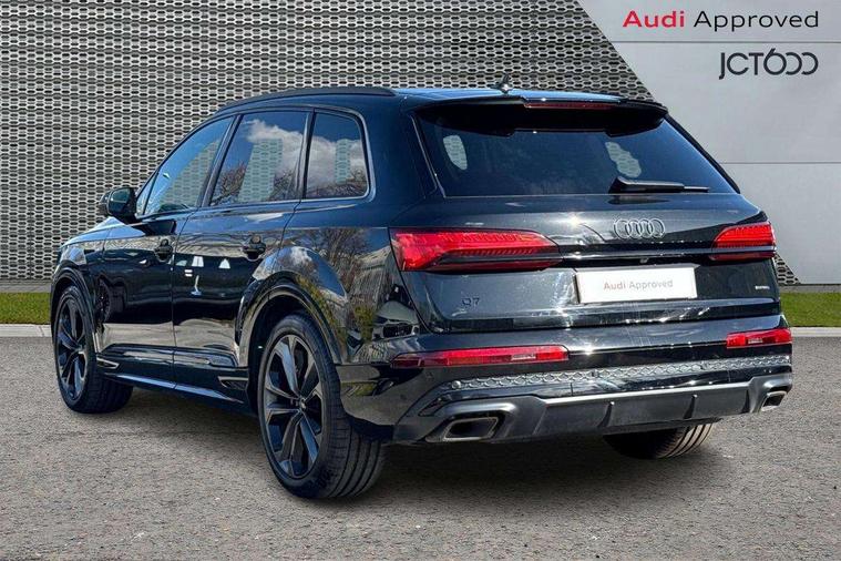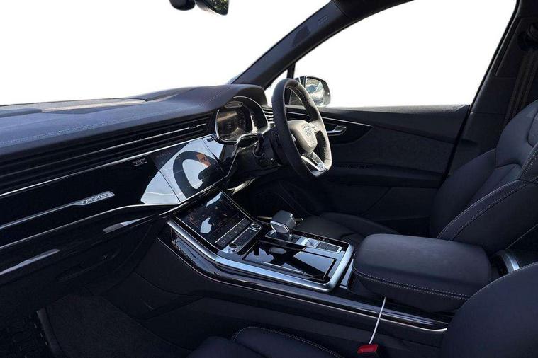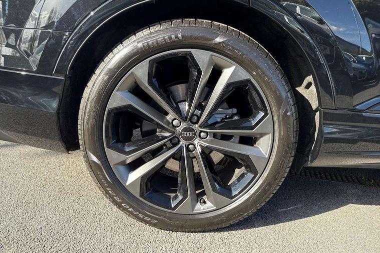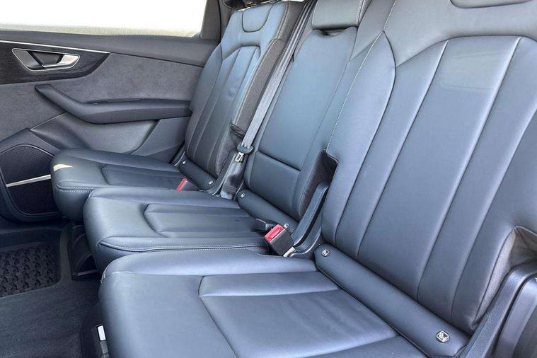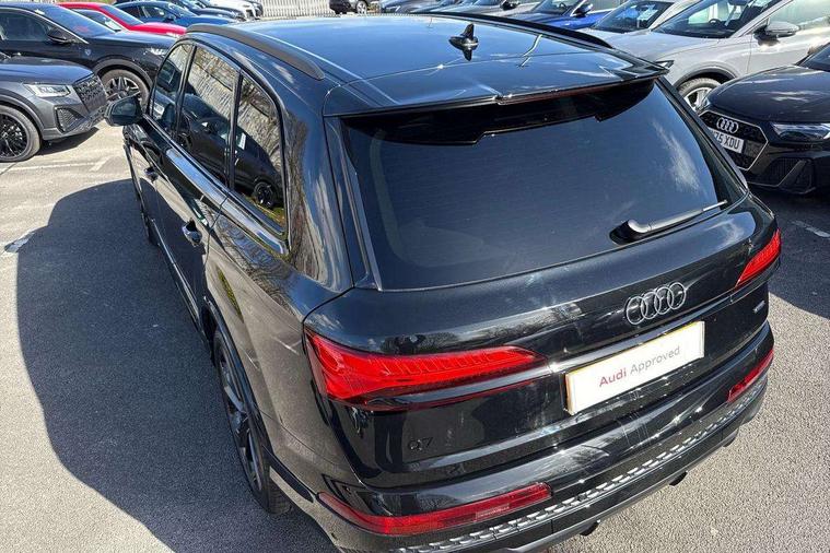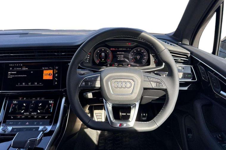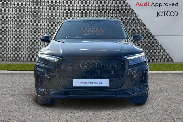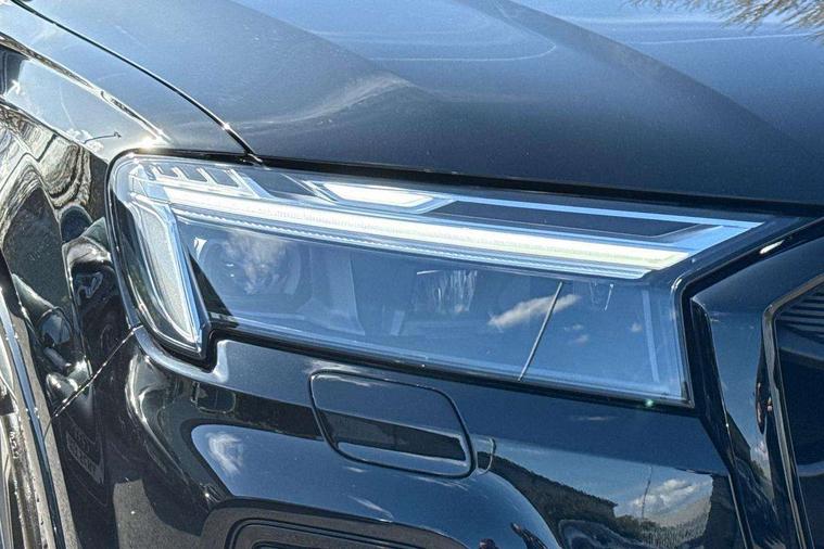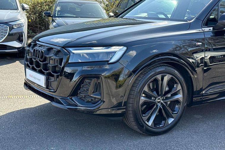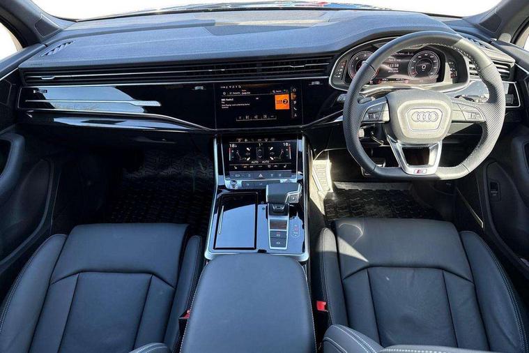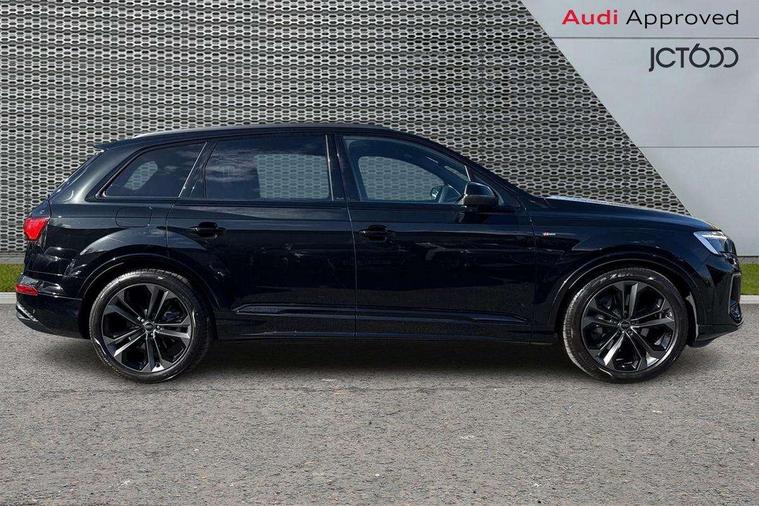 Audi connect safety and service (e-call), Audi connect with Amazon Alexa Integration, Audi drive select (Auto, Comfort, Dynamic, Efficiency, Individual, Off-road and All road), Audi phone box light with wireless charging, Audi virtual cockpit - 12.3" high-resolution LCD display with fully customisable instrument cluster, Bluetooth interface, Camera based traffic sign recognition, Electromechanical power steering, MMI navigation plus with MMI touch screens includes 10.1" and 8.6" screens with haptic feedback, Natural voice recognition, Operating buttons in Matte black, Parking system plus with 360 degree display (front, rear and side sensors) - acoustic and visual park assist system, Power operated tailgate, Rear view camera, Smartphone interface includes wireless Apple carplay/Android Auto, Start/stop system, 48V Mild hybrid technology, Adaptive air sports suspension, Quattro all wheel drive with self locking centre differential, Audi music interface - front 2 USB-C ports with charger and data functions, Audi sound system with 6 channel amplifier, 180 watt amplifying capacity and 10 loudspeakers including subwoofer, DAB digital radio module, Aluminium window trim, Audi Beam uses LEDs to project S emblem with red rhombus onto the ground when opening the side doors (front/rear), Auto dimming frameless rear view mirror, Black exhausts, Black roof rails, Electrically adj heated/folding + automatically dimming exterior mirrors with memory + automatic kerb side function for passenger side exterior mirror, Heat insulating glass in windshield, Integrated LED indications in door mirrors, LED 3rd brake light, LED daytime running lights, LED rear tail lights, Loading edge protection in stainless steel, Matrix LED headlights with dynamic front and rear indicators, Privacy glass - dark tinted rear and rear side windows from B-pillar backwards, Rear side wing doors, Rear wiper, 2 seat bench in 3rd row, 2 zone automatic climate control, 3 seat bench in 2nd row, 7 seat layout with ISOFIX points for the front passenger seat and rear passenger seat, Black carpets, Black cloth headlining, Comfort front centre armrest, Electric adjustable front seat with 4 way lumbar support, driver memory functionality, Folding rear seats, Front head restraints, Front/rear floor mats, Heated front seats, Illuminated door sill trims with S logo, ISOFIX child seat mounting for front passenger seat and 2 outer rear seats with top tether child seat mounting for all 3 rear seats, LED interior ambient lighting, Luggage compartment cover, Luggage compartment sill protection in stainless steel, Rear head restraints, Rear seat bench plus for the second row, with forwards/backwards sliding adjustment and backrest angle adjustment, Single front passenger seat, Stainless steel pedals, Sunvisors with illuminated vanity mirrors, Black styling pack plus - Q7, 3 point seatbelts on all rear seats, Audi pre sense basic, Audi pre sense front, Child locks on rear doors, Convenience key with safelock and gesture tailgate, Driver and front passenger, front side and curtain airbags, Electromechanical parking brake, Electronic Stabilisation Control (ESC) including ABS, ASR and EDL, Extended pedestrian protection measures, Hill hold assist, Seatbelt reminder, Tyre pressure loss indicator, Warning triangle and first aid kit, Anti theft alarm with tow away protection, Anti-theft wheel bolts and wheel loosening detection, Keyless Go, Remote central locking, Black dashboard, Polished oak trim with grey finish inlay, Tool kit, Tyre repair kit,