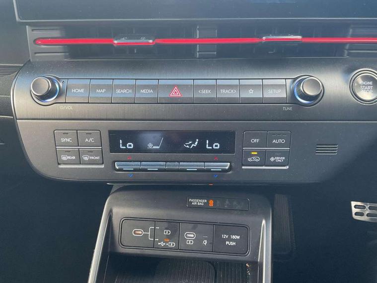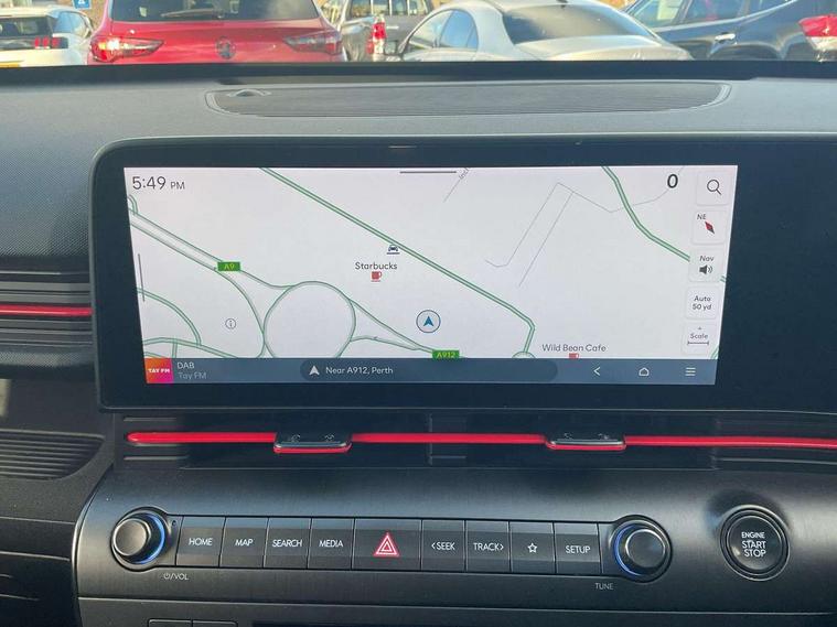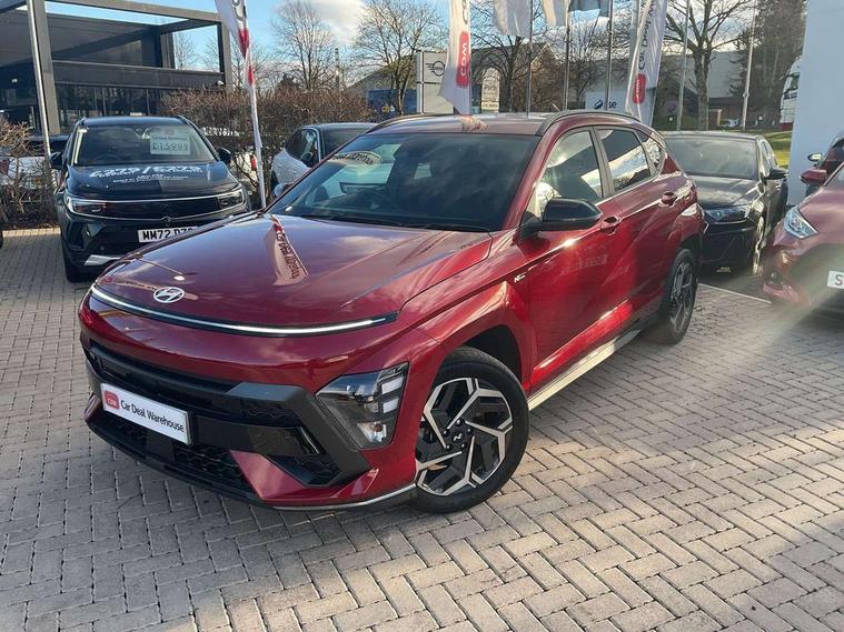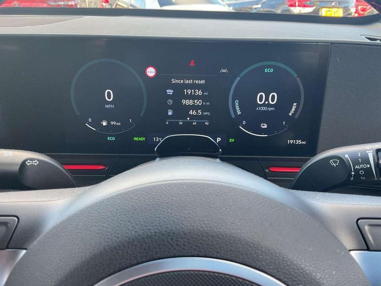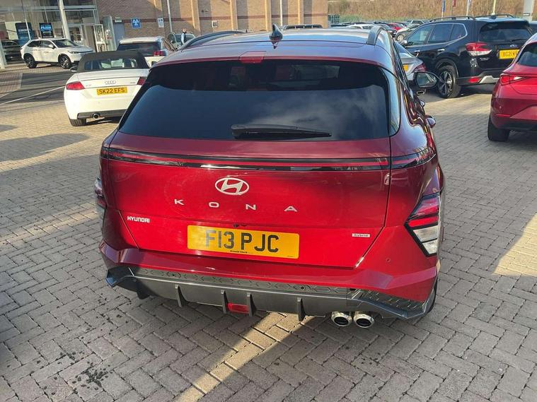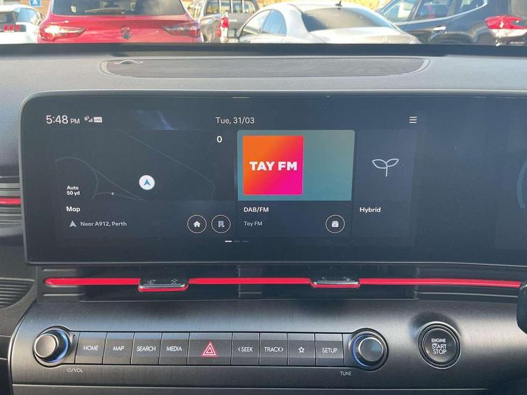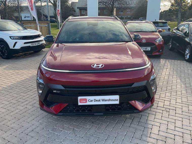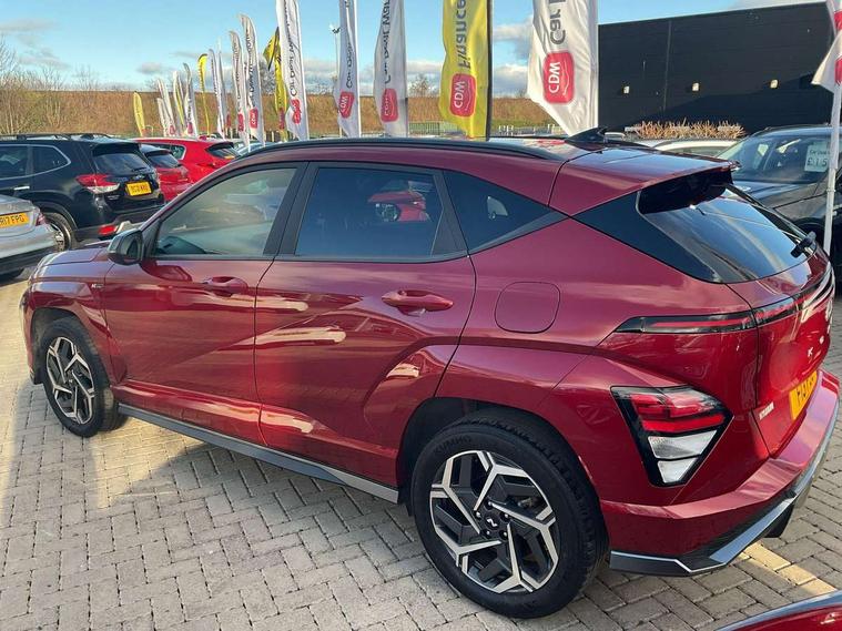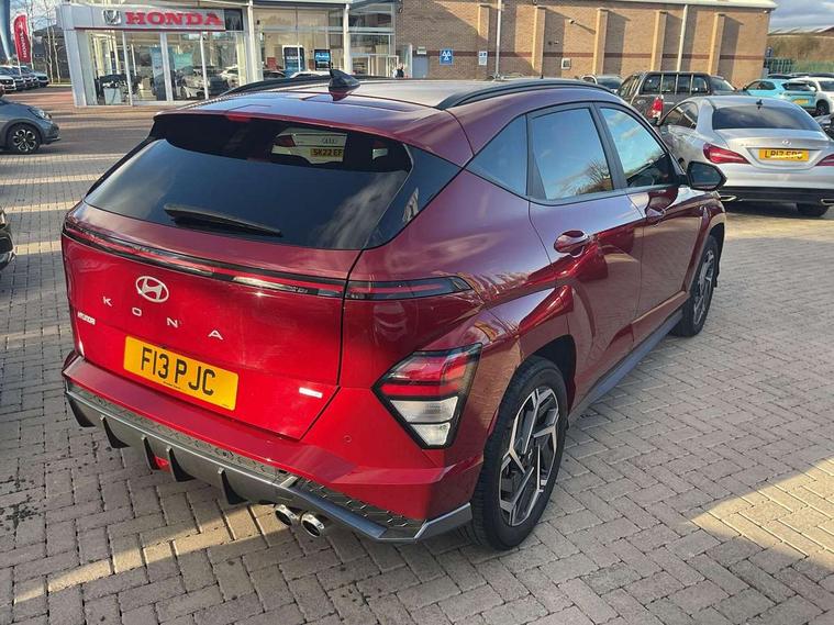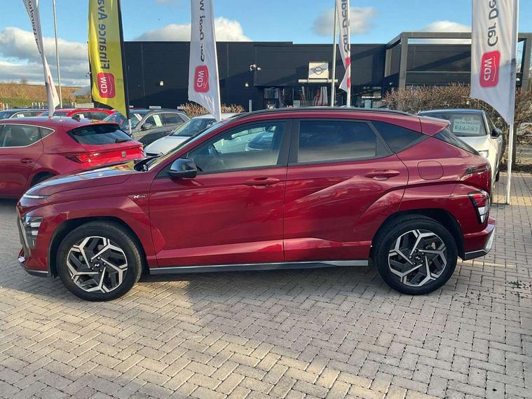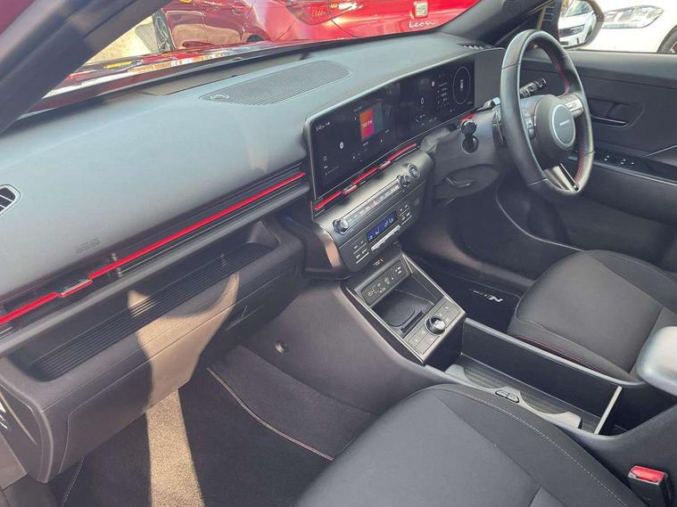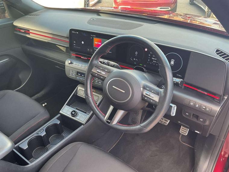 12.3" touchscreen centre console display satellite navigation with bluelink, live services and mapcare, Bluetooth connectivity with voice recognition, Digital clock, Driver status monitor (DSM), Driver supervision instrument cluster with 12.3" LCD display, eCall emergency call system, Feature on demand - Enabled, Forward collision avoidance assist (FCA 1.5) - Car, pededstrian, cycle and junction turning, Front parking sensor, HDA - Highway Drive Assist Level 1.5, Height adjustable power tailgate, Intelligent speed limit assist, Lane follow assist, Lane keep assist, Leading vehicle departure alert (LVDA), Parking system with rear camera and guidance system, PAS, Rear parking sensor, Roadside assistance, Smart cruise control with stop and go functionality, Smartphone integration compatible with Apple CarPlay and Android Auto, Windscreen washer fluid sensor and warning indicator, Wireless phone charging pad, 2 front USB C and 2 rear USB C charging points, DAB Digital radio, Speakers - Front, rear and tweeters, Steering wheel audio, phone and cruise controls, Auto dimming rear view mirror, Automatic headlights with dusk sensor, Automatic windscreen wipers with rain sensor, Body colour bumpers, Body colour exterior door handles, Body coloured wheel arch inserts, Door mirror LED indicator lights, Electric front windows with anti-trap mechanism and one touch control, Electric rear windows, Electrically adjustable and heated door mirrors, Full LED MFR headlights, Gloss black door mirrors, LED daytime running lights, LED upper and lower rear lights, Power folding door mirrors, Privacy glass - Rear windows and tailgate, Rear roof spoiler with integrated LED brake light, Rear side wing doors, Rear wiper, Roof rails, Solar glass with front door glass and windscreen, Tinted glass in front and rear doors, Windscreen auto defog function, 12V power outlet in front console, 2 zone climate control, 3 seat bench in 2nd row, 40/20/40 split folding rear seat, Adjustable head restraints, Aluminium pedals, Ambient lighting, Driver and passenger front seat pockets, Driver's seat lumbar support, Driver/passenger manual seat height adjustment, Driver/passenger sunvisors and illuminated vanity mirrors, Floor mats, Heated front seats, Heated rear seats, Heated steering wheel, Height/reach adjustable steering column, Isofix rear child seat fastenings, Leather wrapped steering wheel, LED centre interior light, LED front interior light, Luggage compartment LED lighting, Luggage shelf, Metal paint effect interior door handles, N Line cloth upholstery, Parcel shelf, Rear centre armrest, Rear centre console with air vents, Shift by wire SBW, Single front passenger seat, Vertical adjustment rear head restraints, N Line exterior design pack - Kona, Trailer wiring package - Kona, Airbag - front, front side, curtain and centre front airbag, Anti-lock brake system (ABS), Childproof rear door locks, Downhill brake control, EBD + Brake Assist, Electric parking brake, Electronic stability control, Fasten seatbelt reminder, Fixed 3 point for second row centre passenger seatbelt, Front seatbelt pretensioners, Height adjustable front seatbelts, Hill start assist control (HAC), Passenger airbag deactivate switch, Rear seat alert, Traction control, Tyre pressure monitoring system, Alarm/immobiliser, Deadlocks, Folding key, Locking wheel nuts, Remote central locking, Smart key with keyless entry and engine start/stop button, Five year annual vehicle health checks, Temporary mobility kit (TMK),