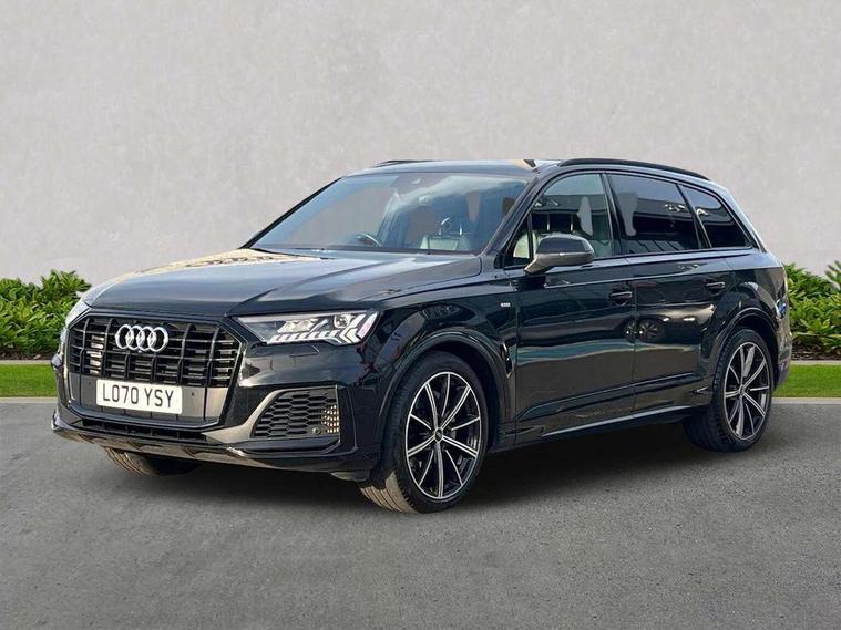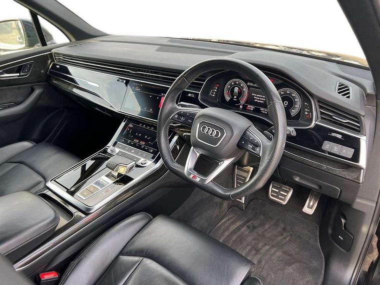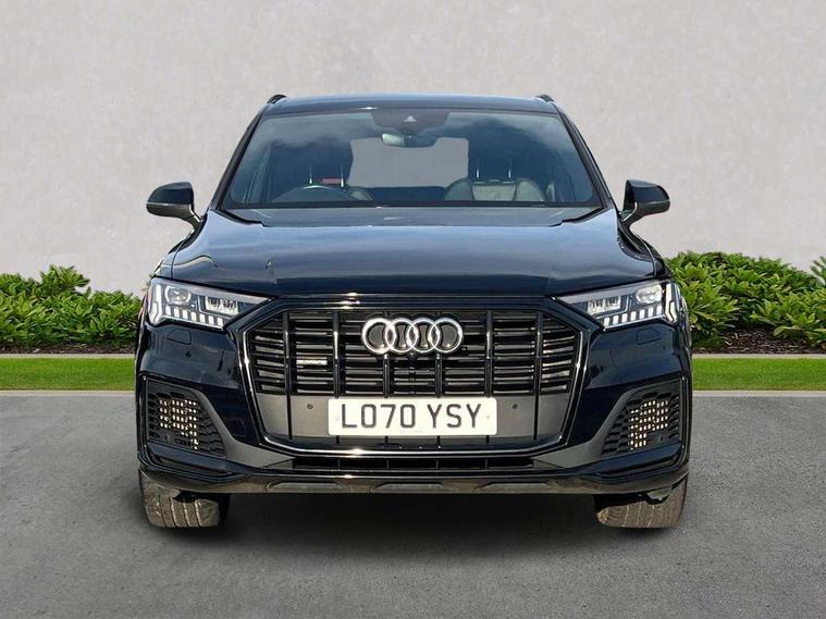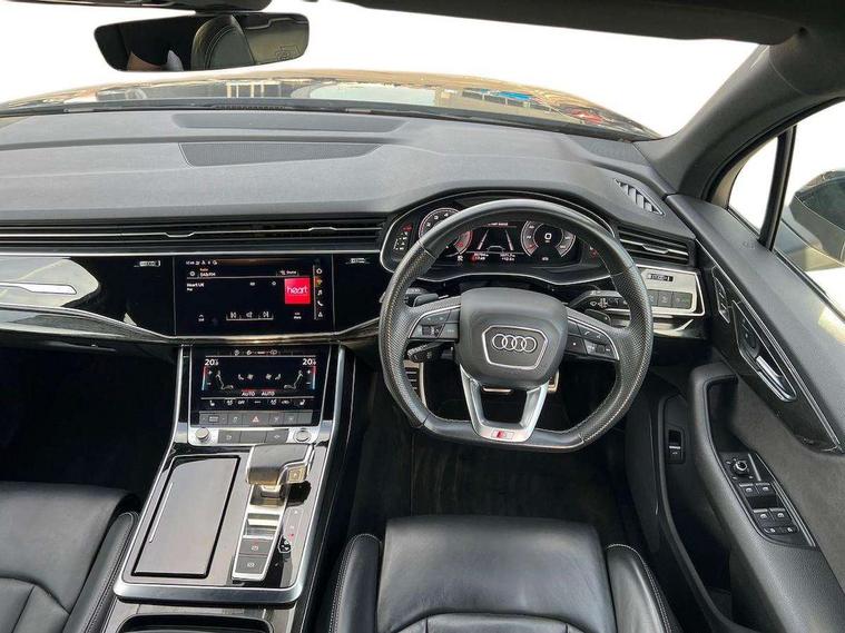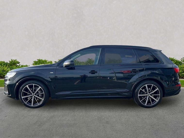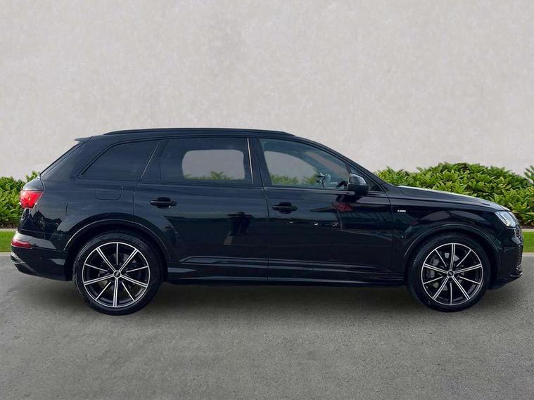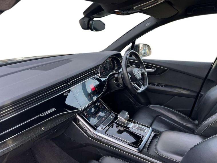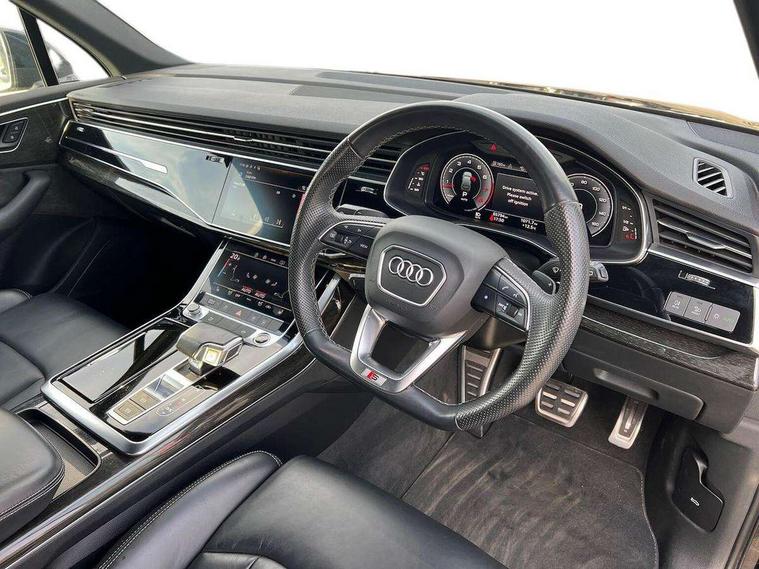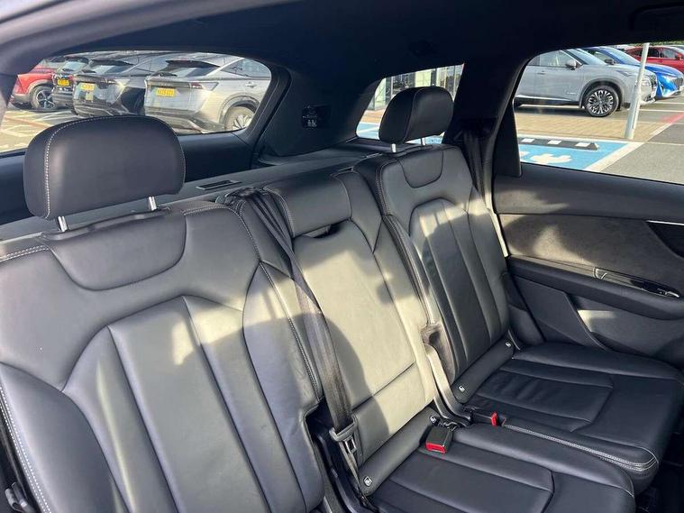 Audi connect safety and service (e-call), Audi drive select (Auto, Comfort, Dynamic, Efficiency, Individual, Off-road and All road), Audi phone box with wireless charging, Camera based traffic sign recognition, Electromechanical steering, MMI navigation plus with MMI touch screens includes 10.1" and 8.6" screens with haptic feedback, Natural voice recognition, Parking system plus - front + rear sensors, Power operated tailgate, Rear view camera, Smartphone interface includes wireless Apple carplay/Android Auto, Start/stop system, 48V Mild hybrid technology, 85 litre fuel tank, Adaptive air sports suspension, Quattro all wheel drive with self locking centre differential, Audi music interface - front 2 USB-C ports with charger and data functions, Audi sound system with 6 channel amplifier, 180 watt amplifying capacity and 10 loudspeakers including subwoofer, DAB digital radio module, Audi matrix LED headlights with dynamic front and rear indicators, Auto dimming frameless rear view mirror, Black roof rails, Bumpers in contrast paint scandium grey finish includes door trim and wheel arch trim strips, inlays in door strip contain quattro embossing, Electrically adj heated/folding + automatically dimming exterior mirrors with memory + automatic kerb side function for passenger side exterior mirror, Heat insulating glass in windshield, Integrated LED indications in door mirrors, LED daytime running lights, LED rear tail lights, Privacy glass - dark tinted rear and rear side windows from B-pillar backwards, 4 zone deluxe automatic climate control, 7 seat layout with ISOFIX points for the front passenger seat and rear passenger seat, Comfort front centre armrest, Folding rear seats, Front head restraints, Front/rear floor mats, Heated front seats, LED interior ambient lighting, Luggage compartment cover, Luggage compartment sill protection in stainless steel, Rear head restraints, Stainless steel pedals, Titanium black styling pack - Q7/SQ7, 3 point seatbelts on all rear seats, Audi pre sense front, Driver and front passenger, front side and curtain airbags, Electromechanical parking brake, Electronic Stabilisation Control (ESC) including ABS, ASR and EDL, Extended pedestrian protection measures, Hill hold assist, Seatbelt monitoring, Tyre pressure loss indicator, Warning triangle and first aid kit, Anti theft alarm, Anti-theft wheel bolts and wheel loosening detection, Keyless go with remote central locking, Polished oak trim with grey finish inlay, Tool kit, Tyre repair kit,