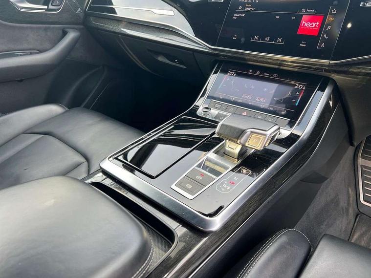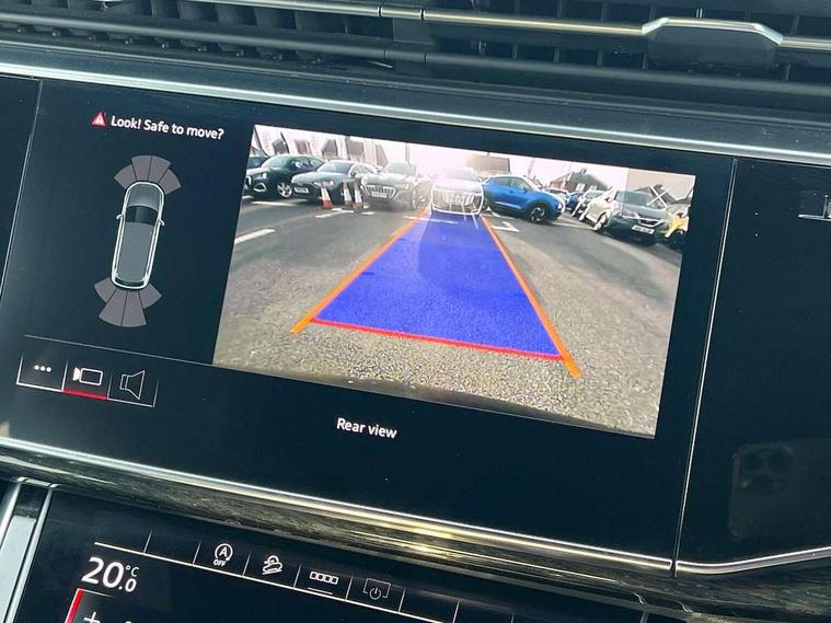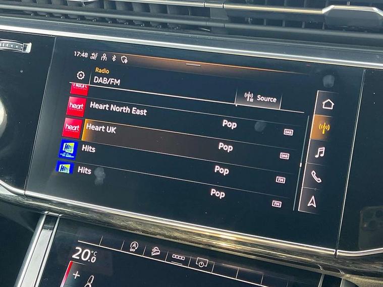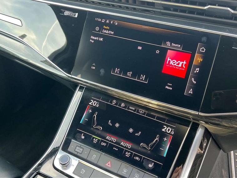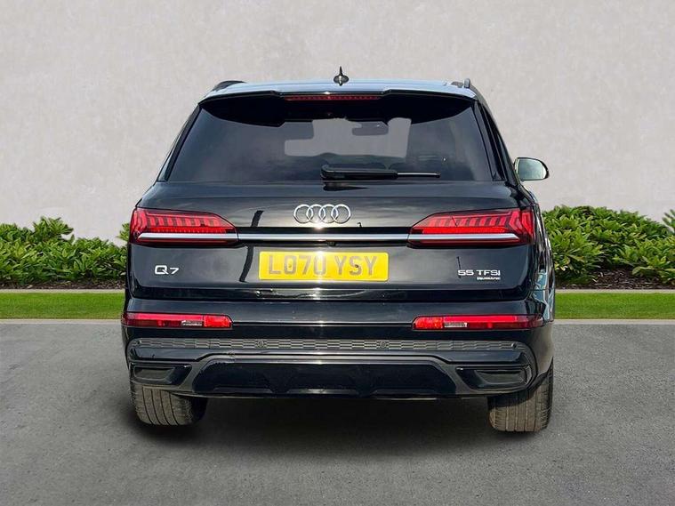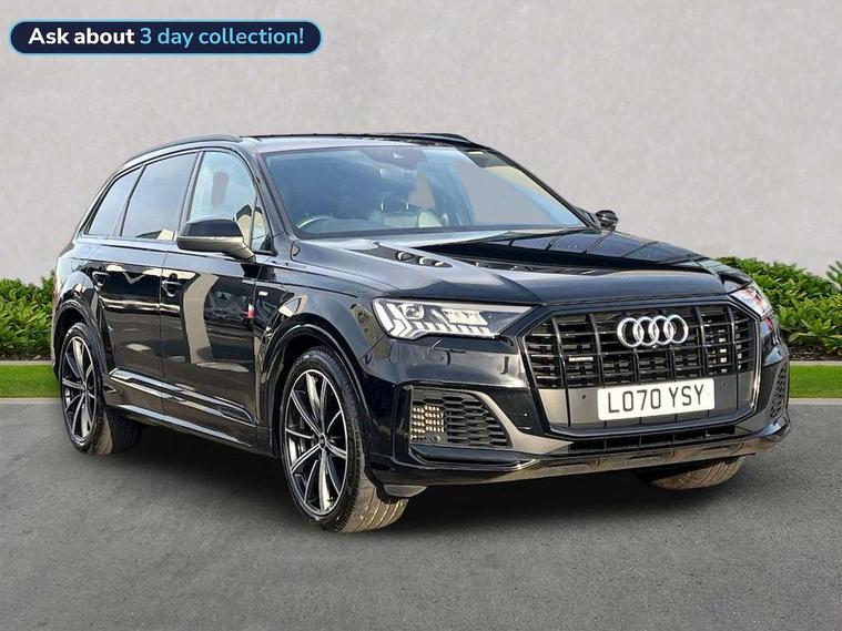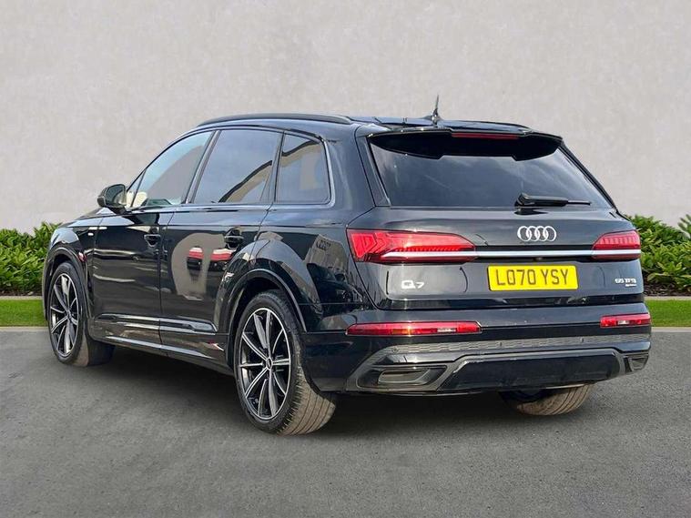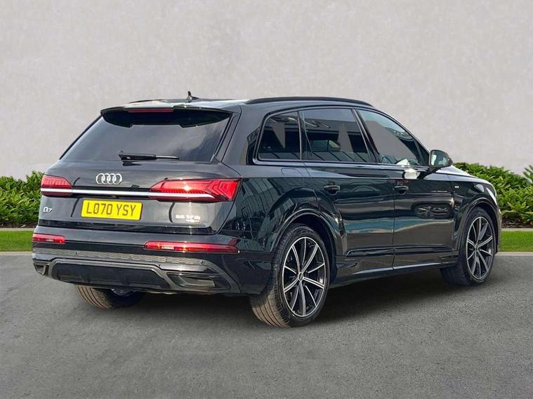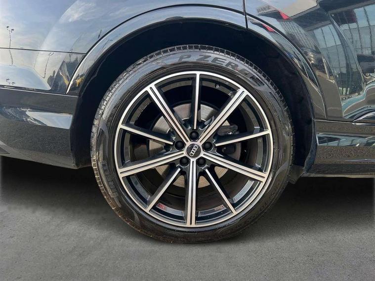 Audi connect safety and service (e-call), Audi drive select (Auto, Comfort, Dynamic, Efficiency, Individual, Off-road and All road), Audi phone box with wireless charging, Camera based traffic sign recognition, Electromechanical steering, MMI navigation plus with MMI touch screens includes 10.1" and 8.6" screens with haptic feedback, Natural voice recognition, Parking system plus - front + rear sensors, Power operated tailgate, Rear view camera, Smartphone interface includes wireless Apple carplay/Android Auto, Start/stop system, 48V Mild hybrid technology, 85 litre fuel tank, Adaptive air sports suspension, Quattro all wheel drive with self locking centre differential, Audi music interface - front 2 USB-C ports with charger and data functions, Audi sound system with 6 channel amplifier, 180 watt amplifying capacity and 10 loudspeakers including subwoofer, DAB digital radio module, Audi matrix LED headlights with dynamic front and rear indicators, Auto dimming frameless rear view mirror, Black roof rails, Bumpers in contrast paint scandium grey finish includes door trim and wheel arch trim strips, inlays in door strip contain quattro embossing, Electrically adj heated/folding + automatically dimming exterior mirrors with memory + automatic kerb side function for passenger side exterior mirror, Heat insulating glass in windshield, Integrated LED indications in door mirrors, LED daytime running lights, LED rear tail lights, Privacy glass - dark tinted rear and rear side windows from B-pillar backwards, 4 zone deluxe automatic climate control, 7 seat layout with ISOFIX points for the front passenger seat and rear passenger seat, Comfort front centre armrest, Folding rear seats, Front head restraints, Front/rear floor mats, Heated front seats, LED interior ambient lighting, Luggage compartment cover, Luggage compartment sill protection in stainless steel, Rear head restraints, Stainless steel pedals, Titanium black styling pack - Q7/SQ7, 3 point seatbelts on all rear seats, Audi pre sense front, Driver and front passenger, front side and curtain airbags, Electromechanical parking brake, Electronic Stabilisation Control (ESC) including ABS, ASR and EDL, Extended pedestrian protection measures, Hill hold assist, Seatbelt monitoring, Tyre pressure loss indicator, Warning triangle and first aid kit, Anti theft alarm, Anti-theft wheel bolts and wheel loosening detection, Keyless go with remote central locking, Polished oak trim with grey finish inlay, Tool kit, Tyre repair kit,