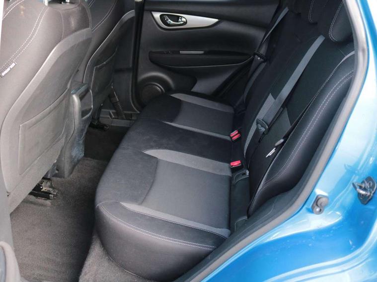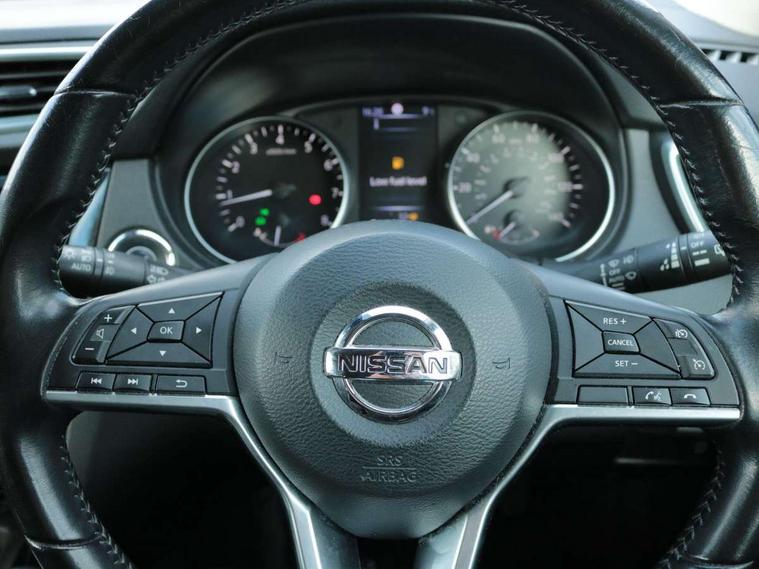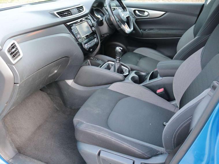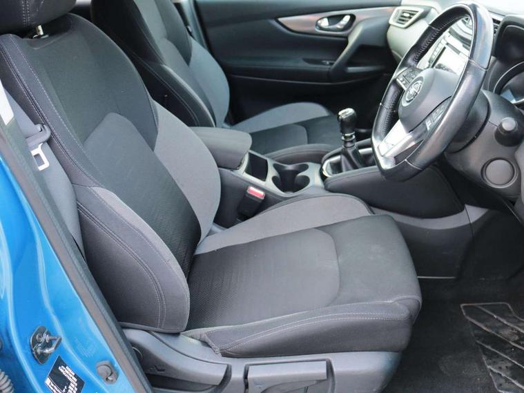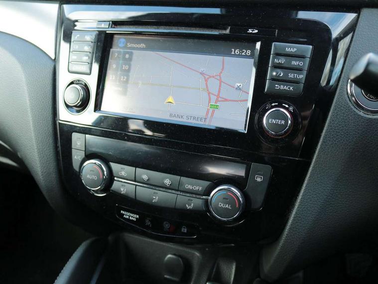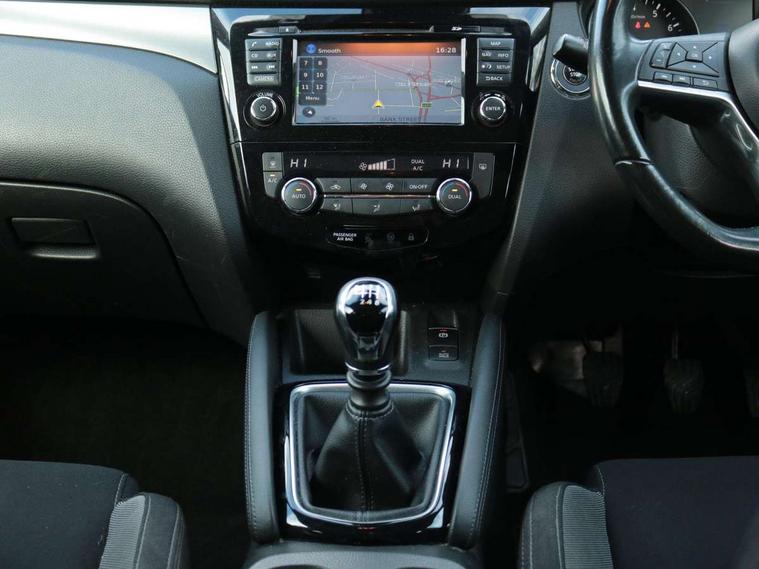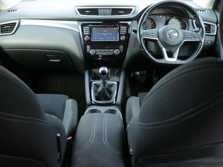 5" TFT driver information centre, Around View Monitor, Bluetooth phone integration system, Cruise control, Electric speed sensitive power steering, Front and rear parking sensors, Lane departure warning system, Nissan connect sat nav system, Outside temperature display, Push button starter, Rear view camera, Service interval indicator, Speed limiter, Traffic sign recognition, Trip computer, 'Shark fin' mobile antenna, 6 speakers, DAB Digital radio, Radio/CD, Smartphone apps, Steering wheel mounted audio controls, USB/aux input socket, Automatic headlamp activation, Body colour bumpers, Body colour door handles, Body colour door mirrors, Chrome window surround, Electric folding and heated door mirrors, High beam assist, Interior mirror with auto anti dazzle, LED indicators in door mirrors, Matt silver roof rails, One touch electric front/rear windows, Privacy glass, Rain sensor windscreen wipers, Rear roof spoiler, Rear wiper, 2 X front 12v power sockets, 60/40 split folding rear seat, Ambient interior lighting, Centre console with armrest, Chrome interior door handles, Cloth upholstery, Configurable luggage board system, Driver + front passenger lumbar support, Dual zone climate control, Front and rear door pockets with bottle holders, Front headrests, Front seat belt pre-tensioners with load limiters, Height adjustable driver's seat, Height adjustable passenger seat, Illuminated electric window switch, Isofix child seat preparation, Leather gearknob, Leather interior door handles, Leather knee rest, Leather steering wheel, Luggage compartment lighting, Parcel shelf, Pollen filter, Rake/reach adjustable steering wheel, Rear headrests, ABS, brake assist and EBD, Child locks on rear doors, Curtain airbags, Driver/front passenger airbag, Electronic parking brake, ESP + traction control, Forward emergency braking, Front passenger airbag deactivation, Height adjustable front seatbelts, Hill start assist, Seatbelt warning, Side airbags, Three 3 point rear seatbelts, Tyre pressure monitoring system, Alarm, Immobiliser, Intelligent Key, Remote central locking, Piano black interior trim, 18" Bi-colour alloy wheels, Tyre puncture repair kit,