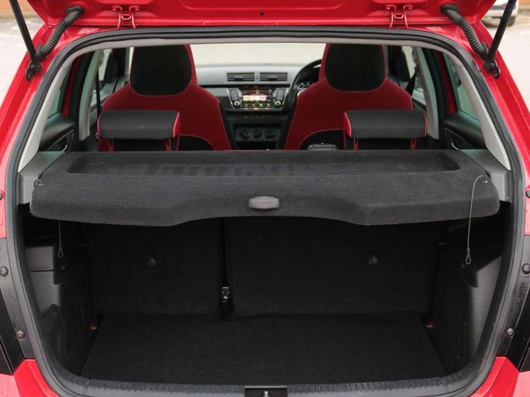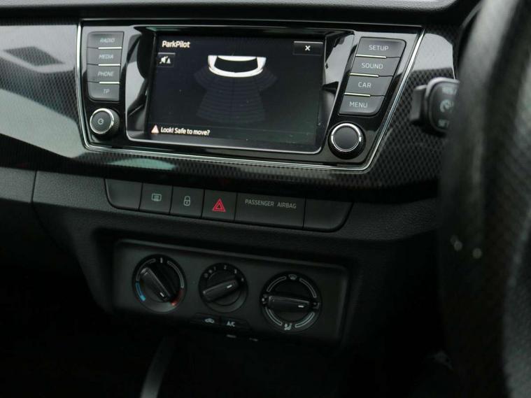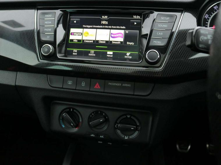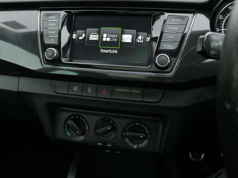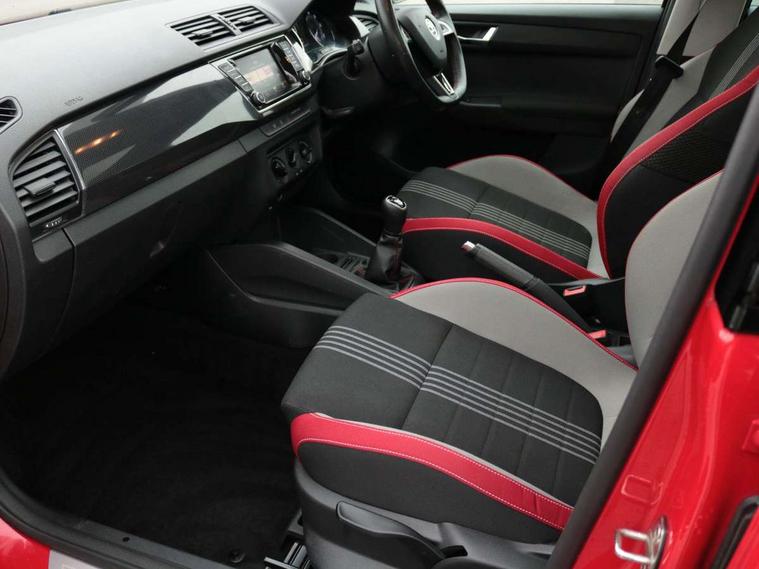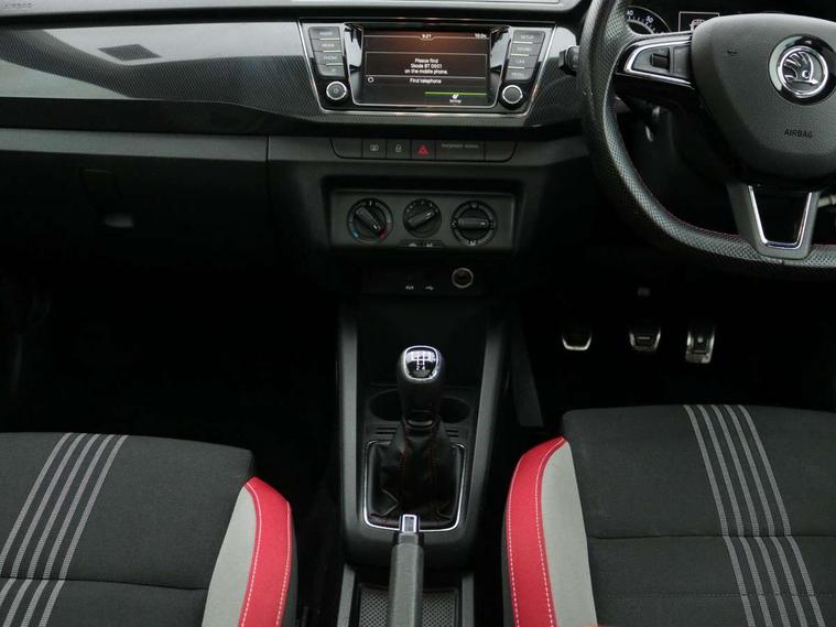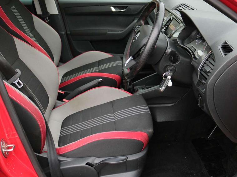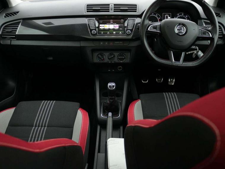Bluetooth system, Exterior temperature gauge, Front assistant collision mitigation, Maxi dot trip computer, PAS, Service interval indicator, SmartLink, Auxiliary socket for external MP3 player, Bolero radio with telephone control, Mirror Link, USB and SD card, DAB Digital radio, Black door mirrors, Black radiator grille, Body colour bumpers, Body colour door handles, Body coloured rear spoiler, Electric front windows, Electrically adjustable and heated door mirrors, Heated rear window, Height adjustable headlamps, Illuminated door sill inserts, Intermittent rear wash/wipe, LED daytime running lights, Panoramic sunroof, Sunset glass from b-pillar back, Tinted rear windows, Tinted windscreen, 1.5L bottle holder in front door panels, 2 height adjustable rear headrests, 3 spoke leather multifunction sports steering wheel with red stitching, 60/40 split folding rear seat, Boot stowage box, Cargo area storage tray, Cloth upholstery, Driver + passenger vanity mirrors, Floor mats with red stitching, Folding grab handles, Front reading lights, Front sports seats, Height adjustable driver's seat, Height adjustable front headrests, Height adjustable passenger seat, Height/reach adjust steering wheel, Interior light with delay, Leather gearshift, Leather handbrake, Lower glovebox cover, Luggage load hooks, Parcel shelf, Pearl grey carpets, Pearl grey headlining, Pollen filter, Rear courtesy light, Rear storage trays, Storage compartment under front seats, Ticket holder, Two rear outer seat isofix location points, Arkamys surround sound pack - Fabia, Chrome Pack - Fabia, 3x3 point rear seatbelts, ABS, Curtain airbags, Driver and passenger airbags, Driver and passenger side airbags, EDS, ESC with ASR, Front seatbelt pretensioners, Hydraulic Brake Assist (HBA), Passenger airbag deactivate switch, Seatbelt warning, Tyre pressure monitor, Alarm with interior monitoring, Immobiliser, Locking wheel bolts, Remote central locking, Black cube decorative insert,