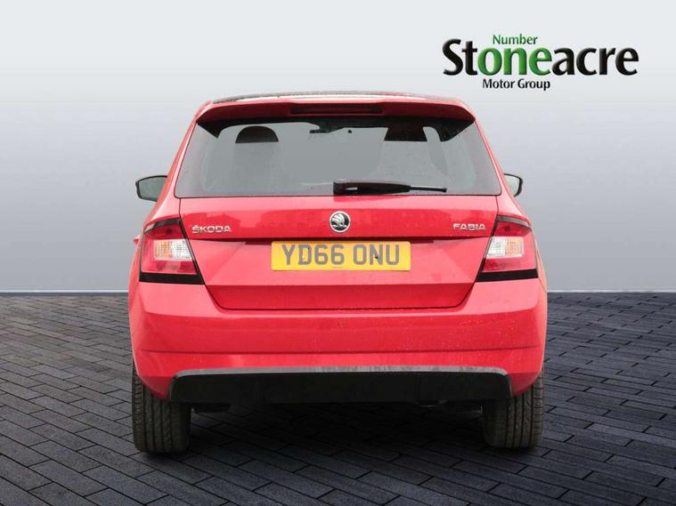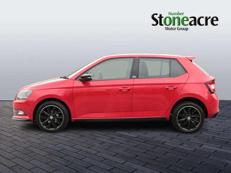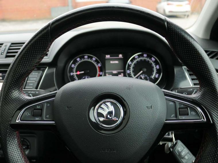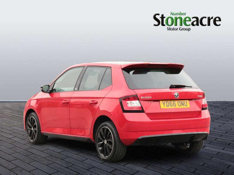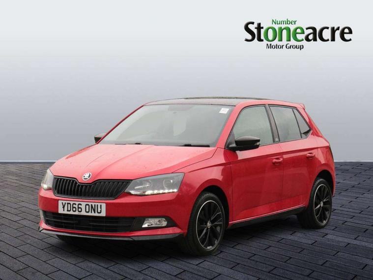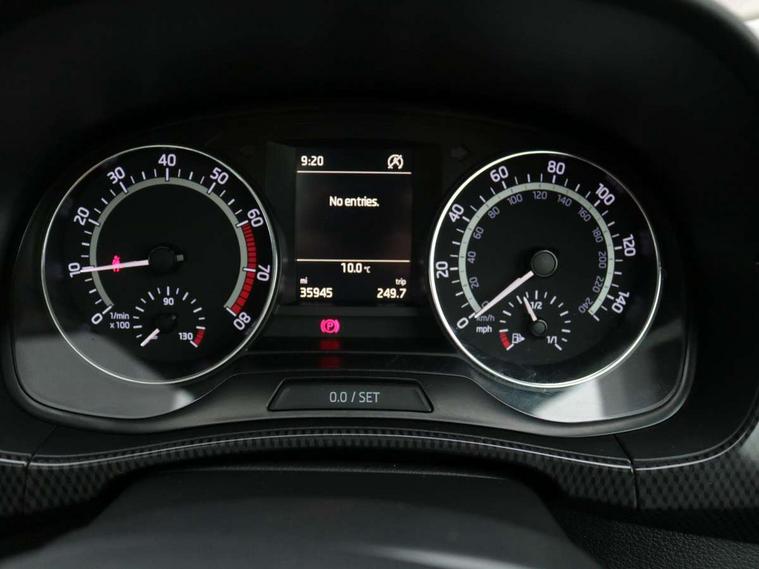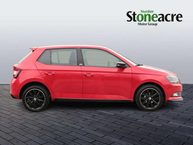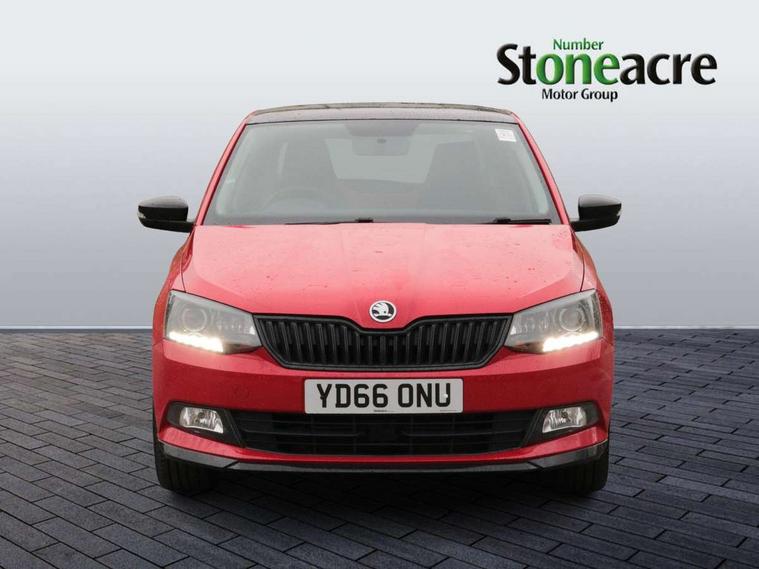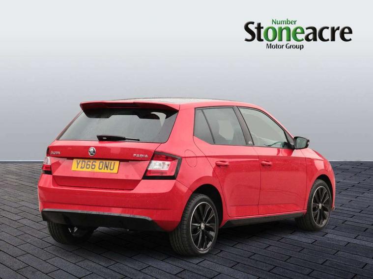 Bluetooth system, Exterior temperature gauge, Front assistant collision mitigation, Maxi dot trip computer, PAS, Service interval indicator, SmartLink, Auxiliary socket for external MP3 player, Bolero radio with telephone control, Mirror Link, USB and SD card, DAB Digital radio, Black door mirrors, Black radiator grille, Body colour bumpers, Body colour door handles, Body coloured rear spoiler, Electric front windows, Electrically adjustable and heated door mirrors, Heated rear window, Height adjustable headlamps, Illuminated door sill inserts, Intermittent rear wash/wipe, LED daytime running lights, Panoramic sunroof, Sunset glass from b-pillar back, Tinted rear windows, Tinted windscreen, 1.5L bottle holder in front door panels, 2 height adjustable rear headrests, 3 spoke leather multifunction sports steering wheel with red stitching, 60/40 split folding rear seat, Boot stowage box, Cargo area storage tray, Cloth upholstery, Driver + passenger vanity mirrors, Floor mats with red stitching, Folding grab handles, Front reading lights, Front sports seats, Height adjustable driver's seat, Height adjustable front headrests, Height adjustable passenger seat, Height/reach adjust steering wheel, Interior light with delay, Leather gearshift, Leather handbrake, Lower glovebox cover, Luggage load hooks, Parcel shelf, Pearl grey carpets, Pearl grey headlining, Pollen filter, Rear courtesy light, Rear storage trays, Storage compartment under front seats, Ticket holder, Two rear outer seat isofix location points, Arkamys surround sound pack - Fabia, Chrome Pack - Fabia, 3x3 point rear seatbelts, ABS, Curtain airbags, Driver and passenger airbags, Driver and passenger side airbags, EDS, ESC with ASR, Front seatbelt pretensioners, Hydraulic Brake Assist (HBA), Passenger airbag deactivate switch, Seatbelt warning, Tyre pressure monitor, Alarm with interior monitoring, Immobiliser, Locking wheel bolts, Remote central locking, Black cube decorative insert,
