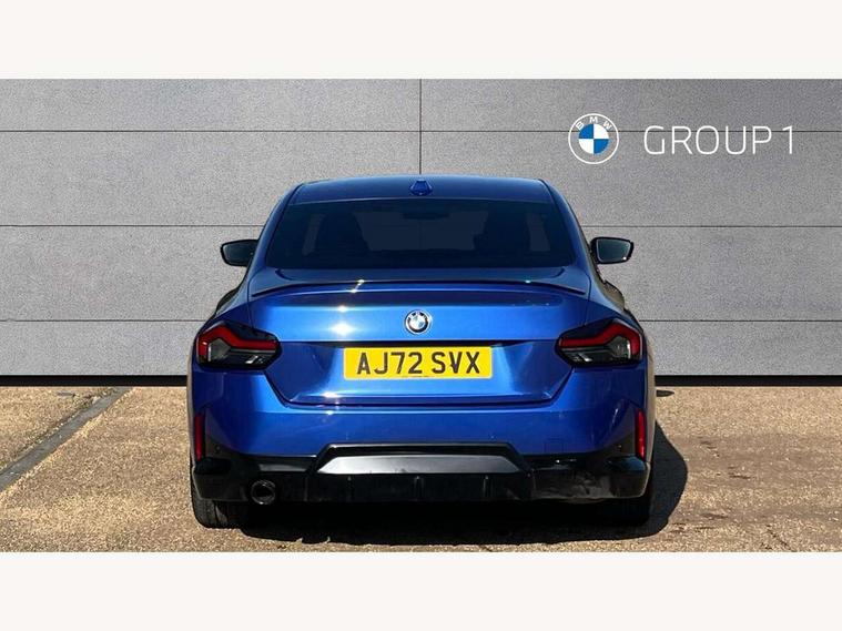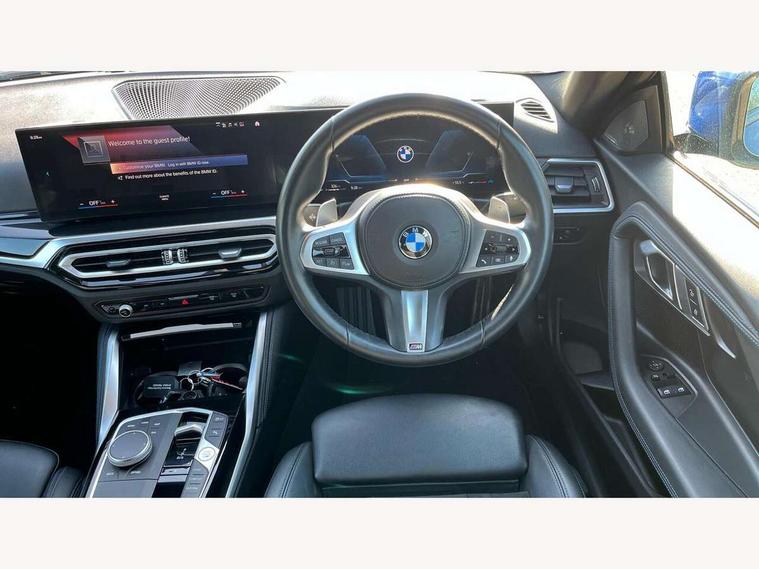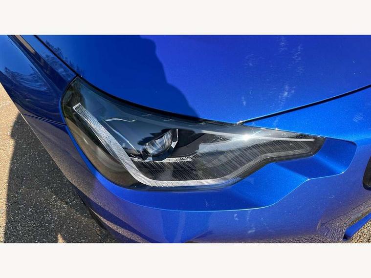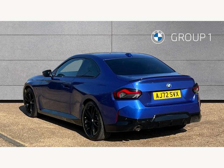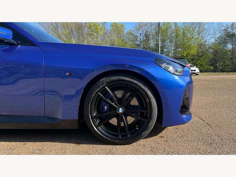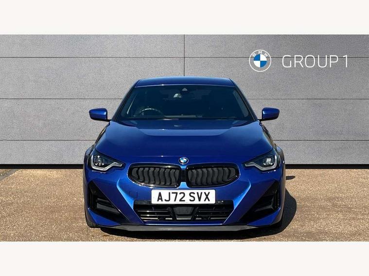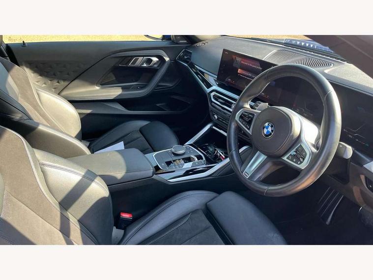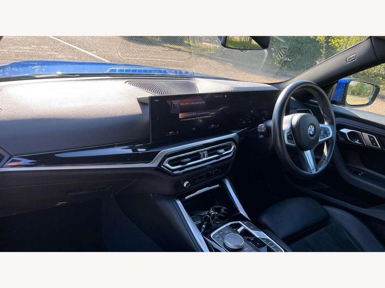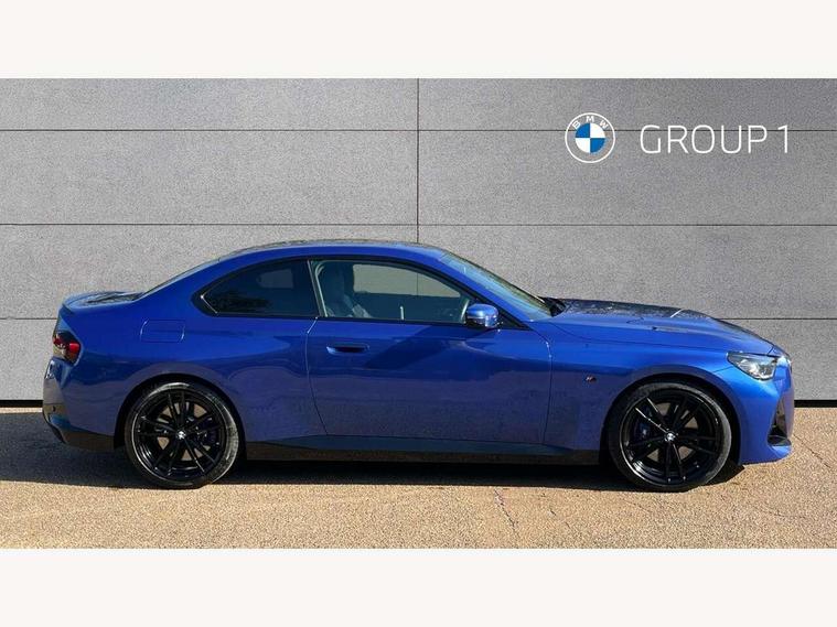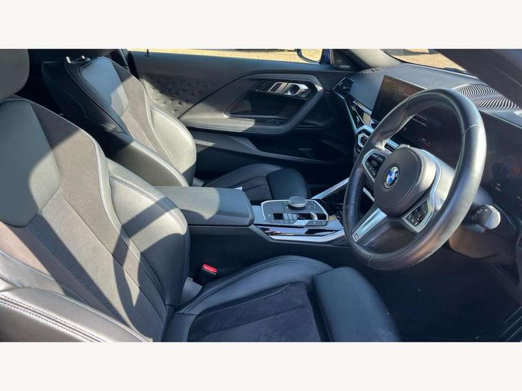 Attentiveness assist, Auto start-stop, Bluetooth, BMW ConnectedDrive online services, BMW Teleservices, Check Control warning system for monitoring of lights and door/luggage compartment open warning, Direct selection buttons, Drive off assistant, Eco pro mode, Electric power steering, Front and rear parking sensors, Front/rear Parking distance control, iDrive controller with turn and press function, Integrated owners handbook, Intelligent functions, Live cockpit plus with nav function 12.3" instrument cluster and 14.9" centre display, Oil sensor for level and grade, Optimum shift indicator, Personal Profile, Touch operation on control display, Variable sport steering, Widescreen multi-media display, 48V Mild hybrid technology, Aluminium lightweight construction, Balancer shaft, BMW TwinPower Turbo four-cylinder diesel engine, Common rail direct injection and one turbocharger, Diesel particulate filter, Drive performance control with ECO PRO comfort + sport mode, Electronic differential lock, M sport suspension, Oxidation catalytic converter, Selective catalytic reduction (SCR) with AdBlue, Sport automatic steptronic transmission with gearshift paddles, manual gearshift time display, launch control, coasting idle ECO PRO/COMFORT modes, DAB tuner, Acoustic windscreen wipers for reduced driving noise, Adaptive LED Headlights, Automatic windscreen wipers and automatic headlight, Automatically dimming rear view mirror, Body colour door handles flush with door surface, Body colour door mirrors, Body colour front and rear bumpers, Daytime running lights, Electric windows - front and rear, with open/close fingertip control and trap release, Exhaust tailpipe - 90mm in left, Fading support, Front and rear bumper system with replaceable deformation elements, Front door sill finishers in black plastic with BMW designation, Front windscreen wipers with integrated washer jets, Green tinted heat protection glazing, High beam assistant, High gloss shadowline exterior trim in mirror triangle cover, mirror cover panel, mirror bezel and window border, High level third brake light, Indicators integrated int mirror housing, LED registration plate light, LED technology rear tail lights, brake lights and turn indicators, Lightweight engineering, Model designation on right side of tailgate, One piece kidney grille with hight gloss chrome surround, Rear boot, Rear fog lights, Reversing light in rear light cluster, Shark fin antenna, Single part LED rear lights with smoked glass components, Trailer stabilisation logic, Visible VIN plate, 12V power socket in front centre console with blanking plug, 2 cupholders in front centre console, 3 zone automatic air conditioning, Ambient lighting, Compartment in front of cupholder, Conditioned based service, Driver seat backrest width adjustment, Front and rear side armrests integrated into door trim, Front armrest, Front door pockets, Front head restraints, Front sport seats, Heated front seats, Illuminated glove compartment with separate small compartment, M headliner Anthracite, M sport leather steering wheel, Manually adjustment steering wheel column, Rear seat backrest with manual 40:20:40 split folding, Rear seat centre foldable armrest with integrated cup holder, Single front passenger seat, Storage compartment between rear seats, Storage tray and compartment with cover in centre console, Sun visors with vanity mirrors and insert tab, Through loading system with 40/20/40 split folding 2 rear seat in 2nd row, Two folding rear seat headrests, Velour floor mats, Additional storage compartment pack without USB - 2 Series Coupe, Connected pack professional - 2 Series Coupe, Interior and exterior mirror pack - 2 Series Coupe, M Sport exterior styling aerodynamics pack - 2 Series Coupe, 2 tone horn, Anti lock braking system (ABS) with cornering brake control, Automatic Stability Control (ASC), BMW emergency call, Brake drying, Child seat ISOFIX attachment for the two outer rear seats, Crash sensor activating of airbags, Unlocking doors, hazard warning lights, interior light, safety battery terminal, Deactivation of fuel pump in the event of a crash, Driver and front passenger airbags, Driver and front passenger side airbags, integrated in the door side seat backrest bolsters for all seat variants, Dynamic brake control, Dynamic stability control + (DSC+), Dynamic Traction Control - DTC, Electrically operated hand brake including automatic hold function and automatic release when driving off, Front and rear disc brakes, Front passenger airbag deactivation, Head airbags for all 4 outer seats, Manual deactivation of front passenger airbag, Seat belt security check for driver and front passenger, Seatbelt warning, Side impact protection, Three point seat belts on 4 seats including front belt stopper, pyrotechnic belt tensioners and belt force limiters, Tyre pressure sensor, Warning triangle and first aid kit, Alarm system (Thatcham 1) with remote control and electronic engine immobiliser, Central locking switch for all doors, fuel filler cap and luggage compartment, Deadlocking function system to all doors, Drive away locking system on all doors and luggage compartment, Locking wheel bolts, Start/Stop button (illuminated) in centre console with keyless engine start and Auto Start-Stop deactivation button, Two remote control key with integrated key - one button for open and close doors/fuel flap/tailgate and separate button for unlock luggage compartment, BMW mobility tyre sealing system, Electrically powered 12V compressor, Reduced rolling resistance tyres,