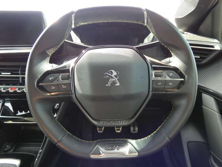 10" Capacitive colour touchscreen with connected 3D navigation, Bluetooth telephone facility, Driver attention warning, Exterior temperature indicator with ice warning, Front and rear parking sensors, Lane keep assist, Mirror screen with mirror link, apple carplay and android auto, Multi function trip computer, Passive blind spot detection, PEUGEOT i-Cockpit with compact steering wheel, PEUGEOT i-Cockpit with configurable 3D headup instrument panel, PEUGEOT SOS and assistance, Push button start, Smart phone docking station, Speed limit recognition and recommendation, Visio Park 1 with 180 degree Colour reversing camera, 2 front USB socket with USB-C, 2x USB sockets in rear, 6 speakers radio with mp3 compatible, DAB Digital radio, Voice recognition for radio, navigation and telephony features, 2 X Rear number plate lights, Automatic hazard light activation upon heavy brake application, Automatic lights, Automatic windscreen wipers, Body coloured exterior door handles, Dark tinted rear side and tailgate windows, Diamond black rear spoiler (roof), Diamond Black roof, Electric front windows + one touch + anti-pinch, Electric rear windows with one touch/anti-pinch, Electrically adjustable, heated and power folding door mirrors, Follow me home headlights, Frameless electrochrome interior rear view mirror, Front windscreen wiper with magic wash cleaning system, Full LED headlights with smartbeam assist, Gloss black finish on B pillar, Gloss black rear cluster connecting strip, Gloss black wheel arch extensions, Gloss black window surround, GT Line model designation badging on C pillar, GT Line model designation badging on tailgate, Headlights left on audible warning, LED daytime running lights with 3 claw headlight with distinctive tooth design, LED side indicator lights integrated into door mirrors, Model designation badges front and rear, Nera black door mirror shells, Radiator grille - Dark chrome chequered and gloss black edge trim, Rear bumper with gloss black finish, Rear full LED 3D peugeot signature claw effect lights with daylight function, Rear lower bumper diffuser effect trim in gloss black, Rear reversing lights, Rear windscreen wiper triggered automatically in reverse gear, Stainless steel door sill scuff plates, Tailgate with heated rear windscreen and wiper blade, Twin chrome exhaust tailpipes, 1/3 to 2/3 split folding rear seats, 12V socket, 8 Colour personalisable ambient lighting, Aluminium pedals and foot rest, Driver and front passenger seat manual adjustment in longitudinal and back rest angle, Driver and front passenger seat mechanical height adjustment, Driver and front passenger sport seats, Dual zone electronic climate control, Electric power steering with reach and rake adjustable steering column, Front and rear carpet mats in black with lime green stitch detail, Front centre armrest with storage compartment, Front LED interior light with 2 reading spotlights and rear interior light with timer, High centre console with 2 cup holders, ISOFIX child seat mounting points on passenger seat, Lime green contrast stitching to armrest, front centre console, door panels and dashboard facia, Map pockets on the backs of the front seats, Mistral full grain perforated leather steering wheel with aikinite stitch detail and satin chrome 'GT' emblem, Piano keys gloss black plated toggle switches to access main functions of the vehicle, Piano keys gloss black plated toggle switches to access touchscreen functions, Roof lining - Mistral black, Satin chrome gear lever, Seatbelt unfastened on the move audible and visual alert for front and rear seats, 2x 2nd row ISOFIX child seat mountings, 3 point seatbelts on all rear seats, 3 rear 3 point seatbelts, 3x3 point rear seat belts, 3x3 point rear seatbelts, ABS (Anti-lock Braking System) with EBD (Electronic Brakeforce Distribution) and EBA (Emergency Braking Assistance), Active safety brake with night function/cyclists/pedestrians, Child locking functionality on rear doors, Driver and passenger airbags with Passenger airbag deactivation system, Driver/front passenger side airbags, Electric parking brake, ESP with Hill Assist, Front and rear curtain airbags, Front and rear disc brakes, Front optimised safety headrests and 3 x rear retractable headrests with height adjustable, Front three point retractable seatbelts with force limiters, Tyre pressure sensor, Automatic door locking when moving off, Deadlock, Electronic code immobiliser, Thatcham Cat.1 alarm, Carbon effect Dashboard, front and rear door panel finish, 17" Camden diamond cut two tone alloy wheels, Space saver spare wheel,