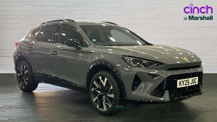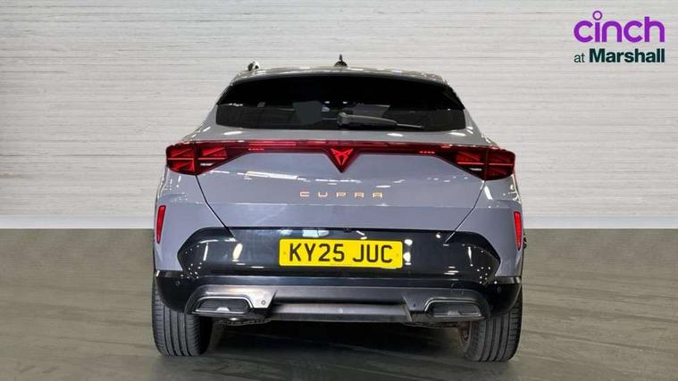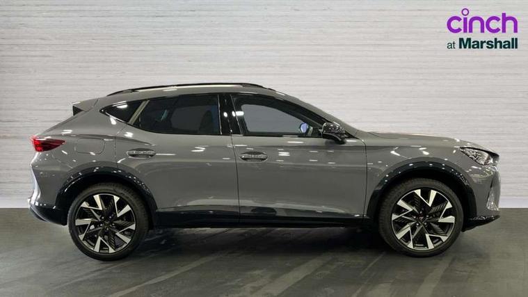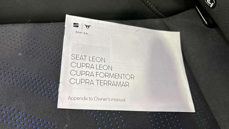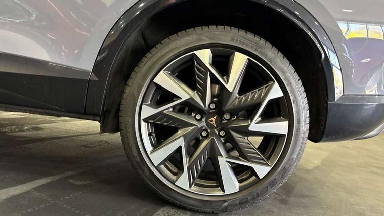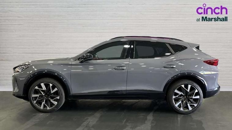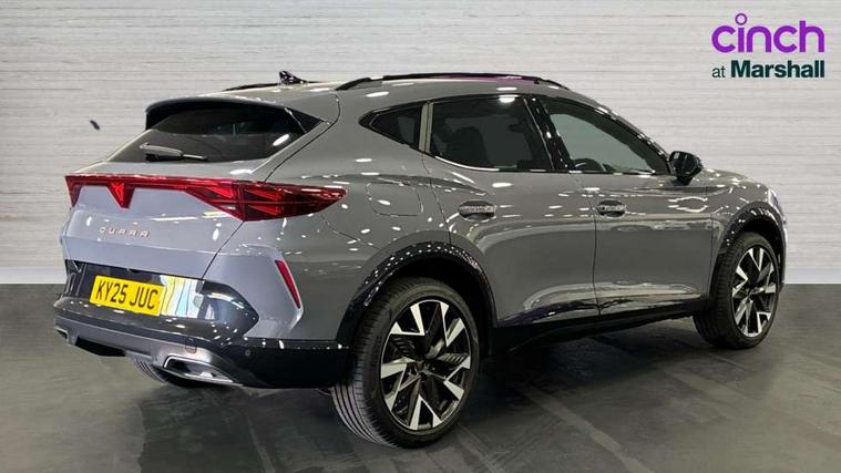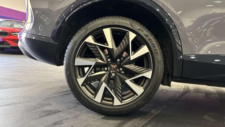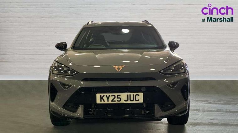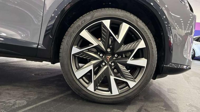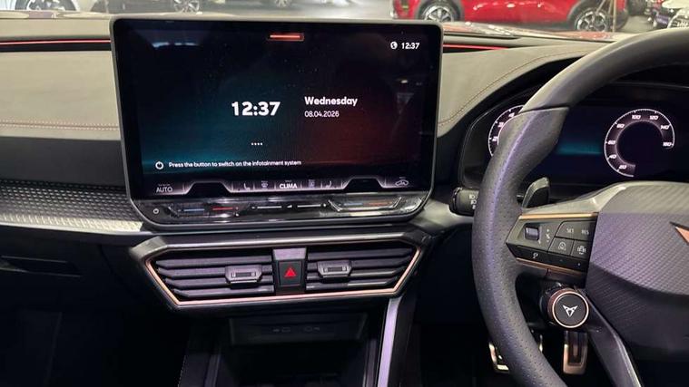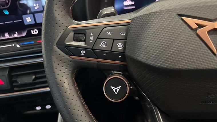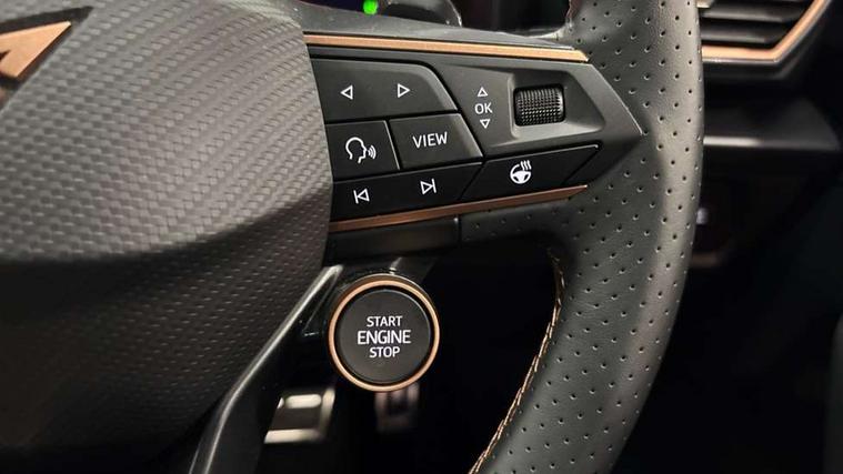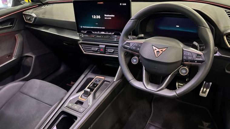 10.25" digital cockpit and configurable dashboard, Adaptive cruise control with follow-to-stop and speed limiter, Advanced driver alert system, Driving profile selection, Dynamic road sign display, Emergency steering support with turn assist, Forward collision warning with automatic braking, Front and rear parking sensors, Full link phone integration, Lane assist, Progressive steering, Rear view camera, RPM, trip computer, outside temp gauge, instrument light brightness, low fuel warning light, lights on reminder, gearshift indicator, Service interval indicator, Start/stop system with regenerative braking, Virtual pedal and electric tailgate, Voice control system, Wired Android Auto, Wireless apple carplay, Wireless phone charger, CUPRA sport suspension, Electronic locking differential and dynamic traction support, 2 front and 2 rear USB type C sockets, Media system with navigation, 12.9" touchscreen display, voice control, DAB, steering wheel mounted controls, Auto dimming rear view mirror, Body colour door handles, Body coloured bumpers, Dark grey wing mirror, Daytime running light with automatic headlight control and coming home feature, Door panel ambient lighting, Dynamic headlight range control, Electric front/rear windows, Electrically adjustable heated and folding door mirrors with memory function, Gloss black roof rails and window surrounds, High beam assist, LED 3rd brake light, LED front fog lamps with cornering function, LED Headlights, LED Taillights with dynamic indicator, Rain sensing wipers, Rear diffuser with black simulated exhaust pipes, Rear fog lights, Rear side wing doors, Rear wash/wipe, Tinted rear windows, Welcome lights (within exterior mirror housing), 12V socket, 2 front and 2 rear reading lights, 3 seat bench in 2nd row, 60/40 split rear bench seat with armrest and mechanical seat release, Black headlining, Black interior roof lining, Cupra sports pedals, Dust/pollen filter, Electrically adjustable driver's seat with memory and lumbar support, Front and rear head restraints, Front centre armrest, Heated front seats, Heated supersports multifunction leather steering wheel with satellite buttons and gear shift paddles, Height/reach adjust steering wheel, Illuminated aluminium doorsteps, Illuminated interior front door sills, Illuminated sunvisor with mirror, Isofix, Leather dashboard, door insert and side trim panel, LED smart wraparound lighting, PVC/Dinamica microfiber upholstery + bucket seats, Satellite steering wheel, Single front passenger seat, Storage pockets on rear of front seats, Three zone climate control with control panel in rear, Variable luggage/load compartment floor, 3 point seatbelts on all rear seats, ABS, Brake control system - ESC and brake booster, Child proof door locks, Driver and front passenger airbags with front passenger airbag de-activation, Electronic parking brake, Front and rear disc brakes, Front side curtain airbags, Hill hold control, Public e-call, Seat belt reminder for front and rear seats, Tyre pressure monitoring system, Anti theft alarm system, KESSY Advanced - Keyless start, keyless entry with SAFELOCK, Locking wheel bolts, Copper and aluminium interior detailing, 19" Sandstorm machined sport black and silver alloy wheels,