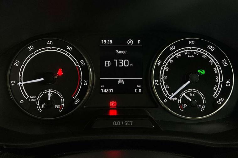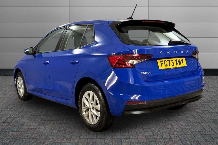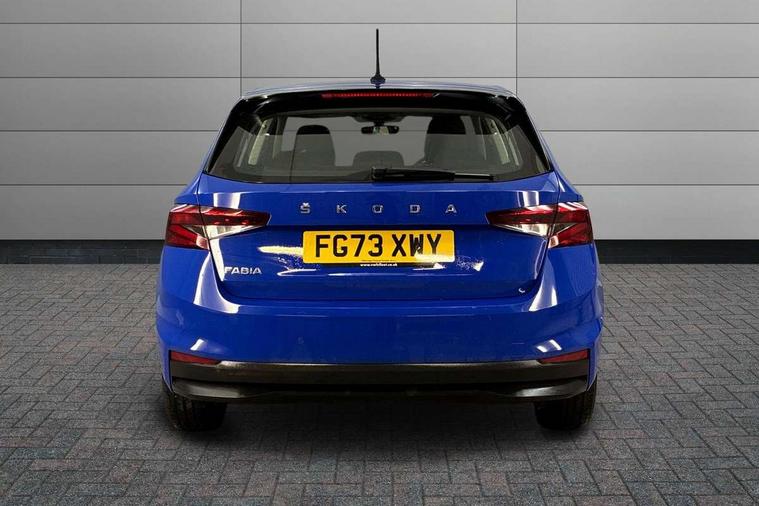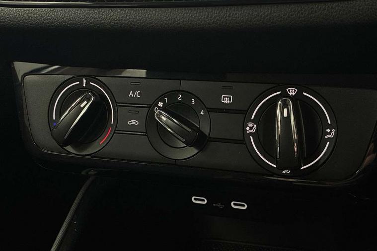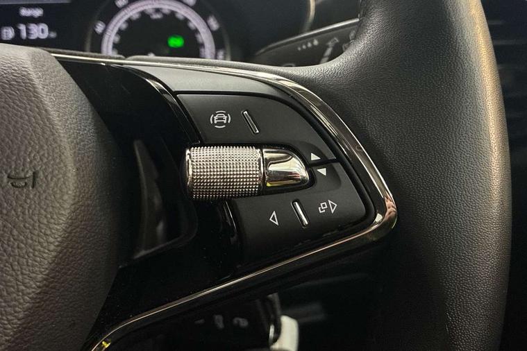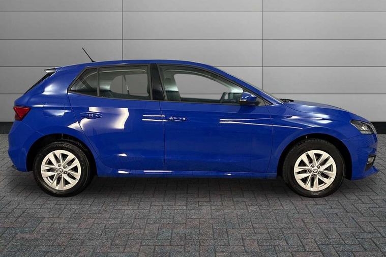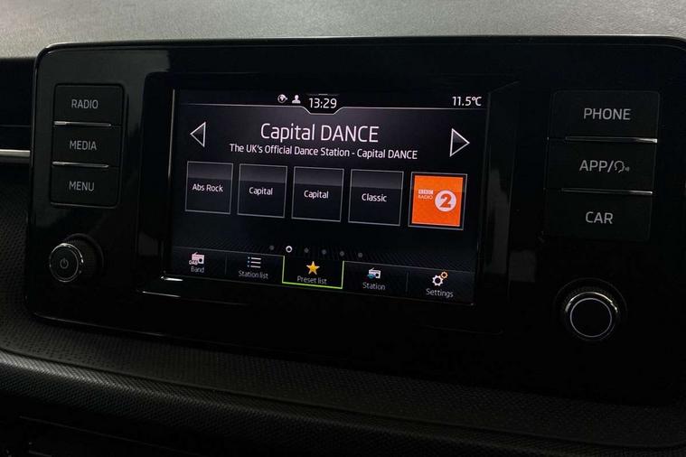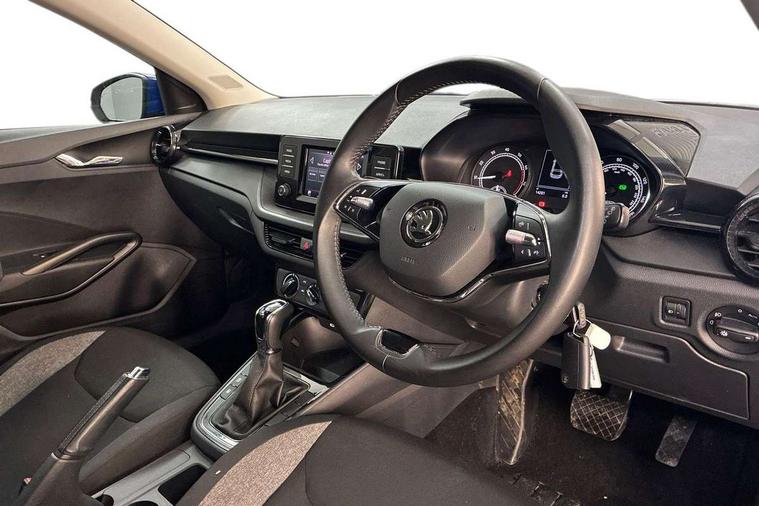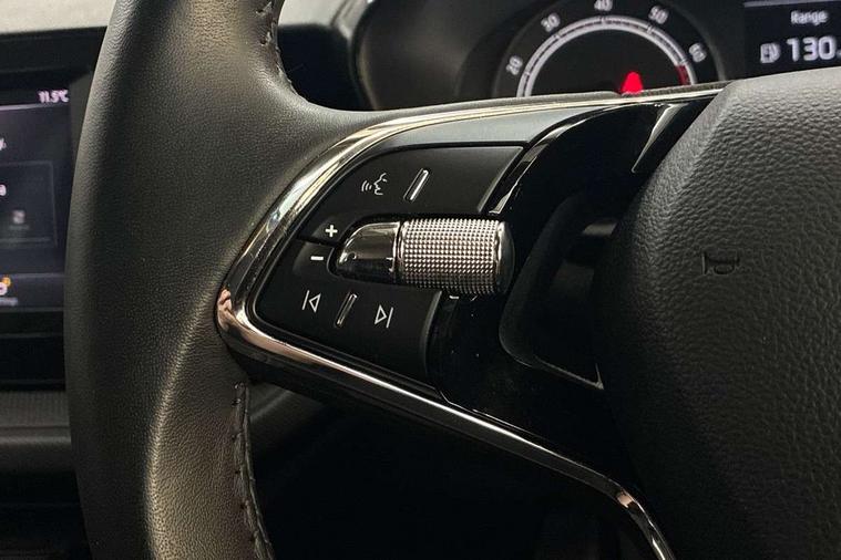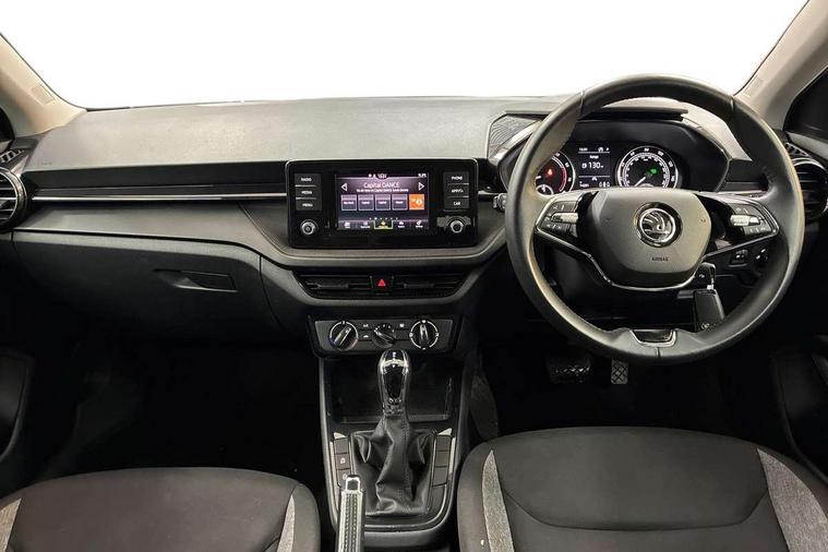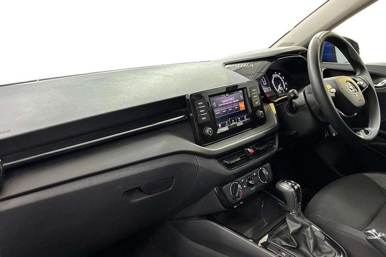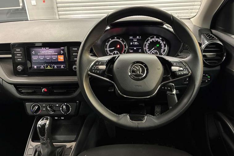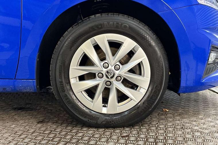 Bluetooth connection, Driver alert system - DAS, Electromechanical power steering, Exterior temperature gauge, Lane assist including road edge detection, Multifunction trip computer in black and white, Rear parking sensors, Service interval indicator, Speed limiter, 2x USB-C in the front (for data transmission and charging), 4 speakers in front, Auxiliary socket for external MP3 player, DAB digital radio reception, Radio Swing with 6.5" colour display, Basic LED Headlights, Basic rear lights, Body colour door mirrors, Body coloured bumpers, Dimming rear view mirror with black frame, Door mirror integrated indicators, Electrically adjustable and heated door mirrors, Electrically adjustable front windows with function auto up/down, Front fog lights, Front window wiper intermittent control, Headlight range control - Automatic, Ice scraper in fuel cap, LED daytime running lights with coming and leaving home feature, Mechanical adjustable rear windows, Rain sensor, Rear LED fog light, Rear side wing doors, Rear window wiper with washing nozzles, Roof mounted spoiler, SKODA tailgate lettering in chrome, Third brake light, 2 reading lights in front and 2 reading lights in rear, 2 spoke leather multifunction steering wheel, 3 rear headrests, Backrest split and folding, Central console with fixed cup holder and storage box, Chrome handbrake release button, Fabric upholstery, Gearshift knob/handle in leather, Grain satin black interior door handles, Hand brake lever handle in leather, Height adjustable front headrests, Height adjustable front seats, Height adjustable steering wheel, ISOFIX and TopTether anchorage points to the outer rear seats, ISOFIX and TopTether on the front passenger seat, Luggage compartment lighting, Manual air conditioning, Manually adjustable lumbar support in front seats, Pollen filter, Rear seat bench unsplit, Single front passenger seat, Storm grey headlining, Sun visors with mirror and airbag label on passenger side, Ticket holder, 3-point height adjustable front seats belts with pretensioner and force limiter, Automatic warning lights in case of crash, Driver and passengers airbag with switch off function, e-Call+, ESC including ABS, MSR, ASR, EDS, HBA and XDS, Front and rear seat belt warning, FRONT ASSIST (AEB City and AEB Inter Urban), Front side airbags, Head airbags, Hill hold assist, One tone horn, Pedestrian protection, Three rear 3-points safety seat belts with pretensioner and force limiter including stop function for outer rear seat belts, Tyre pressure monitoring system, Anti-theft alarm system including immobiliser, interior monitoring, backup horn, and towing protection, Central locking with radio remote control, interior controls, SAFE function and 2 foldable keys, Black painted air vents, Glossy black decorative trim, Grain satin black central console cover, Grain satin black lower decorative trim, Satin black door and side trim panel in front, Anti-theft wheel bolts protection, Super-low rolling resistance tyres,