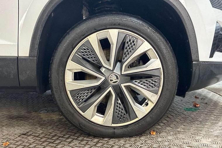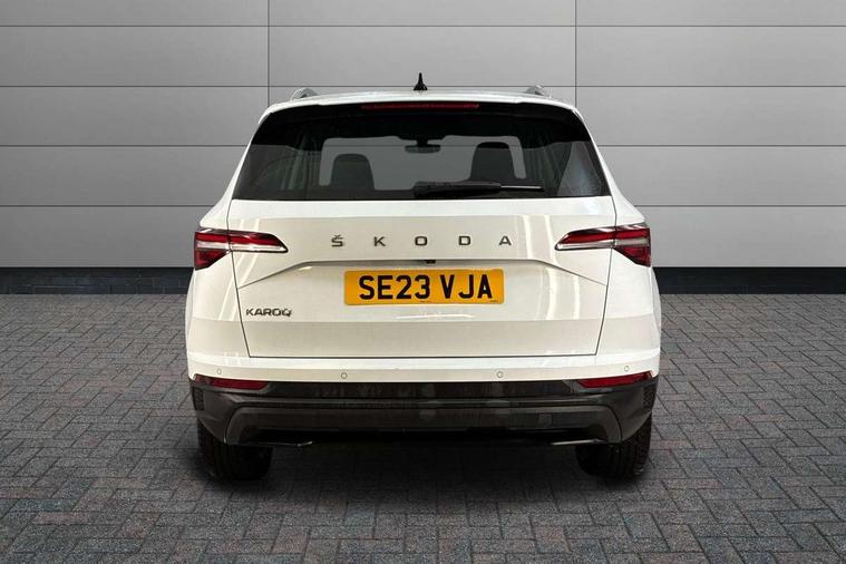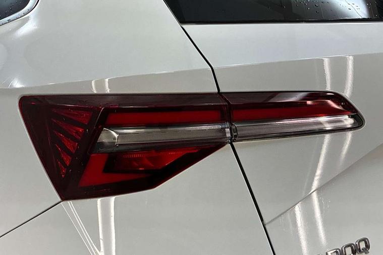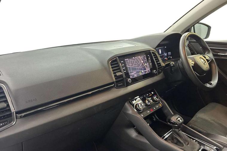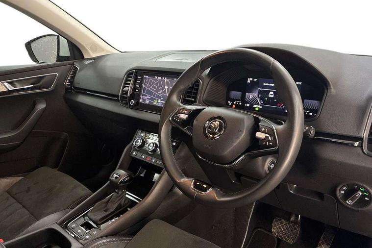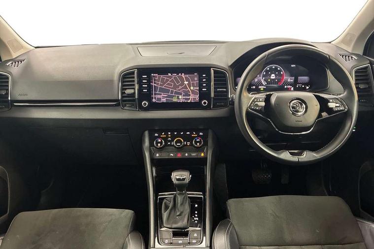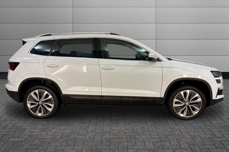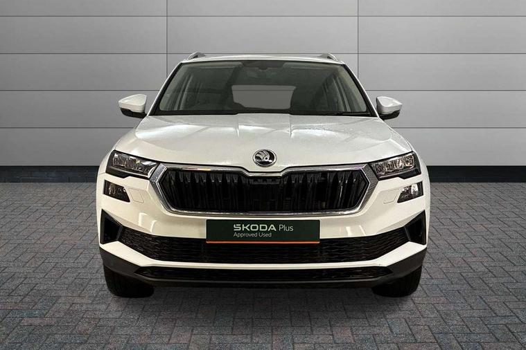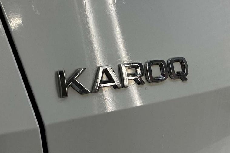 8" Digital display, Care connect, Driver fatigue sensor, Emergency services call system, Outside temperature gauge, Service interval indicator, SmartLink wireless for Apple and wired for Android, Start/stop system with regenerative braking, USB C Port x 2 in front centre console, 8 Speakers, DAB radio with Bluetooth, USB connection, Acoustic glass, Aero front windscreen wipers with intermittent function, Auto dimming rear view mirror with light and rain sensors, Black electric window control buttons, Body colour door mirrors and handles, Dynamic headlight range control with cornering light function, Electric front and rear windows with child proof lock, Heated rear windscreen, LED daytime running lights, LED rear lights with high functionality welcome effect and dynamic indicators, Light assistant (coming/leaving home/tunnel light), Plastic scuff plates, Privacy glass, Rear side wing doors, Rear spoiler, Rear window wiper with washer system and intermittent control, Safety reflectors on front doors, 1.5 litre bottle holders in driver and front passenger door panels, 12V socket in boot, 12v socket in front centre armrest with storage compartment and rear air vents, 2 spoke leather heated multifunction steering wheel with DSG paddles, 2 x Tablet holder, 3 rear height adjustable headrests, 3 seat bench in 2nd row, 4 foldable roof handles with rear coat hooks, Black floor carpet, Chrome inner door handles, Decorative door sills with KAROQ badging, Double sided boot floor, Foldable hooks in the boot, Front head restraints, Height adjustable front three point seats belts with tensioners, Height/reach adjust steering wheel, Ice scraper, Illuminated glovebox, Illuminated luggage compartment, Isofix child seat preparation for front passenger seat, Isofix child seat preparation outer rear, Manual lumbar support for front seats, Pen holder, Pollen filter, Rear boot cover, Rear reading lights, Rubbish bin door, Safety vest holder, Single front passenger seat, Storage box in upper central dashboard closed, Sunvisors with illuminated vanity mirrors, Textile floor mats, Ticket holder, VarioFlex seats with standard rear seat release, Boot pack - Karoq, Chrome roof rails + chrome pack - Karoq, Parking pack - Karoq, Automatic door unlocking in case of crash, Automatic fuel cut off in case of crash, Child locks on rear doors, Driver airbag, Electronic parking brake with auto hold function, Emergency rear braking signal, ESC including ABS, MSR, ASR, EDS, HBA, DSR, RBS, MKB and traction control, Front side airbags, Hill hold control, Knee airbags, Passenger airbag with switch-off function, Pedestrian monitor, Seatbelt reminder signalisation and pretensioner for all seats, Three point seatbelts rear, Two tone horn, Tyre pressure display, Tyre pressure monitor, Alarm with interior monitoring, back up horn and tilt sensor with safe function, Electronic engine immobiliser, Keyless entry and start/stop, Remote central locking with 2 remote folding keys, Chrome framed air vents, 18" Miran alloy wheels in black, Anti-theft wheel bolts protection, Storage on wheel cover, Tool kit,