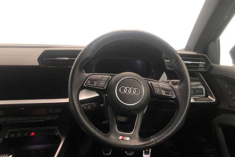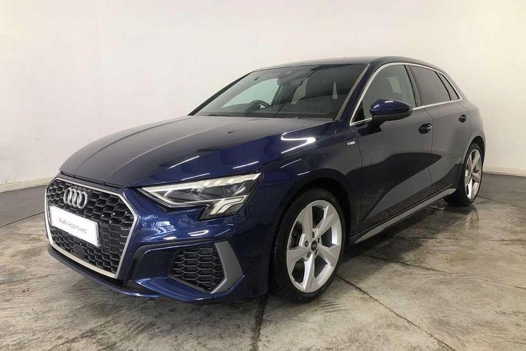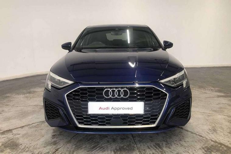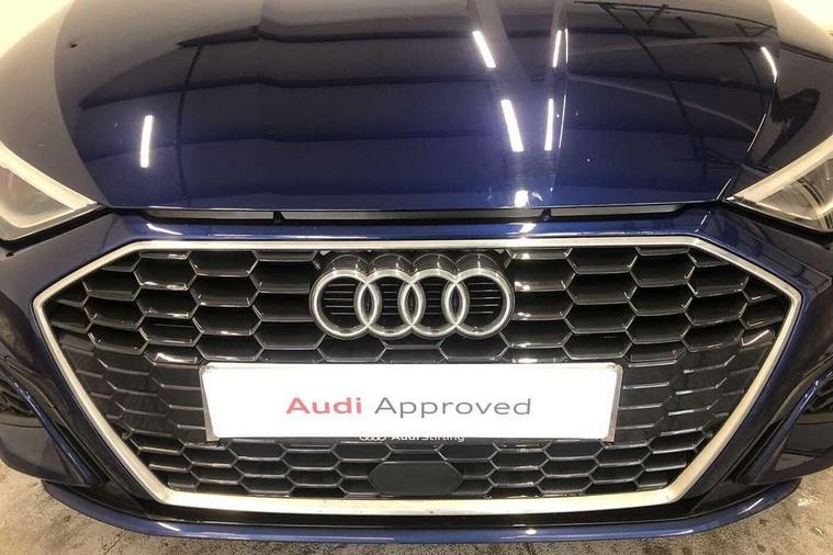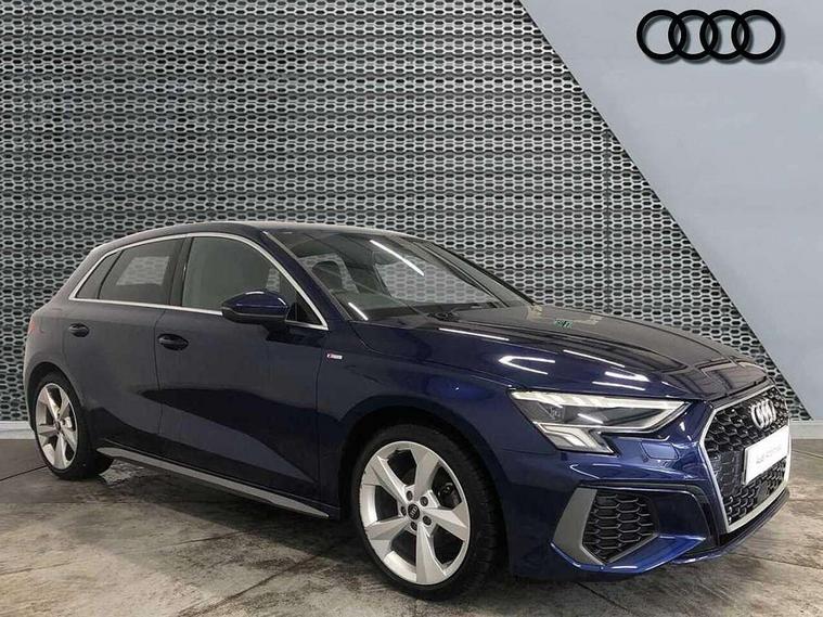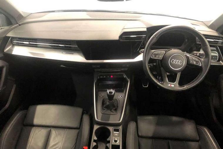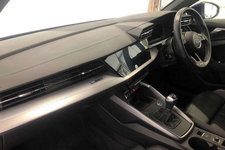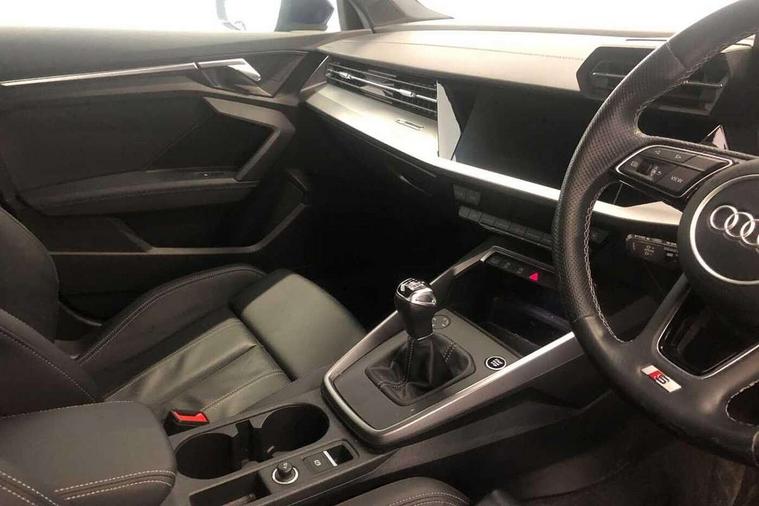 Audi drive select (Auto, Comfort, Dynamic and Individual), Audi smartphone interface, Audi Virtual Cockpit - 10.25" digital and colour instrument cluster, Automatic start/stop system with recuperation, Bluetooth interface, Camera based traffic sign recognition, Collision avoidance assistant, Cruise control, e-Call (emergency call), Electromechanical power speed sensitive steering, Lane departure warning system, MMI Navigation Plus with high resolution 10.1" colour touch screen display, Rear parking sensors, Service indicator, Trip computer, Voice control system with natural language interaction, Sports suspension, 2xUSB-C connection with data and charging functions, 6 passive loudspeakers, DAB Digital radio, 3rd brake light, Acoustic glass windscreen, Aluminium window trim, Auto dimming frameless rear view mirror, Body colour exterior mirrors, Electrically adjustable/heated/folding/auto dimming door mirrors with integrated LED indications + kerb view function for passenger side, Front electric windows, Illuminated aluminium inserts front door sills with S logo, LED daytime running lights, LED headlights with LED rear lights and dynamic rear indicators, Light and rain sensors, Privacy glass - dark tinted rear window, rear door and side windows, Rear electric windows, Rear side air outlets in grained matt black, Rear side wing doors, Rear wiper, S line bumpers, S roof spoiler, 12V socket and storage compartment in front centre console, 3 seat bench in 2nd row, 3 spoke leather multifunction steering wheel, 4 way electrically adjustable lumbar support for driver and front passenger, 60/40 split folding rear seat bench, Black cloth headlining, Dual zone electronic climate control, Front and rear centre armrest in leather, Front and rear headrests, Front/rear floor mats, Height and reach adjustable steering wheel, Interior lighting - glove compartment light and right hand side, Luggage compartment floor covering, Manual boot compartment lid, Manually adjustable front seats, Seat side bolsters, Single front passenger seat, Stainless steel pedals and front footrest in black, Twin leather upholstery with front sports seats S embossed logo, Aluminium interior elements pack - A3 Sportback, LED interior lighting pack - A3 Sportback, S line styling pack - A3 Sportback, 3x3 point rear seat belts, Driver and front passenger airbag with passenger airbag deactivation, Electronic Stabilisation Control (ESC) including ABS, ASR and EDL, First aid kit with warning triangle and 2 safety vests, Front side airbags with head airbags and interaction airbag, Pre-sense front with pedestrian and cyclist detection, Seatbelt monitoring, Tyre pressure loss indicator, Anti theft alarm, Anti-theft wheel bolts, Electronically operated child lock, Immobiliser, Remote control central locking, Dark spectrum aluminium inlays, accent surfaces in the dashboard and centre console in platinum grey silk effect paint finish,