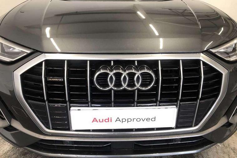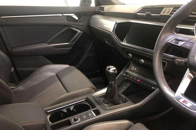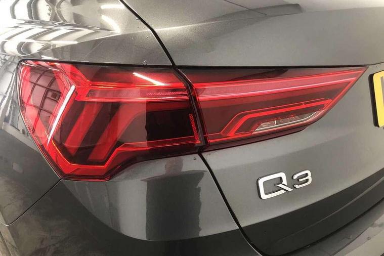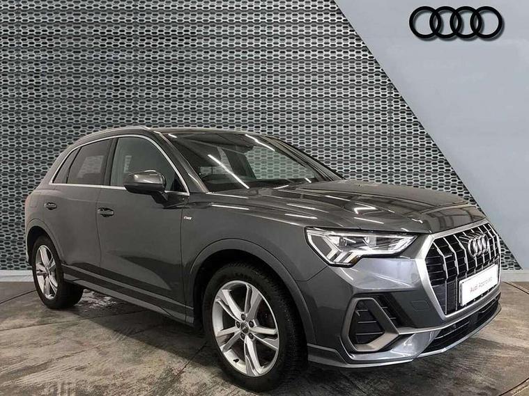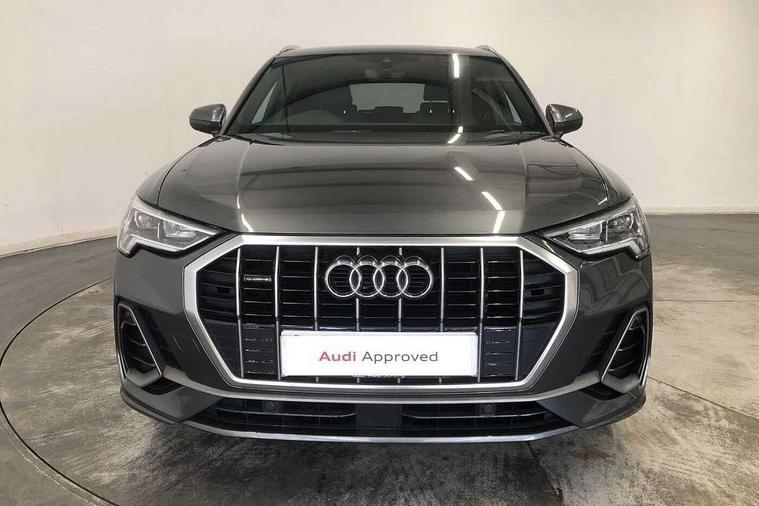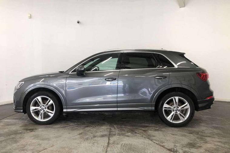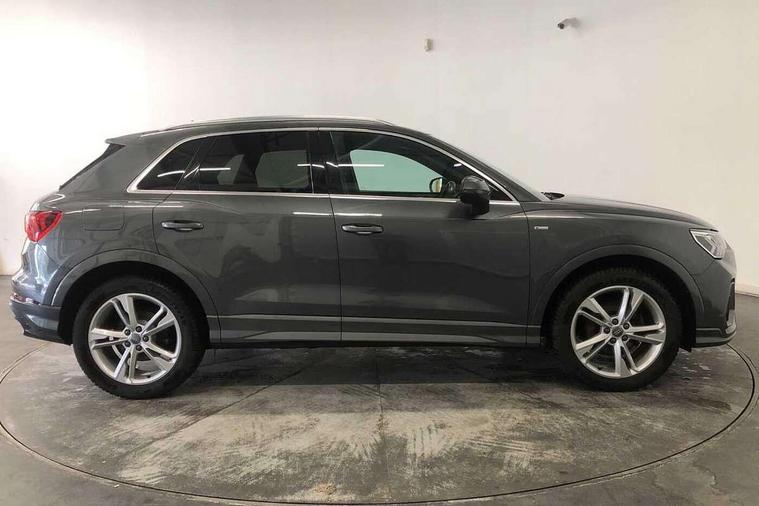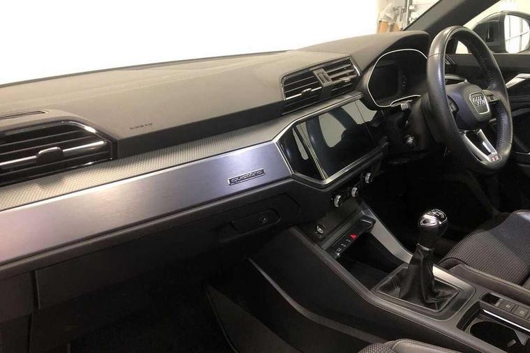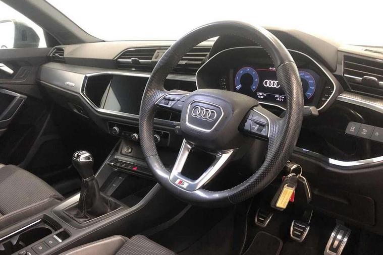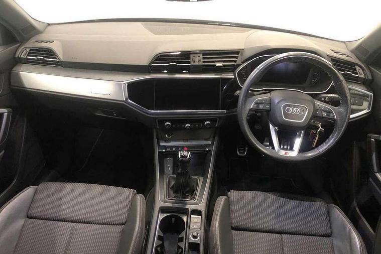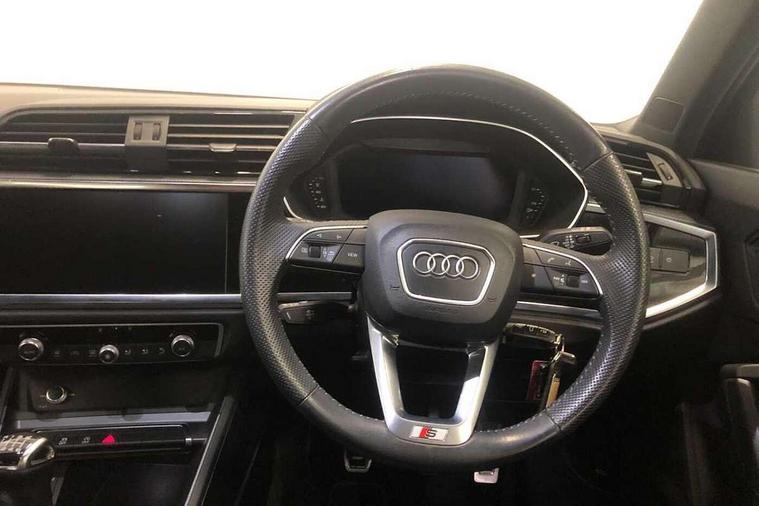 Apple CarPlay, Audi connect safety and service (e-call), Audi drive select, Audi lane departure warning, Audi side assist, Audi smartphone interface, Audi Virtual Cockpit - 10.25" display, Bluetooth interface, Camera based traffic sign recognition, Cruise control + speed limiter, MMI Navigation Plus with high resolution 10.1 inch touchscreen colour display, Power opening/closing tailgate, Progressive steering, Rear parking sensors, Service interval indicator, Start stop system with recuperation, Voice control system with natural language interaction, Diesel particulate filter, Sports suspension, 1 x USB type C and 1 USB type A charging points, 6 speakers, DAB digital radio module, Acoustic windscreen, Aluminium roof rails, Aluminium window trim, Auto dimming frameless rear view mirror, Body coloured bumpers, Electrically folding, adjustable and heated door mirrors with integrated LED side indicators and kerb view function for passenger side, Front and rear electric windows, Front fog lights, Front side air inlets in matt platinum grey, Front spoiler blade in matt platinum grey, Grille vertical bars in aluminium silver/Matt, High gloss black finish B and C pillars, LED headlights with LED daytime running lights and dynamic rear indicator, LED rear lights, Privacy glass, Rain and light sensors, Rear diffuser strip in matt titanium black, S Line badge on wings, S Line front and rear bumpers, Side skirt insert in matt Platinium grey, Silver chrome grille surround, Titanium black radiator grille, 12V socket in rear centre console, 40:20:40 split folding rear bench seat, 60:40 forwards/backwards position and backrest angle, Adjustable rear seat bench/backrest with centre armrest and cupholder, Aluminium door sill trims, Black cloth headlining, Dual zone electronic climate control, Front and rear black floor mats with contrast stitching in rock grey, Front and rear headrests, Front and rear roof module including reading lights, Front centre armrest with storage compartment and angle adjustment, Glove compartment lighting, Height and reach adjustable steering wheel, Illuminated door sill trims with S logo, ISOFIX child seat mounting and Top Tether with front passenger airbag deactivation, Luggage compartment light, Manual front seats with height adjustment, Perforated leather gearknob, Stainless steel luggage compartment sill finisher, Stainless steel pedals, Non smoking pack - Q3, 3x3 point rear seatbelts, 6 airbags - Driver, front passenger, curtain and side windows, Audi pre-sense front with pedestrain and cyclist recognition, Electrically operated child locks on rear doors, Electromechanical parking brake, Electronic stabilisation control including ABS, ASR and EDL, Hill descent control, Hill hold assist, Pre sense basic, Seatbelt monitoring, Tyre pressure warning, Warning triangle and first aid kit, Anti theft alarm, Anti theft wheel bolts, Remote central locking, Dark matt brushed aluminium inlay, Leatherette door armrest, MMI touch colour display in gloss black with aluminium surround,